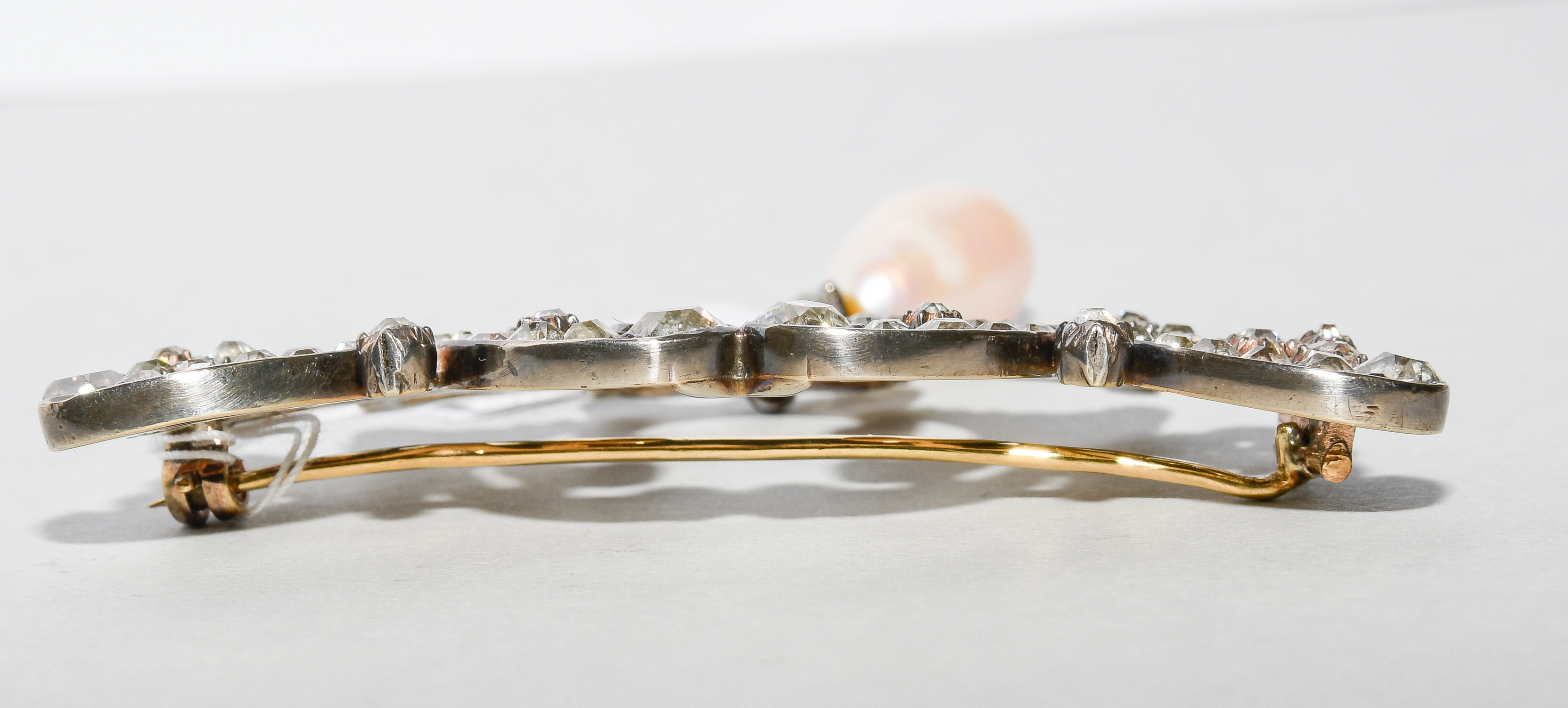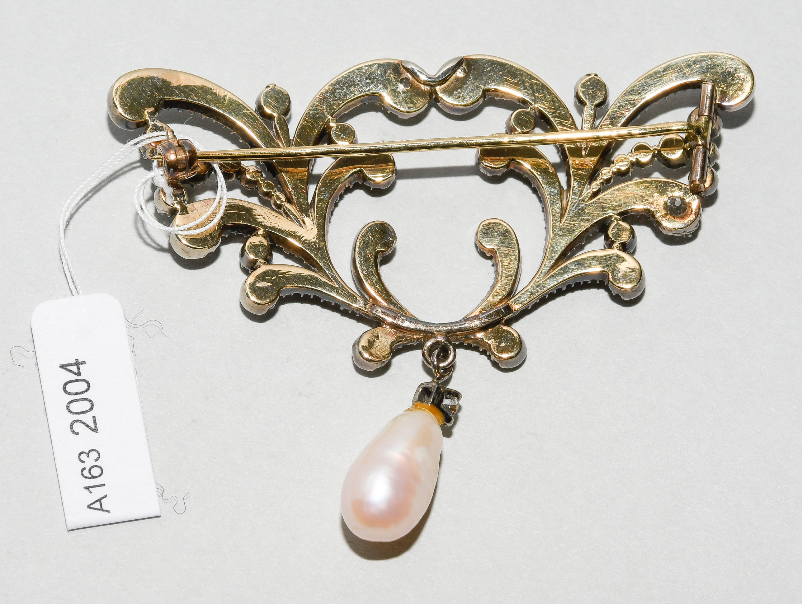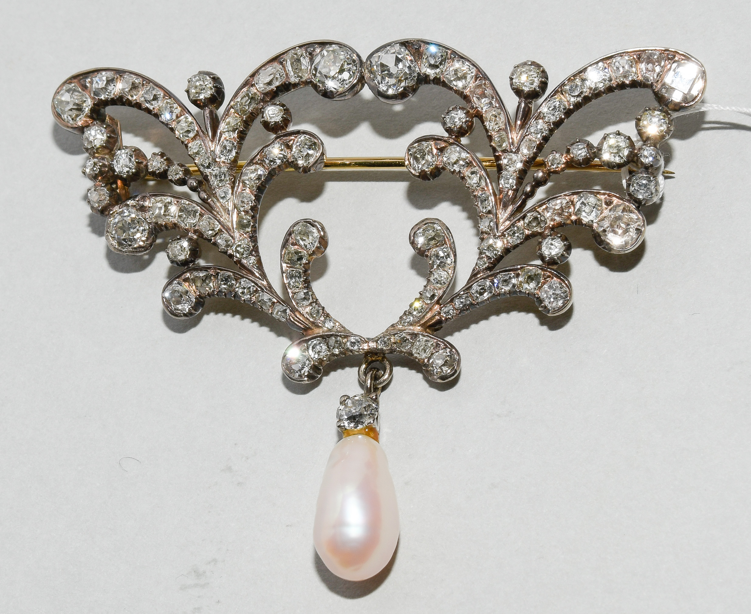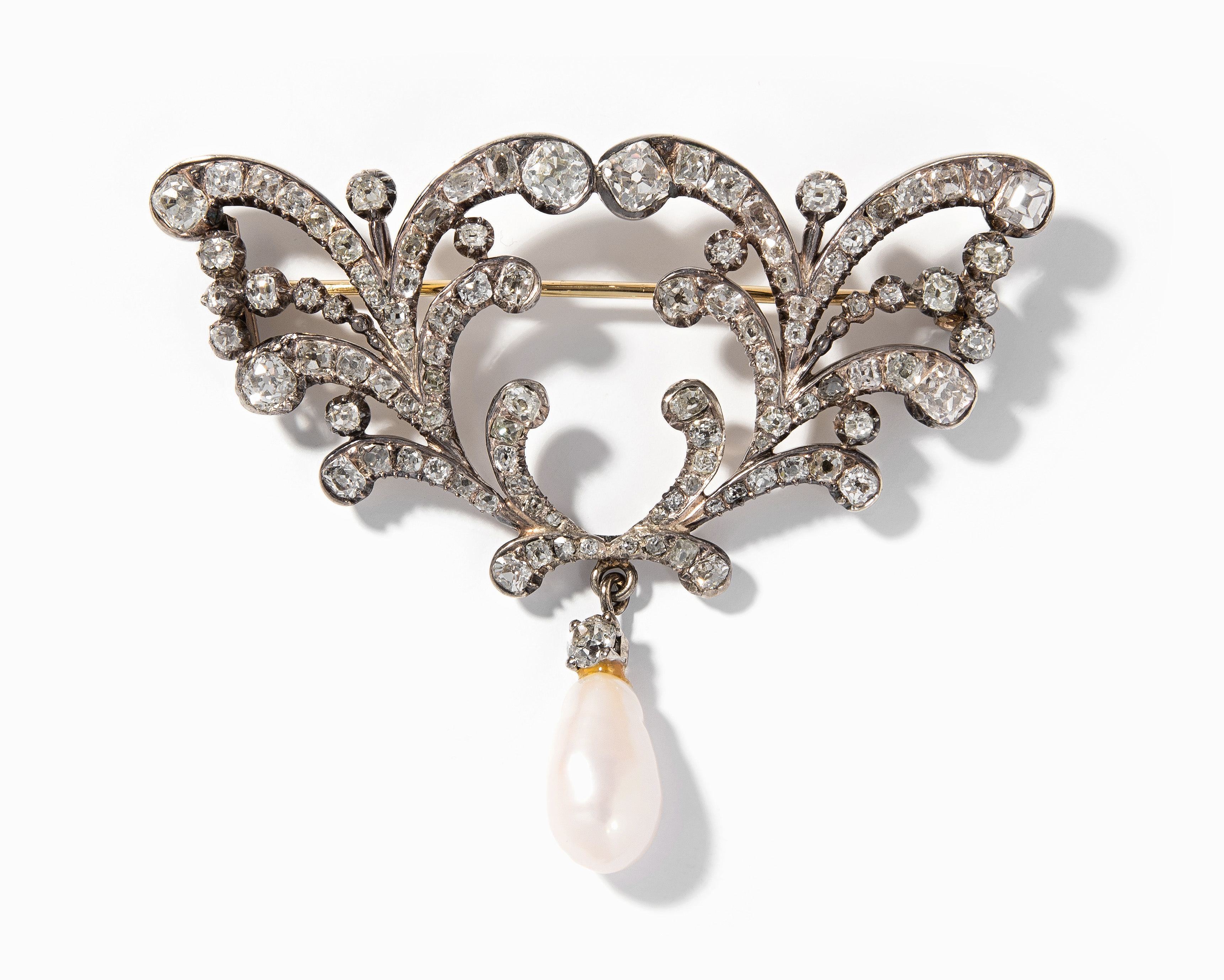 1.H. 19.Jh. Modifiziert. Silber/Gelbgold. Federmotive ausgefasst mit Altschliff-Diamanten ca. 3.80 ct, hängend ein Süsswassperltropfen (neuer). 6x5 cm, 14,1 g.