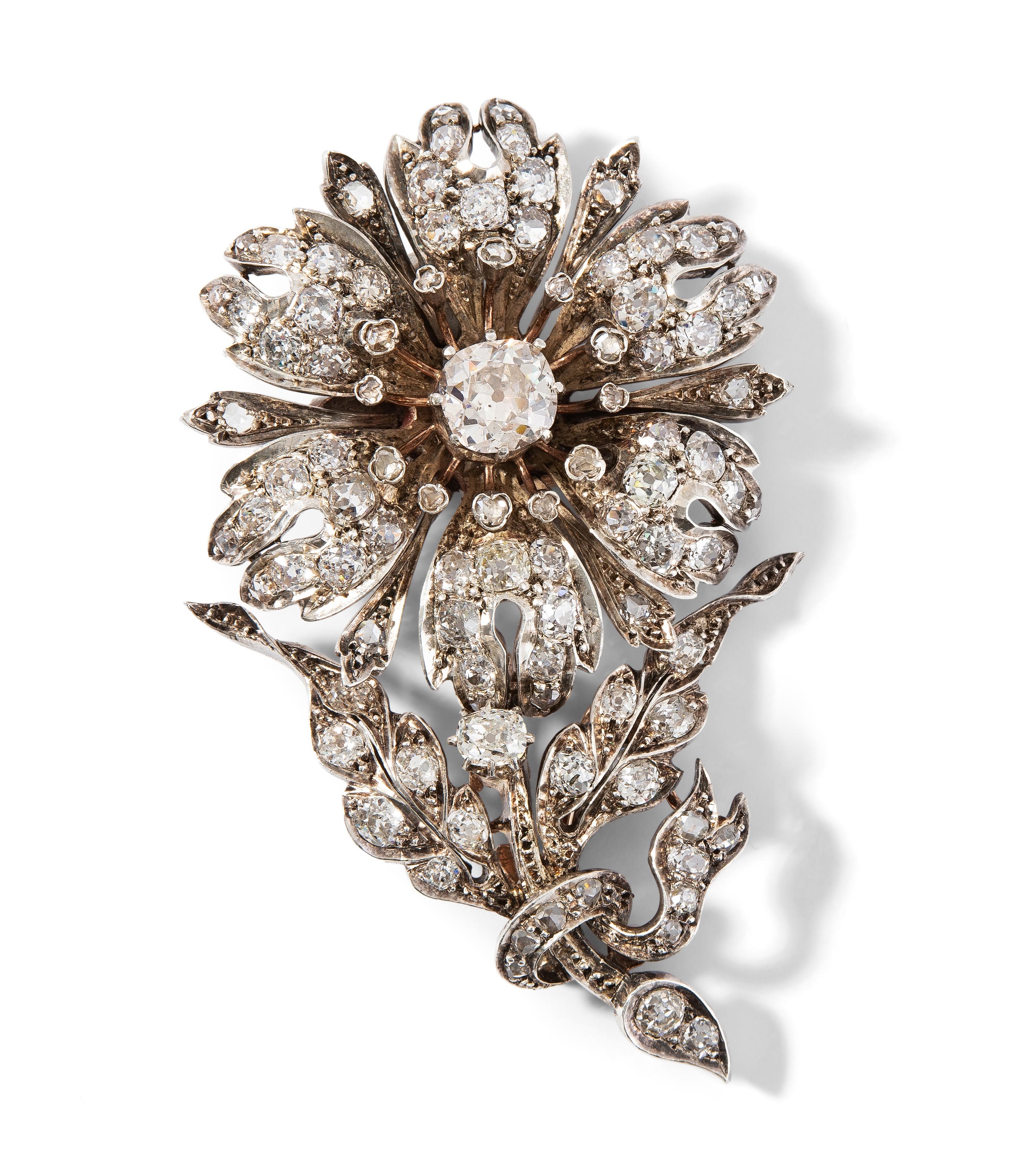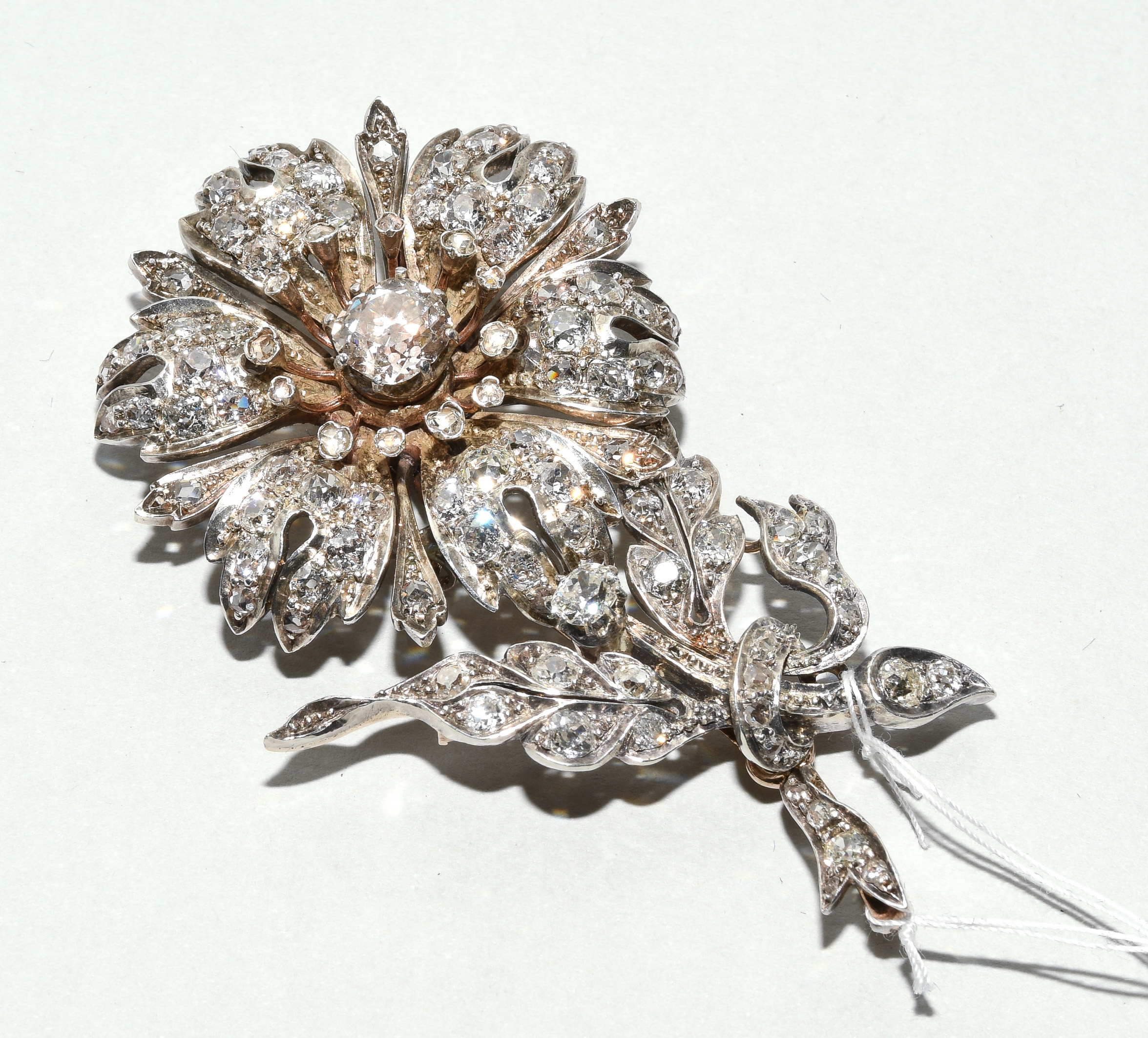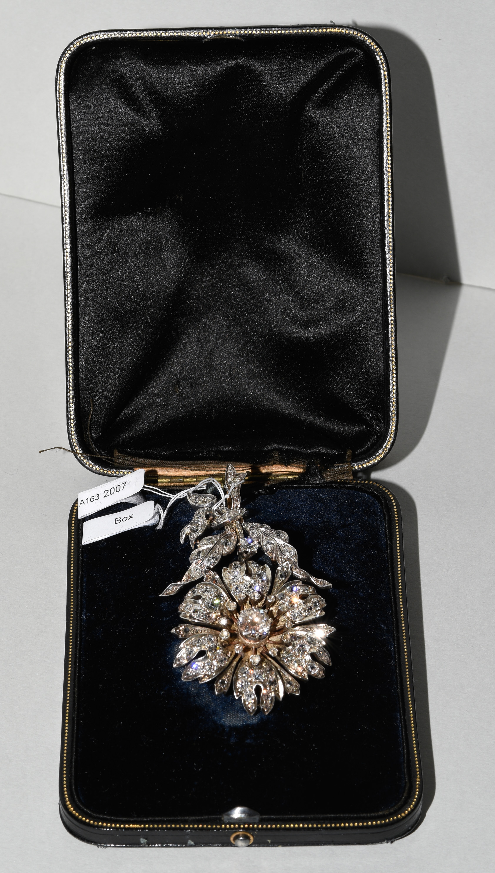 Frankreich, um 1880. Silber/Rotgold. Blüten-Brosche mit 1 Altschliff-Diamant in Kissenform ca. 1.90-2.10 ct. I/J-si/P1. Blüten und Staublätter besetzt mit 72 Altschliff-Diamanten/Diamantrosen ca. 3.80 ct. Rückseite mit verschraubter Broschierung. Anhänger ausgefasst mit 28 Altschliff-Diamanten/Diamantrosen ca. 1.40 ct. In zwei Varianten, als Brosche und Anhänger tragbar. Blütenbrosche 4x4 cm. Anhänger L 7,5 cm. Gesamtgewicht 31 g. Originalbox.