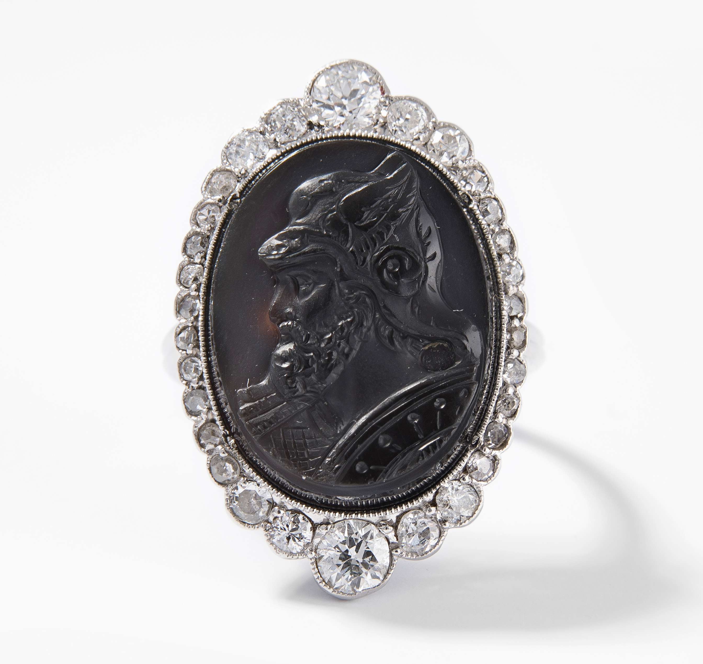 Anfang 20.Jh. Platin. Ovaler wohl Onyx mit erhaben graviertem Merkurkopf ca. 17x13 mm, mit Diamant-Entourage ca. 0.70 ct. ca. Gr. 48 , 7,1 g.
