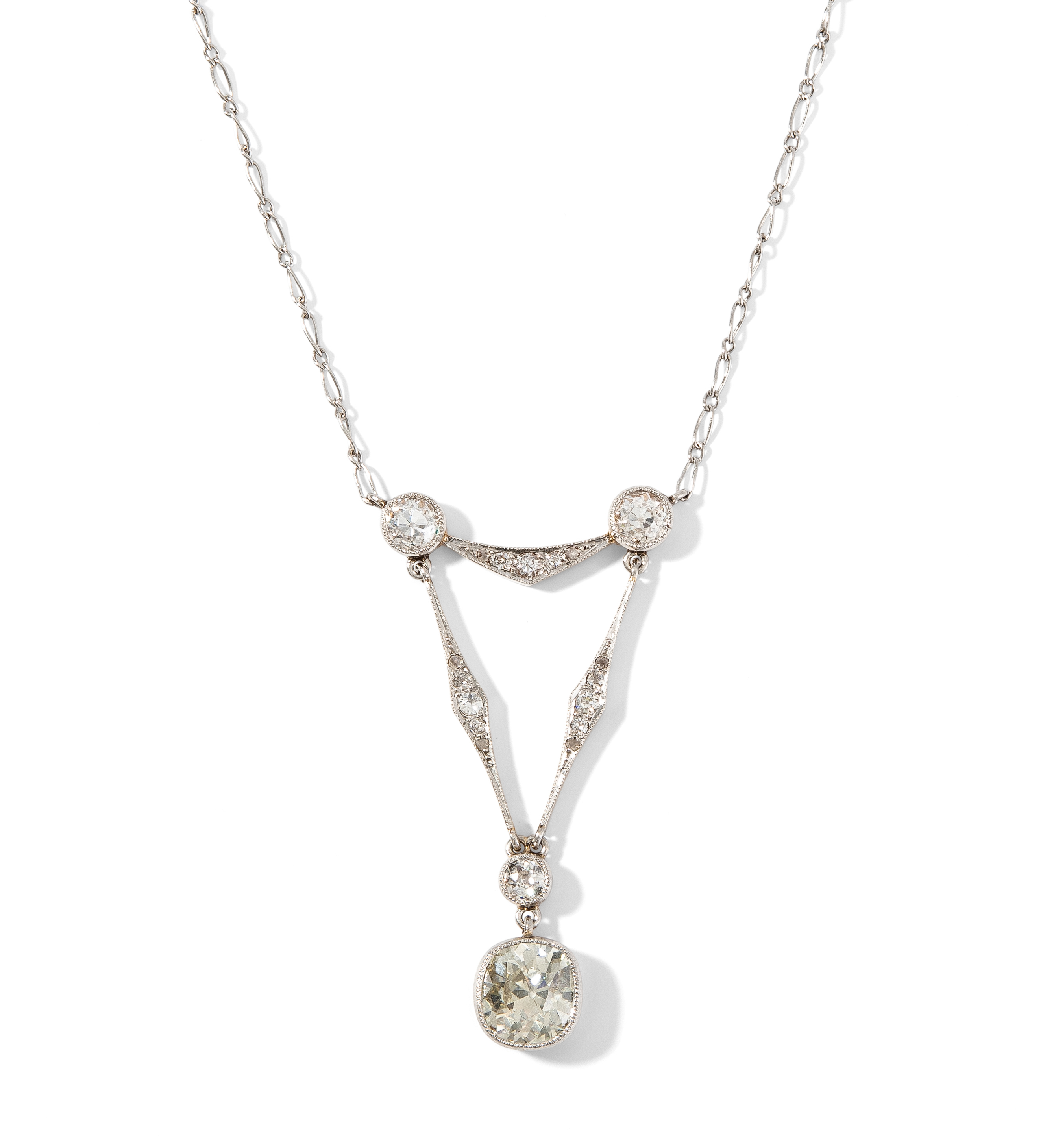 Um 1915. Platin/Gelbgold. 1 Altschliff-Diamant in Kissenform ca. 1.80–2.20 ct getönt M–Z-si/P1. 3 Altschliff-Diamanten ca. 0.60 ct und kl. Diamanten. L 39 cm, 6,8 g.