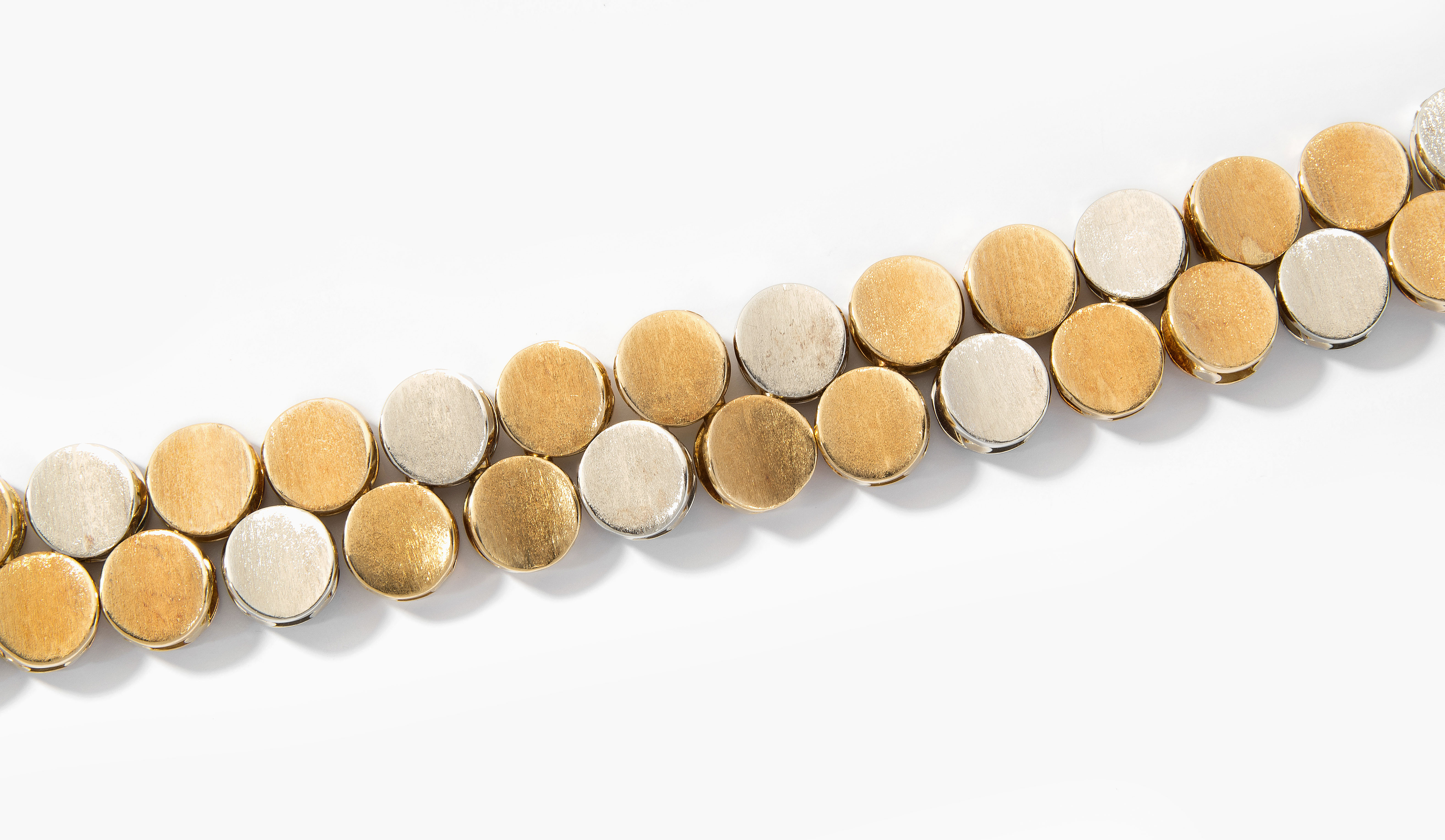 1970er Jahre. 750 Gelb-/Weissgold, strukturiert. Auf zwei Reihen versetzte, leicht konkave Goldplättchen. L 18 cm, 92,5 g.