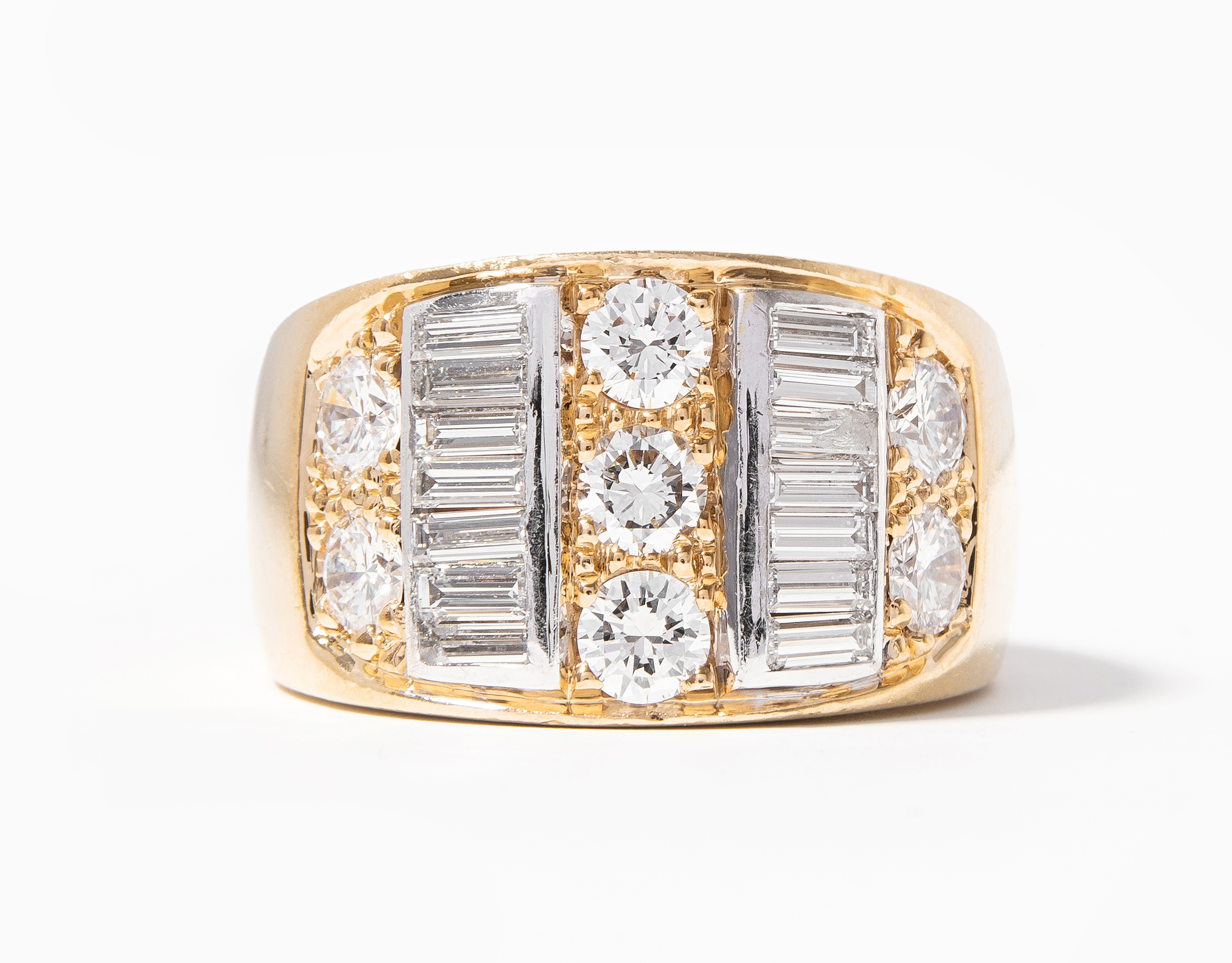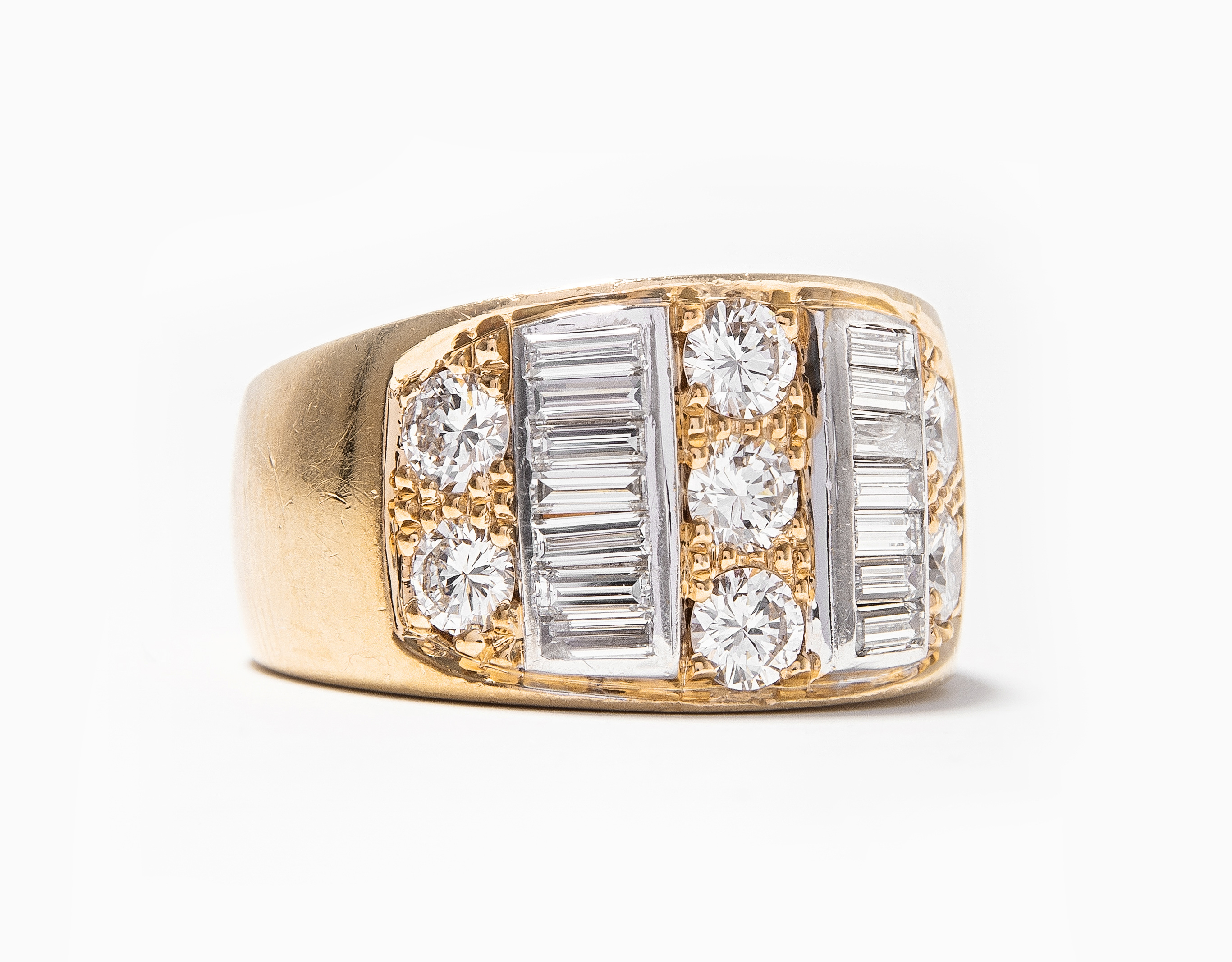 750 Gelbgold. Massiver Bandring mit 7 Brillanten ca. 1.20 ct und 14 Diamant-Baguetten davon 2 defekt. Gr. 56, 24,1 g.