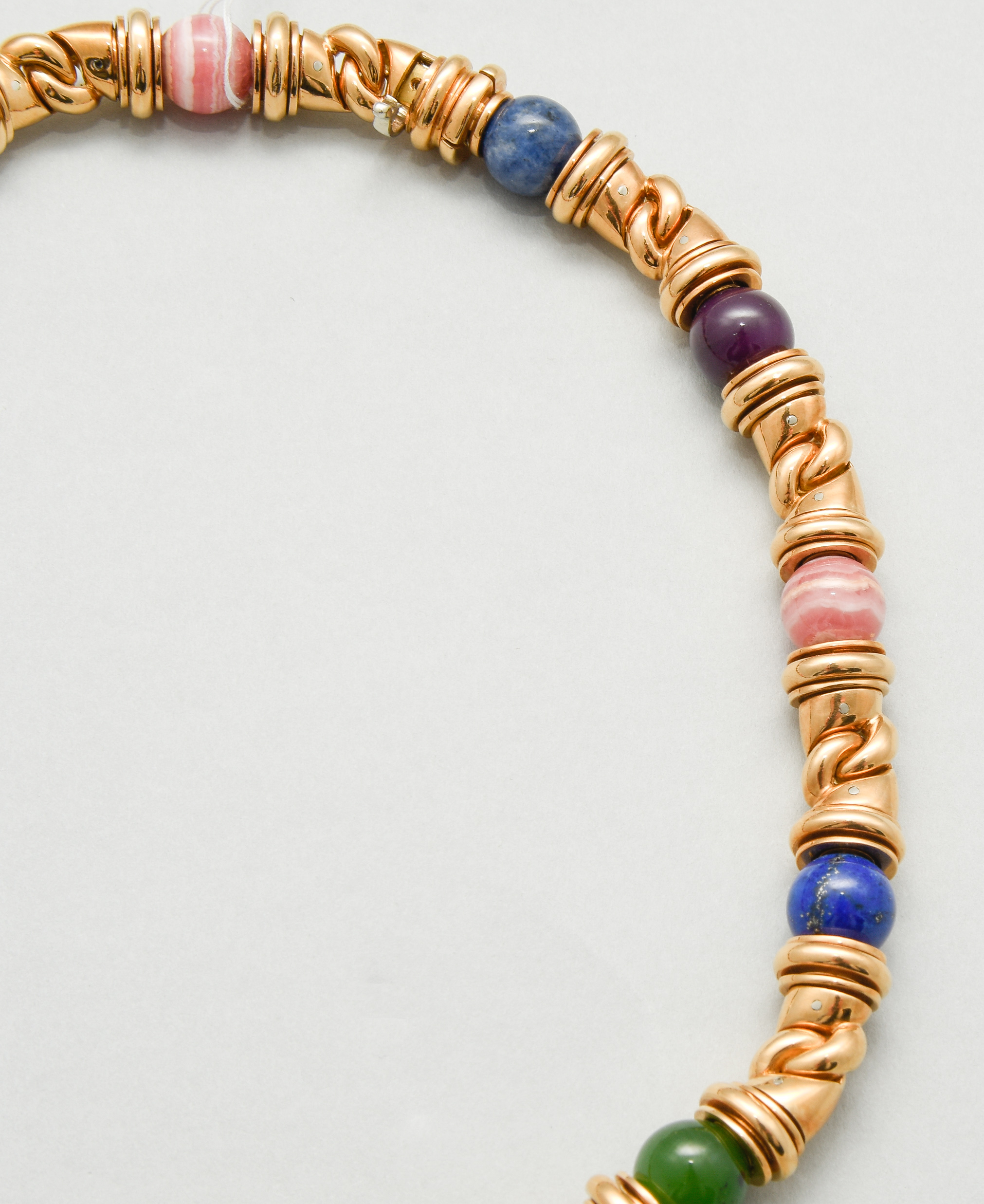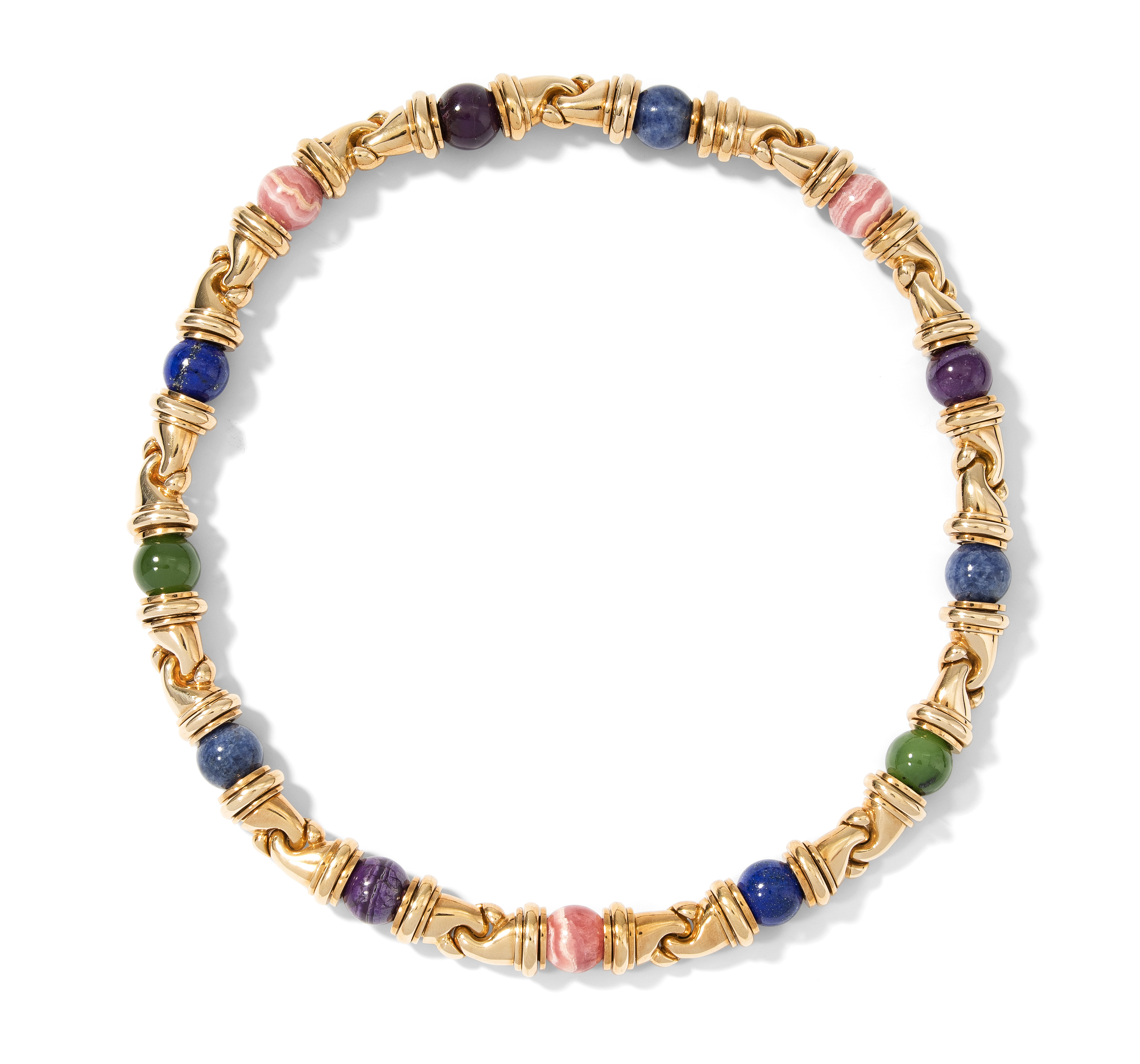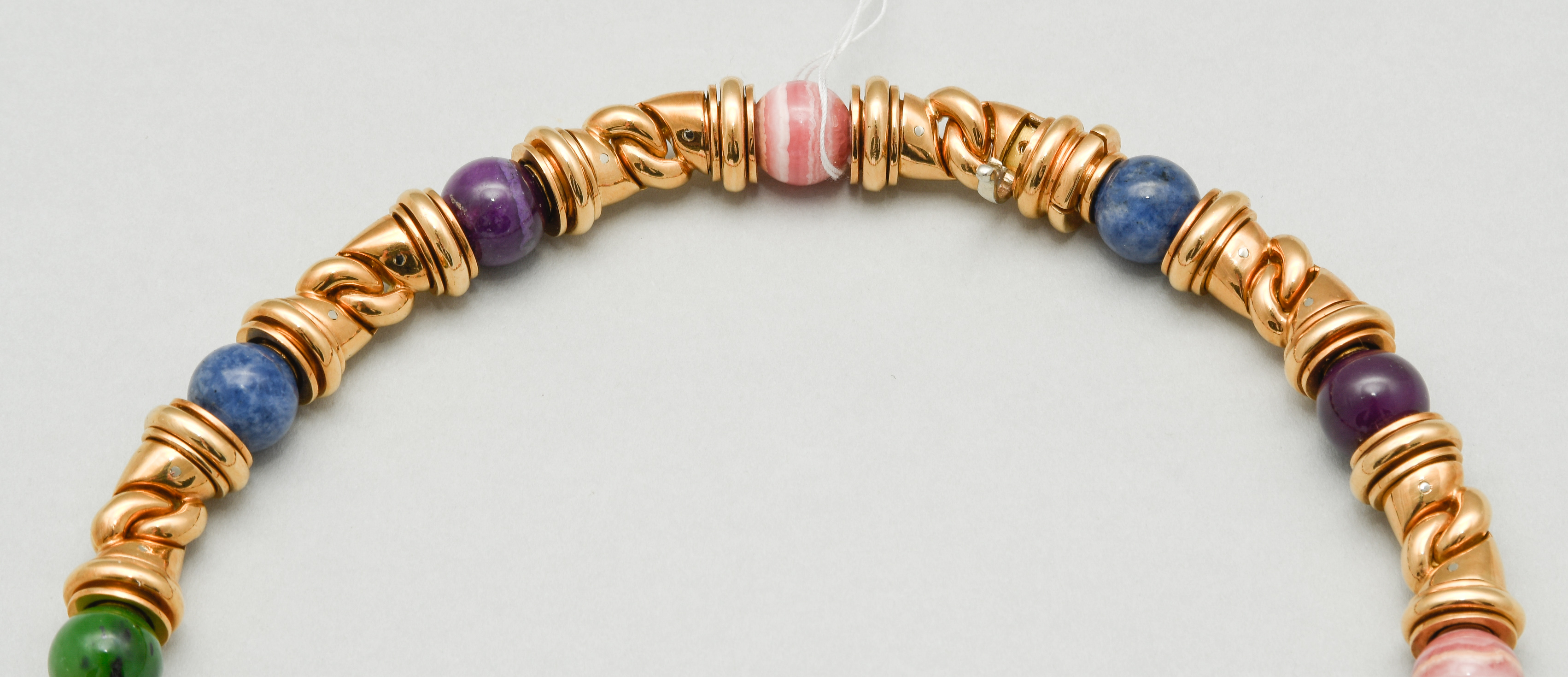 Italien, 1990er Jahre. Signiert. Goldglieder mit integrierten Edelsteinkugeln, Lapislazuli, Rhodochrosit, Chrysopras, Achat, je 10 mm. L 40,5 cm, 165,3 g. Bulgari Kaufbestätigungskopie, 1997.