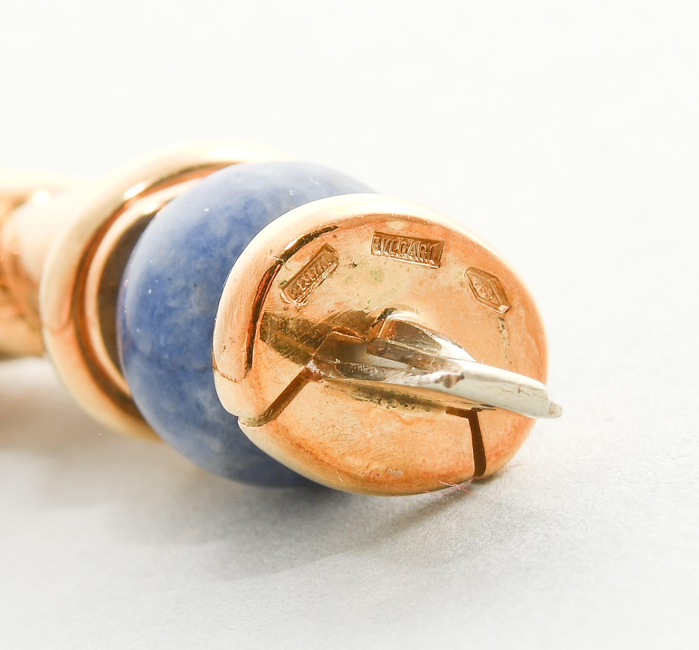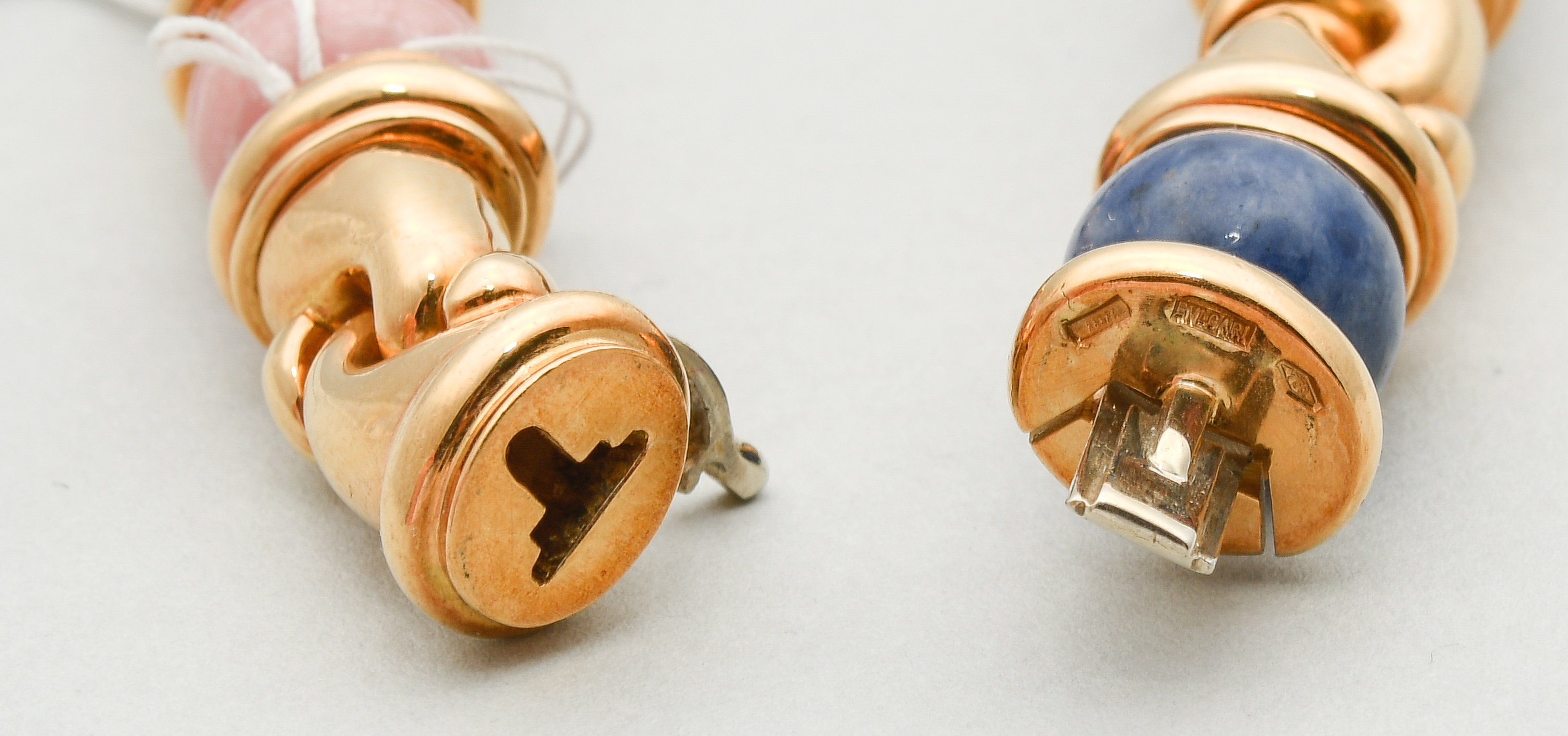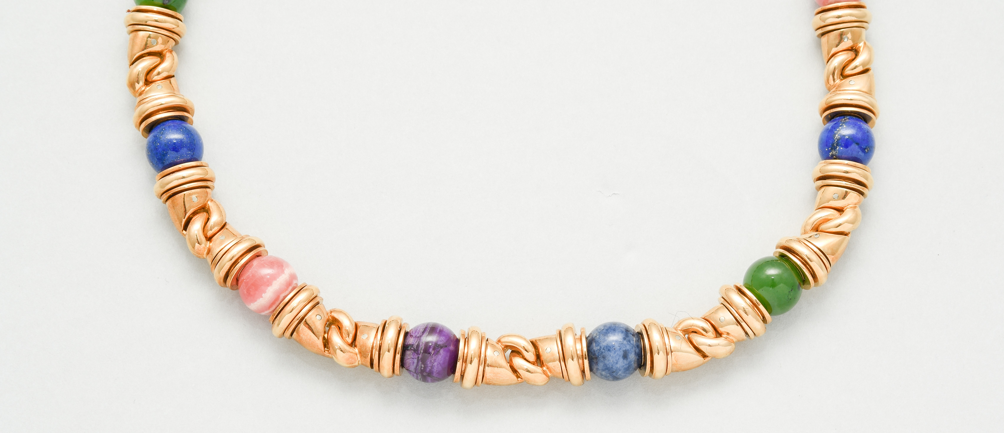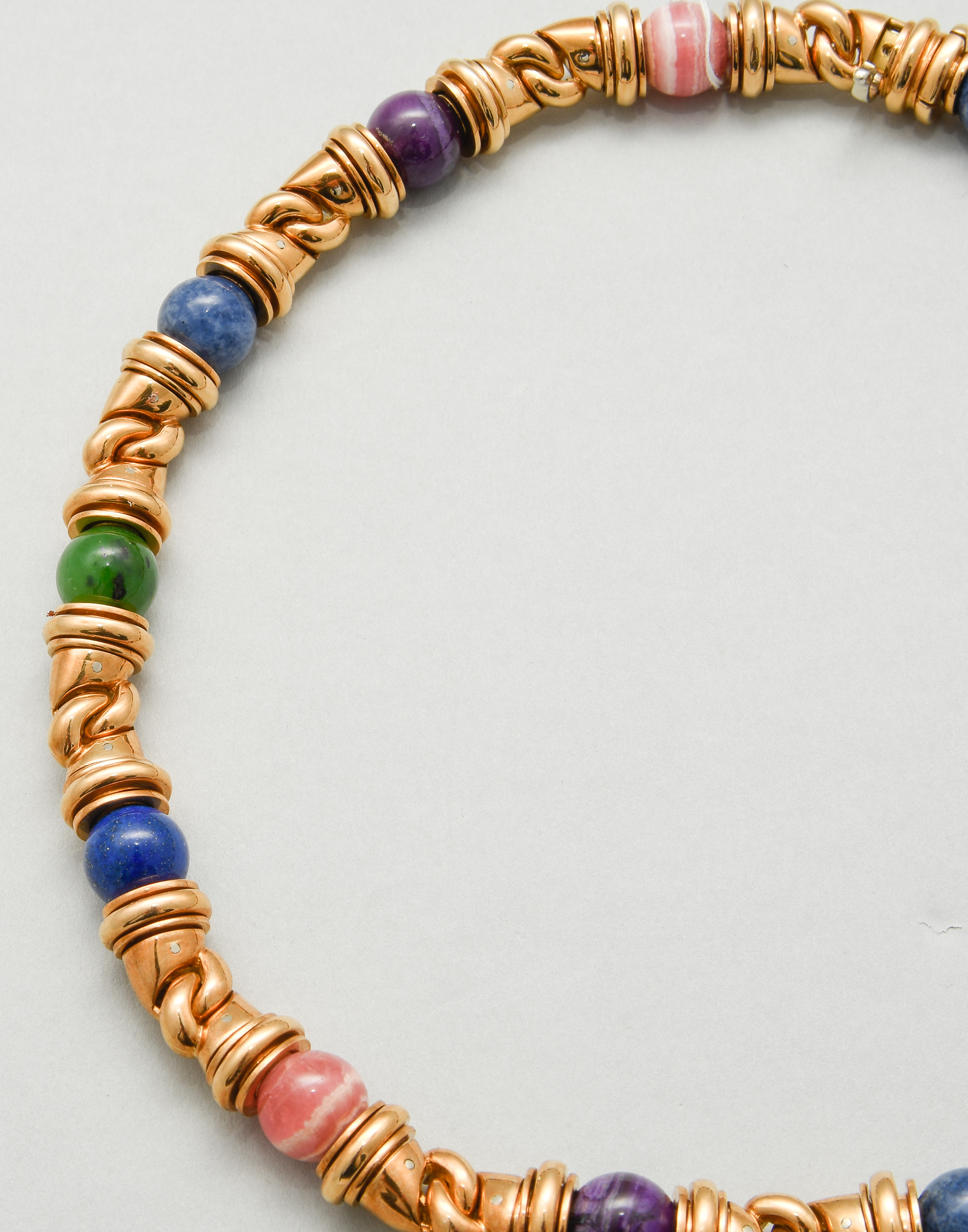 Italien, 1990er Jahre. Signiert. Goldglieder mit integrierten Edelsteinkugeln, Lapislazuli, Rhodochrosit, Chrysopras, Achat, je 10 mm. L 40,5 cm, 165,3 g. Bulgari Kaufbestätigungskopie, 1997.