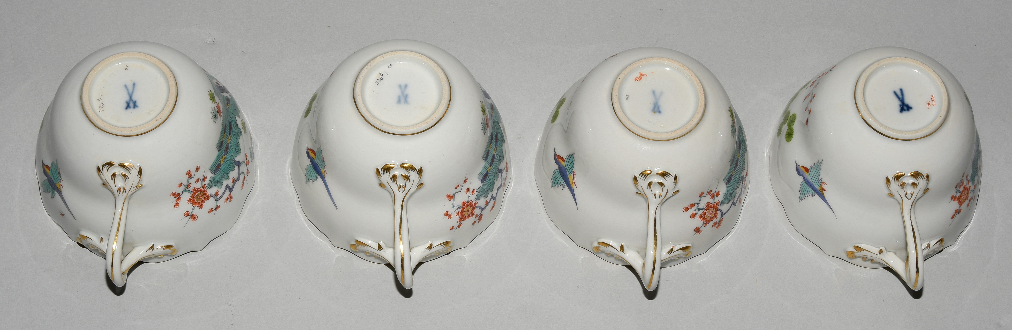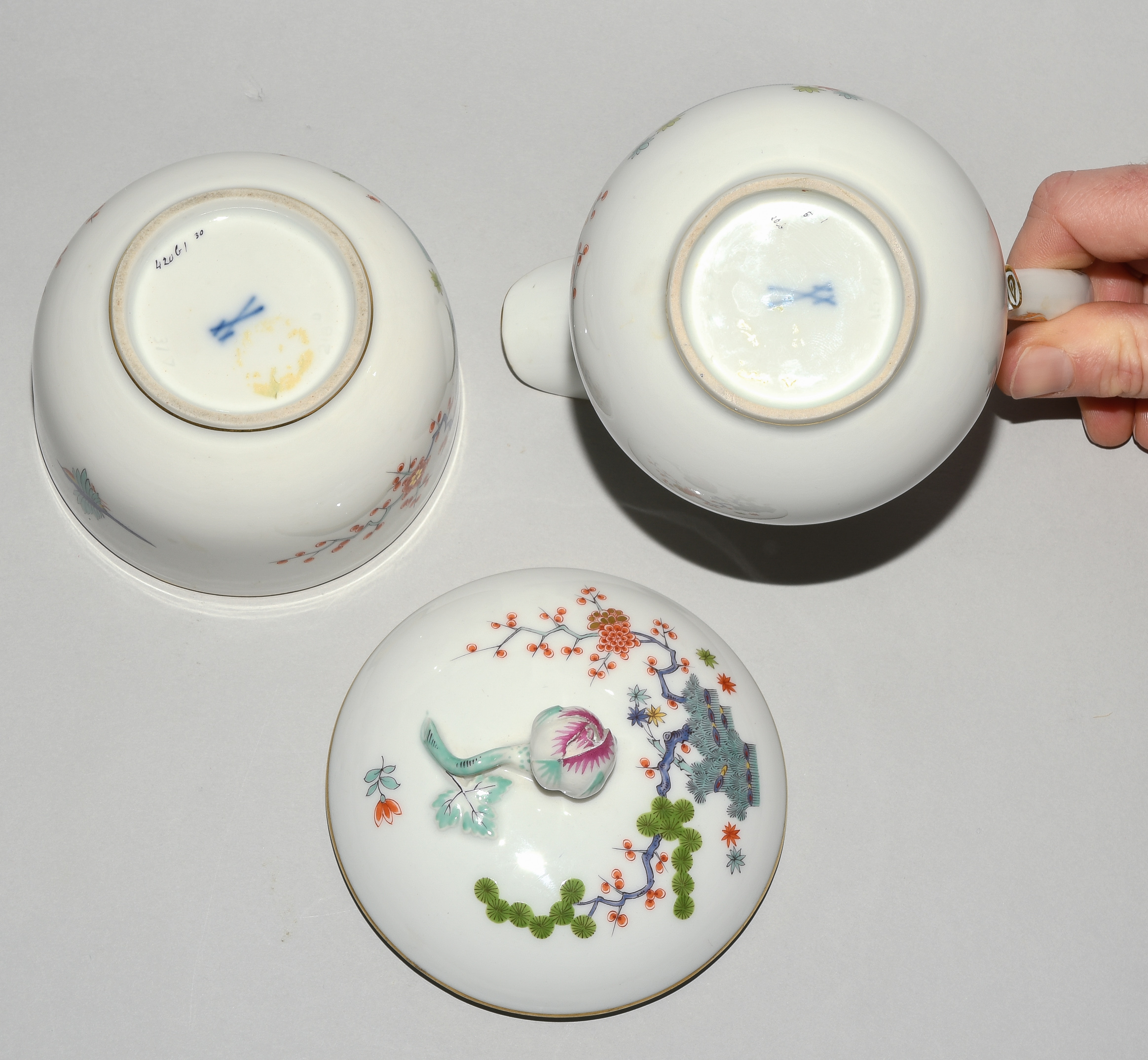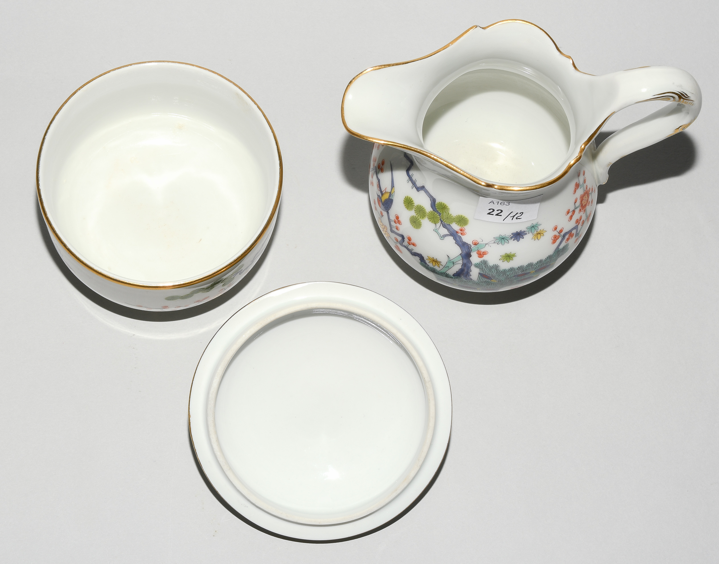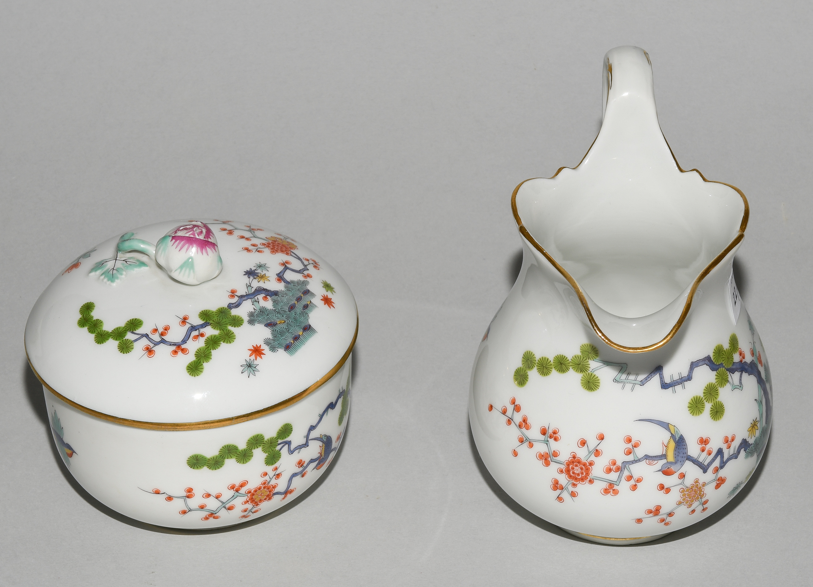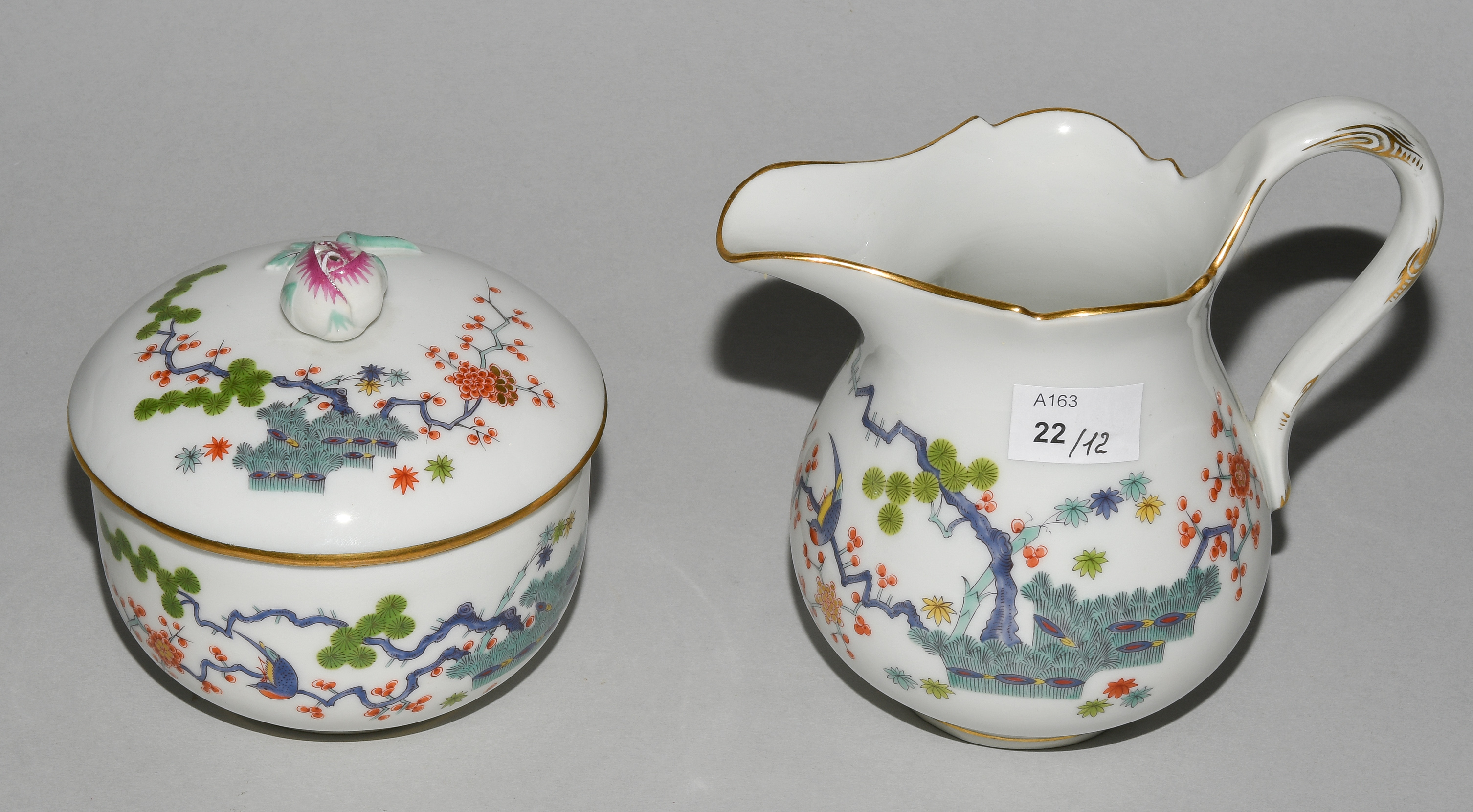20.Jh. Porzellan. Unterglasurblaue Schwertermarke. Indisches Astmuster mit Vogelmalerei, bunt mit Kupferfarben. Knauf in Form einer Rose. Rocaillen- bzw, Asthenkel. Form "Neuer Ausschnitt". Gewellter Goldrand. Bestand: 1 Teekanne, 1 Cremier, 1 Zuckerdose, 1 runde Schale (D 27 cm), 4 Teetassen mit Untertassen (H 6 cm), 4 Dessertteller (D 18 cm). Total 12 Teile.
