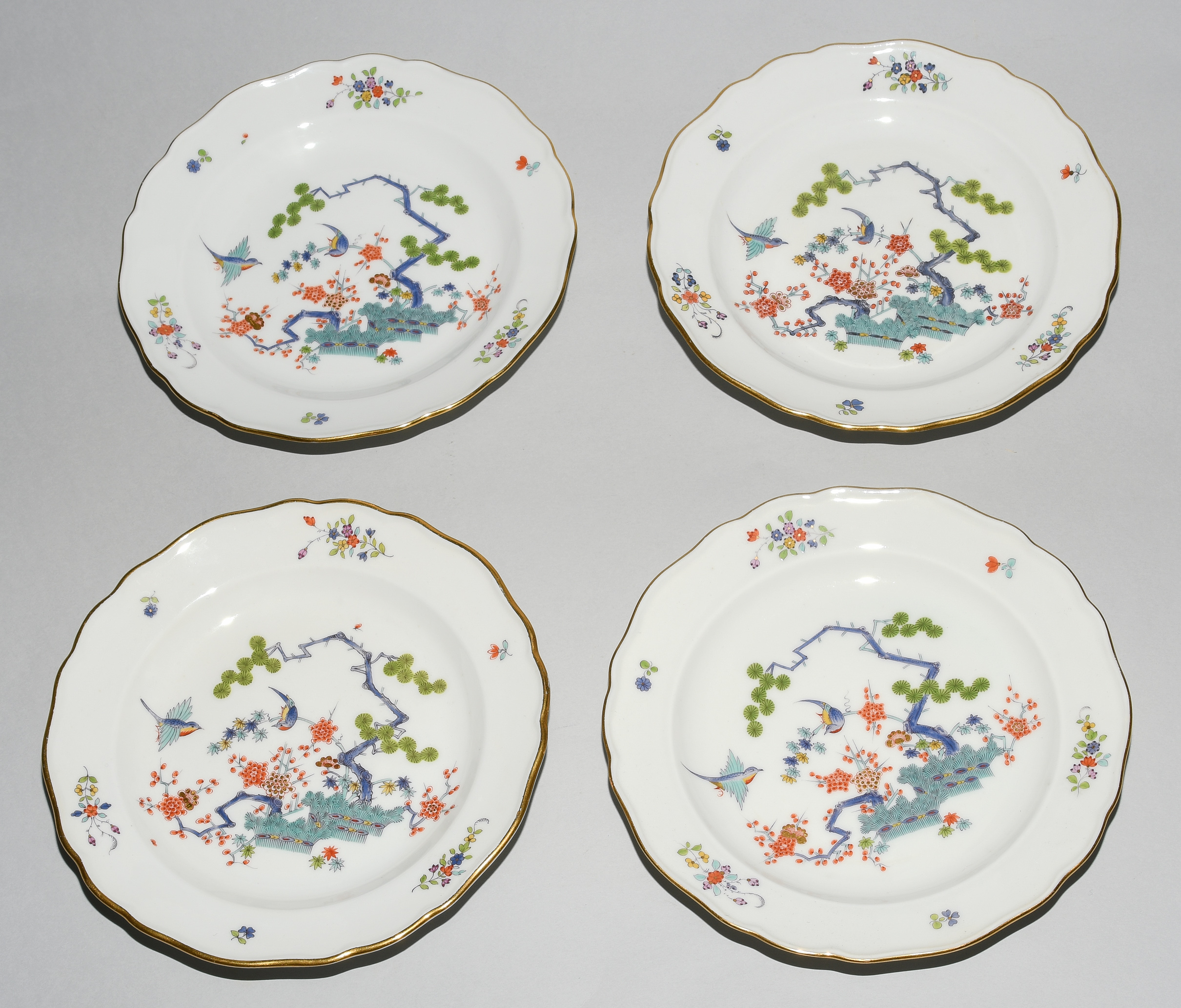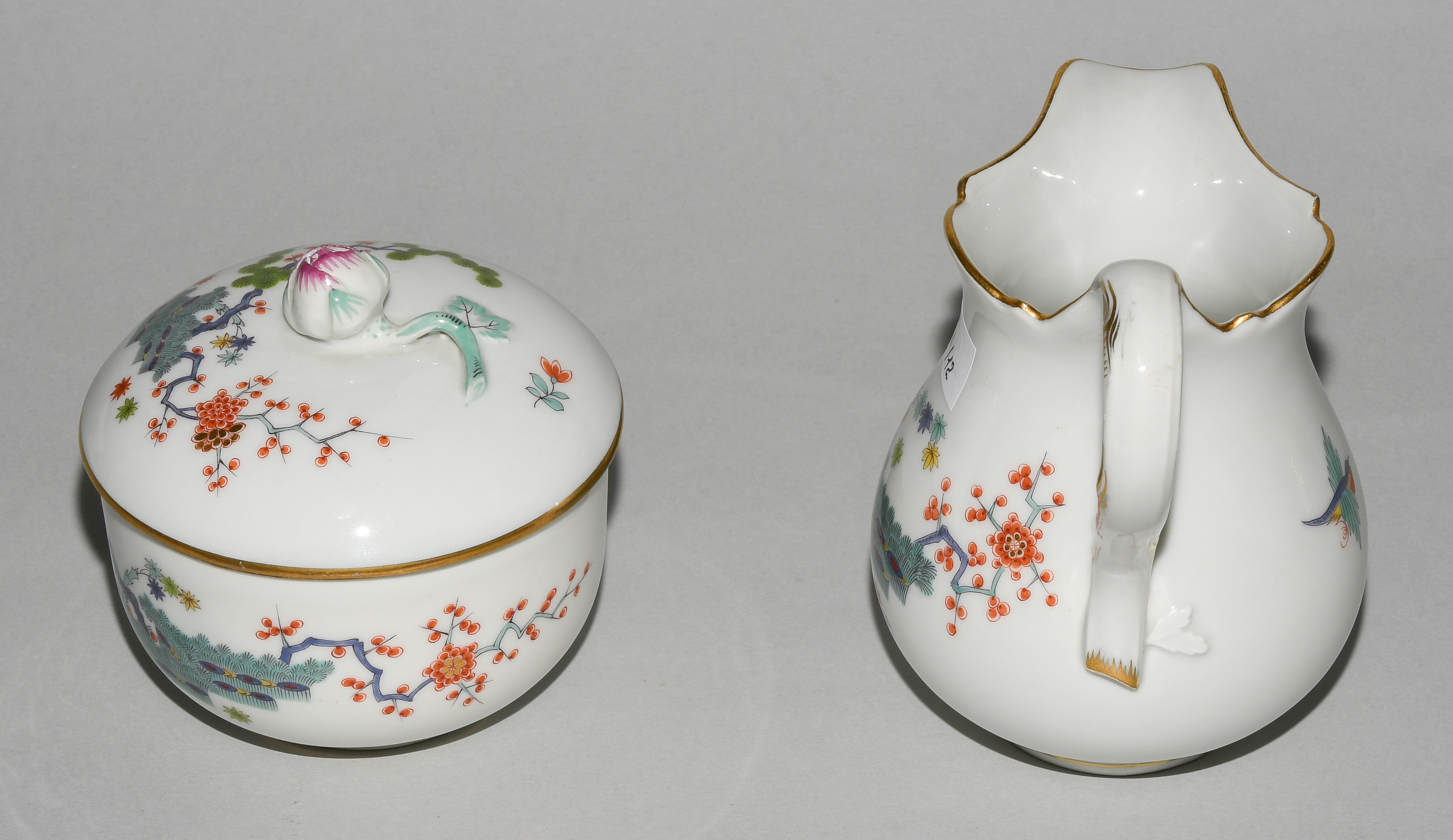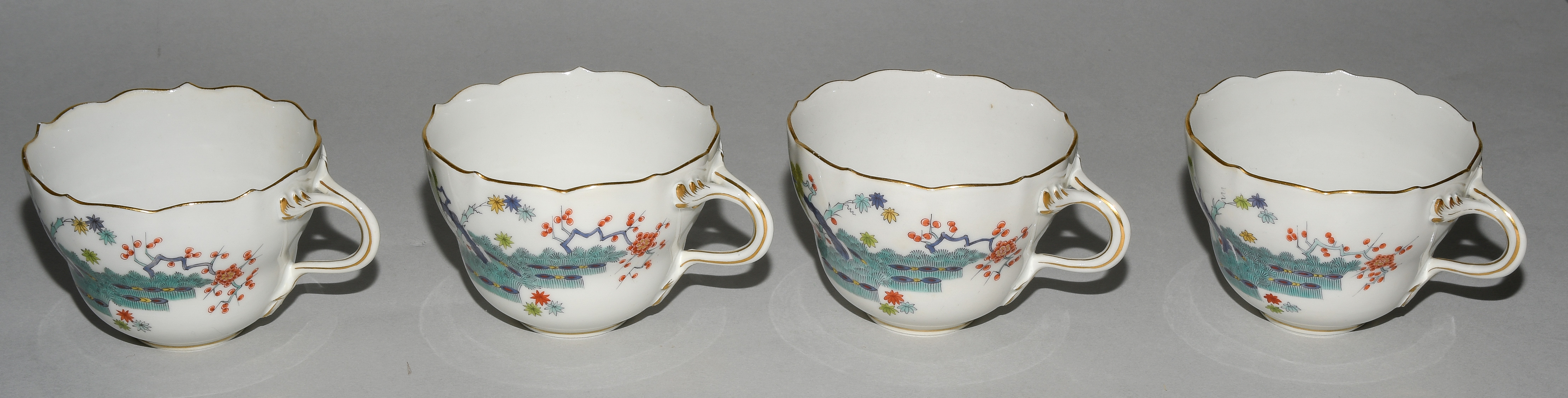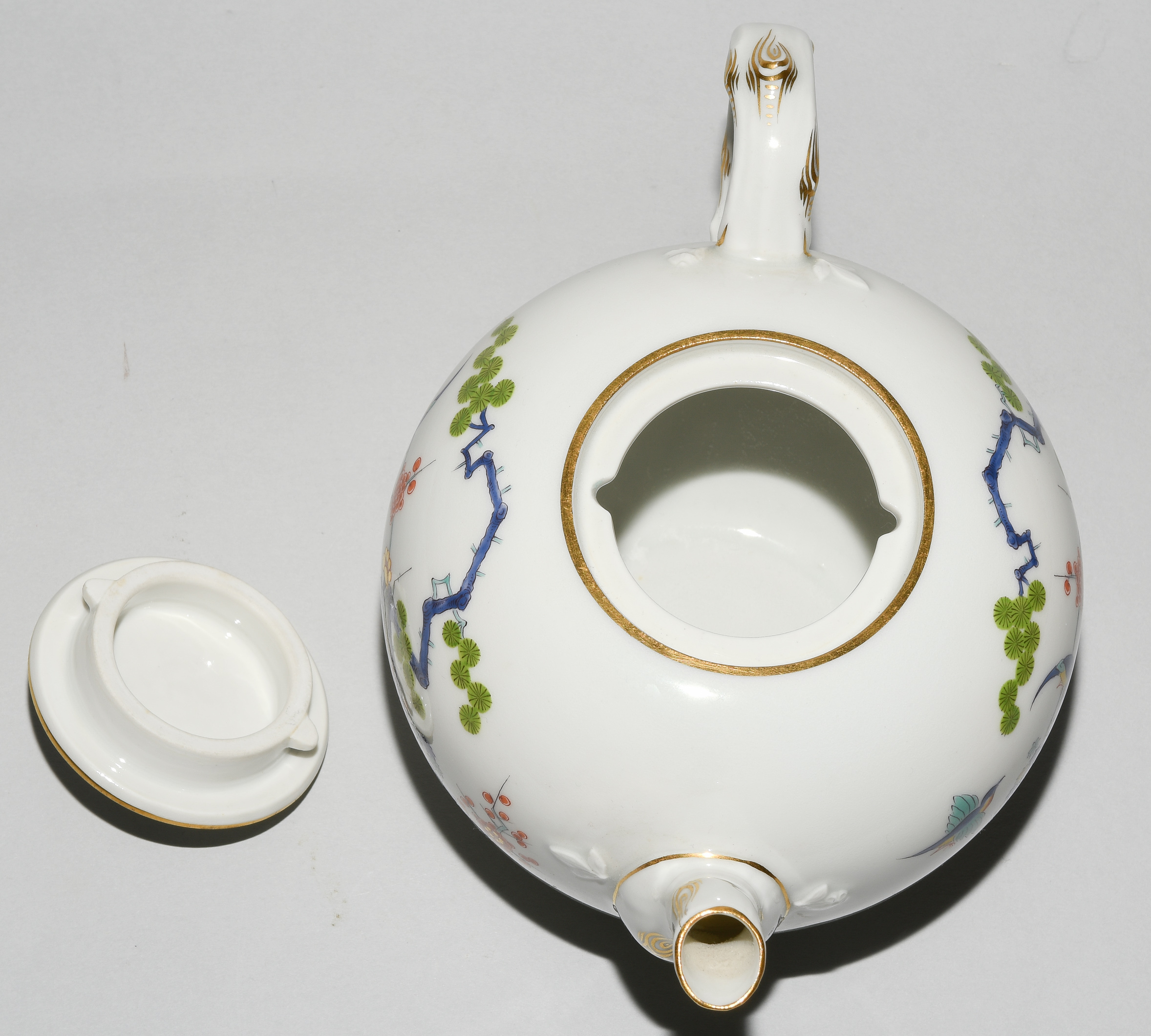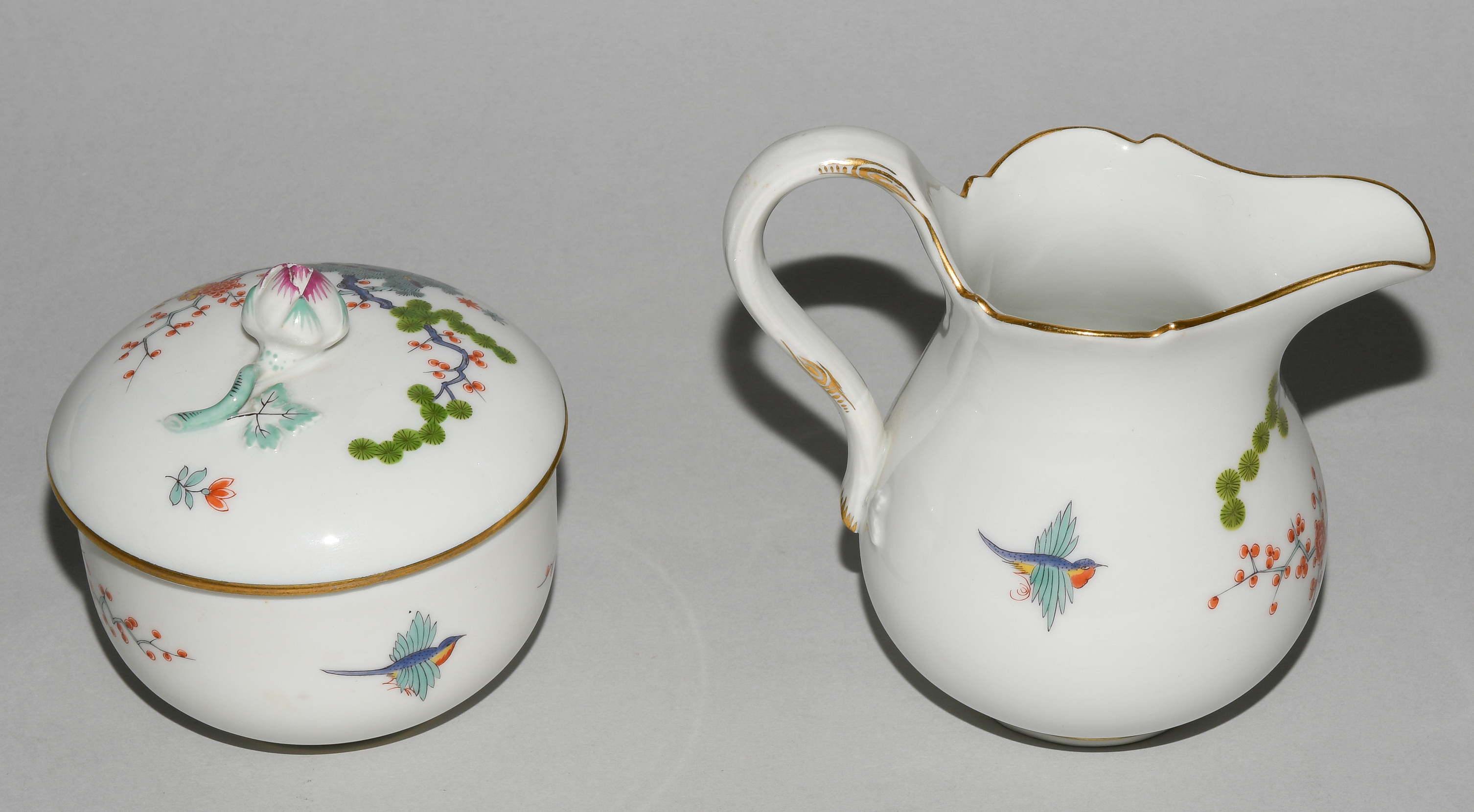20.Jh. Porzellan. Unterglasurblaue Schwertermarke. Indisches Astmuster mit Vogelmalerei, bunt mit Kupferfarben. Knauf in Form einer Rose. Rocaillen- bzw, Asthenkel. Form "Neuer Ausschnitt". Gewellter Goldrand. Bestand: 1 Teekanne, 1 Cremier, 1 Zuckerdose, 1 runde Schale (D 27 cm), 4 Teetassen mit Untertassen (H 6 cm), 4 Dessertteller (D 18 cm). Total 12 Teile.