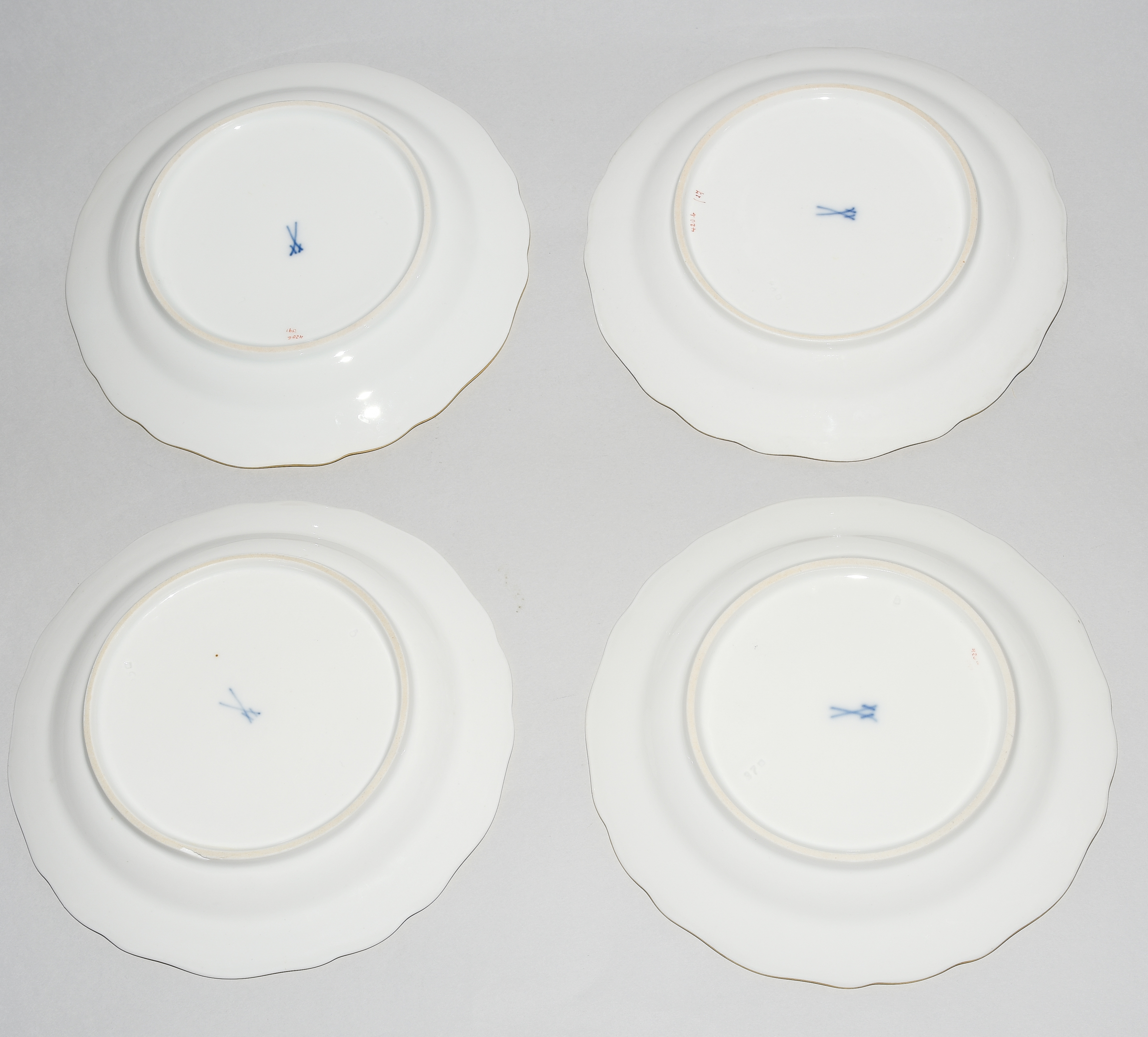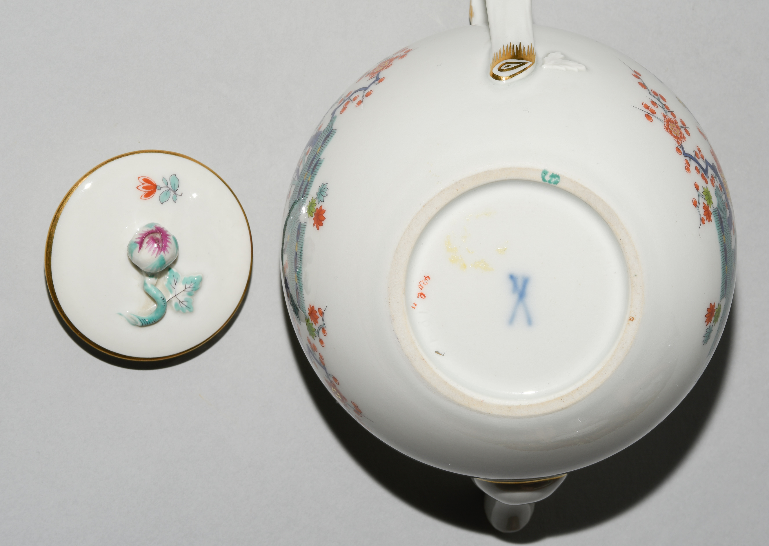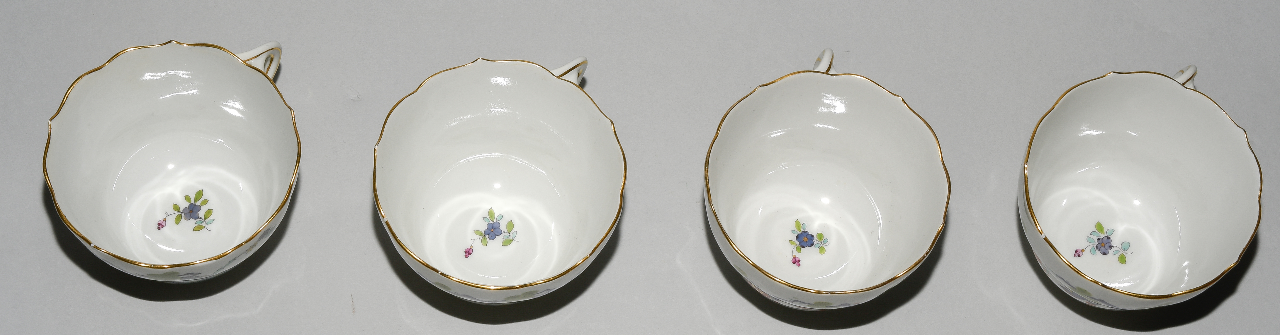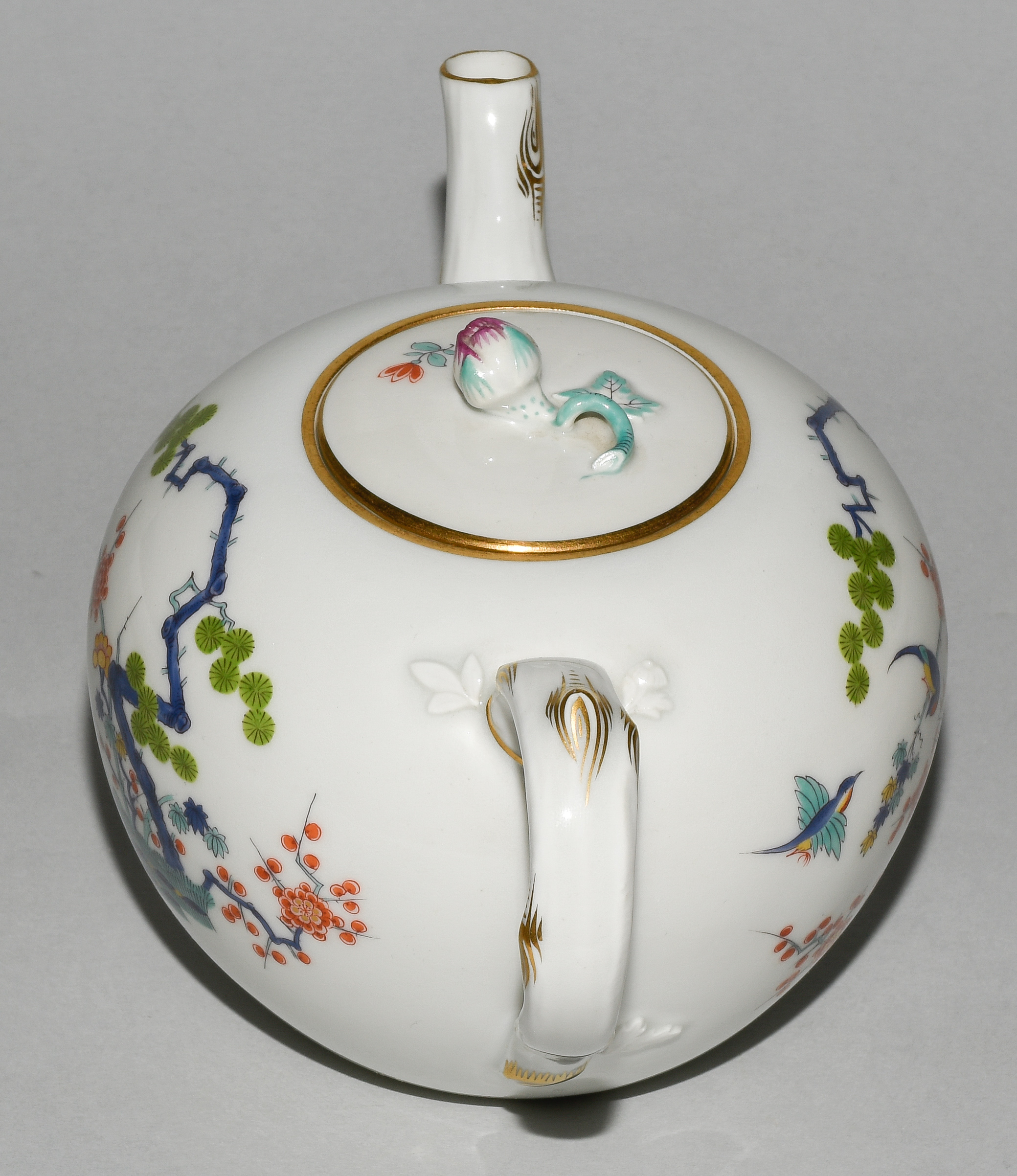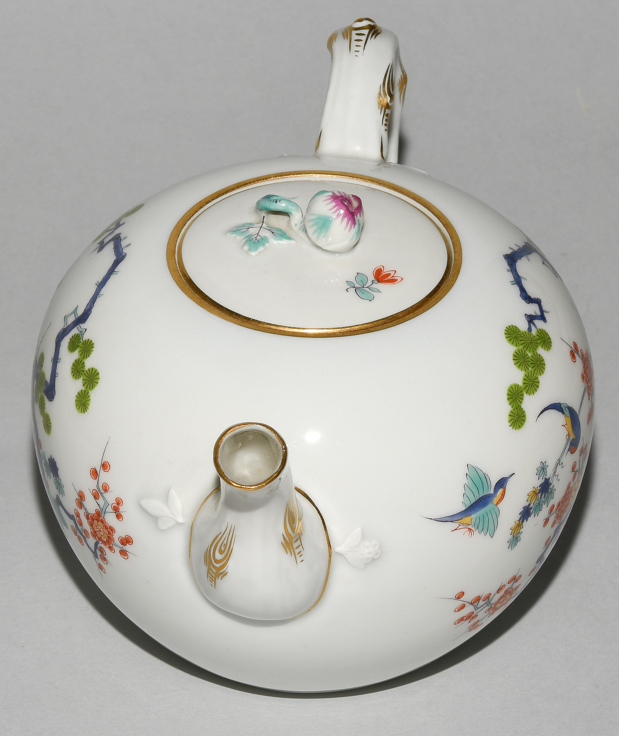 20.Jh. Porzellan. Unterglasurblaue Schwertermarke. Indisches Astmuster mit Vogelmalerei, bunt mit Kupferfarben. Knauf in Form einer Rose. Rocaillen- bzw, Asthenkel. Form "Neuer Ausschnitt". Gewellter Goldrand. Bestand: 1 Teekanne, 1 Cremier, 1 Zuckerdose, 1 runde Schale (D 27 cm), 4 Teetassen mit Untertassen (H 6 cm), 4 Dessertteller (D 18 cm). Total 12 Teile.
