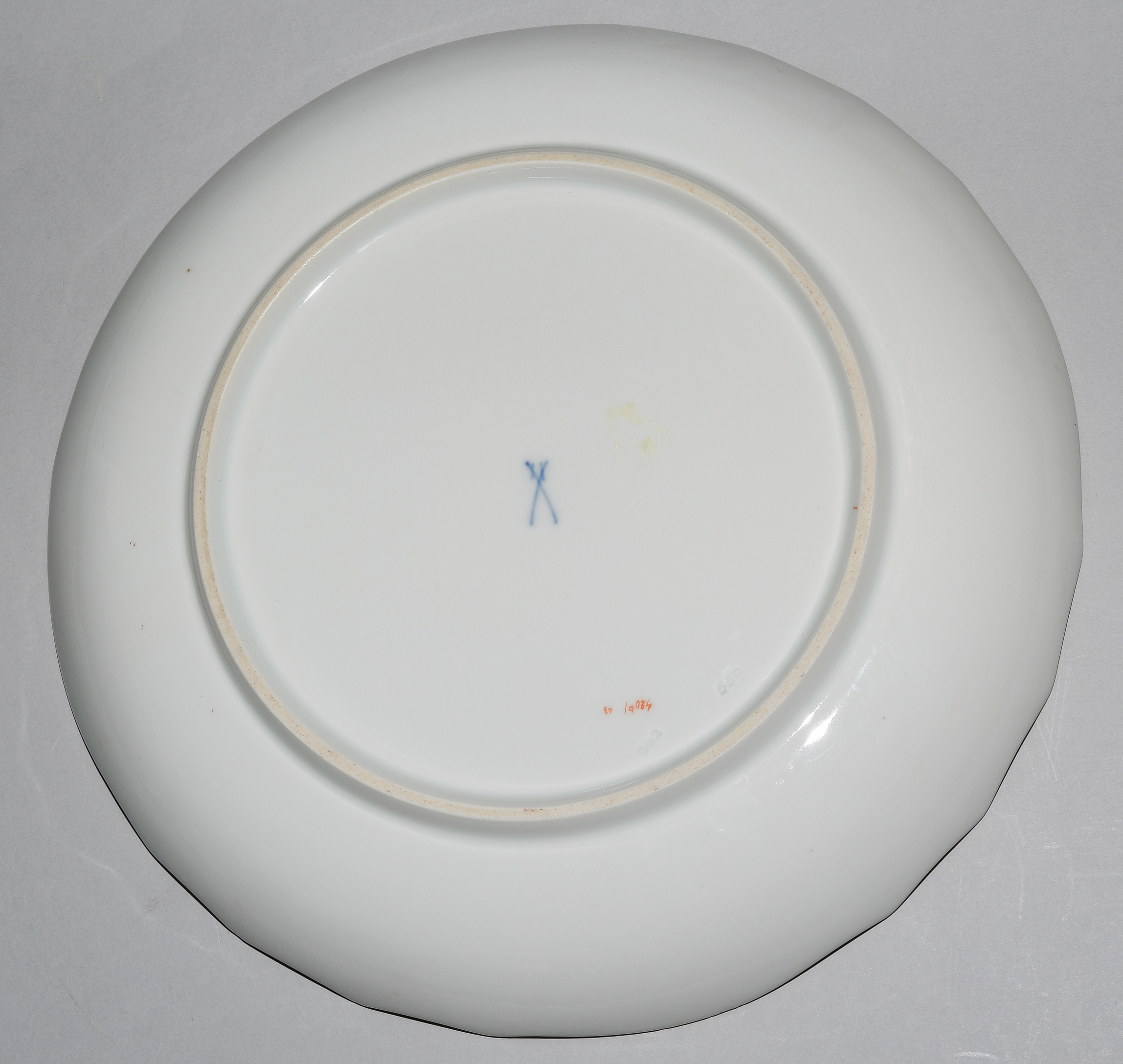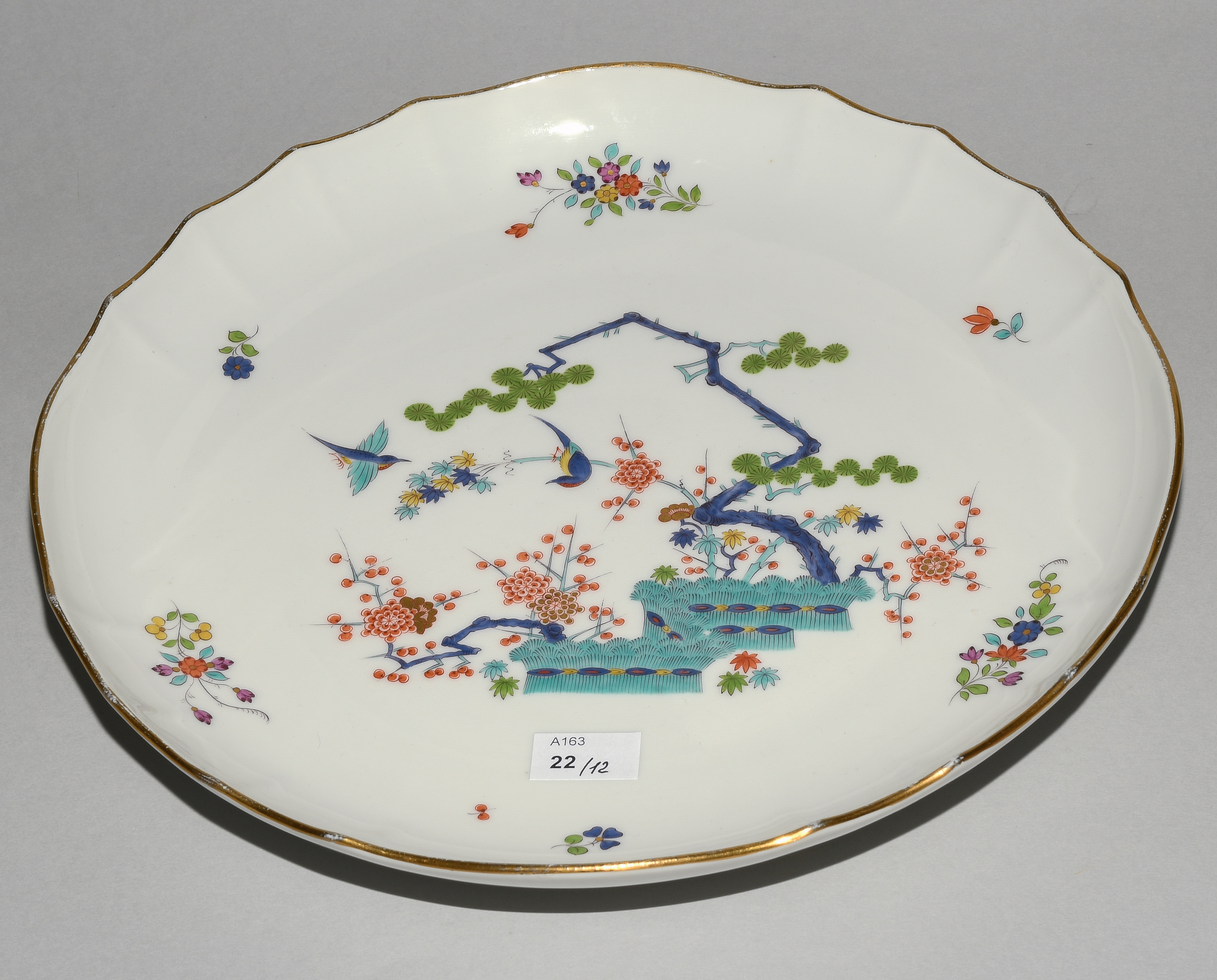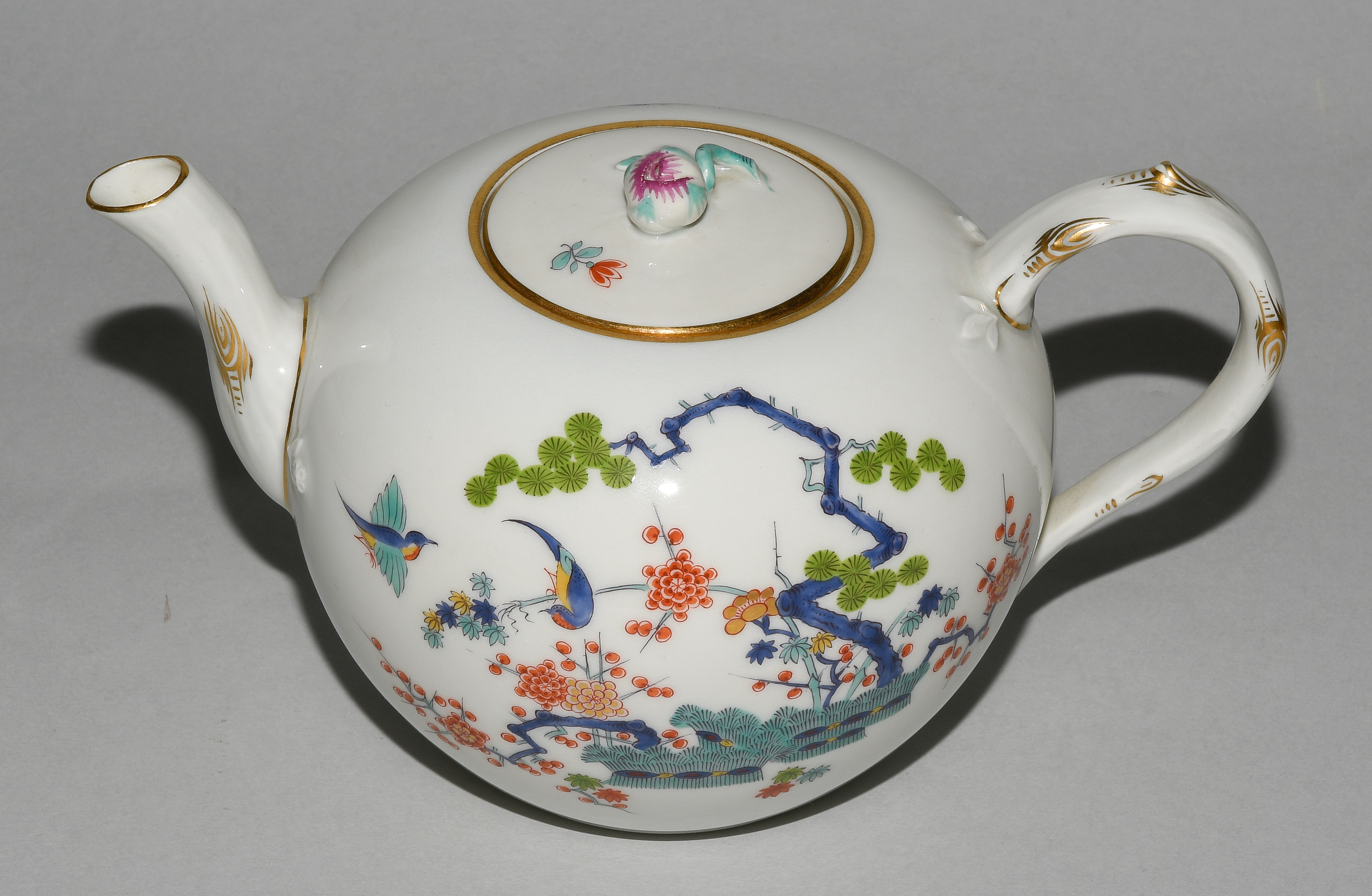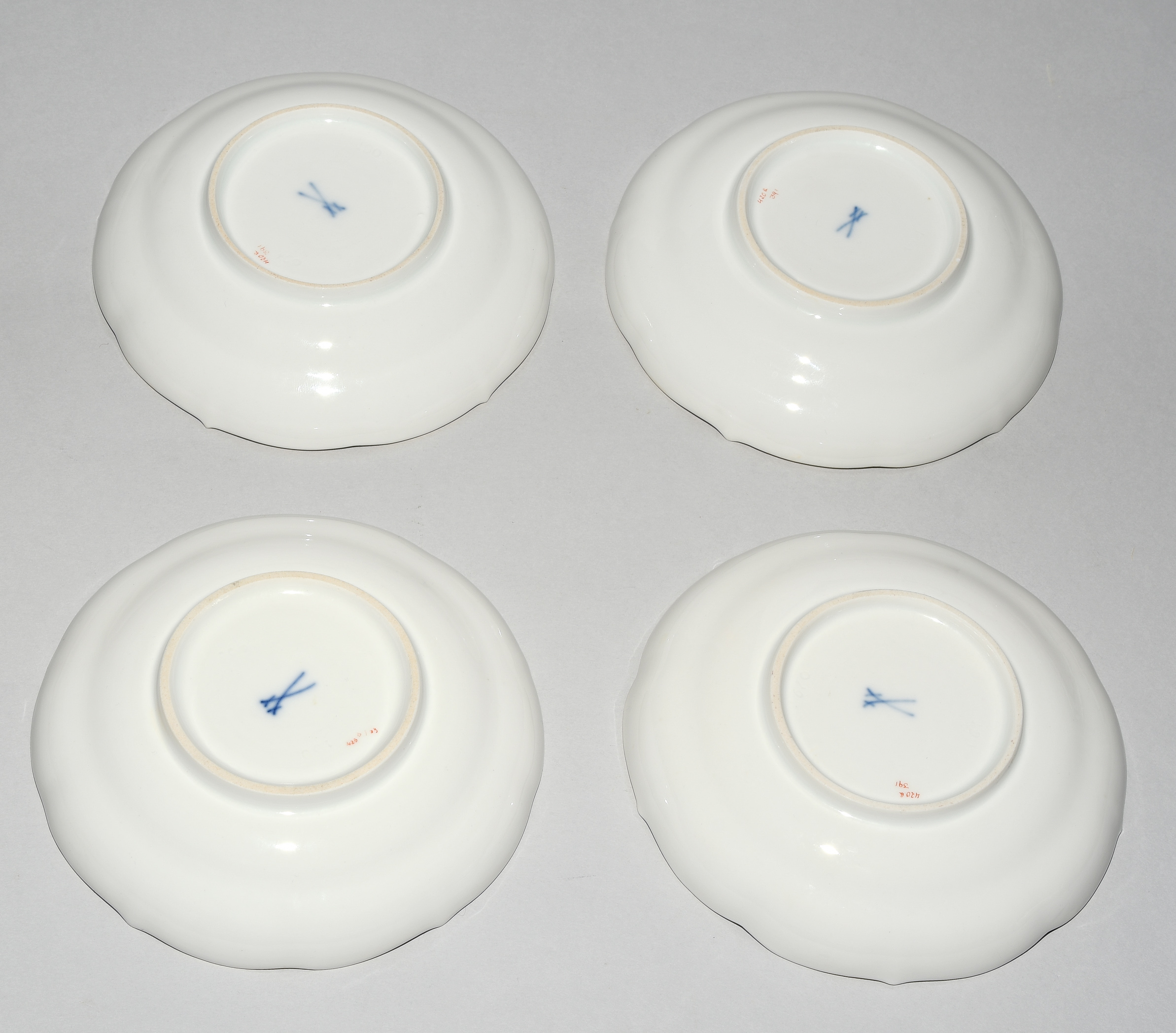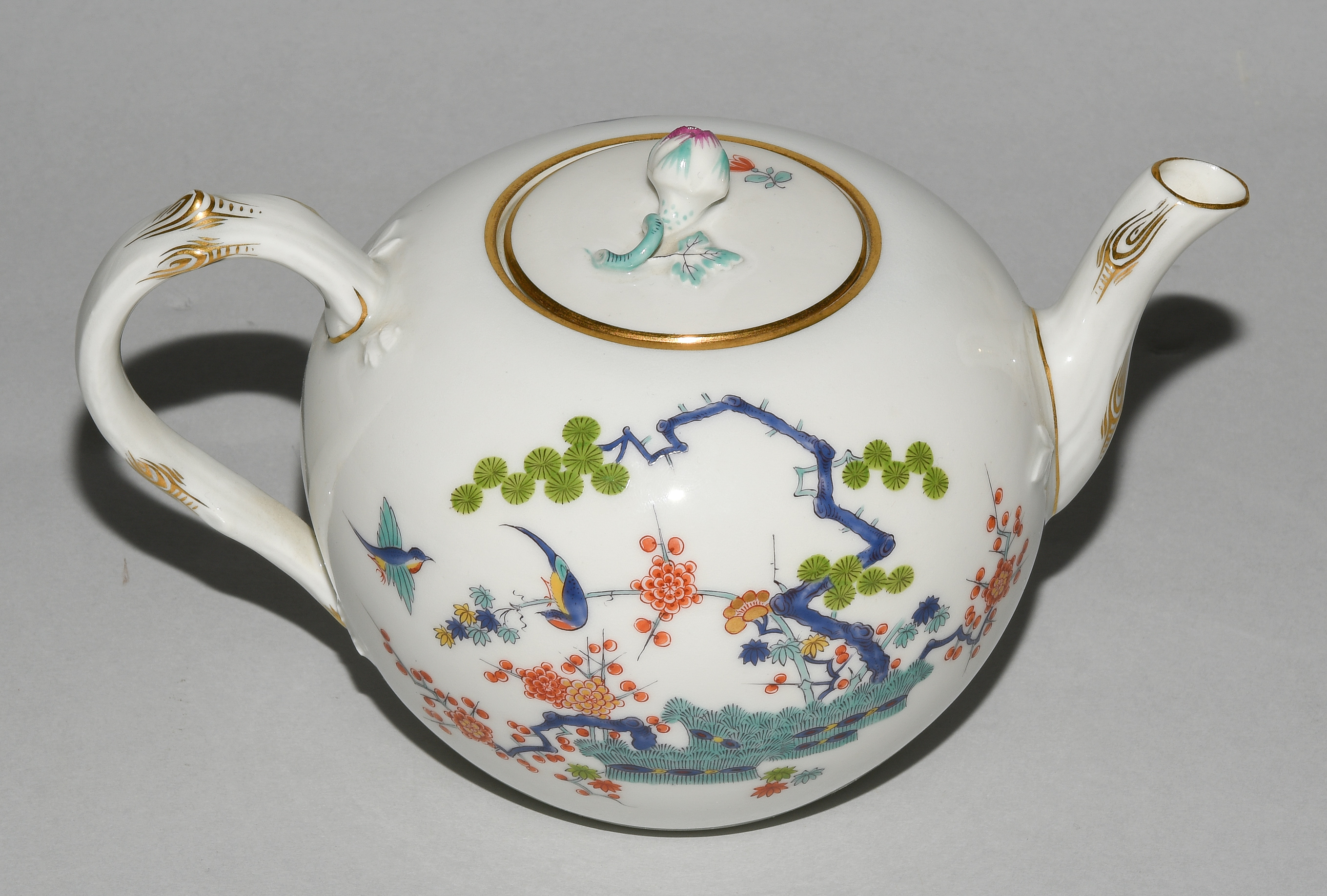 20.Jh. Porzellan. Unterglasurblaue Schwertermarke. Indisches Astmuster mit Vogelmalerei, bunt mit Kupferfarben. Knauf in Form einer Rose. Rocaillen- bzw, Asthenkel. Form "Neuer Ausschnitt". Gewellter Goldrand. Bestand: 1 Teekanne, 1 Cremier, 1 Zuckerdose, 1 runde Schale (D 27 cm), 4 Teetassen mit Untertassen (H 6 cm), 4 Dessertteller (D 18 cm). Total 12 Teile.
