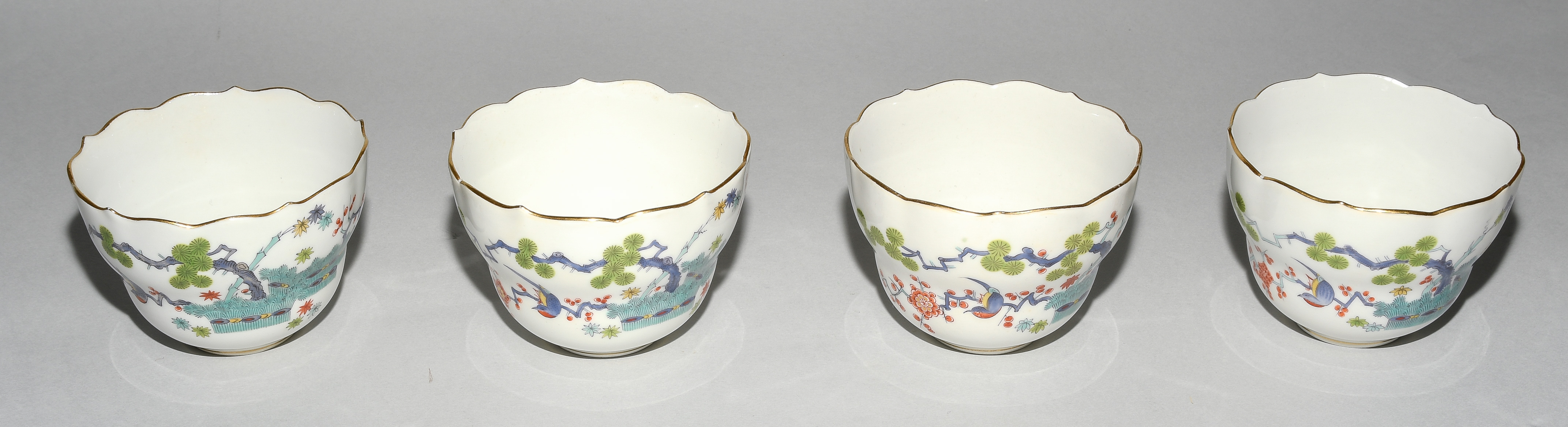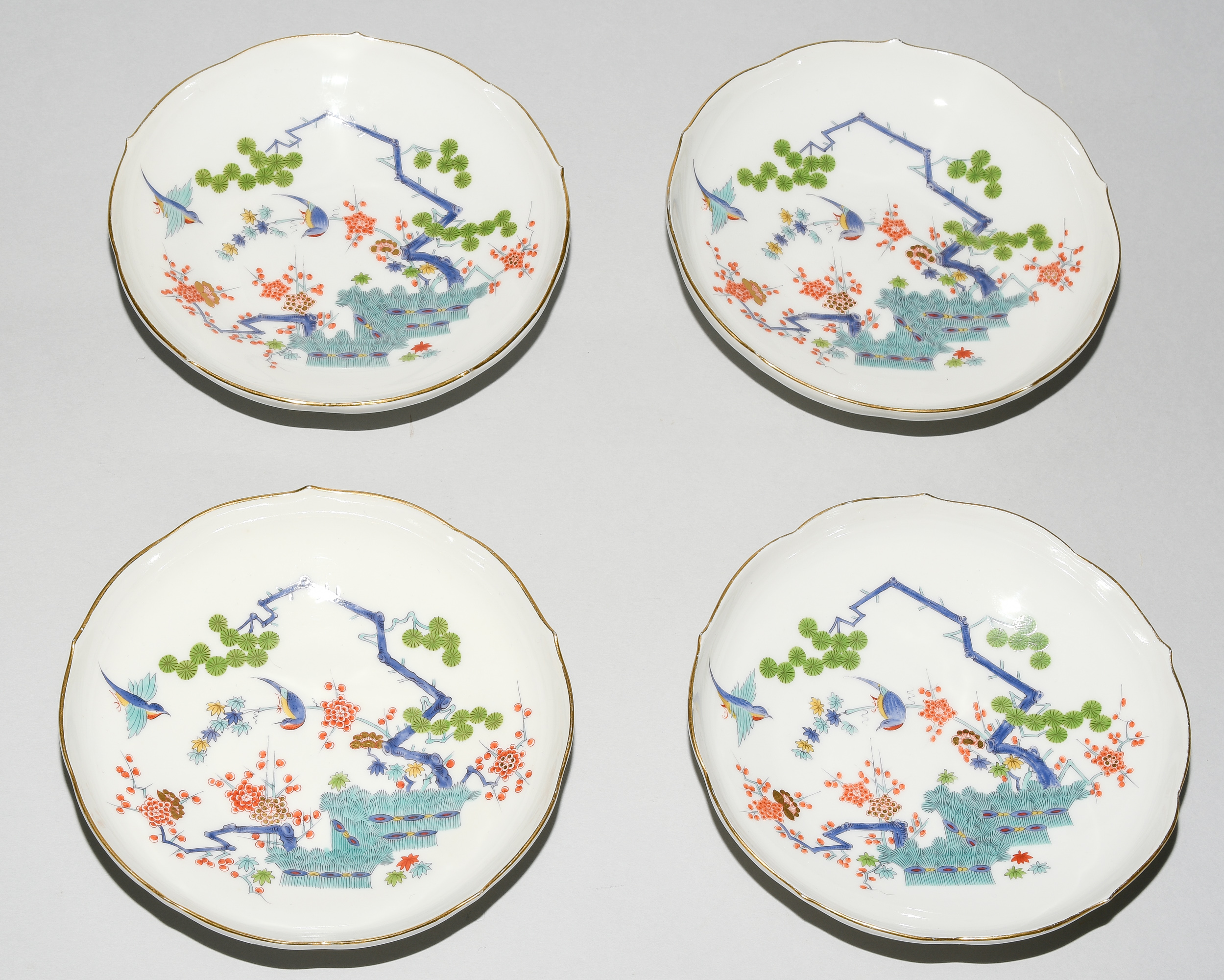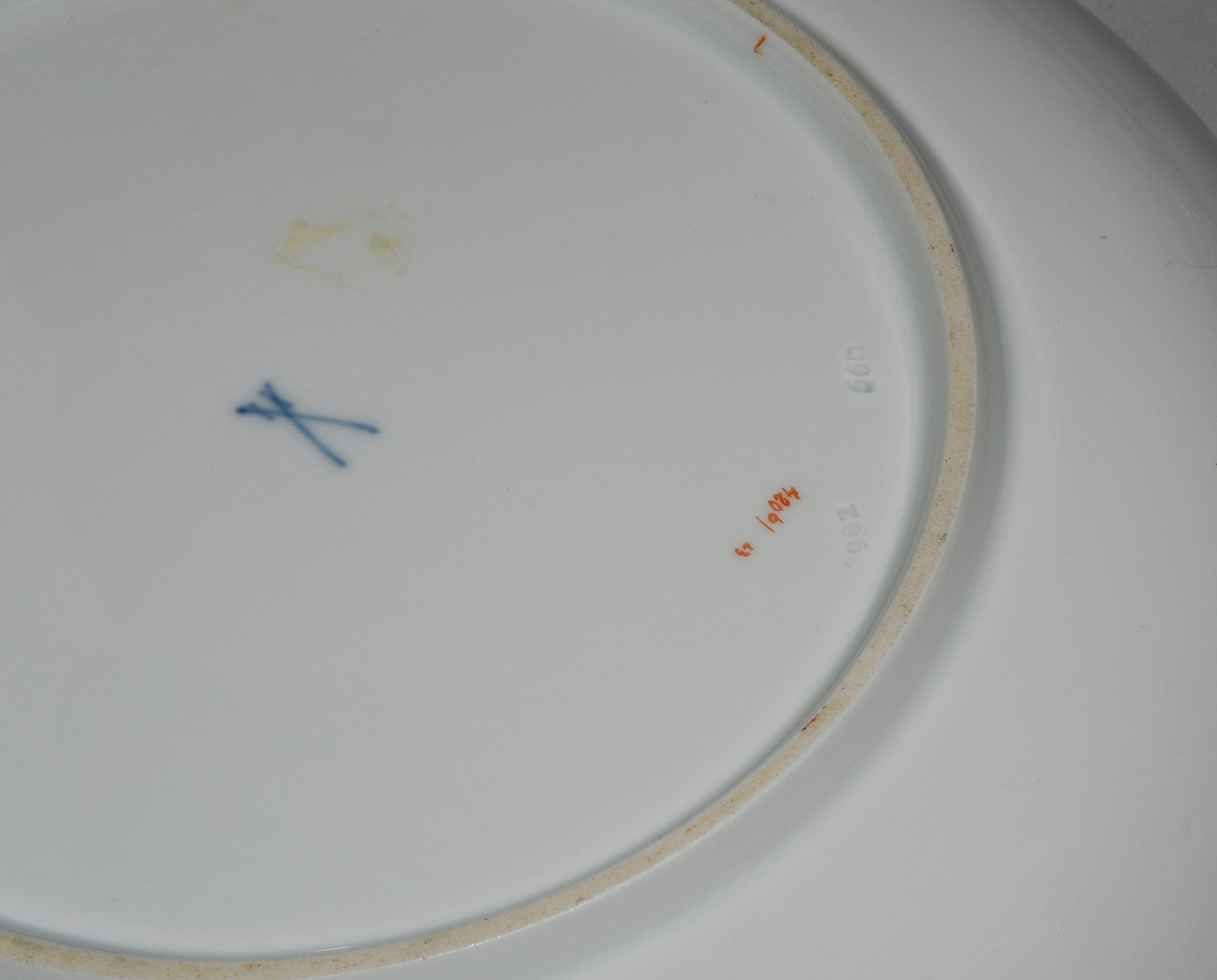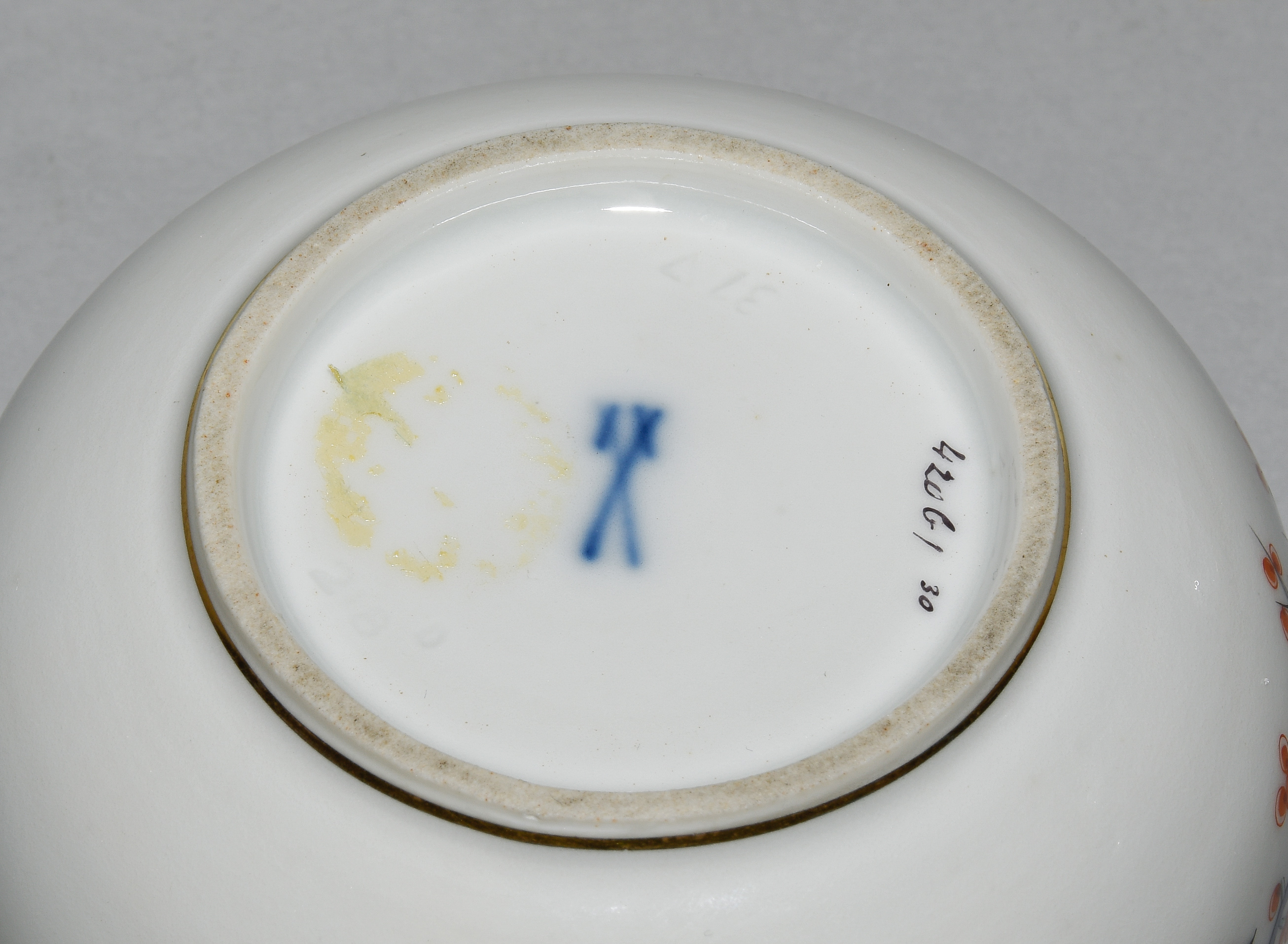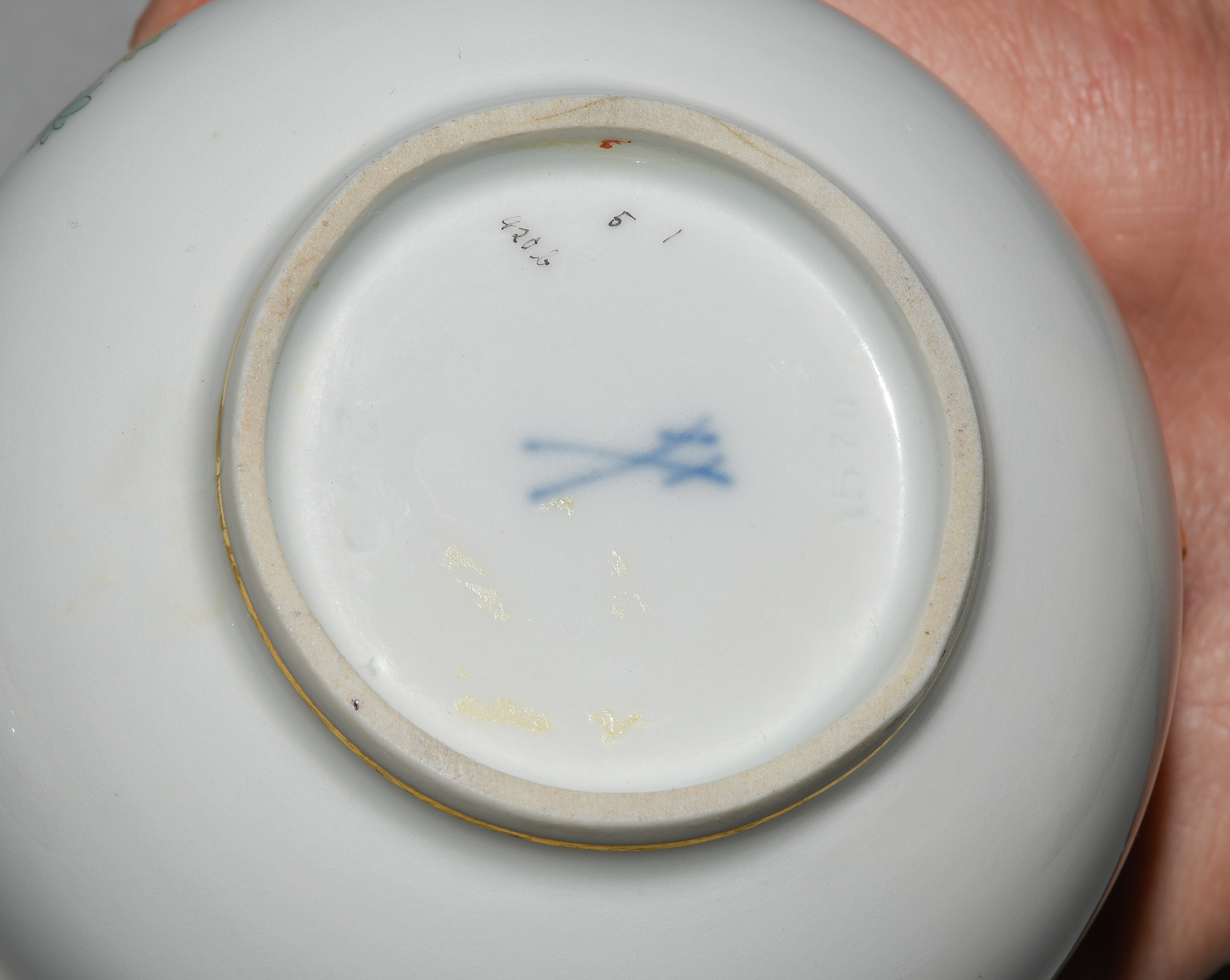 20.Jh. Porzellan. Unterglasurblaue Schwertermarke. Indisches Astmuster mit Vogelmalerei, bunt mit Kupferfarben. Knauf in Form einer Rose. Rocaillen- bzw, Asthenkel. Form "Neuer Ausschnitt". Gewellter Goldrand. Bestand: 1 Teekanne, 1 Cremier, 1 Zuckerdose, 1 runde Schale (D 27 cm), 4 Teetassen mit Untertassen (H 6 cm), 4 Dessertteller (D 18 cm). Total 12 Teile.