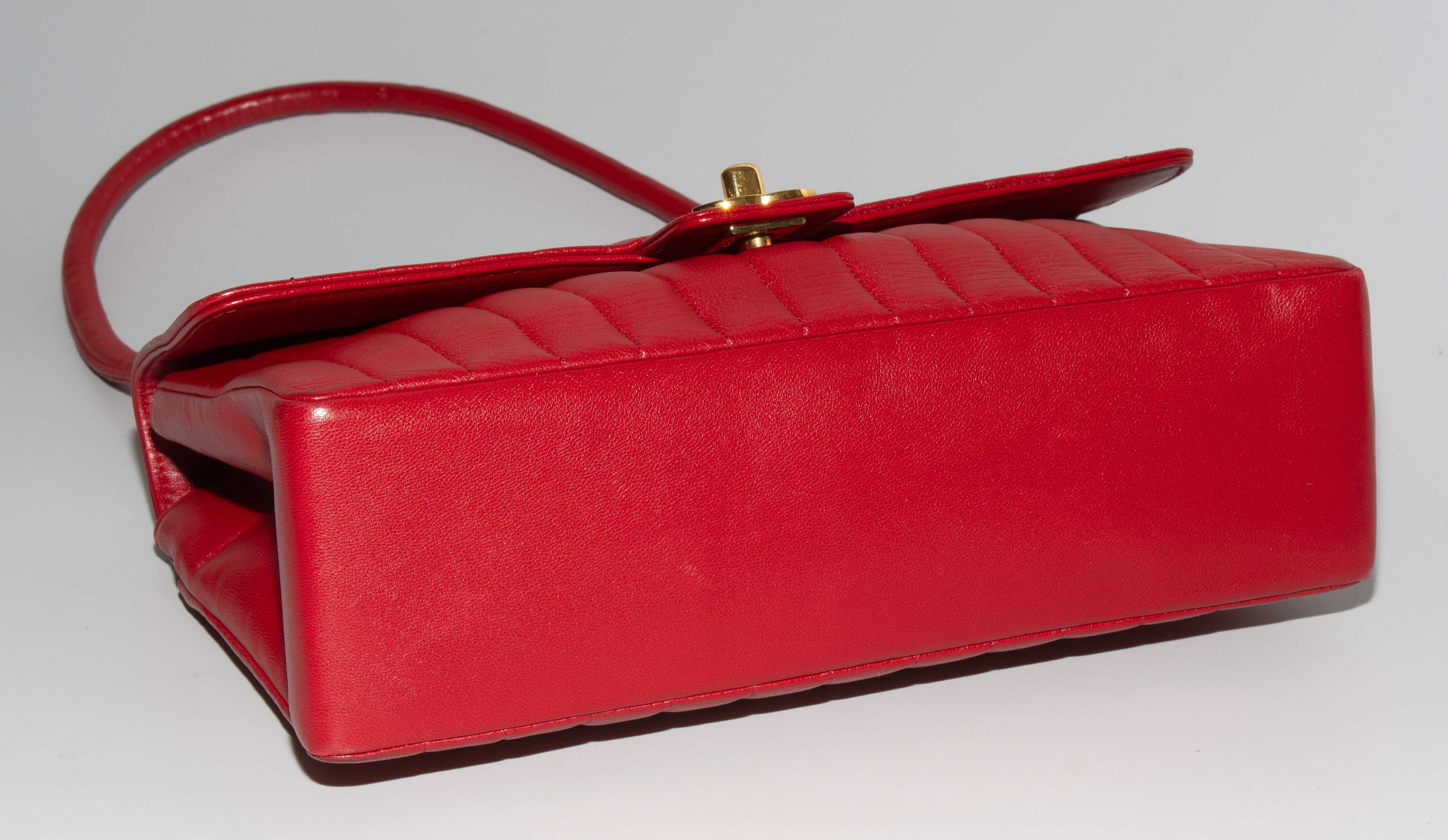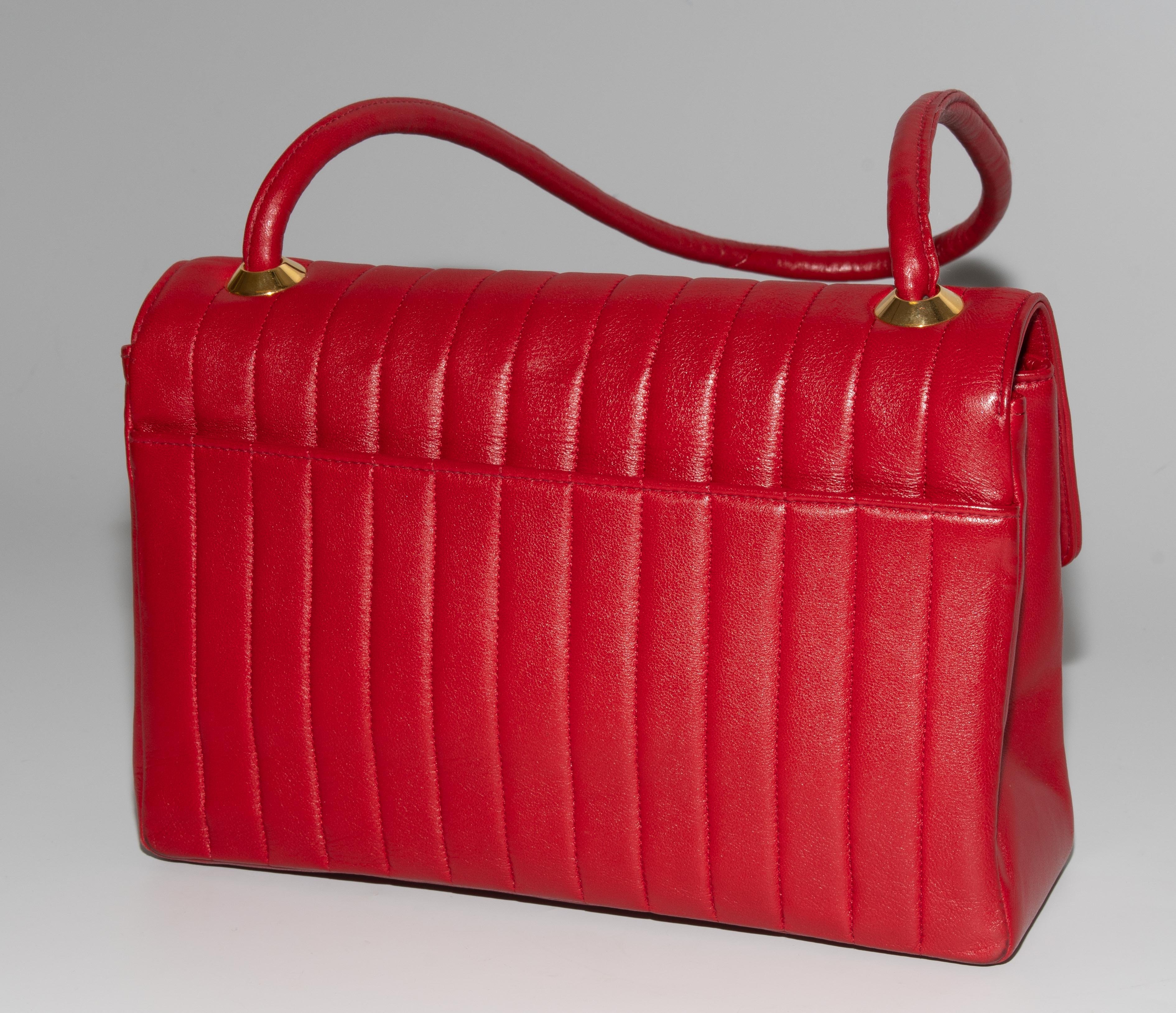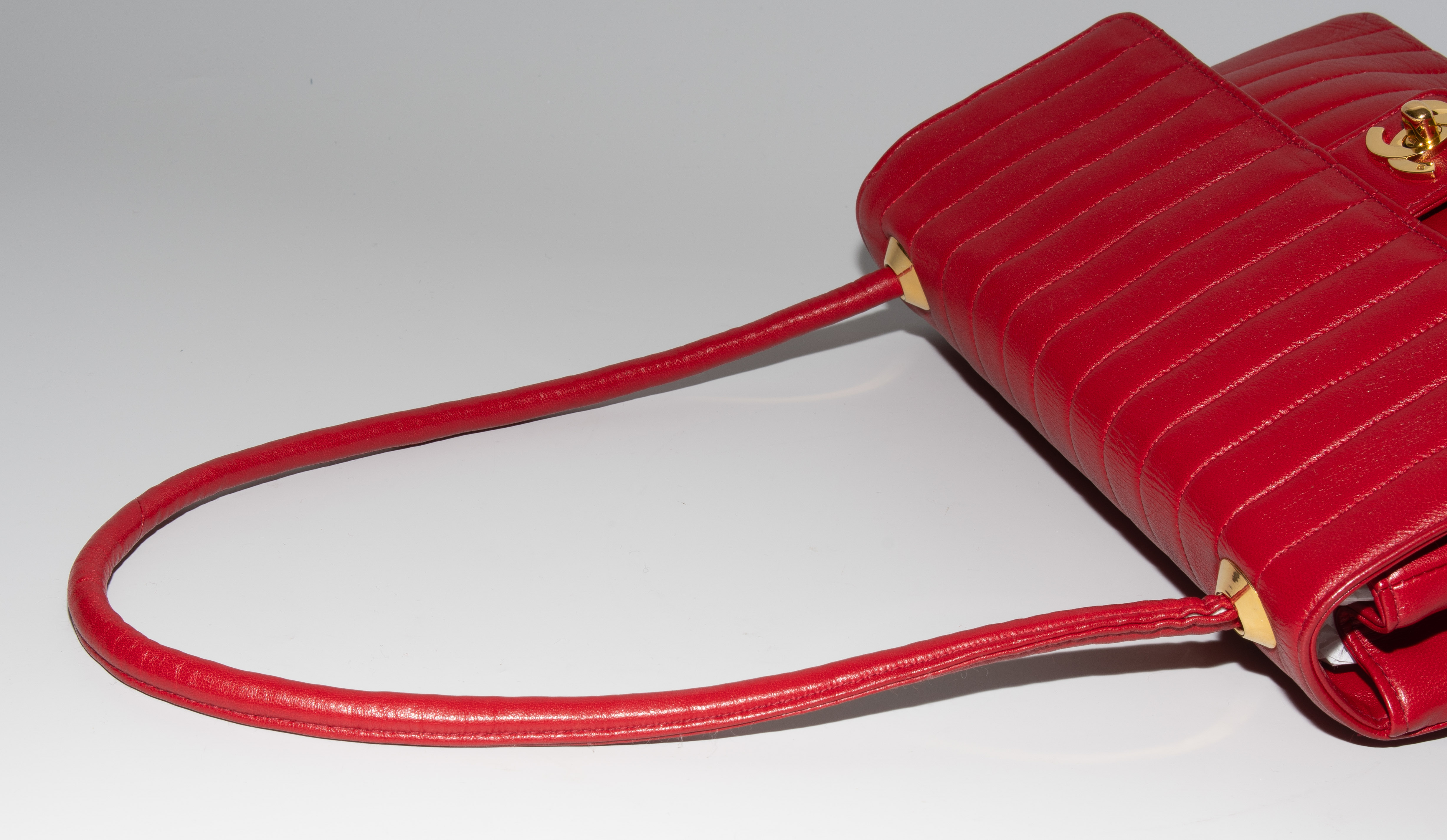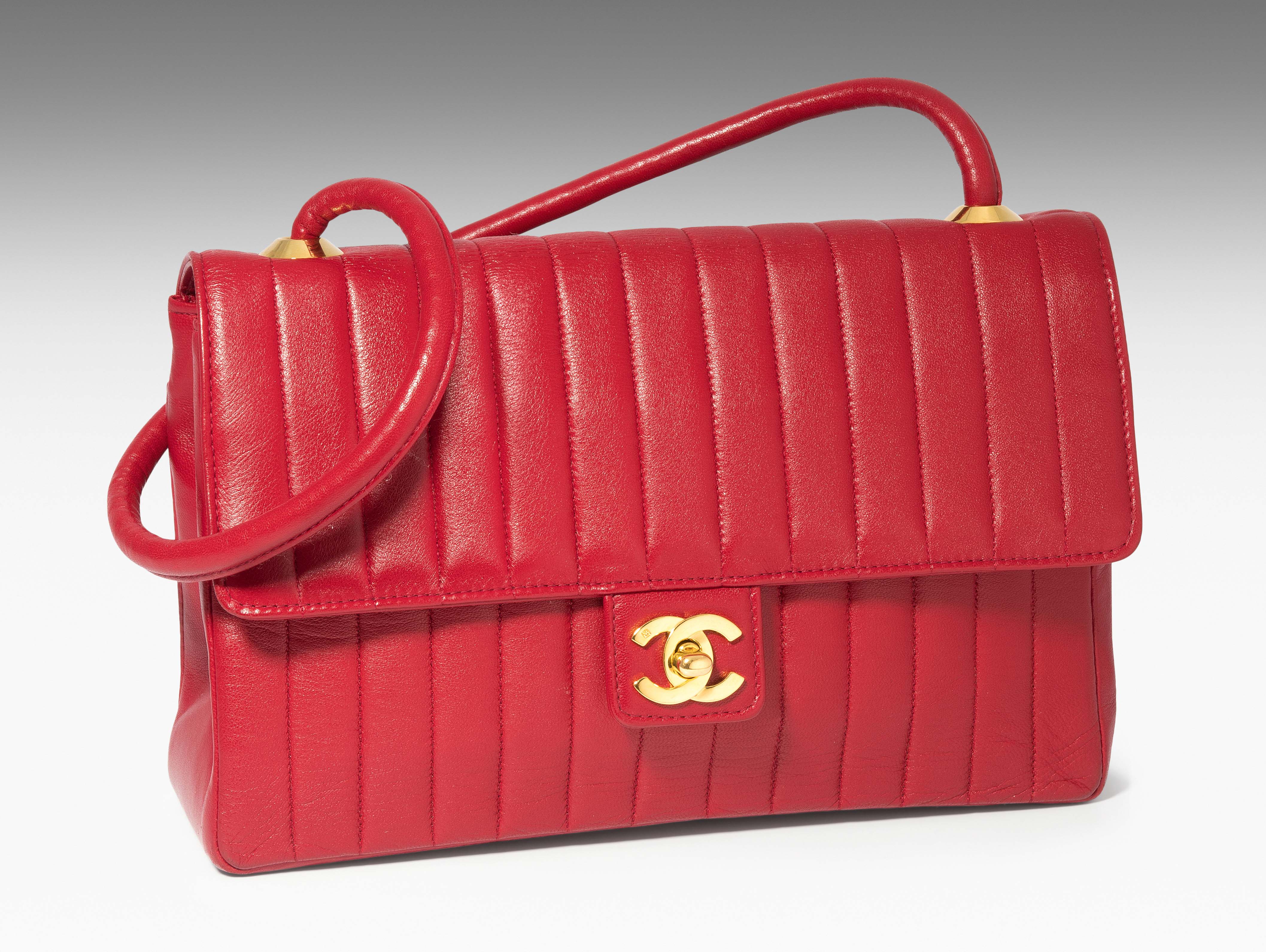 1989–1991. Aus rotem, vertikal gestepptem Leder. Gerollter Schulterriemen. Rückseite mit offennem Fach. Drehverschluss mit goldfarbenem CC-Logo. 25x15,5x7,5 cm.