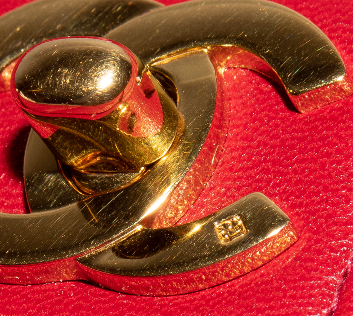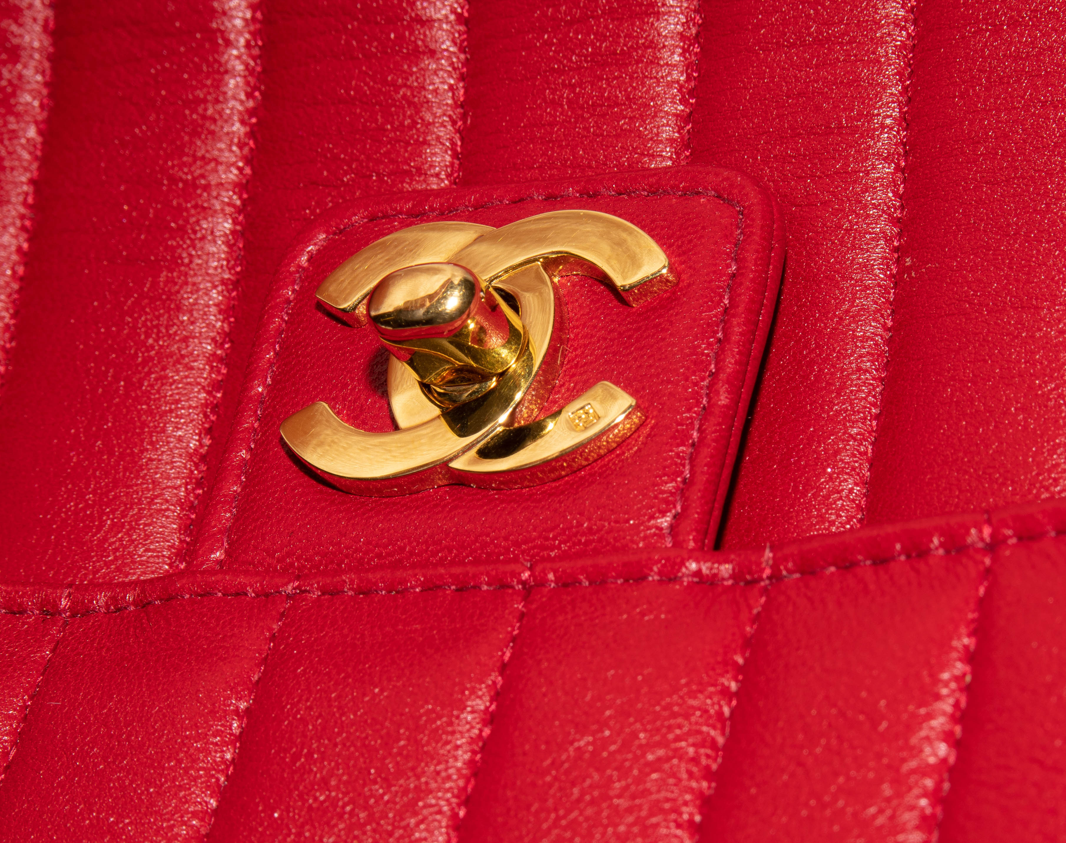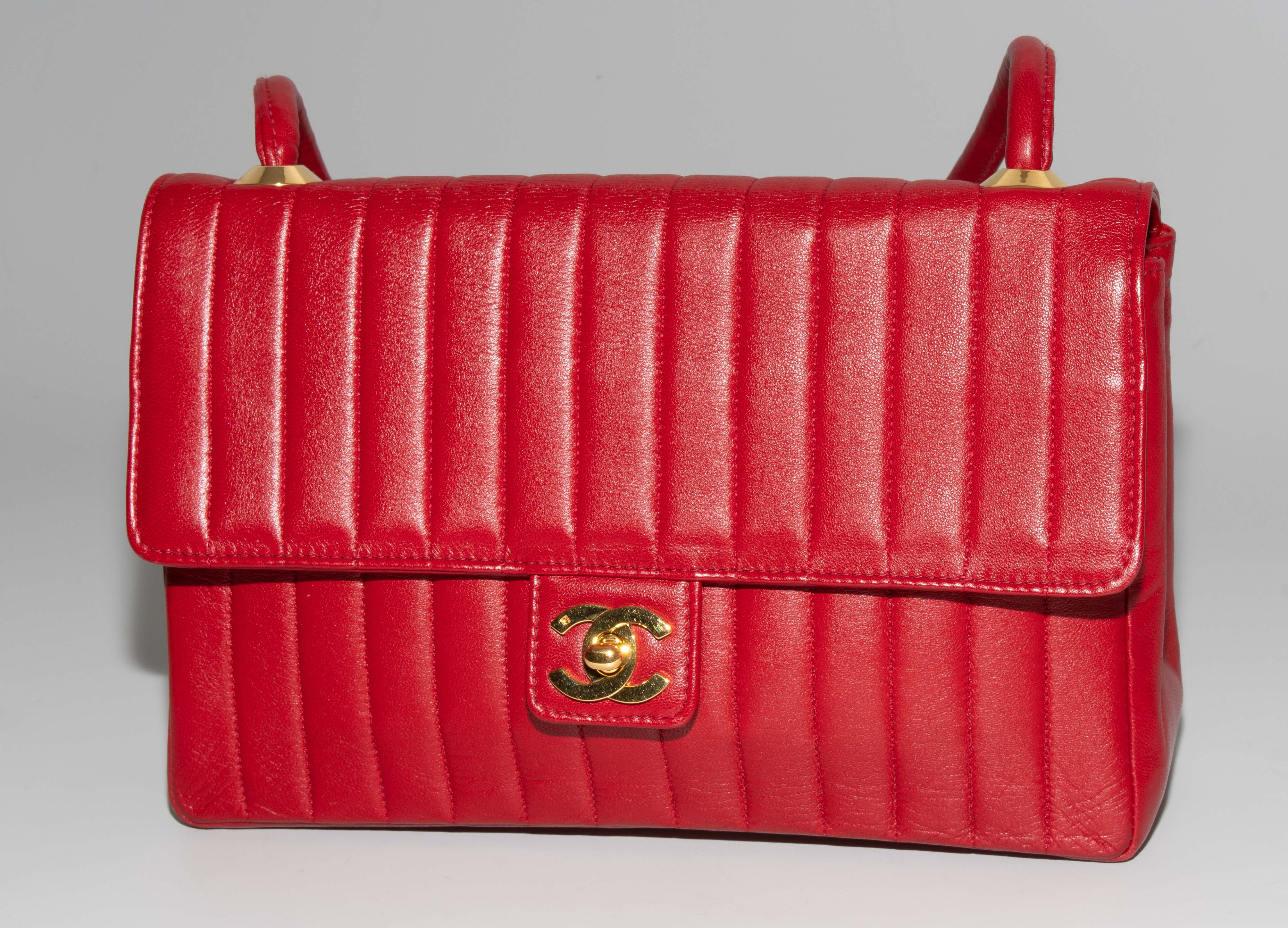 1989–1991. Aus rotem, vertikal gestepptem Leder. Gerollter Schulterriemen. Rückseite mit offennem Fach. Drehverschluss mit goldfarbenem CC-Logo. 25x15,5x7,5 cm.