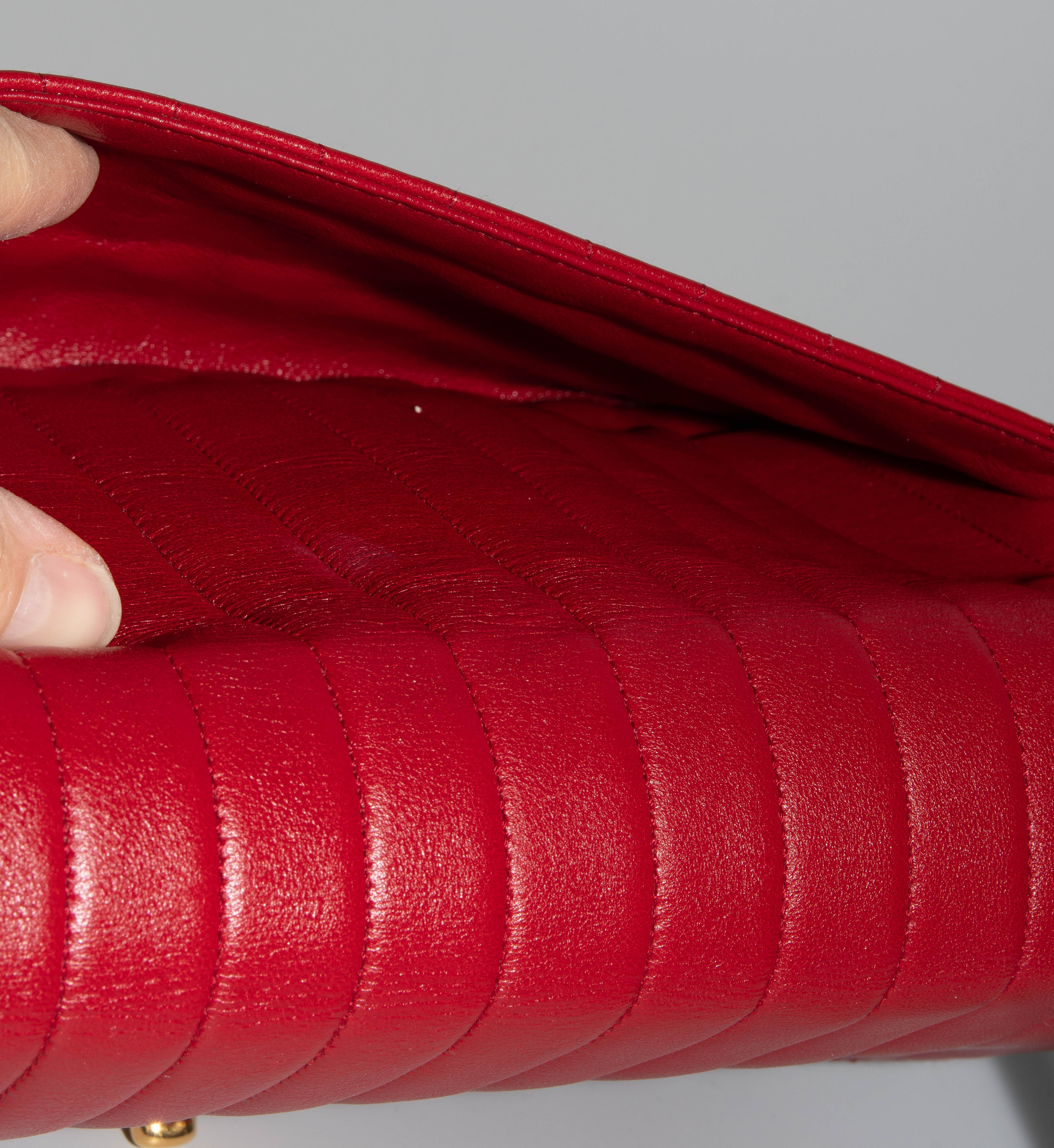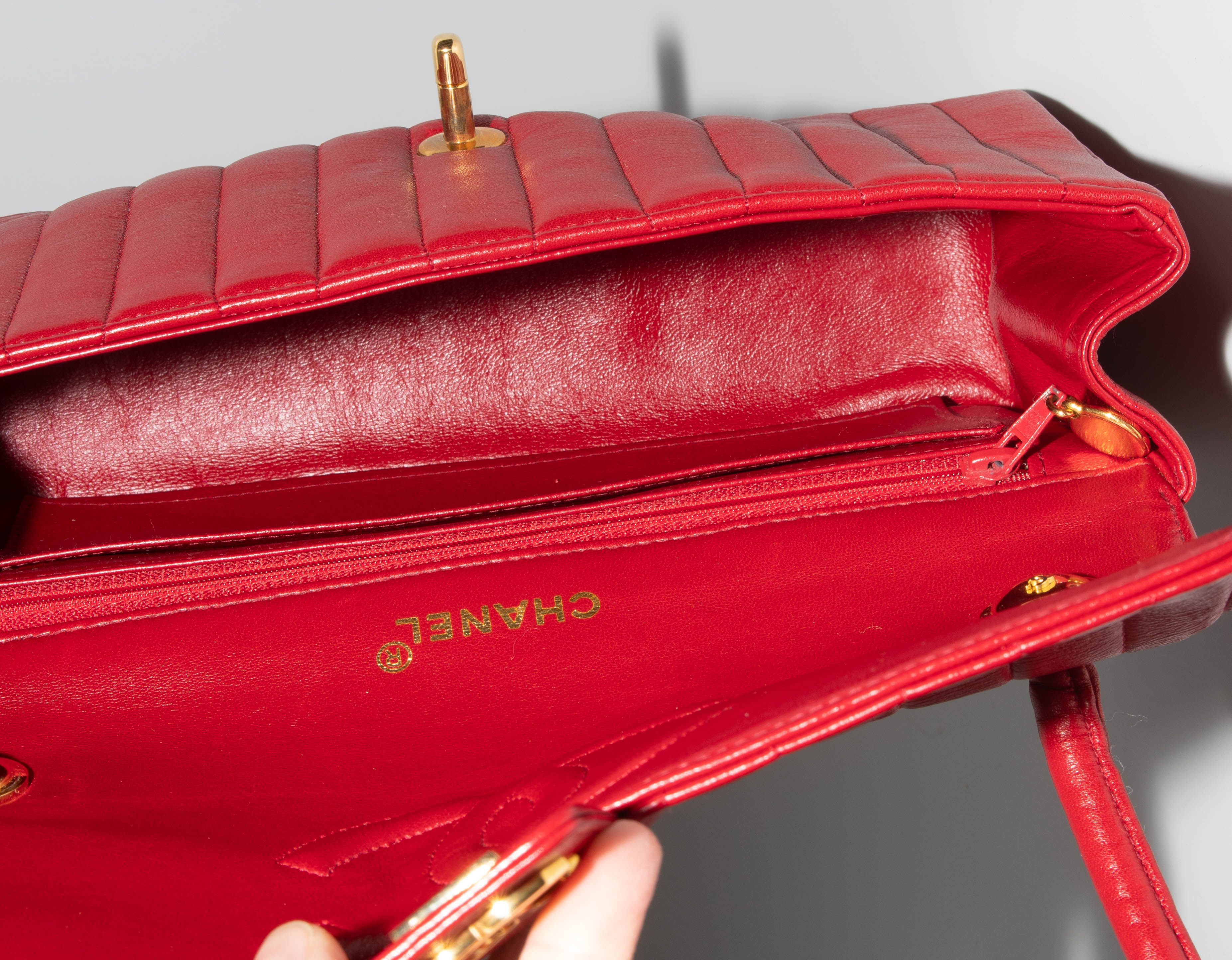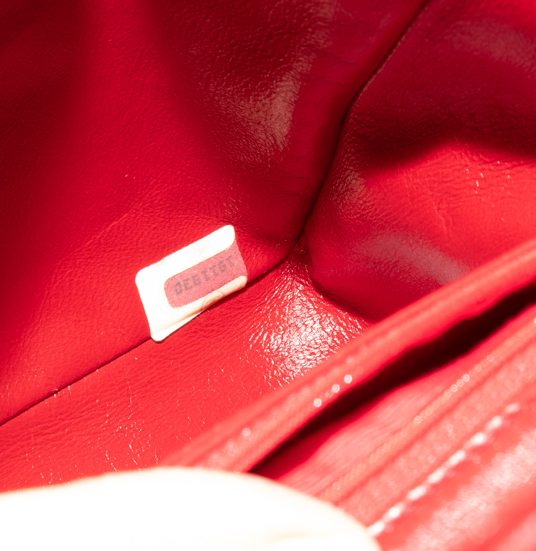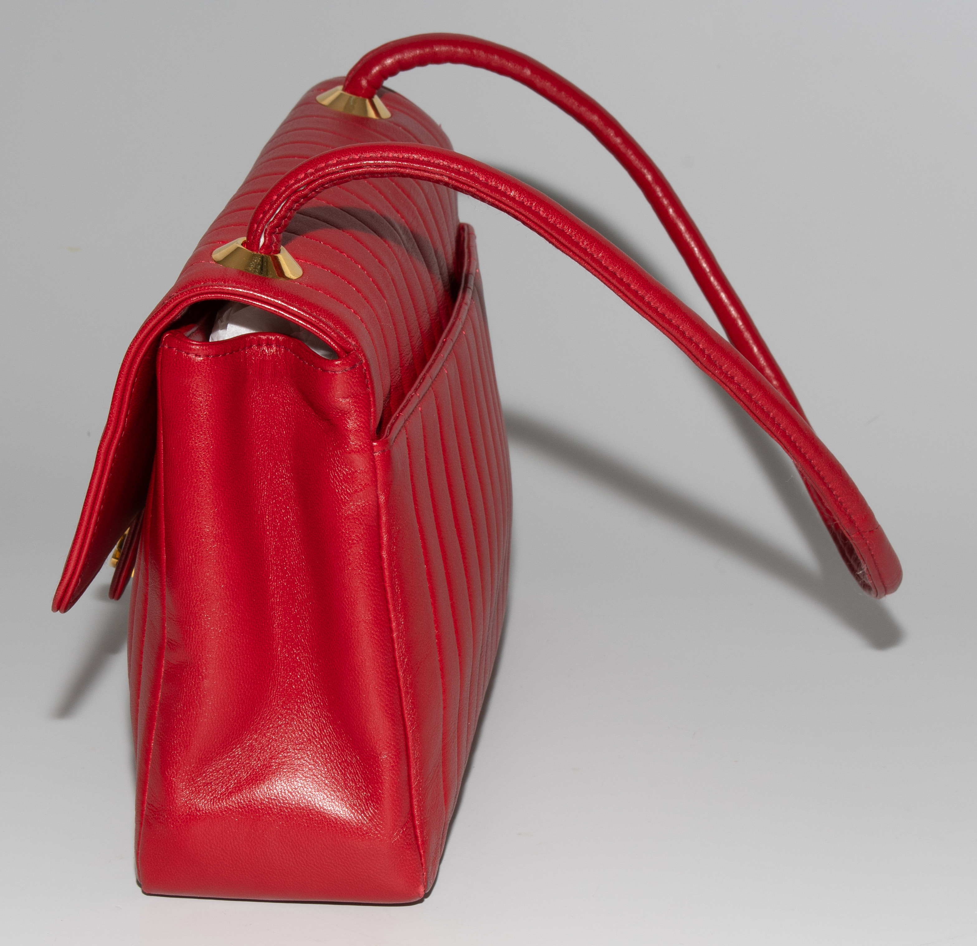 1989–1991. Aus rotem, vertikal gestepptem Leder. Gerollter Schulterriemen. Rückseite mit offennem Fach. Drehverschluss mit goldfarbenem CC-Logo. 25x15,5x7,5 cm.