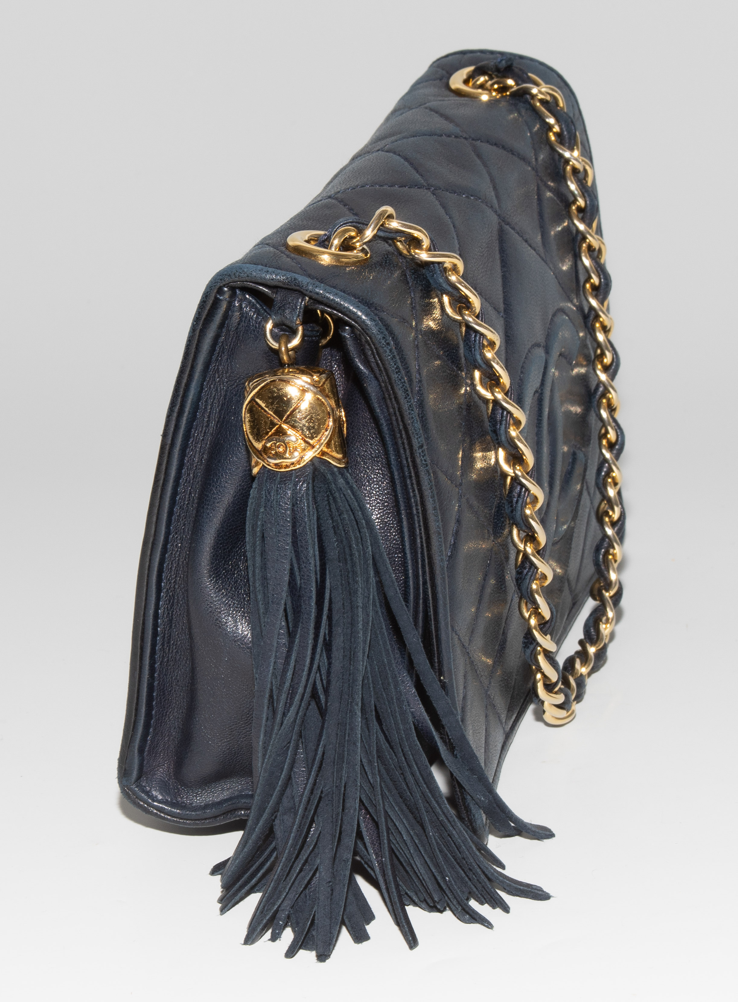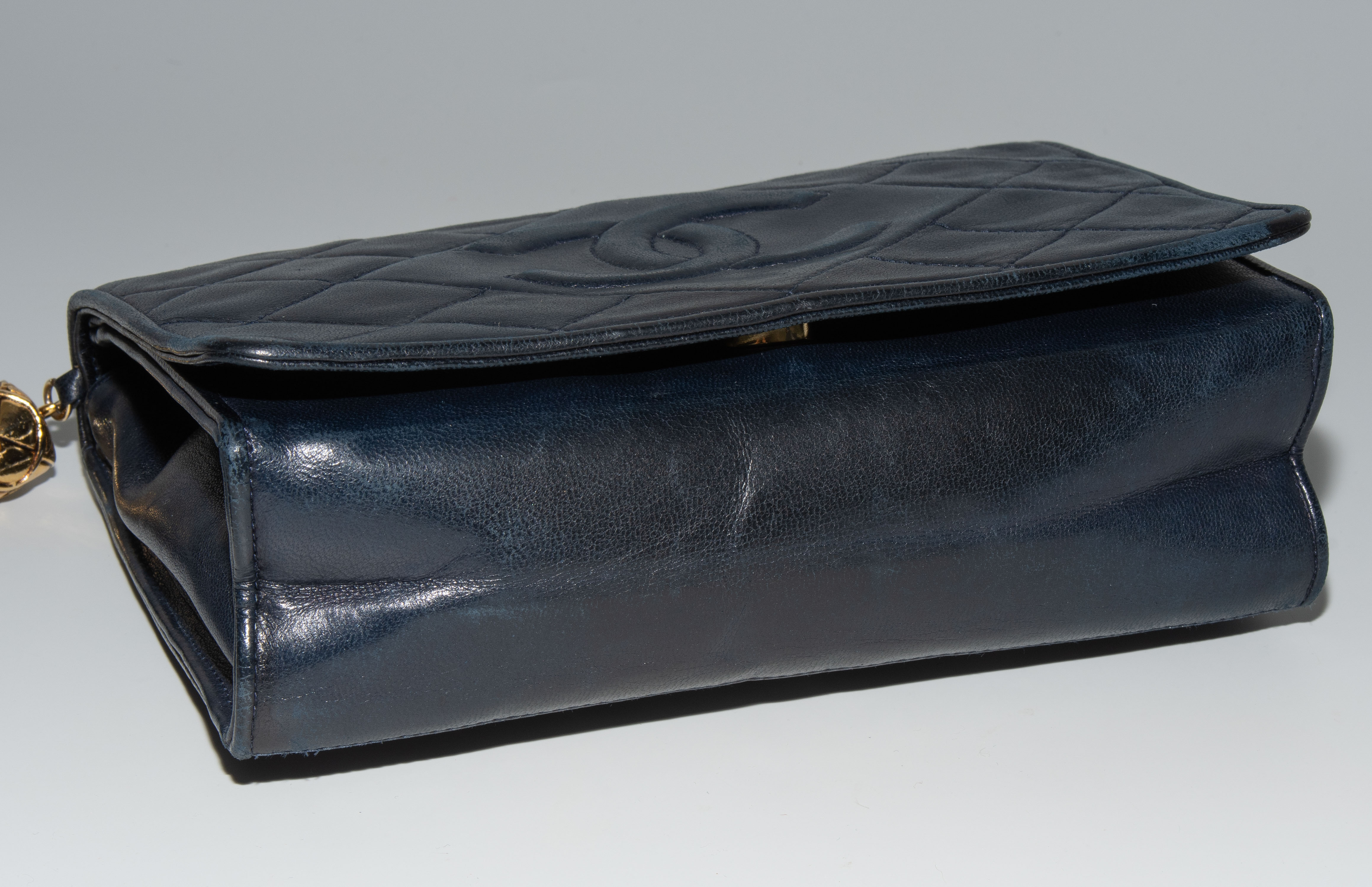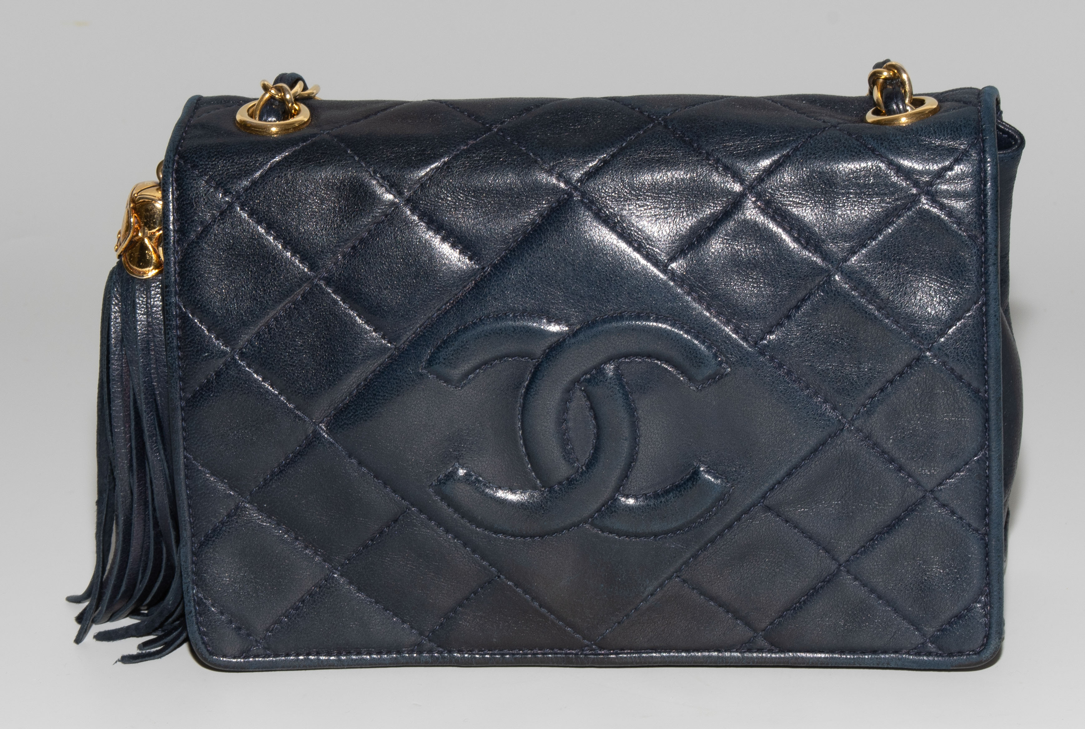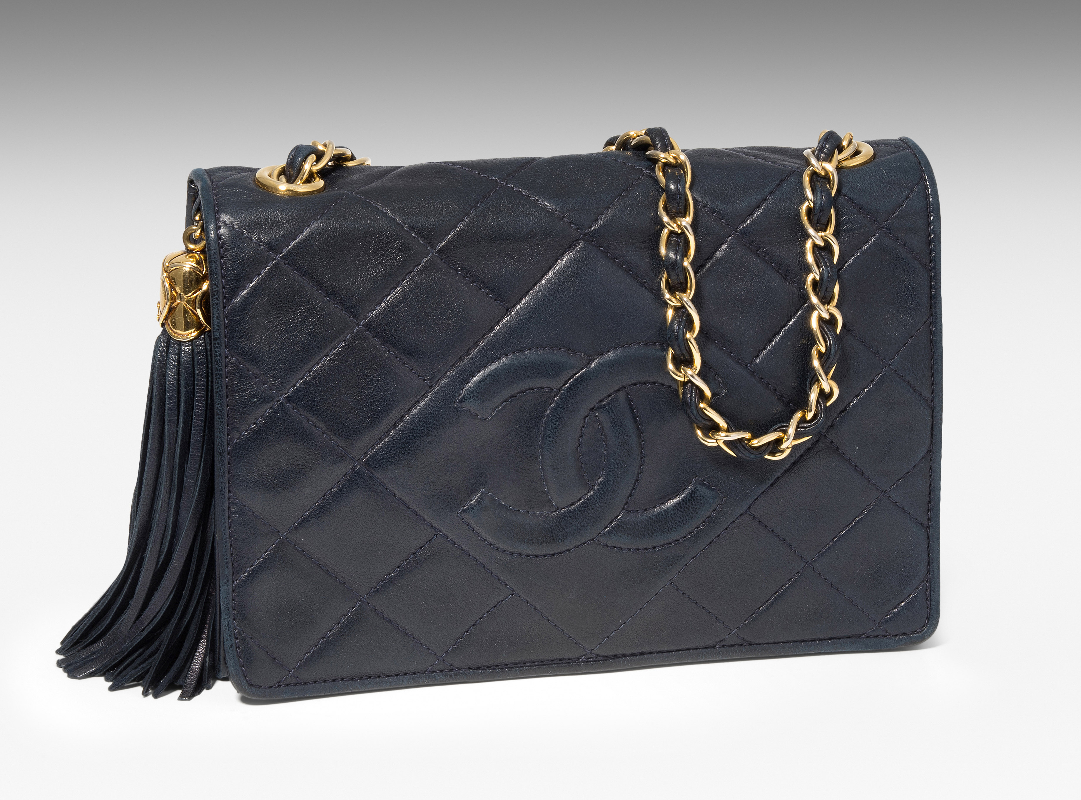 1989–1991. Aus dunkelblauem, gestepptem Leder. Lederdurchflochtener Kettenriemen aus goldfarbenem Metall. Vorne mit Magnetverschluss und CC-Logo. Quastenanhänger. Mit Schutzbeutel. 19,2x14x5 cm.