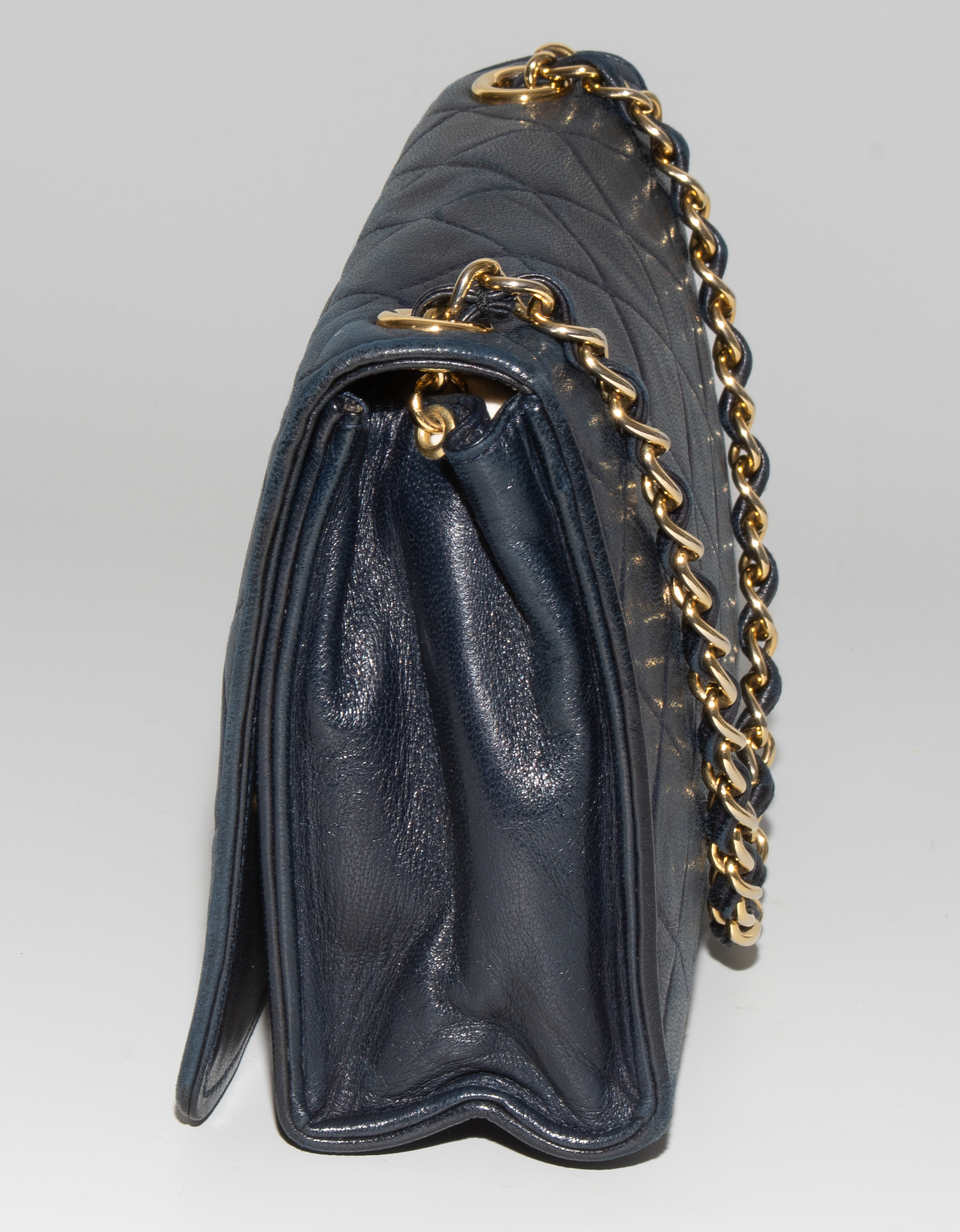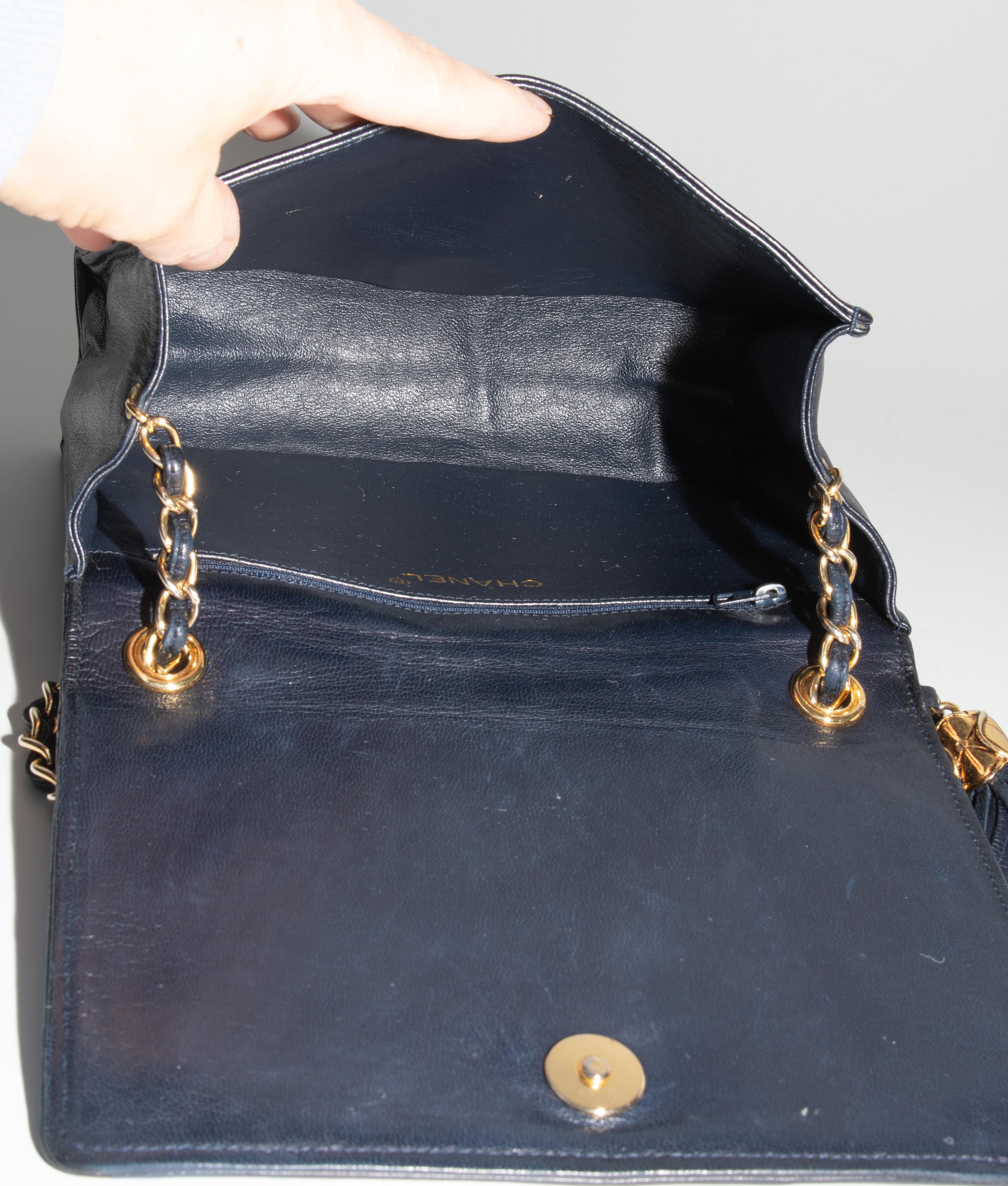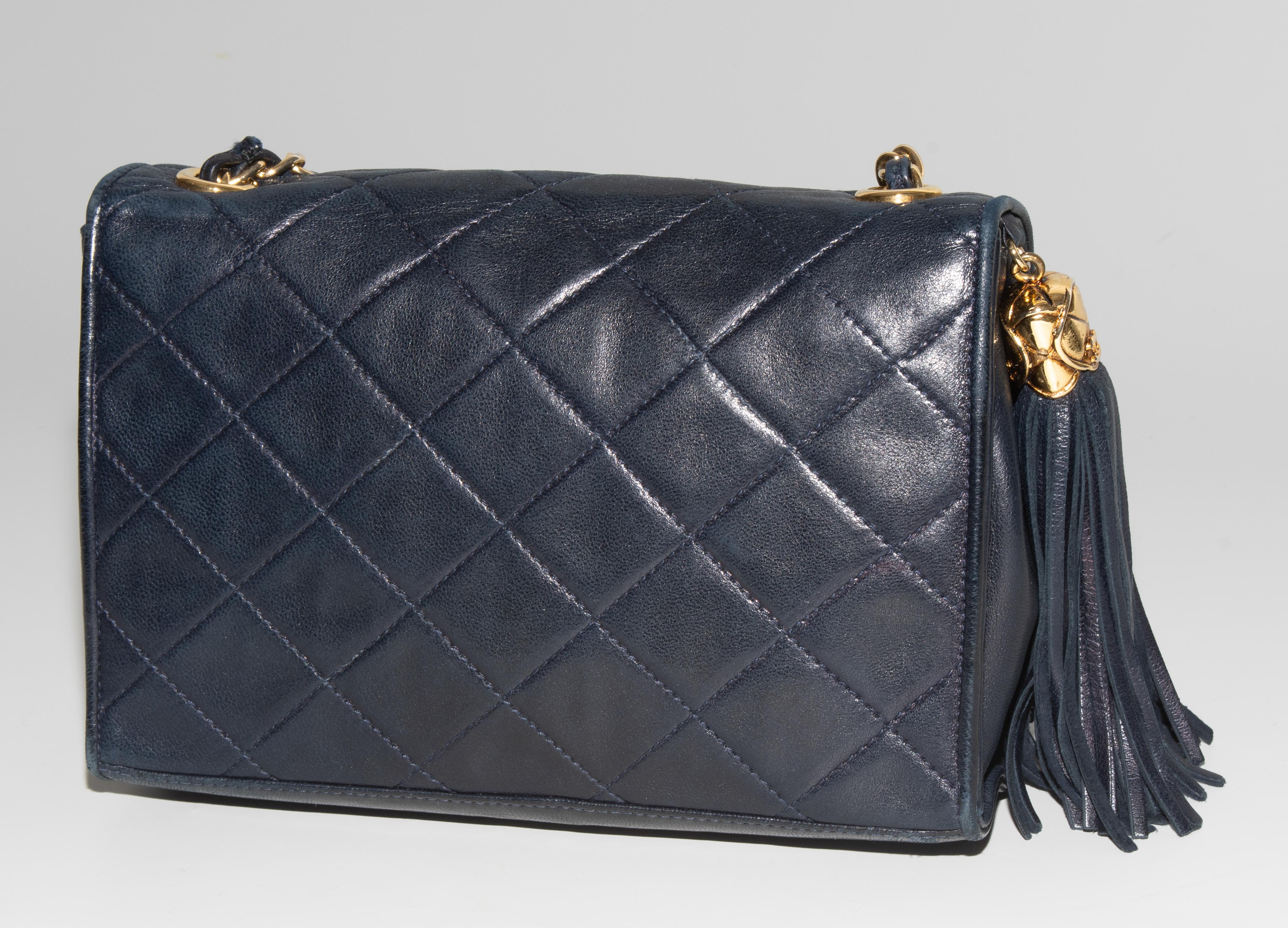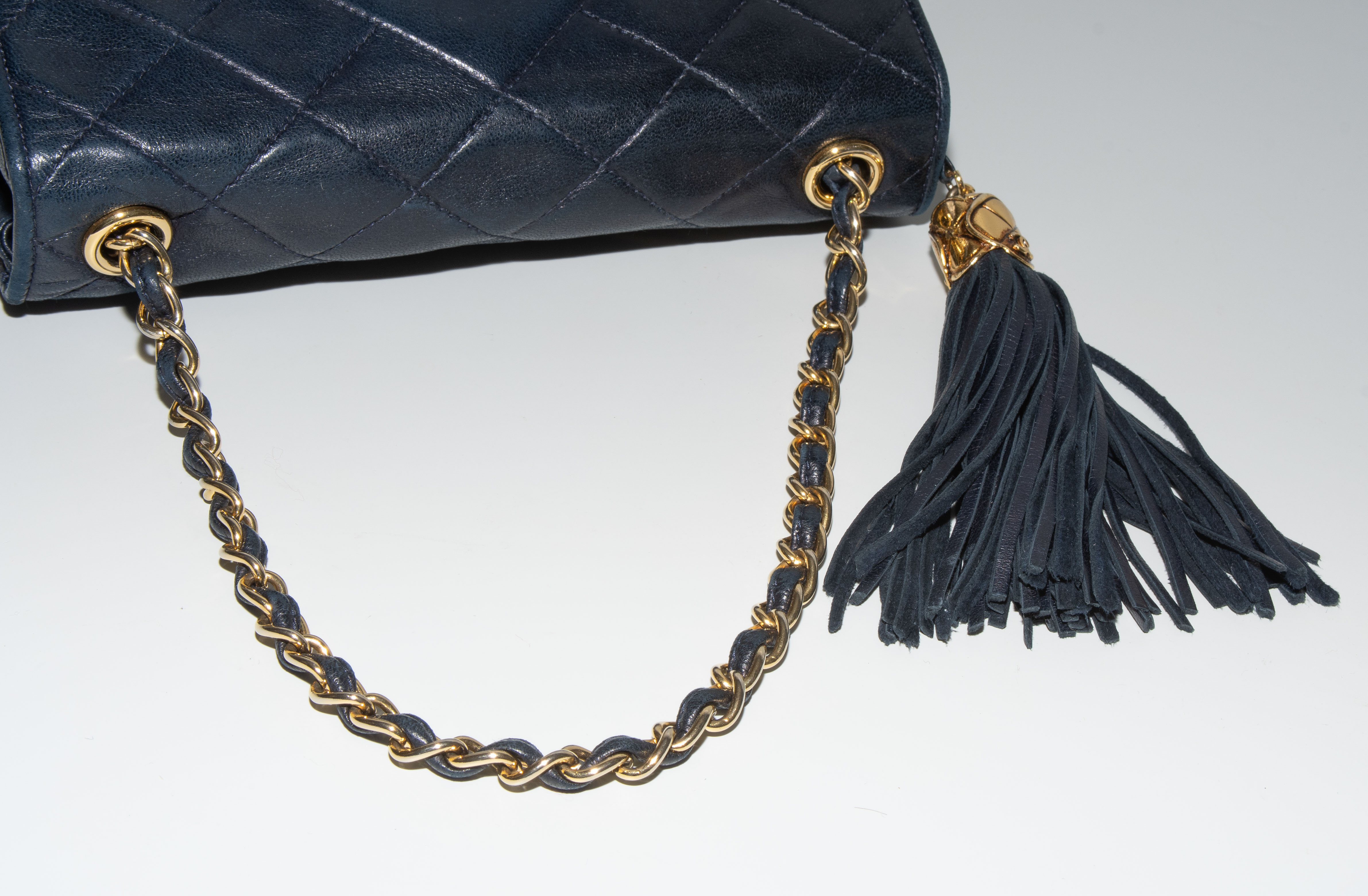 1989–1991. Aus dunkelblauem, gestepptem Leder. Lederdurchflochtener Kettenriemen aus goldfarbenem Metall. Vorne mit Magnetverschluss und CC-Logo. Quastenanhänger. Mit Schutzbeutel. 19,2x14x5 cm.