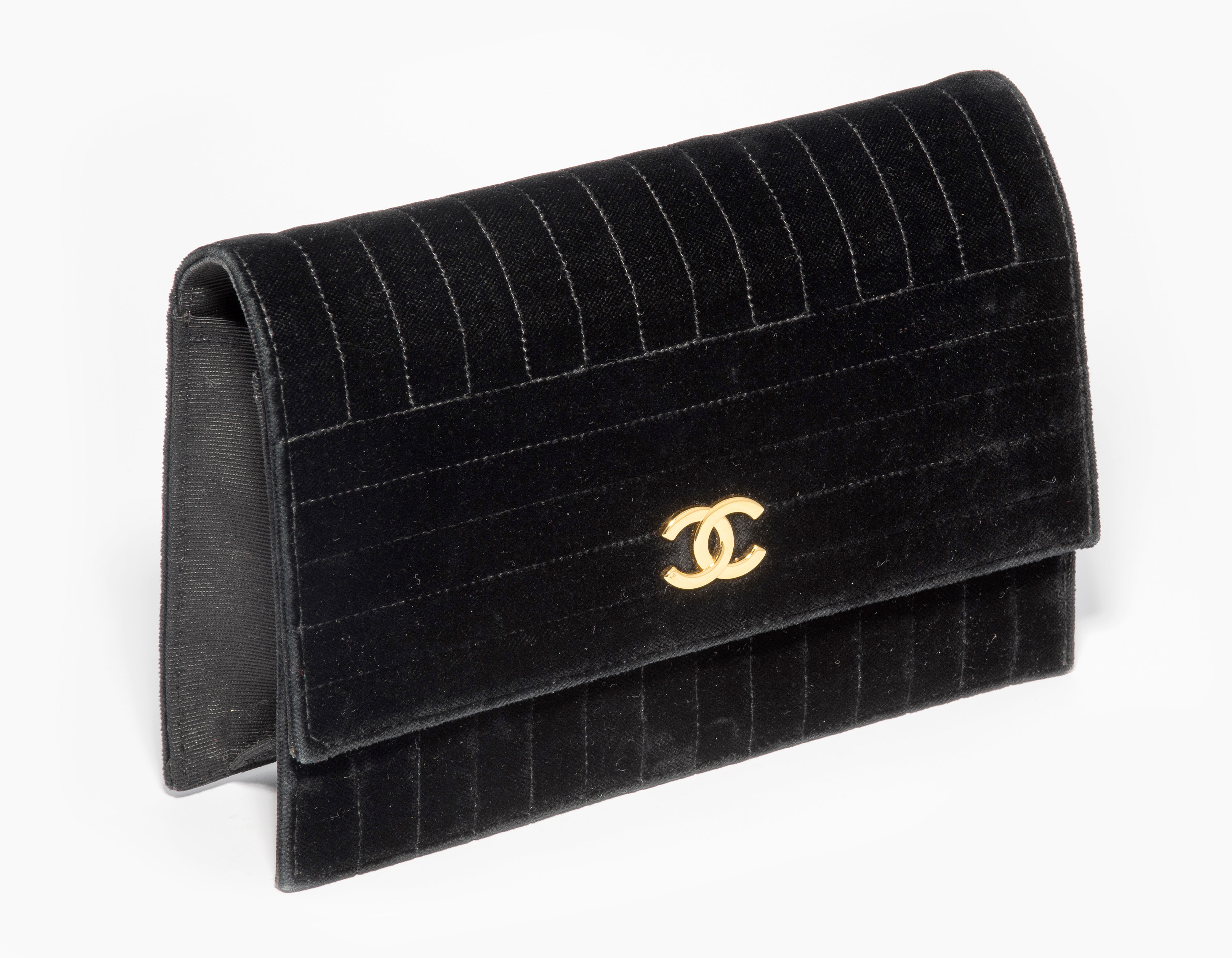 1980/90er Jahre. Aus schwarzem, vertikal und horizontal gestepptem Samt. Steckverschluss mit goldfarbenem CC-Logo. Mit Schutzbeutel. 21,5x15x7 cm.