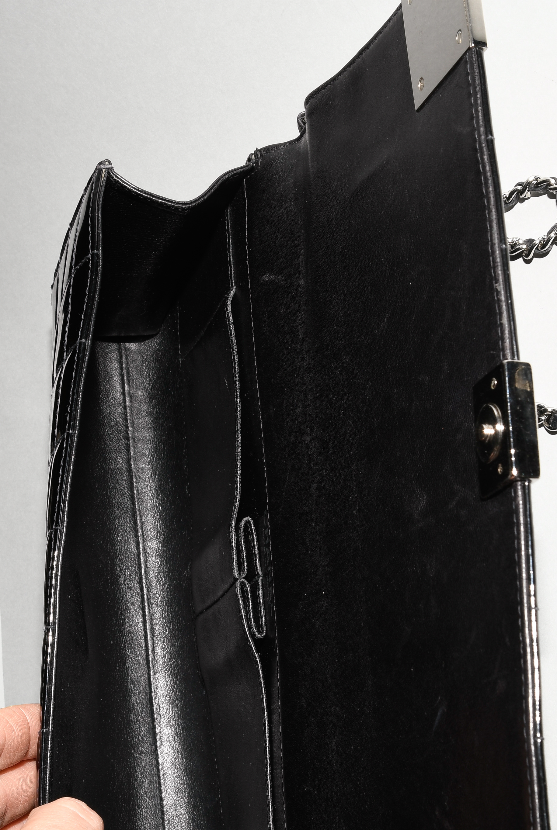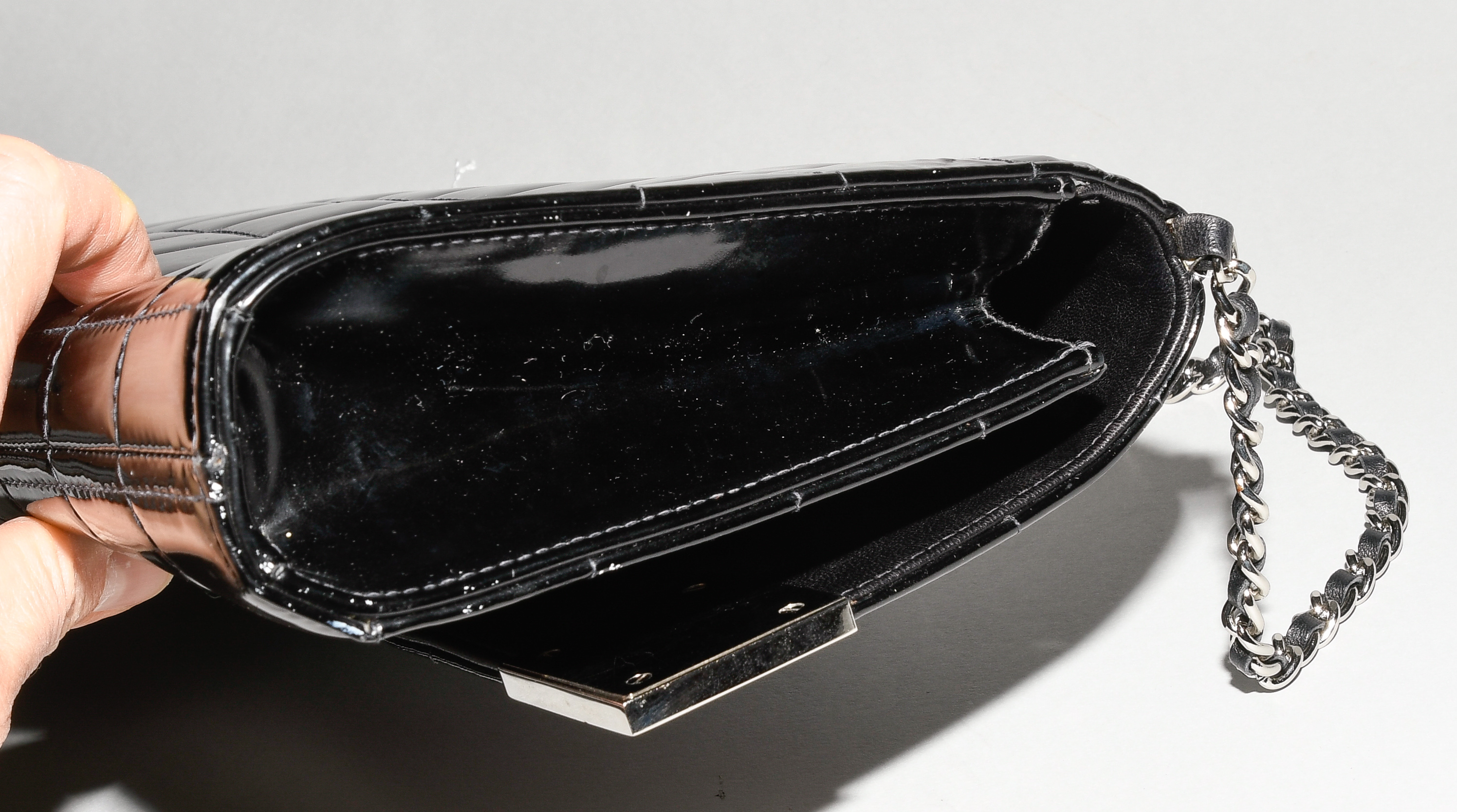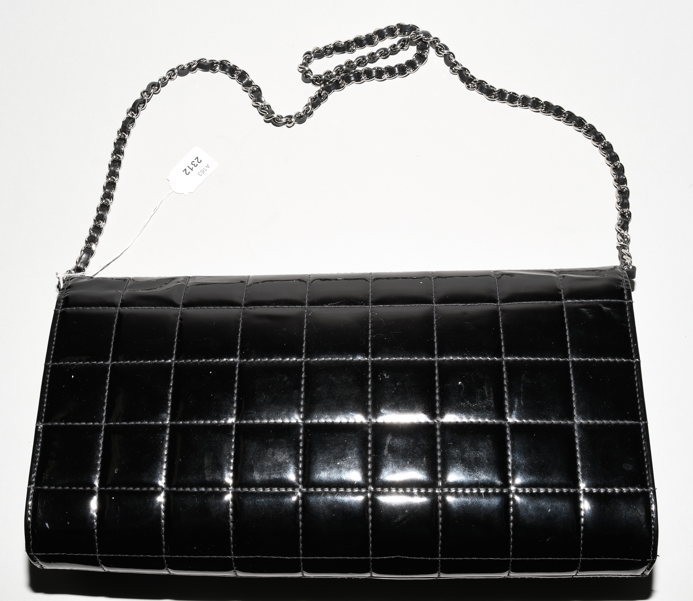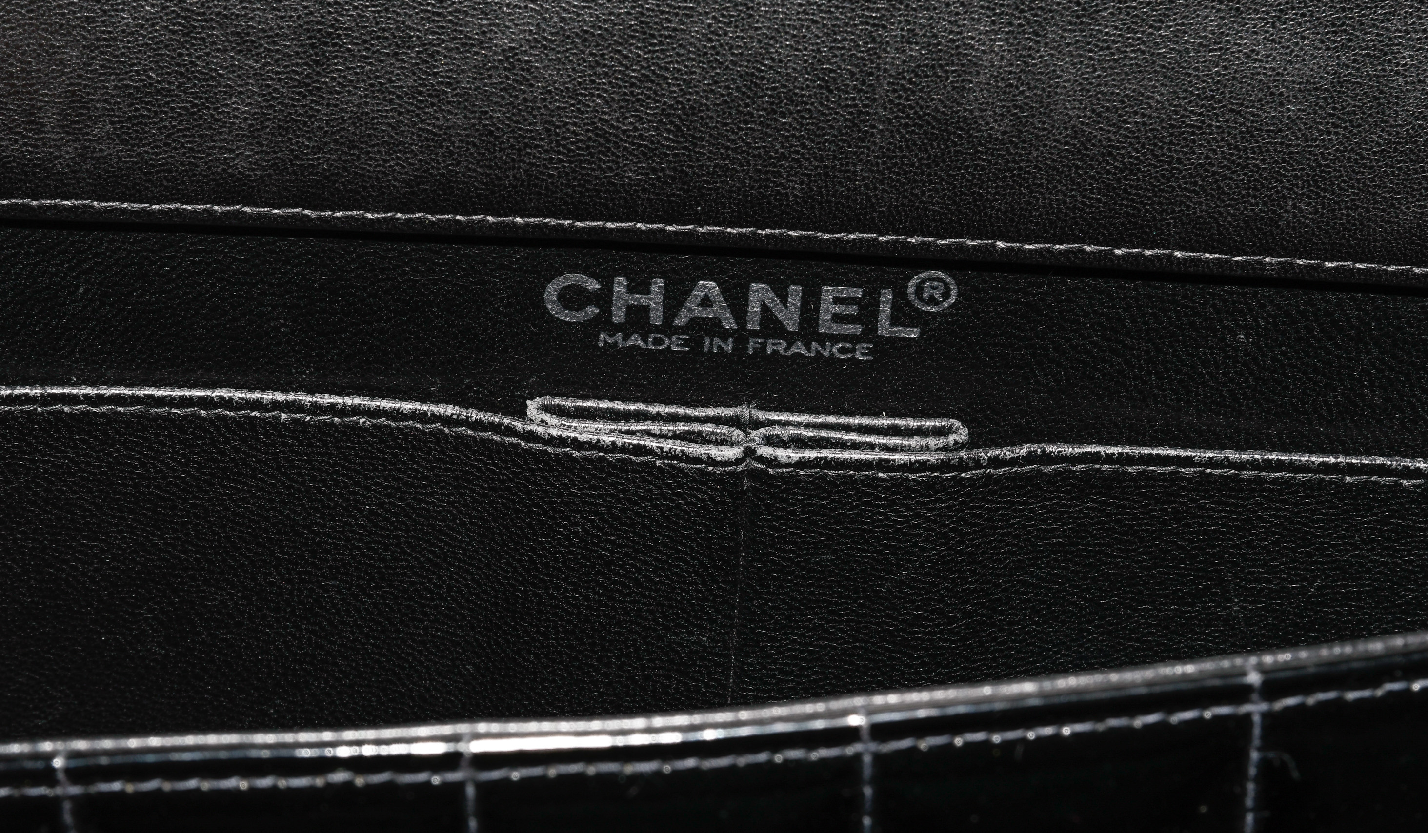 2002–2003. Aus schwarzem, gestepptem Lackleder. Magnetverschluss mit silberfarbener Inschrift "Chanel". Lederdurchflochtener Kettenriemen aus silberfarbenem Metall. Auf dem Überschlag zwei silberfarbene Metallapplikationen mit CC-Logo. Mit Schutzbeutel und Authentizitätskarte. 28x16x5 cm.