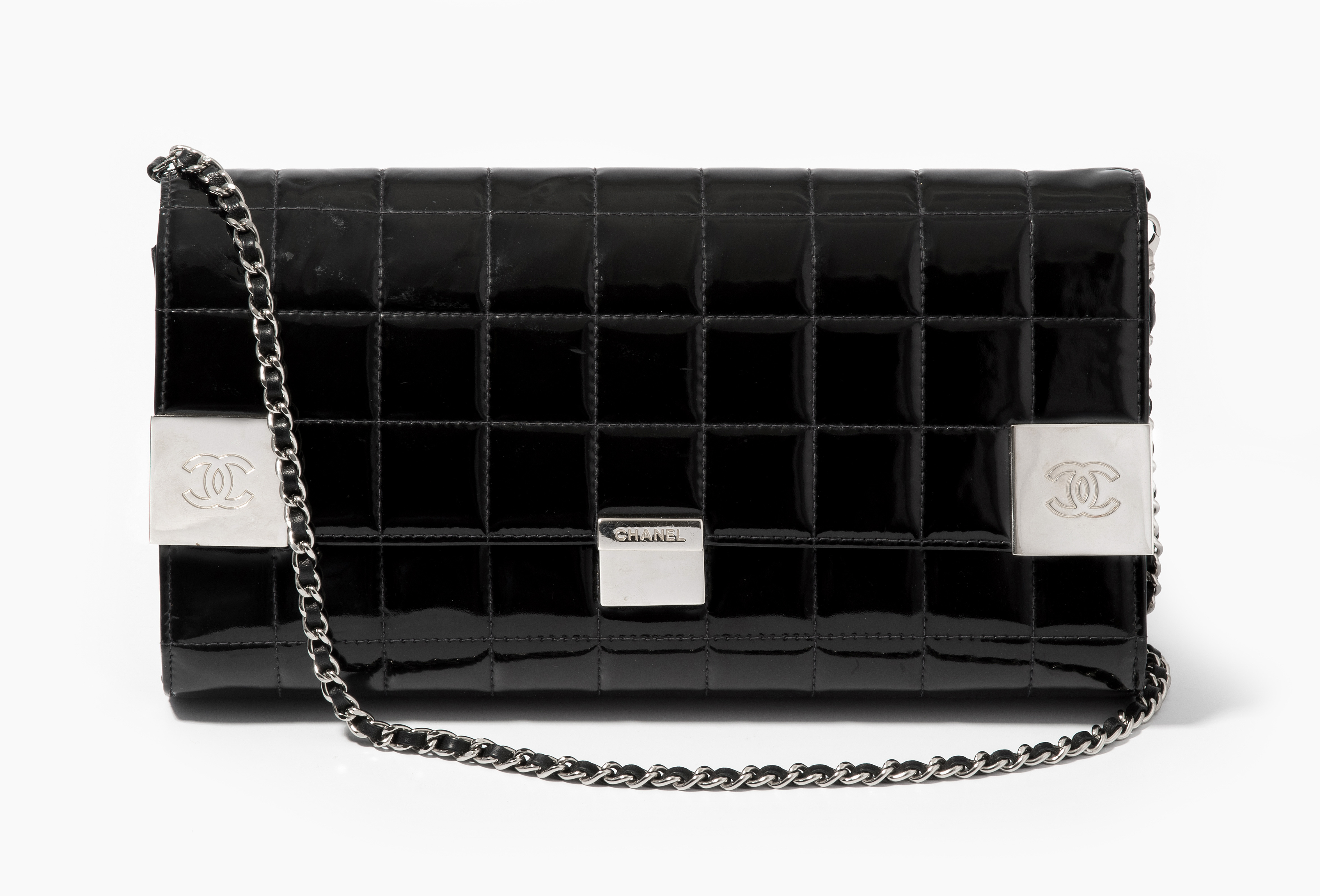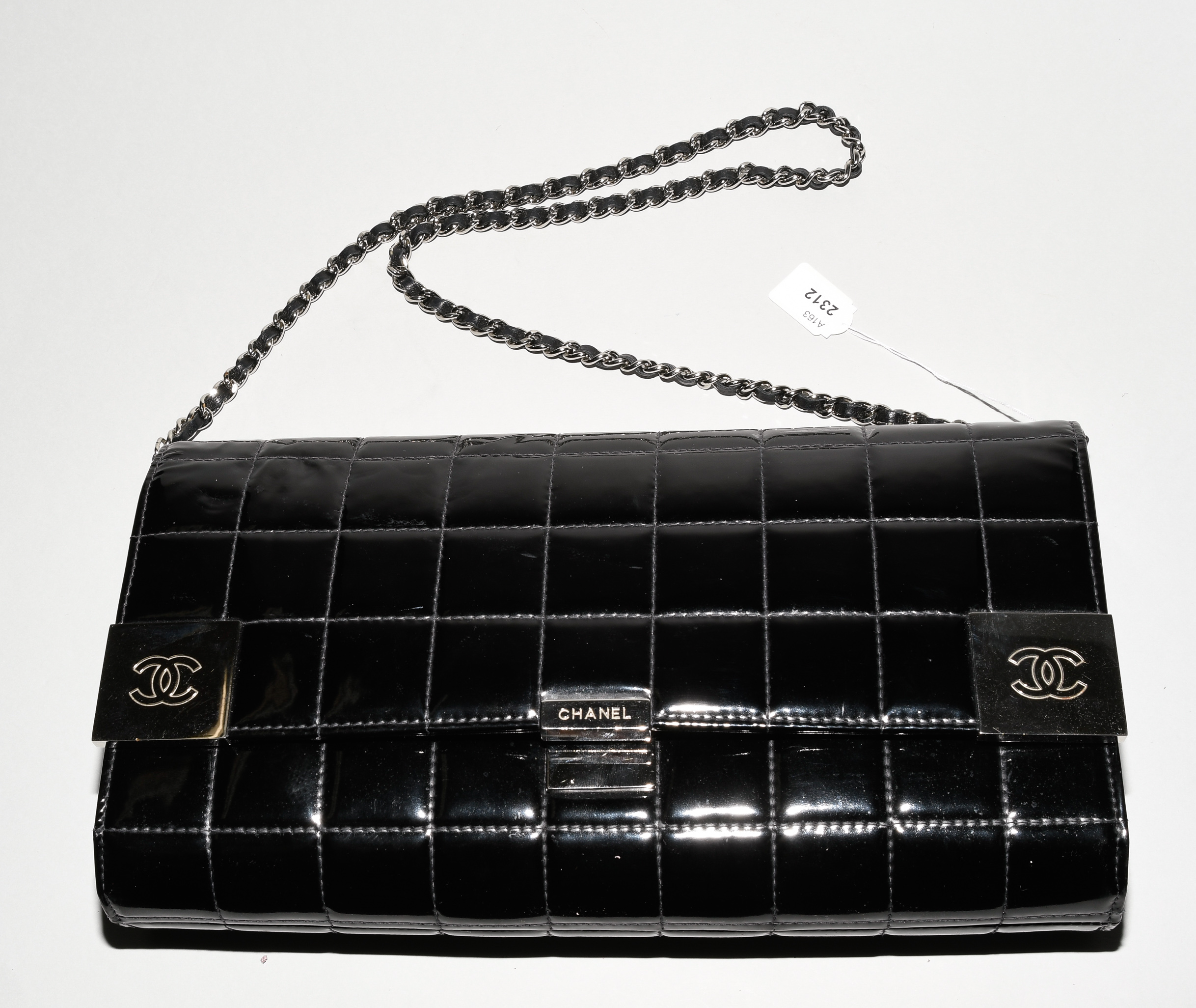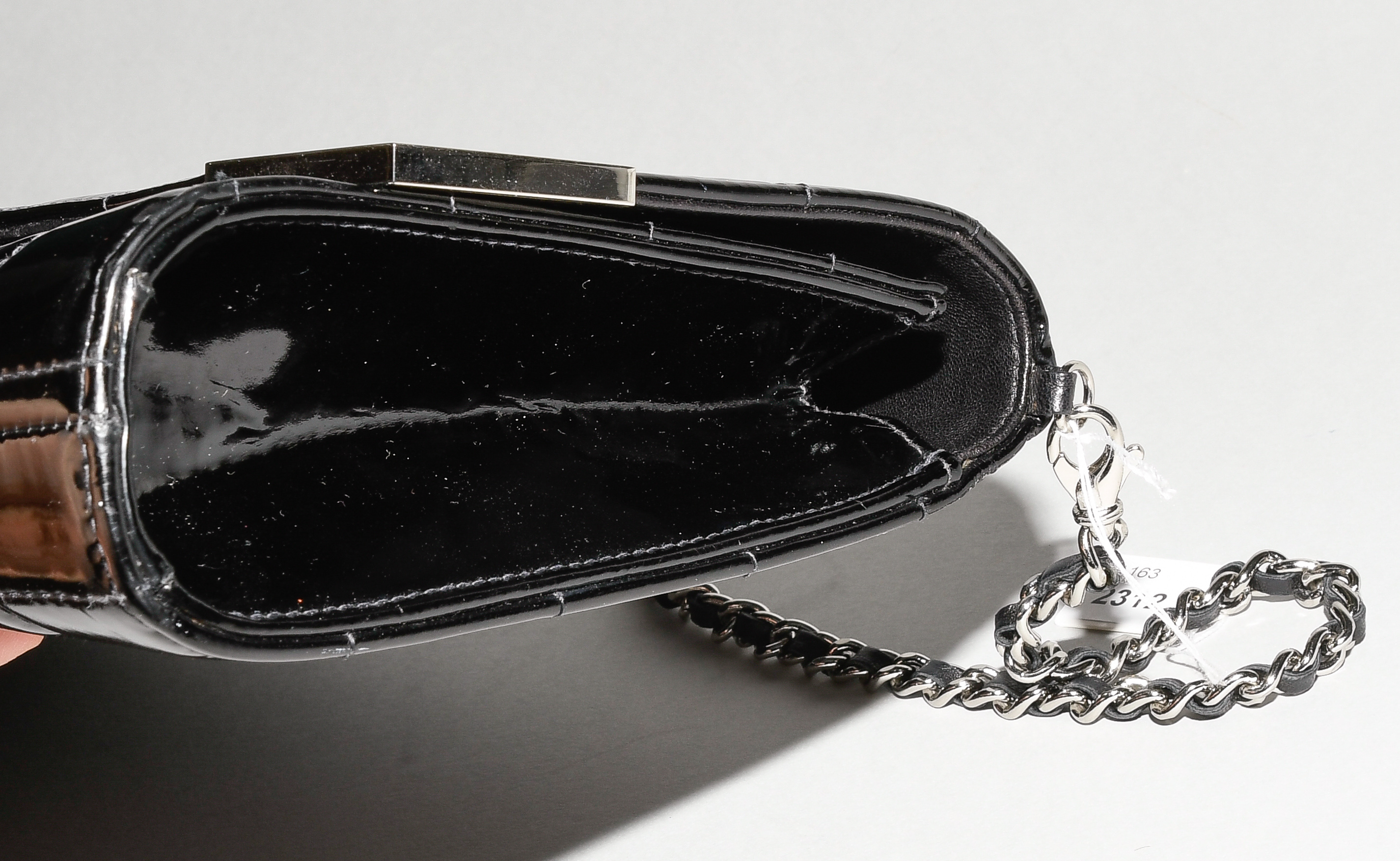 2002–2003. Aus schwarzem, gestepptem Lackleder. Magnetverschluss mit silberfarbener Inschrift "Chanel". Lederdurchflochtener Kettenriemen aus silberfarbenem Metall. Auf dem Überschlag zwei silberfarbene Metallapplikationen mit CC-Logo. Mit Schutzbeutel und Authentizitätskarte. 28x16x5 cm.