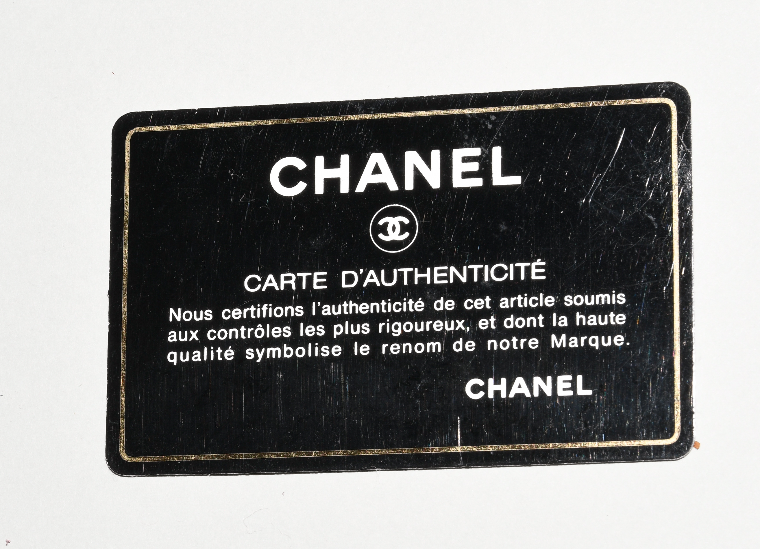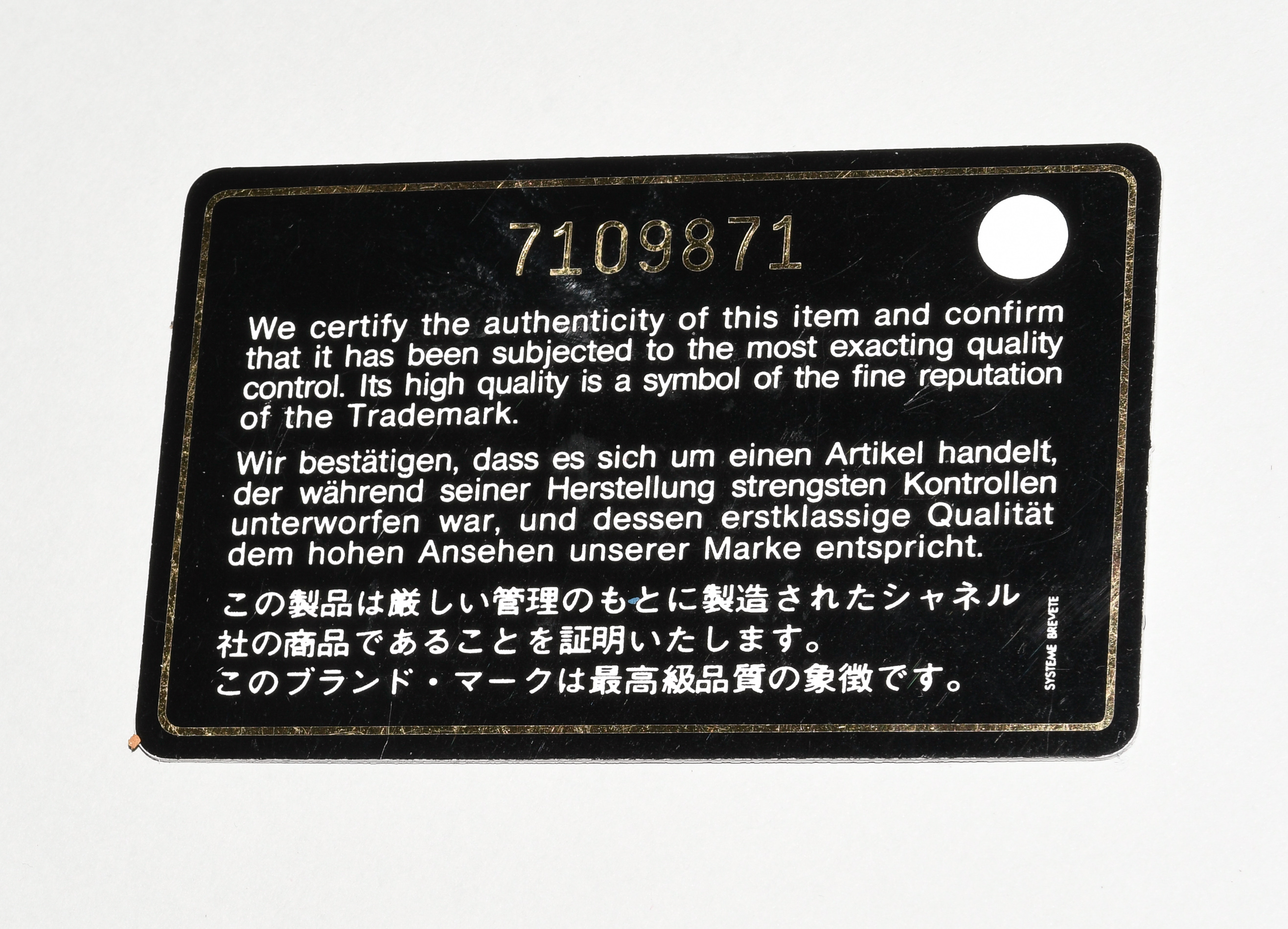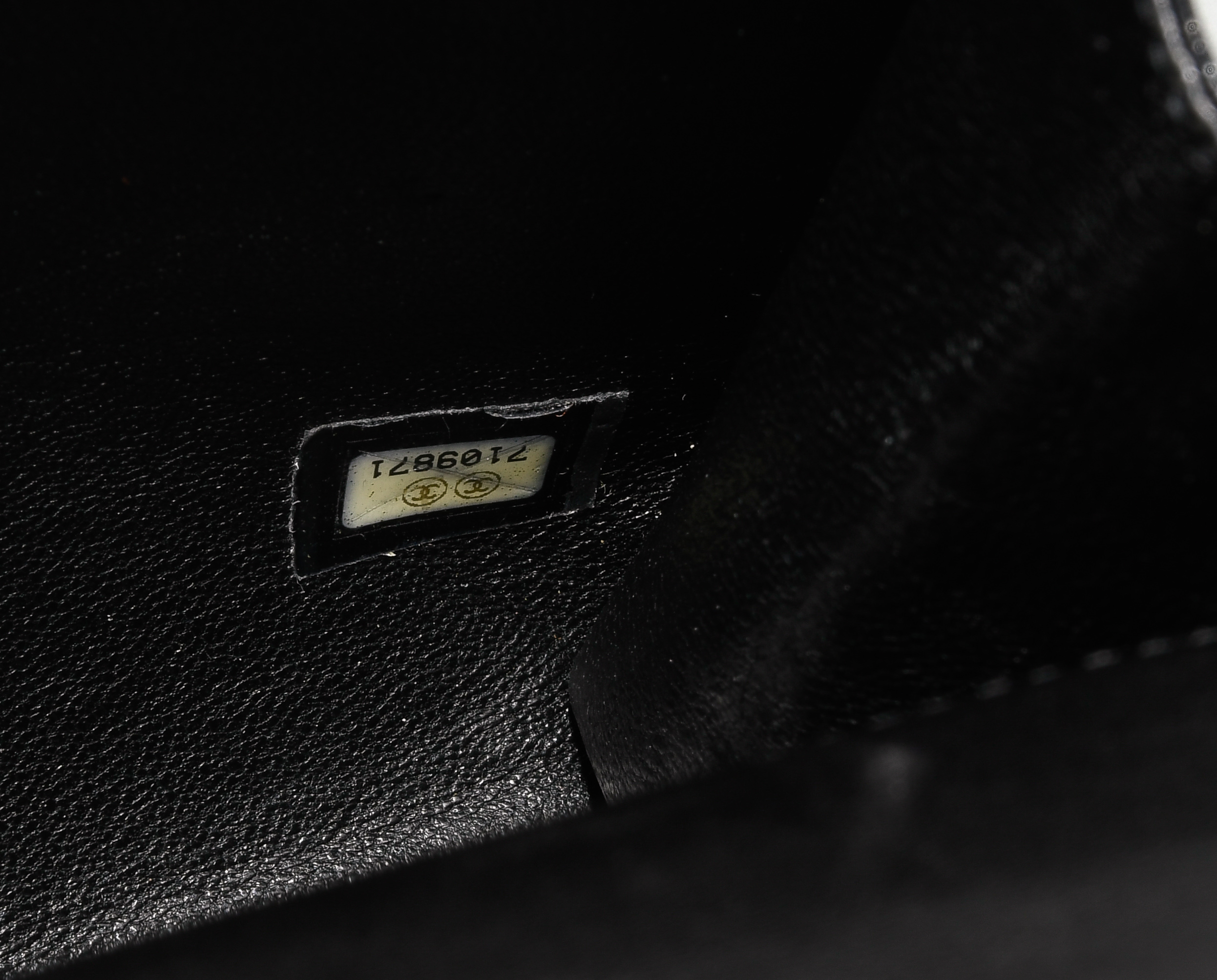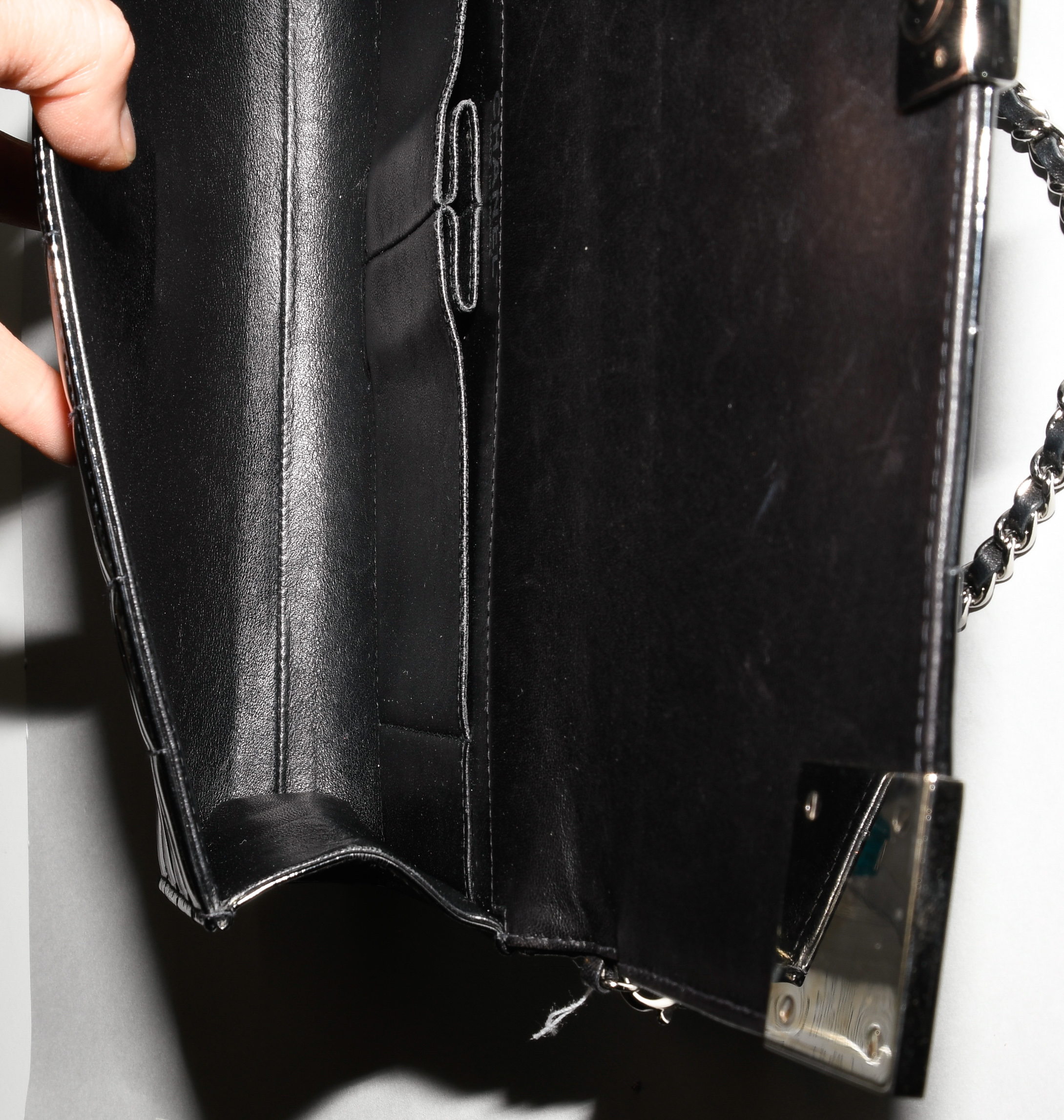 2002–2003. Aus schwarzem, gestepptem Lackleder. Magnetverschluss mit silberfarbener Inschrift "Chanel". Lederdurchflochtener Kettenriemen aus silberfarbenem Metall. Auf dem Überschlag zwei silberfarbene Metallapplikationen mit CC-Logo. Mit Schutzbeutel und Authentizitätskarte. 28x16x5 cm.
