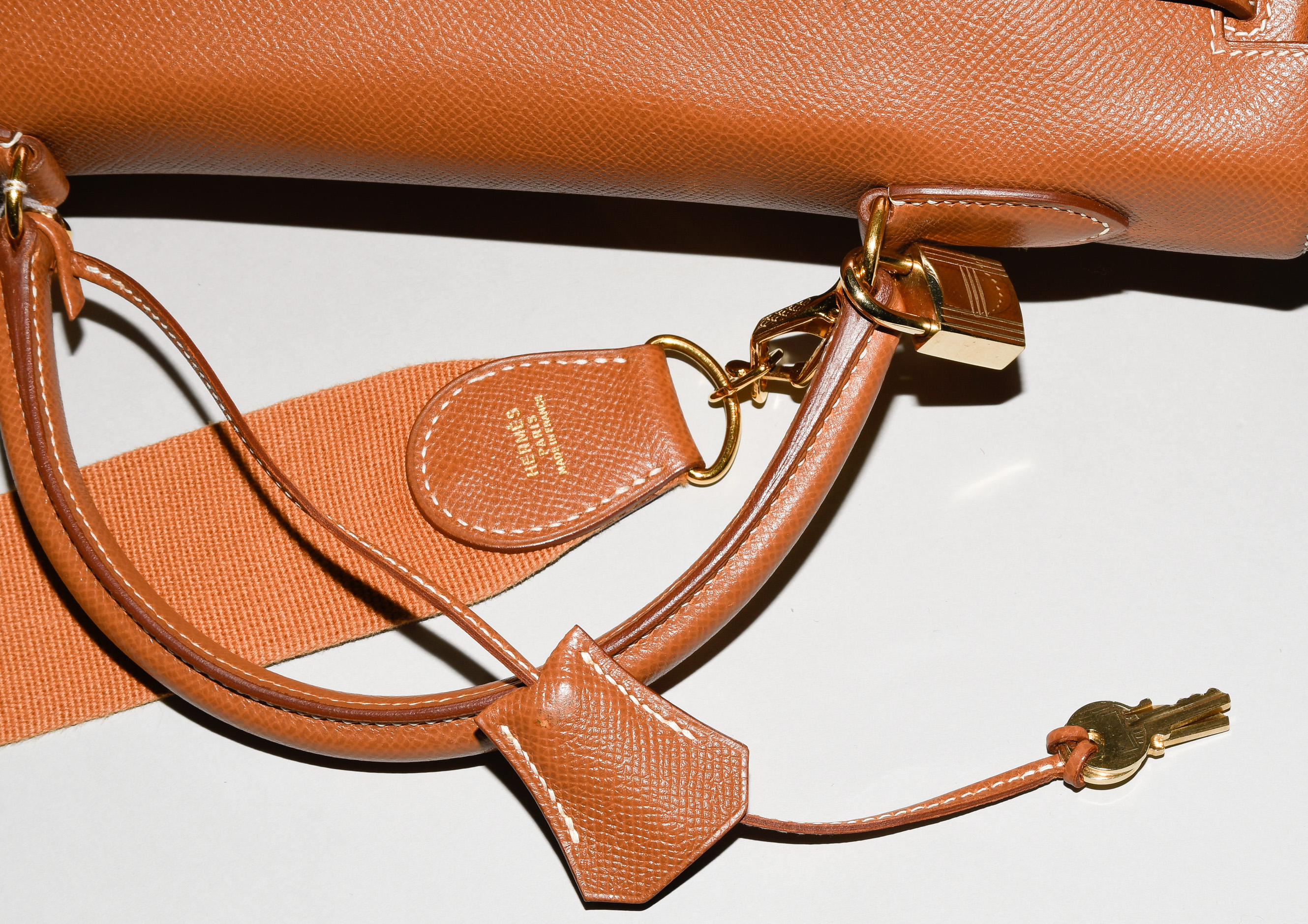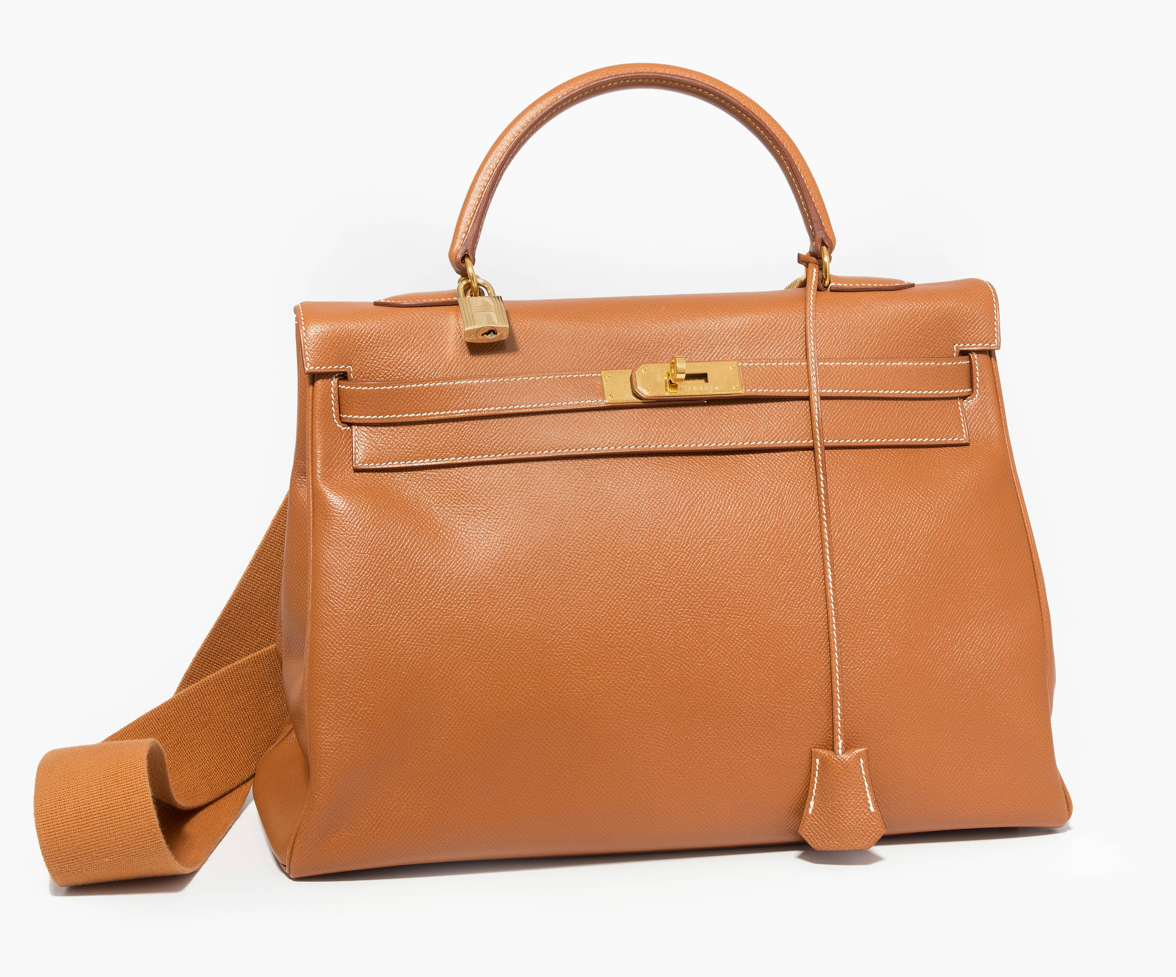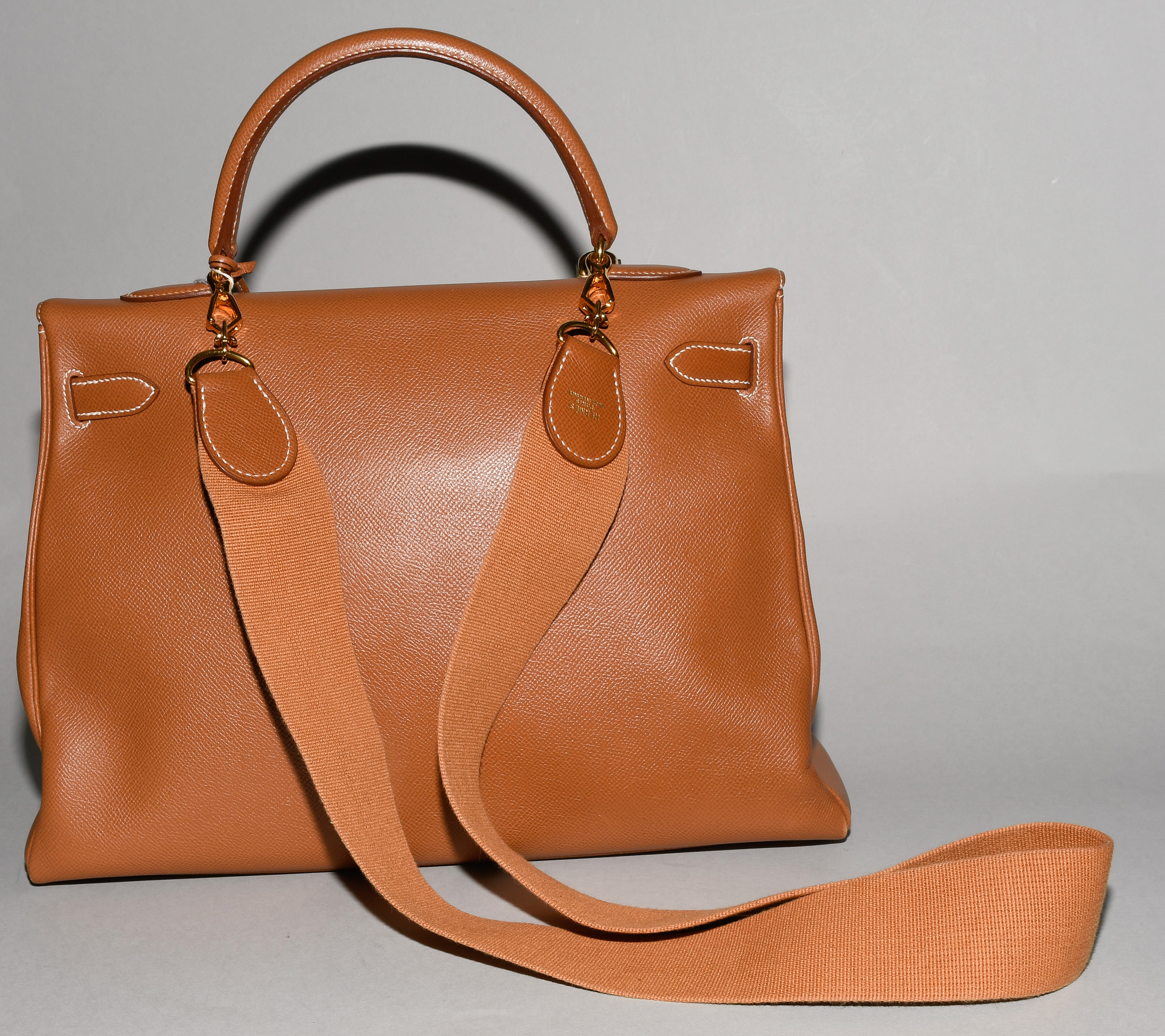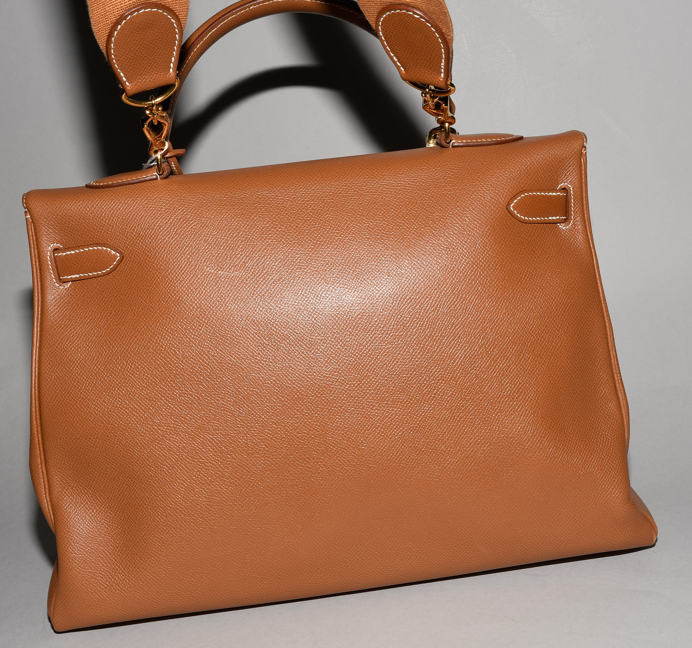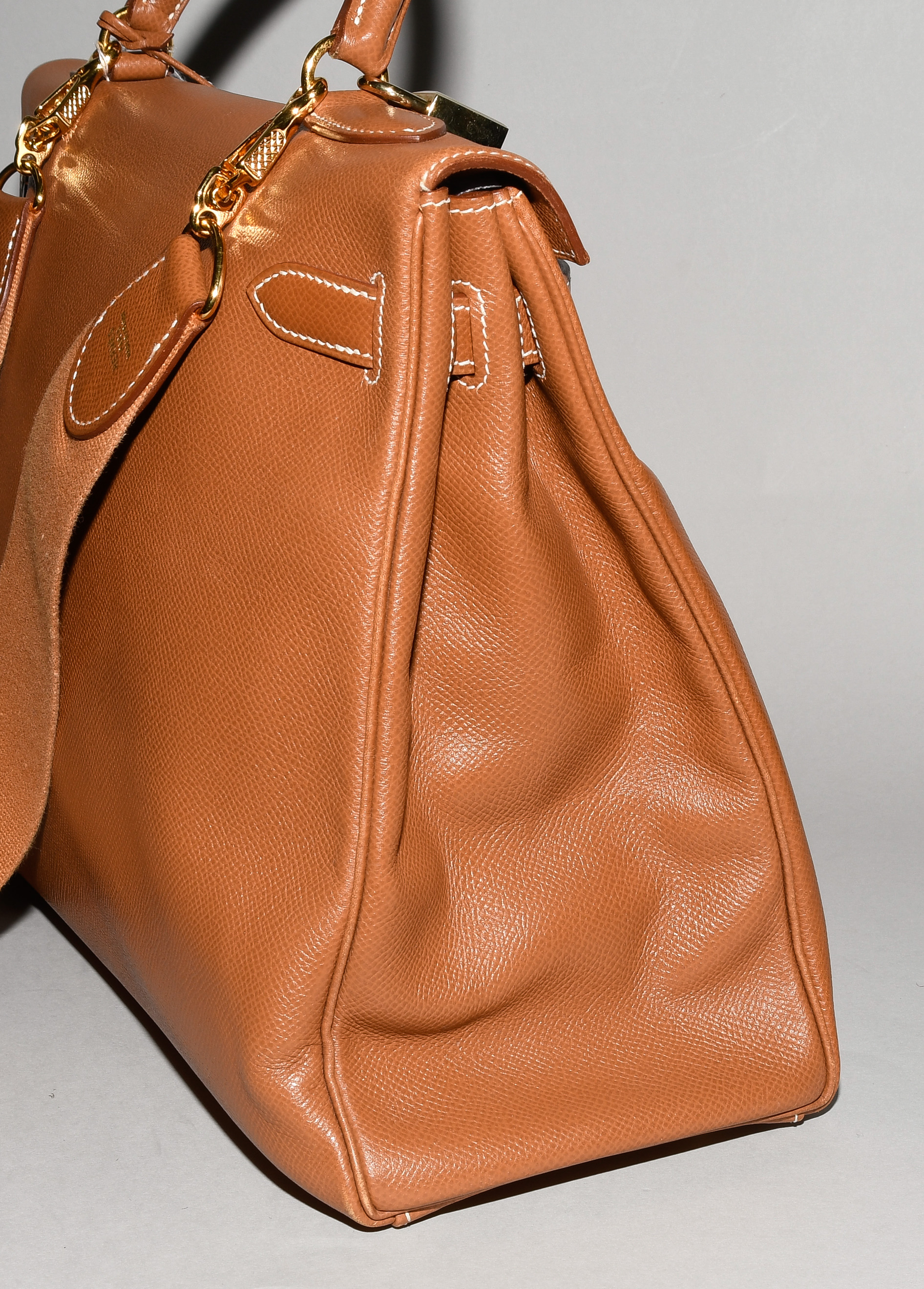 1998. Aus braunem Epsom-Leder. Vergoldete Metallbeschläge. Schloss und Clochette mit zwei Schlüsseln. Schulterriemen aus Stoff. 35x26x13 cm. - Leichte Tragespuren, sonst guter Zustand.