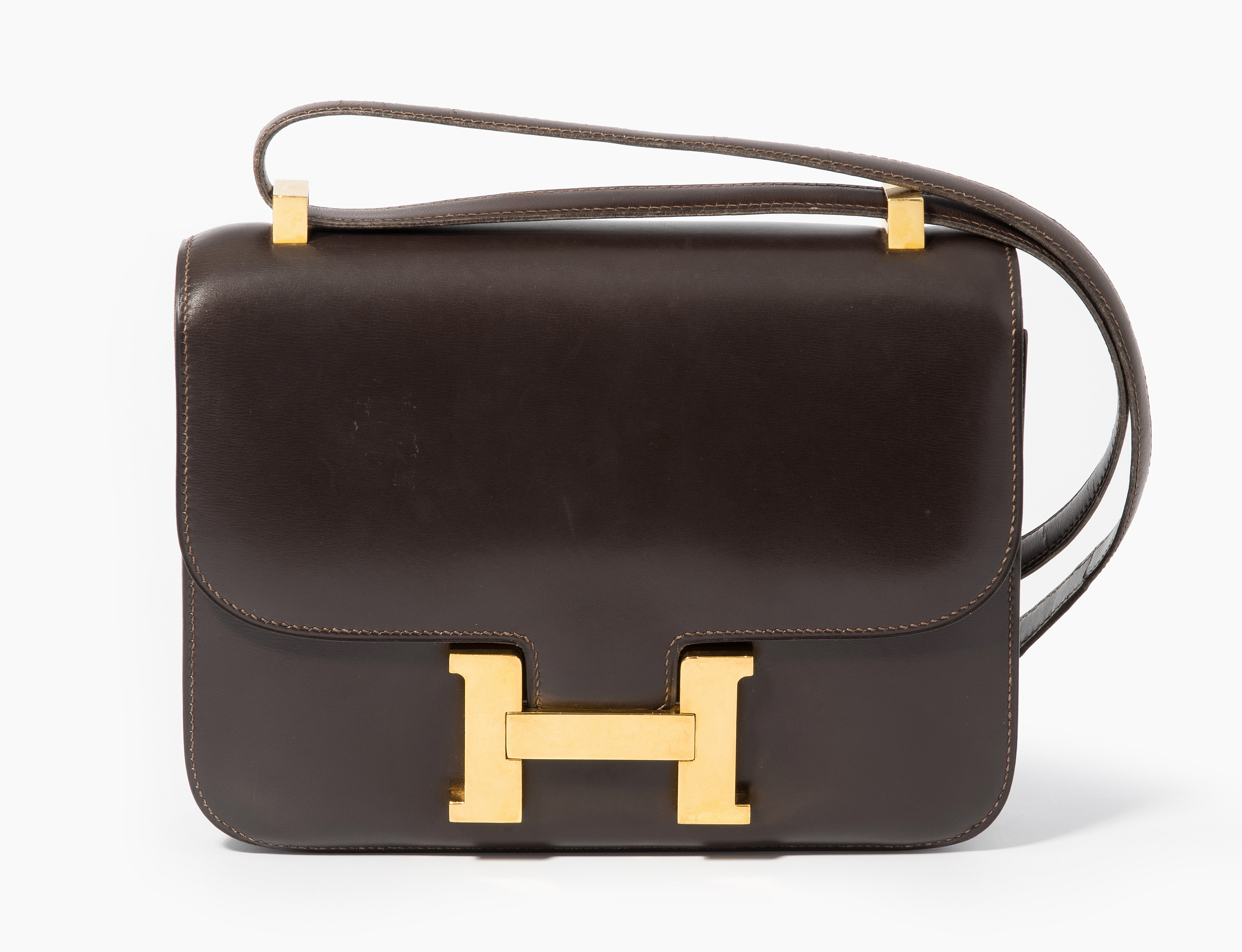 1973. Aus schokoladefarbenem Box-Leder. Vergoldete Metallbeschläge. Rückseite mit offenem Fach. Langer Schulterriemen. Überschlag mit H-Schliesse. 22,5x17x5 cm.