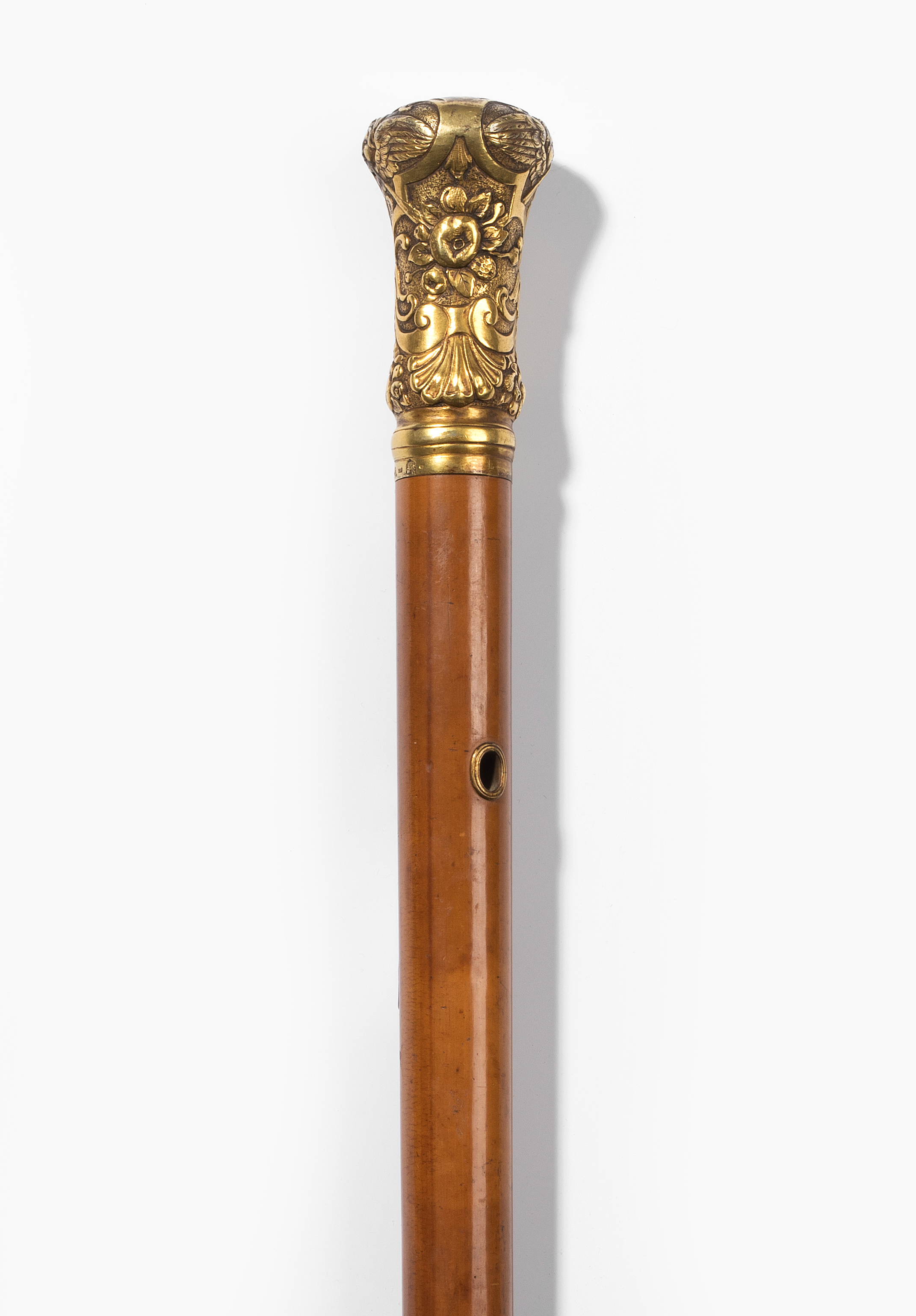 Bad Kissingen/Hanau, Ende 19.Jh. Silber vergoldet. Meistermarke Simon Rosenau. Floraler Reliefdekor, begleitet von Voluten und zwei geflügelten Engelsköpfen. Malakka-Schuss mit Durchziehöffnung und langer Zwinge aus Messing. L 110 cm.