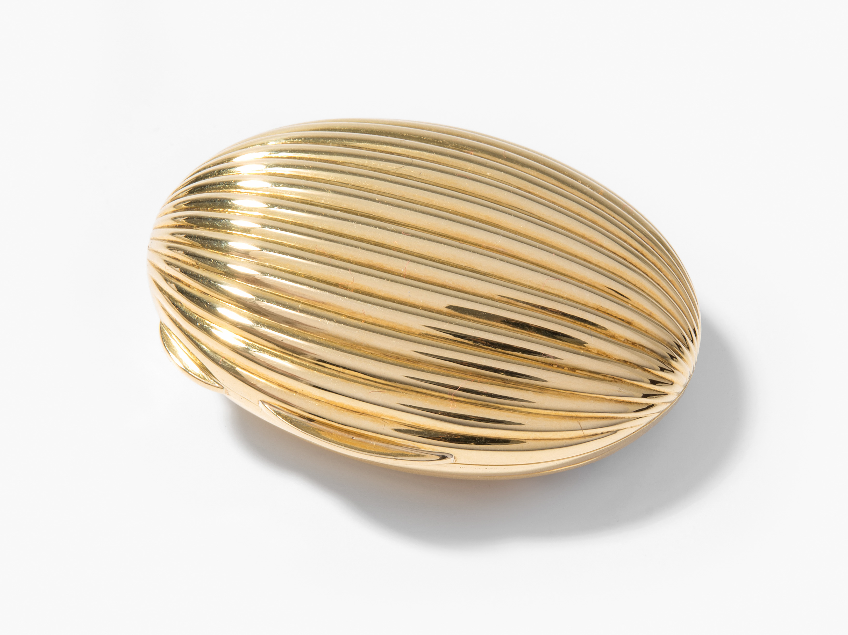 20.Jh. Gelbgold 18K. Gerippte Muschelform mit scharniertem Deckel. Feingehalt 750. 4,5x3,5 cm, ca. 43 g.