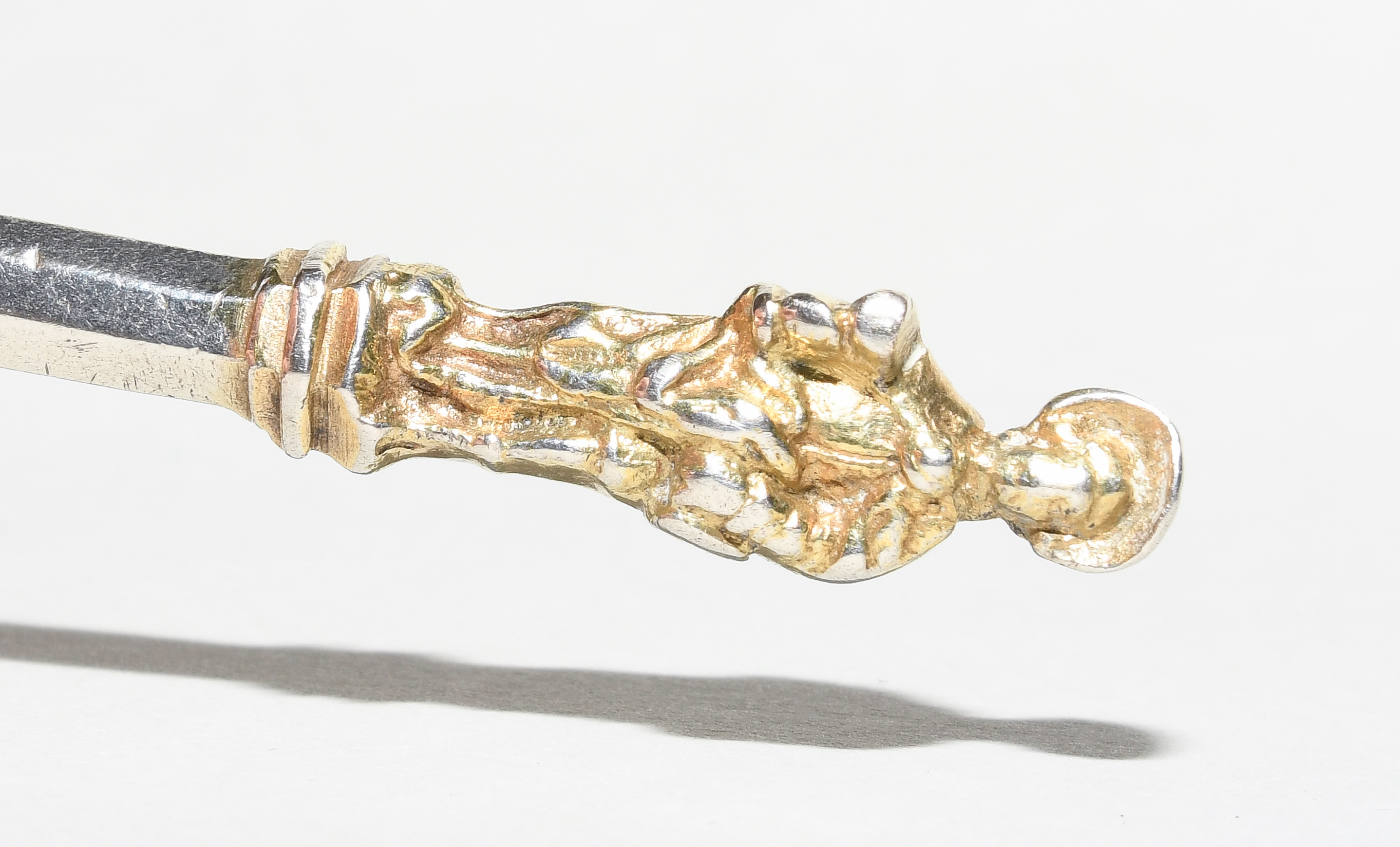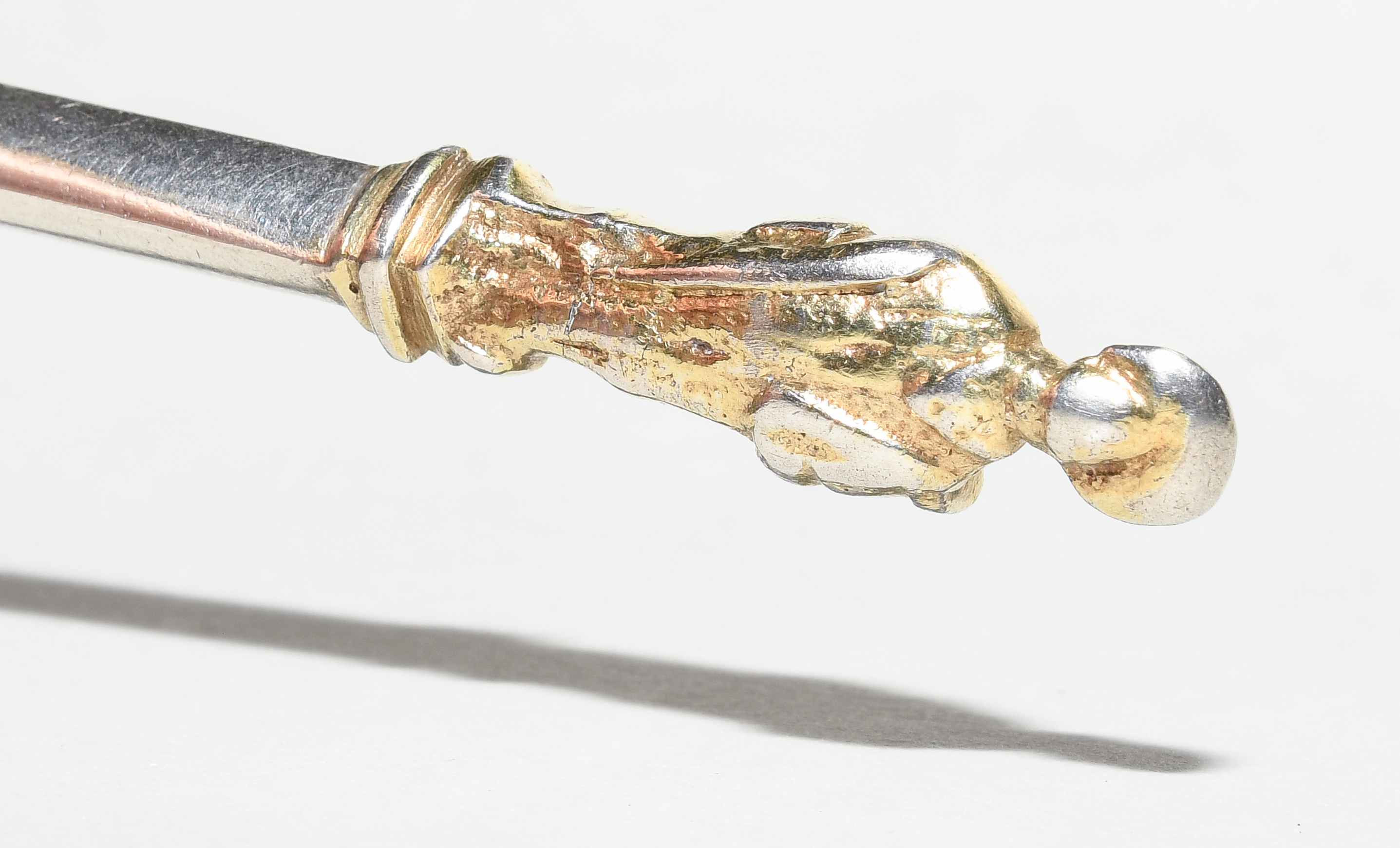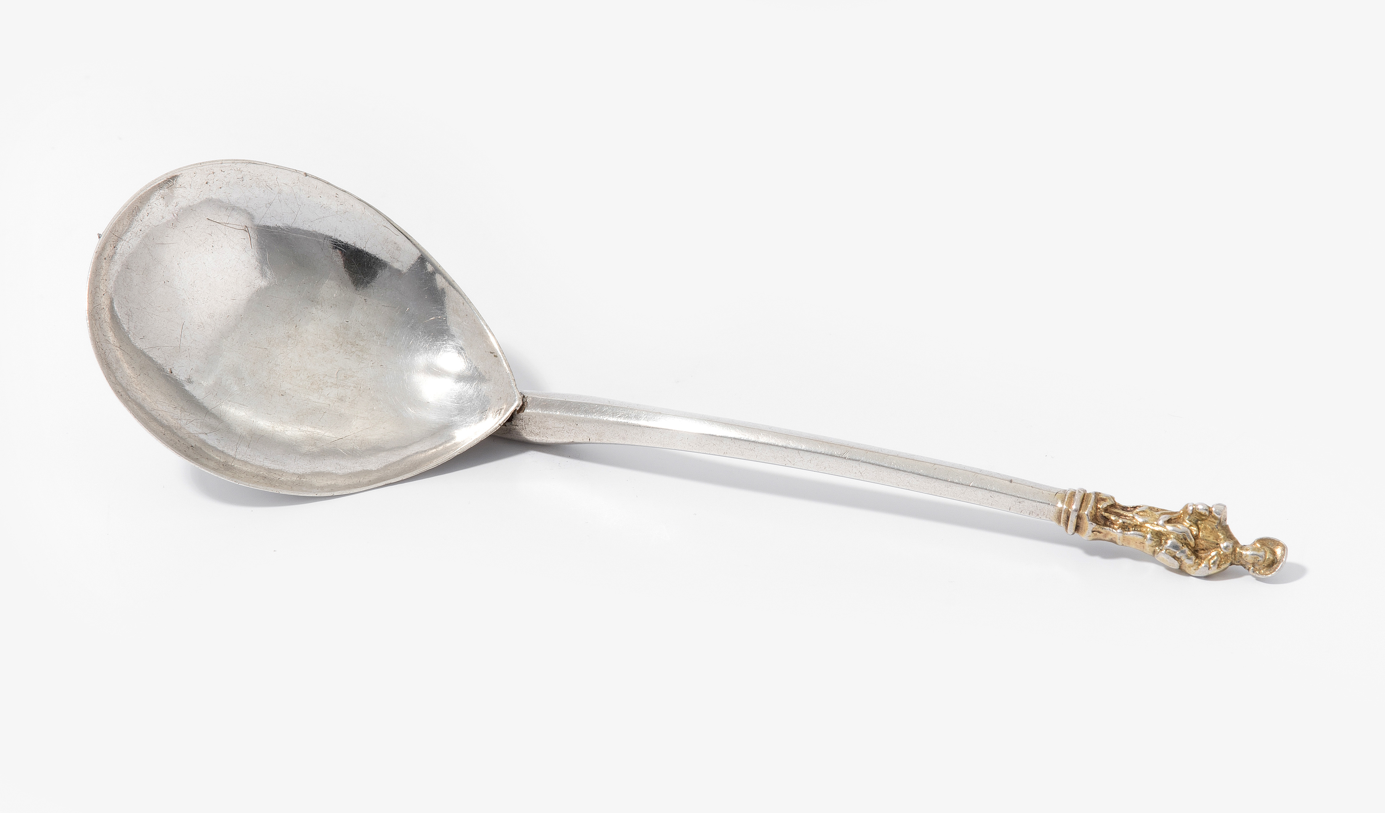 Um 1670–80. Silber, tlw. vergoldet. Meistermarke wohl Alexander II Kilchsperger. Griffende mit Figur des Hl. Johannes. Laffenrückseite mit zwei gravierten Stengelblüten. L 16,5 cm, ca. 29 g.