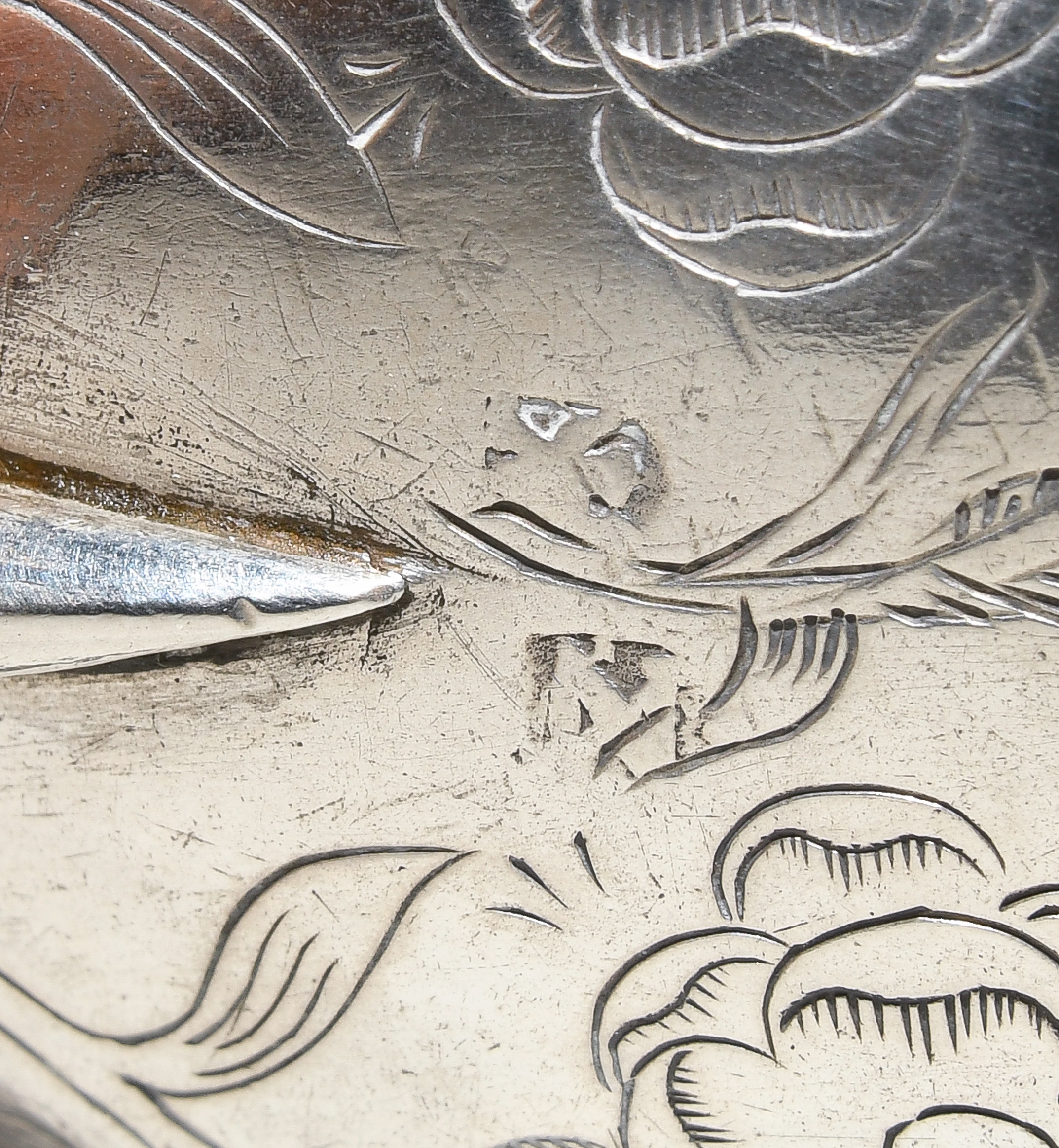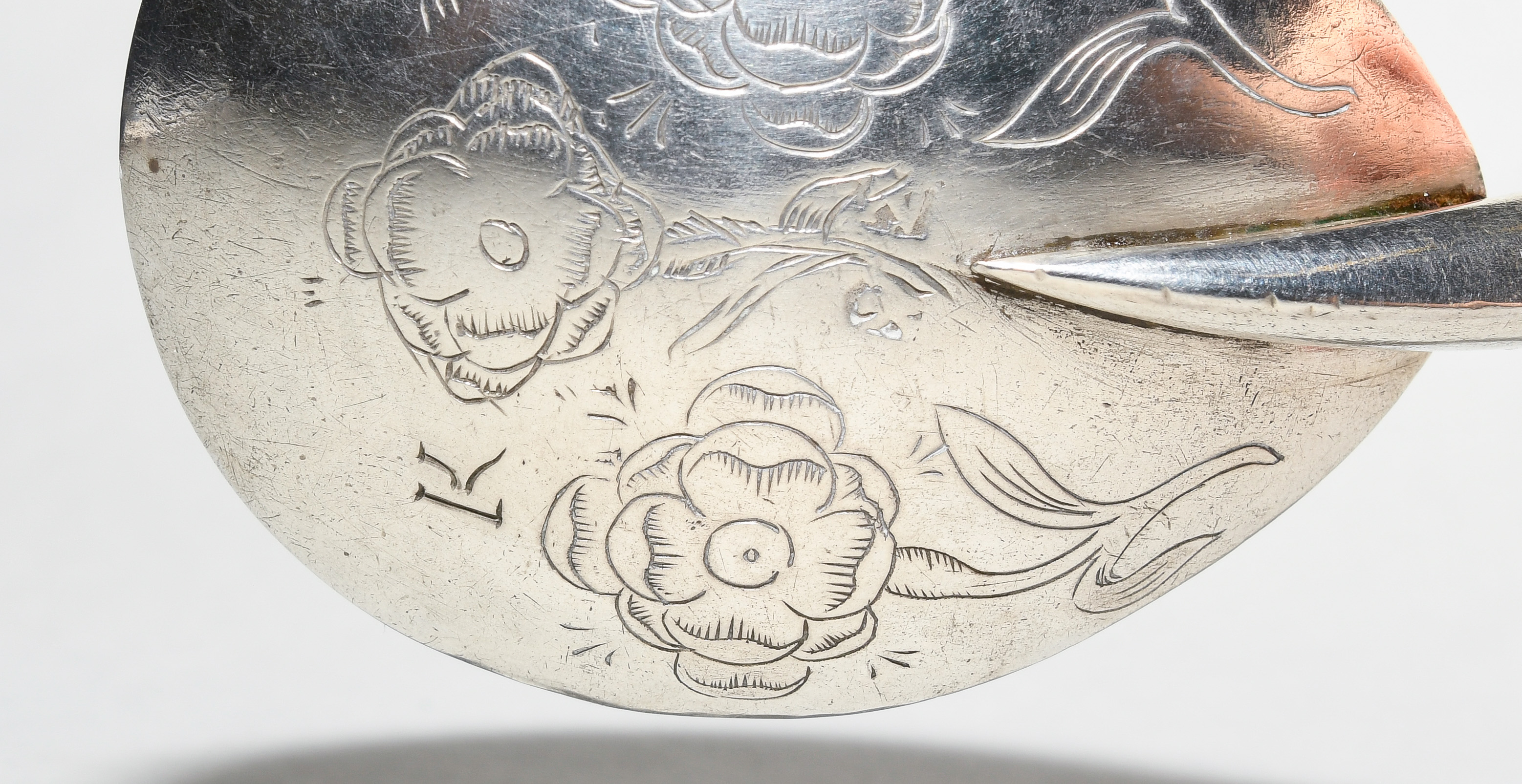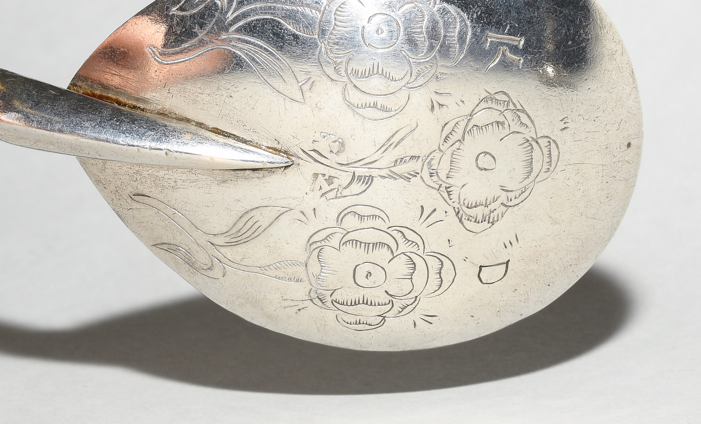 Um 1670–80. Silber, tlw. vergoldet. Meistermarke wohl Alexander II Kilchsperger. Griffende mit Figur des Hl. Johannes. Laffenrückseite mit zwei gravierten Stengelblüten. L 16,5 cm, ca. 29 g.