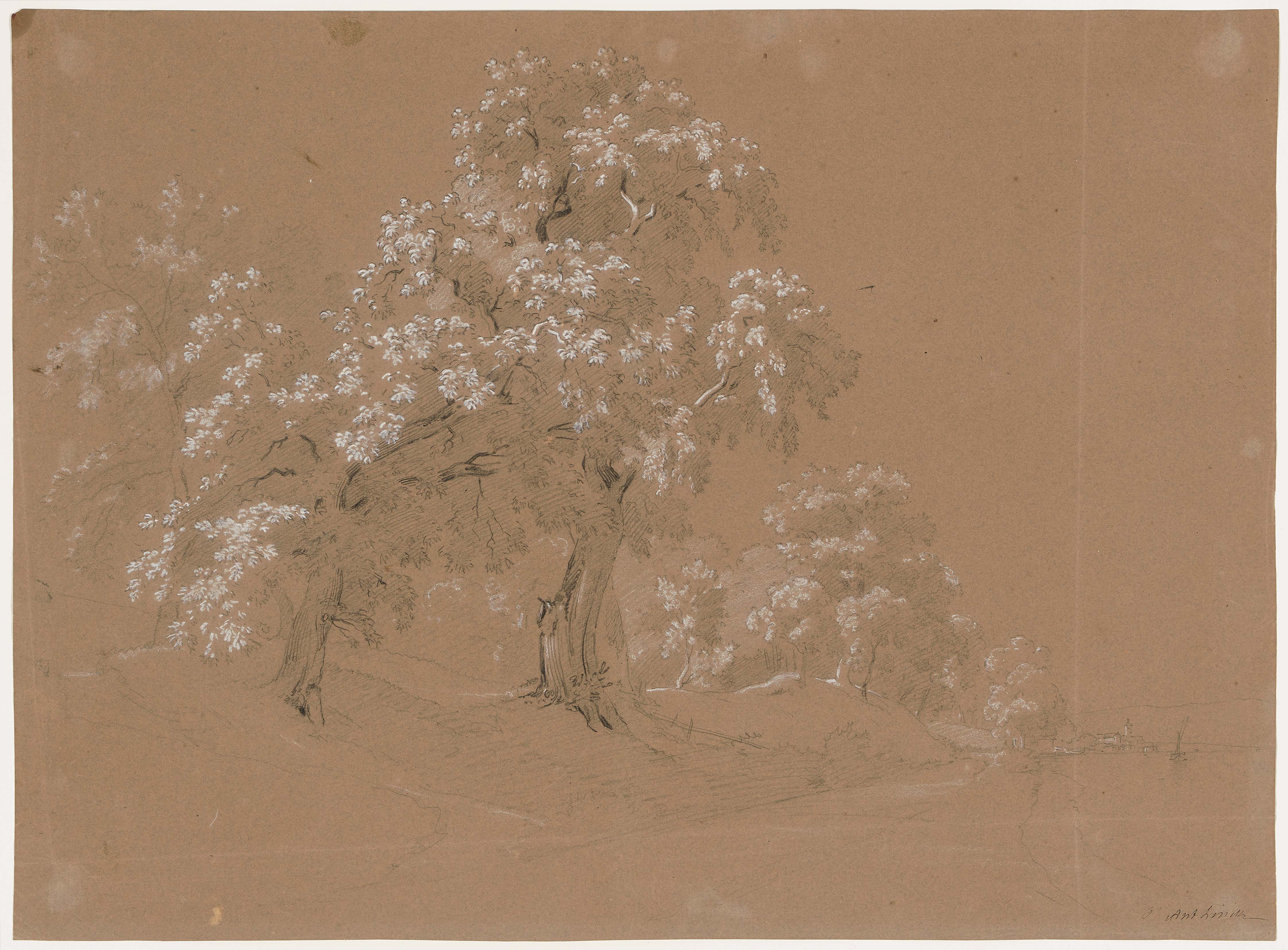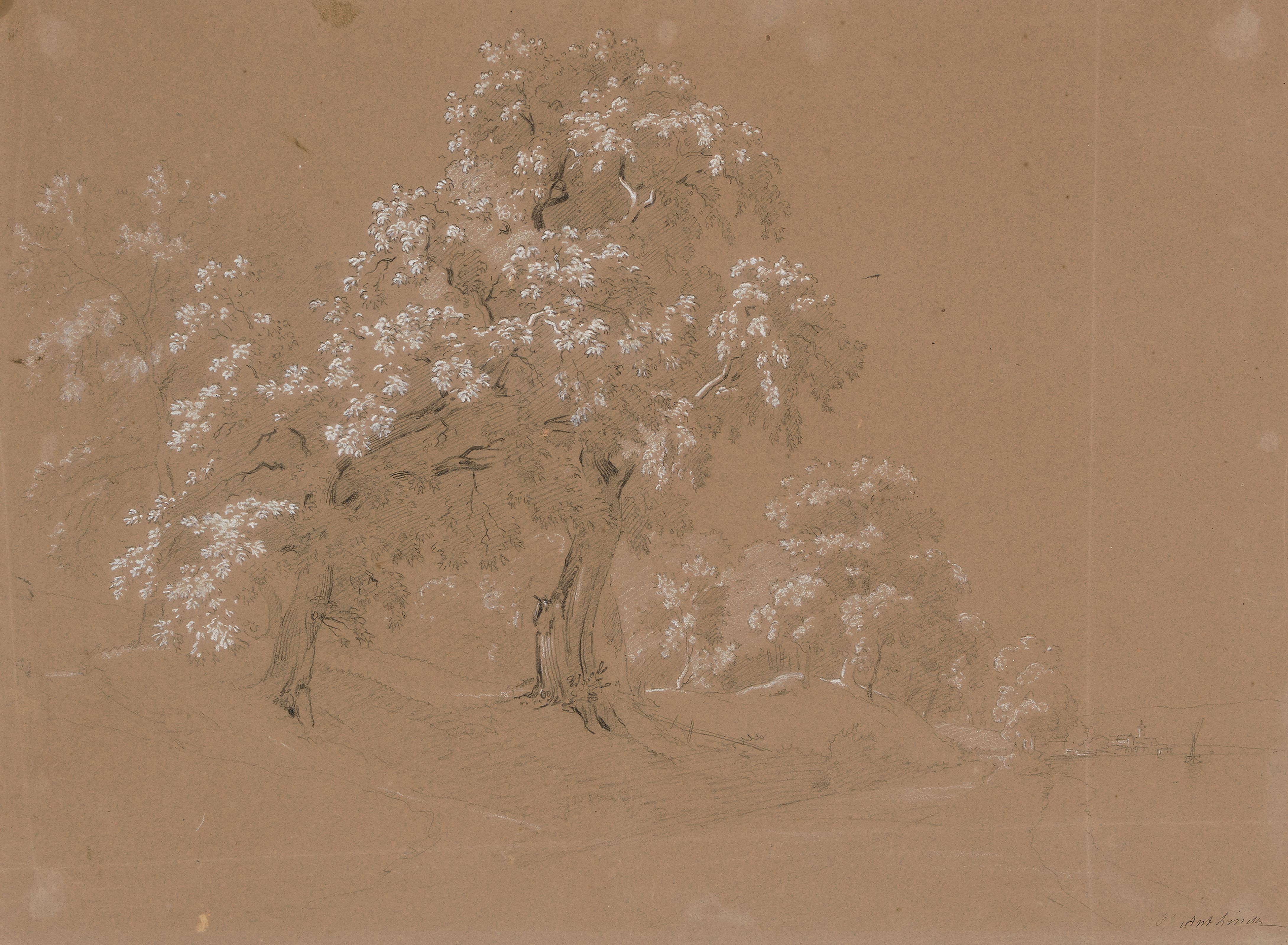 Bäume an einem Seeufer. Im Hintergrund Blick auf ein Städtchen. Weiss gehöhte Kreidezeichnung. Unten rechts signiert. 43,2x58 cm. - Stellenweise etwas fleckig. Geglättete, vertikale und horizontale Knickspur.
