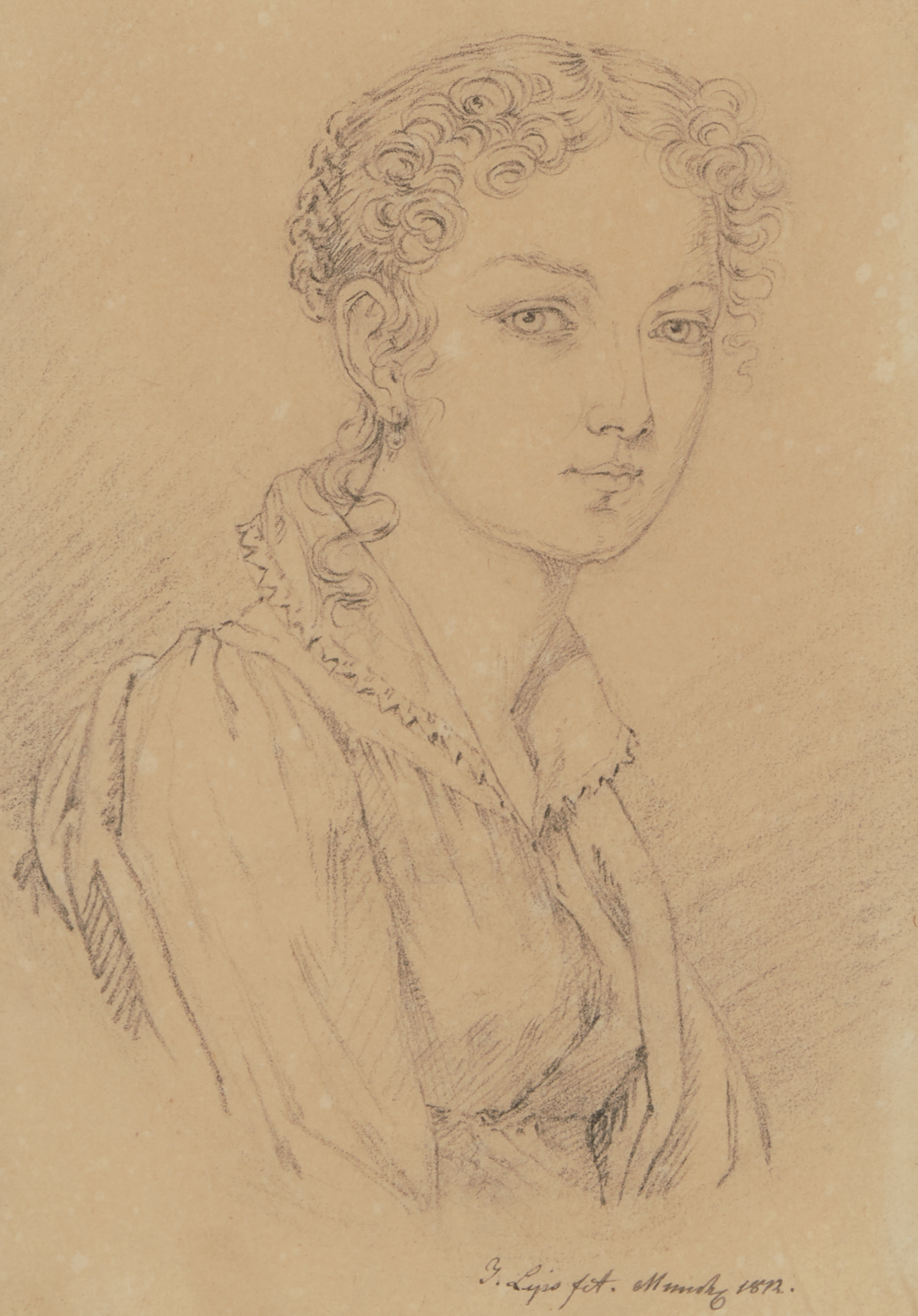 Portrait einer jungen Frau. Bleistiftzeichnung, 1812. Unten rechts signiert, datiert und bezeichnet "J. Lips fct. Munich". 10,2x7,2 cm. Gerahmt. - Minimal gebräunt und in Passepartout montiert.