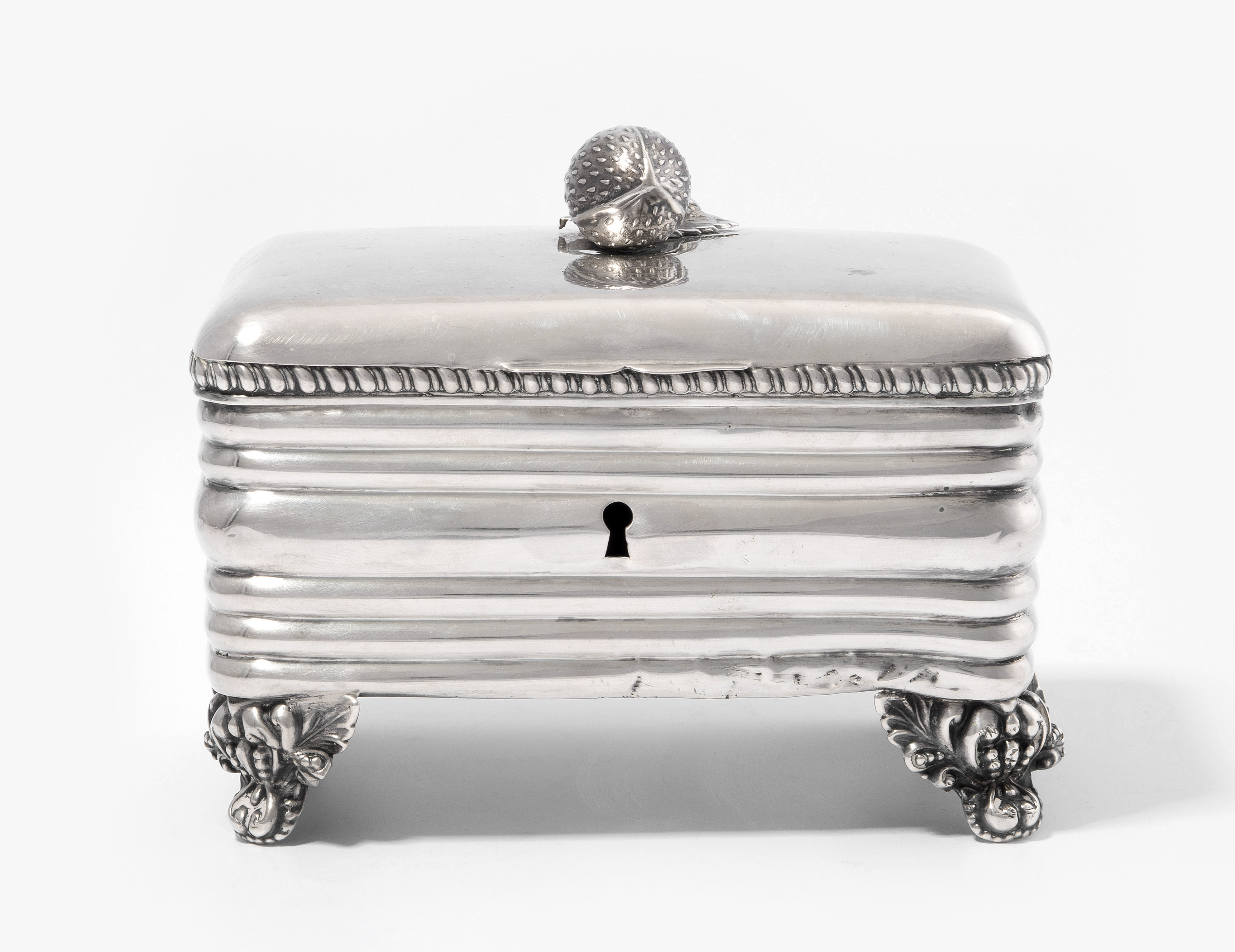 Berlin, 1842/43. Silber. Gemarkt wohl Fitze & Finger. Gerundeter Rechteckskorpus auf Volutenfüssen, scharnierter Deckel mit Erdbeerknauf, Wandung horizontal gerippt. Ohne Schlüssel. Berliner Beschau "K" u. Jahresbuchstabe "B". 13x8,5x10,5 cm, ca. 262 g.