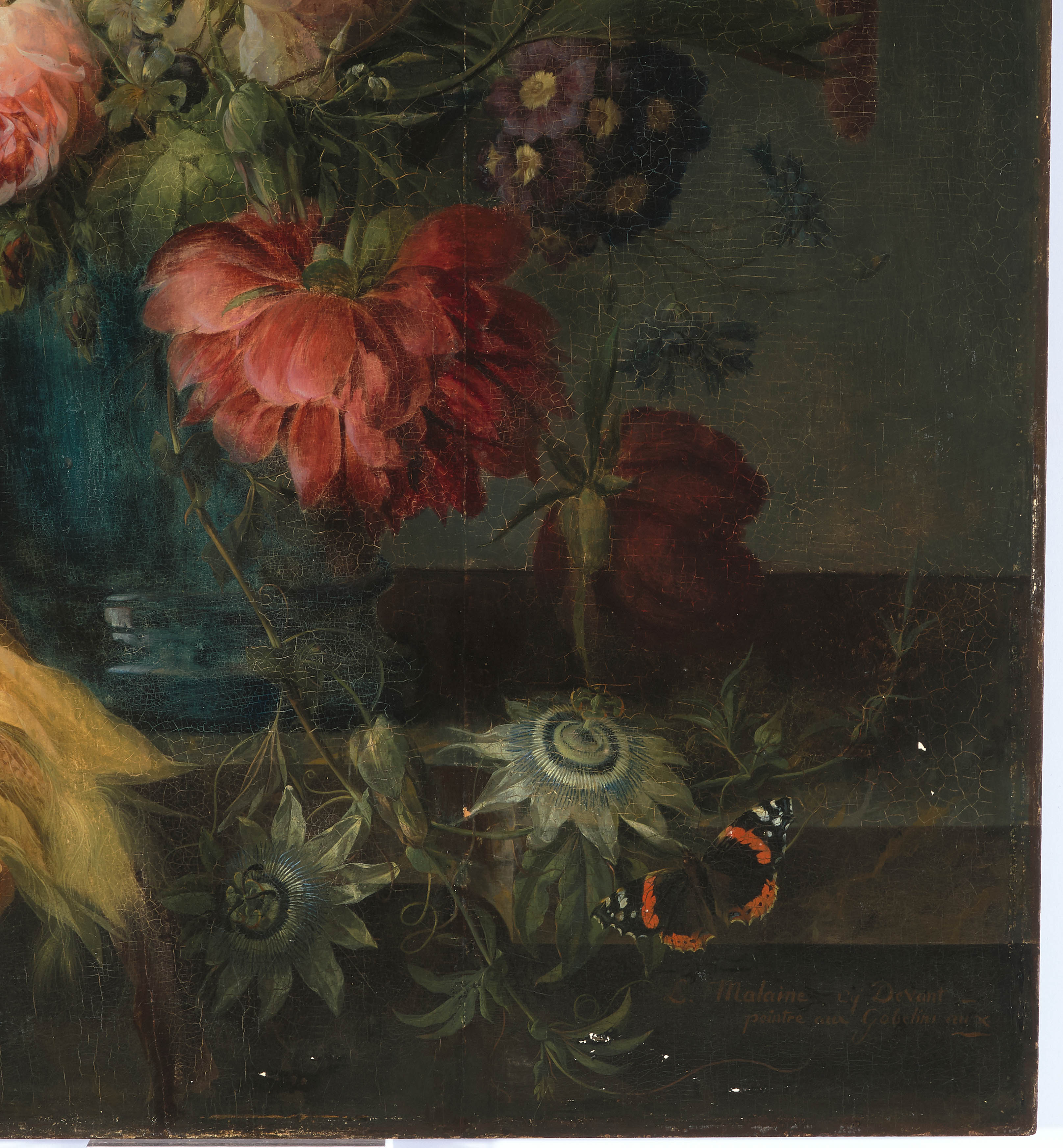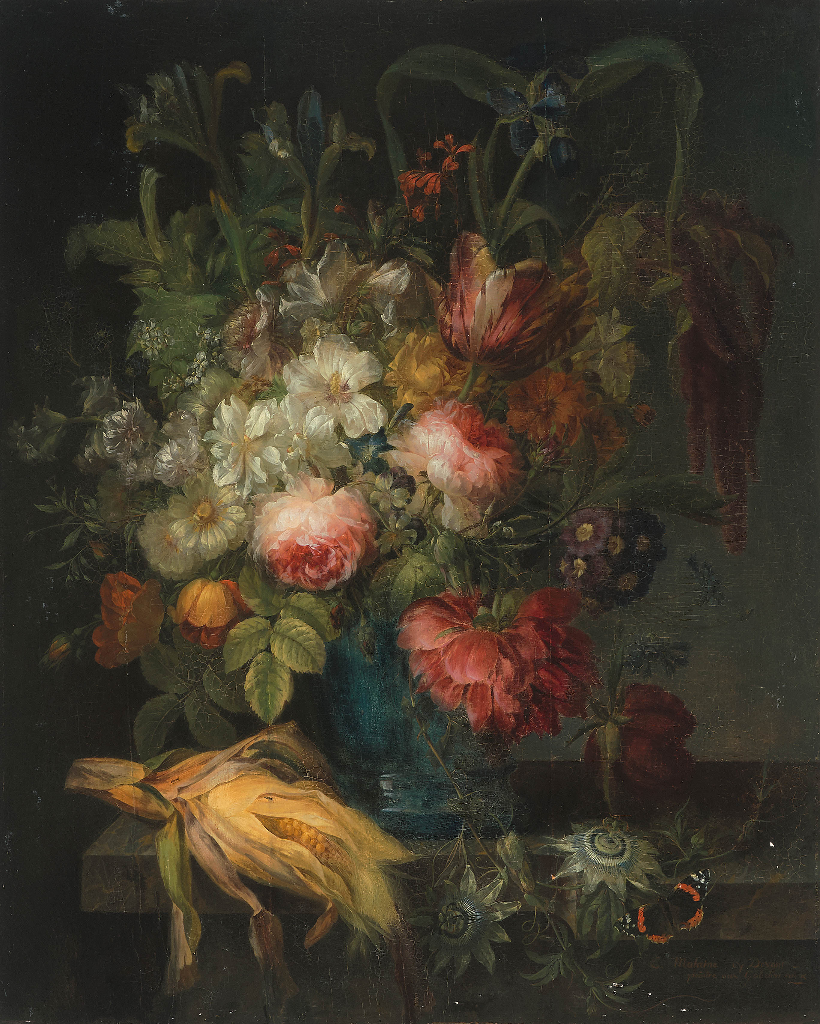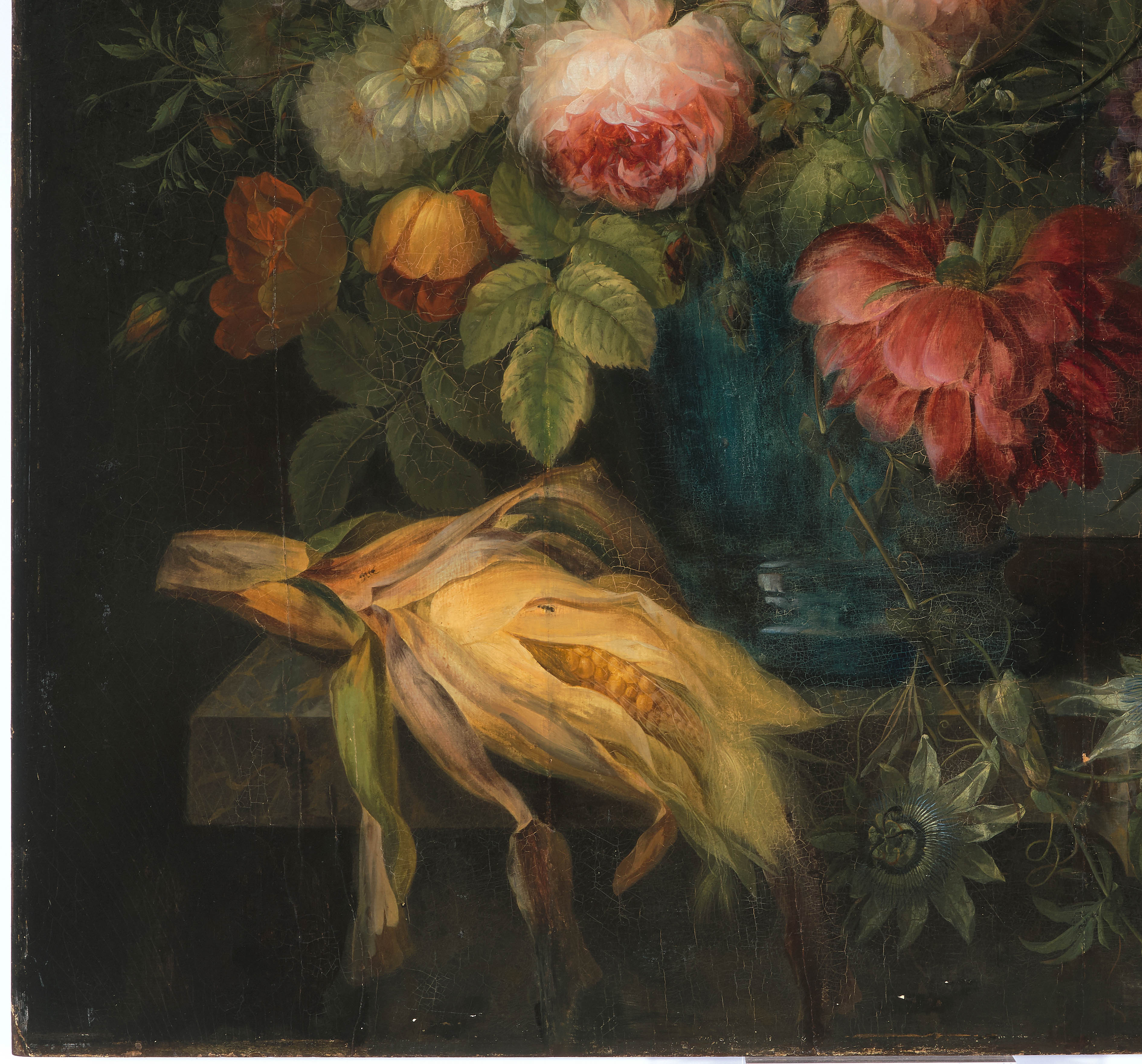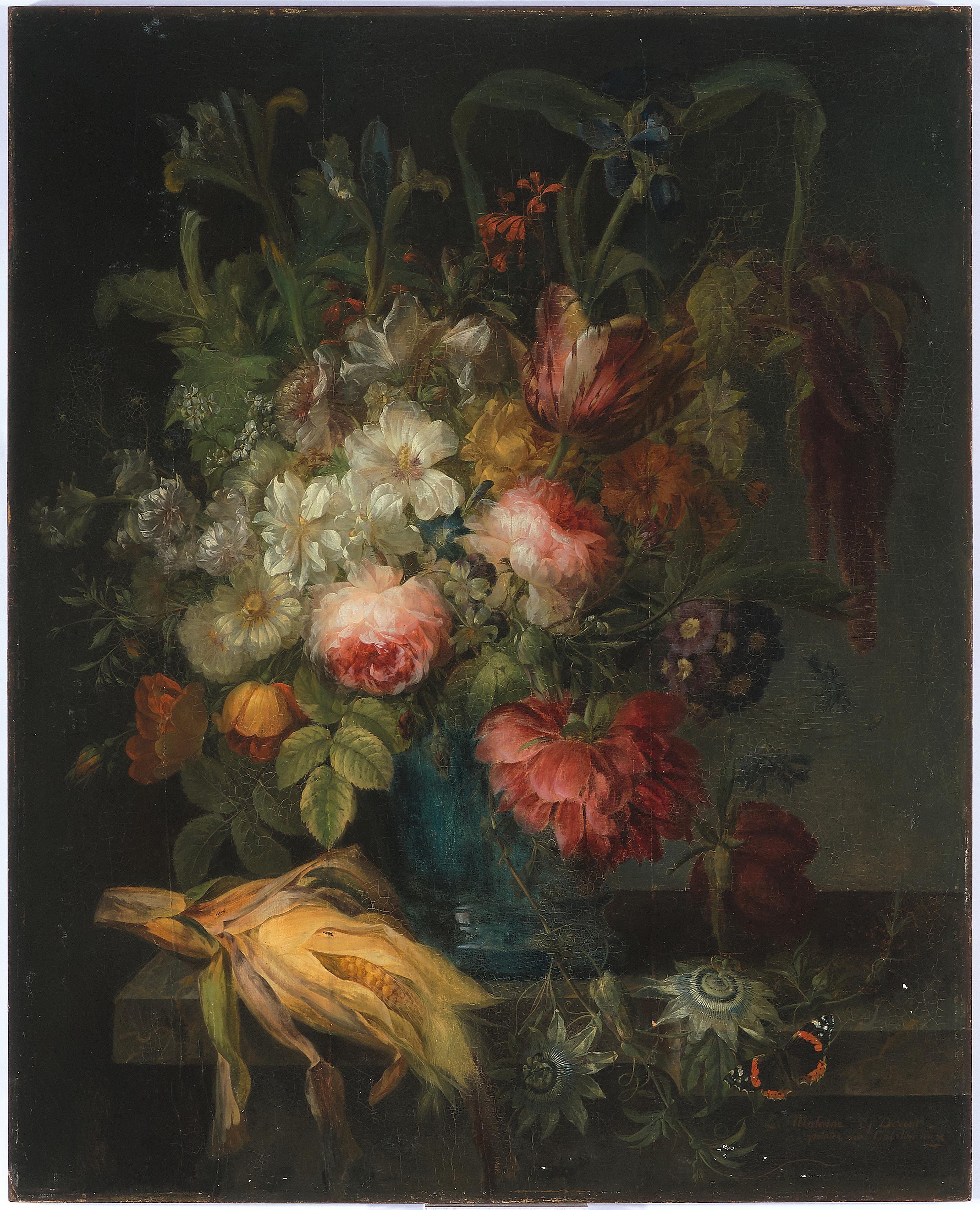 Blumenstillleben, auf der Marmorplatte ein Maiskolben. Öl auf Holz. Unten rechts bezeichnet "L. Malaine ci Devant peintre aux Gobelins (roy)aux". 73,5x59,2 cm.