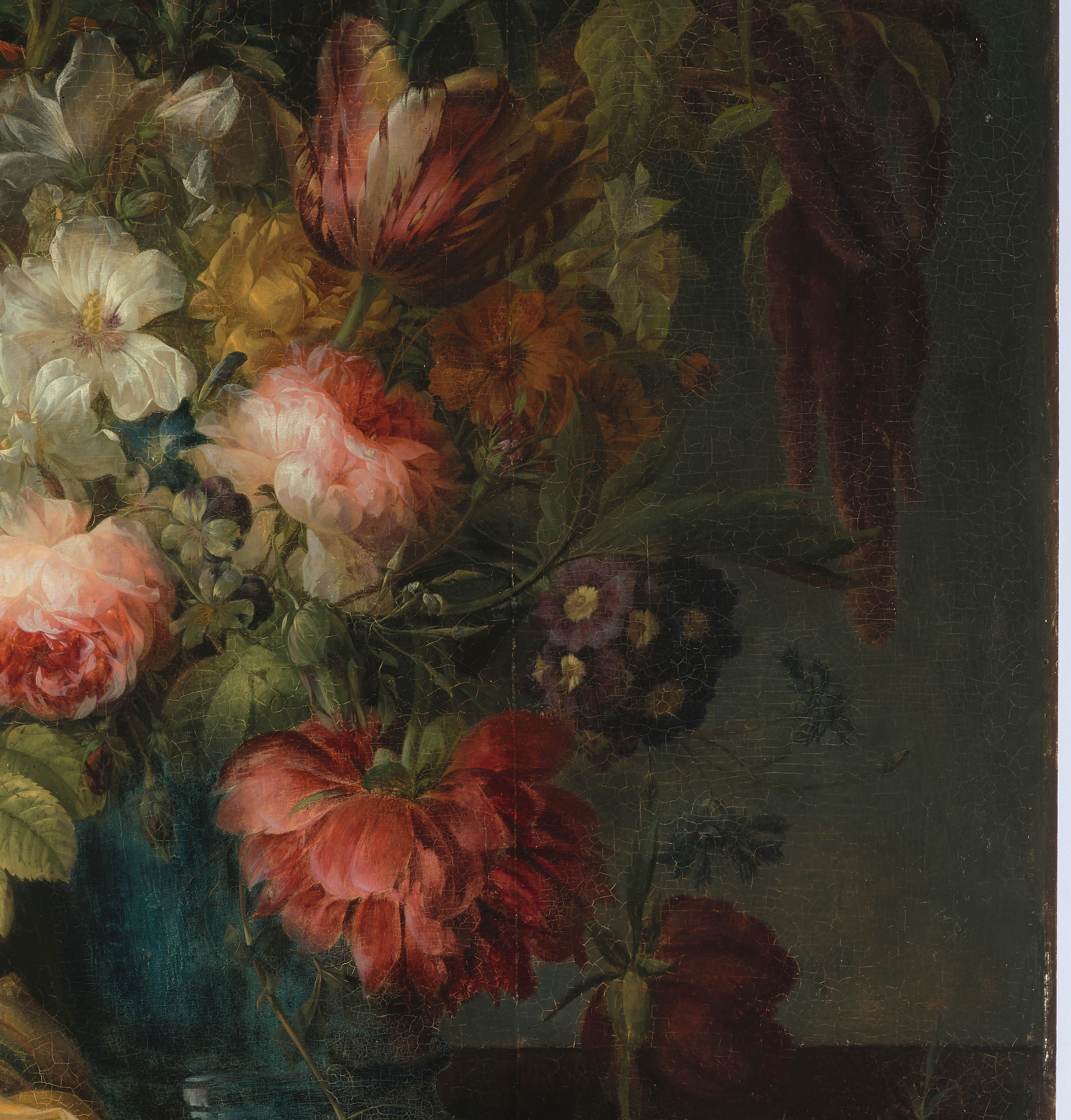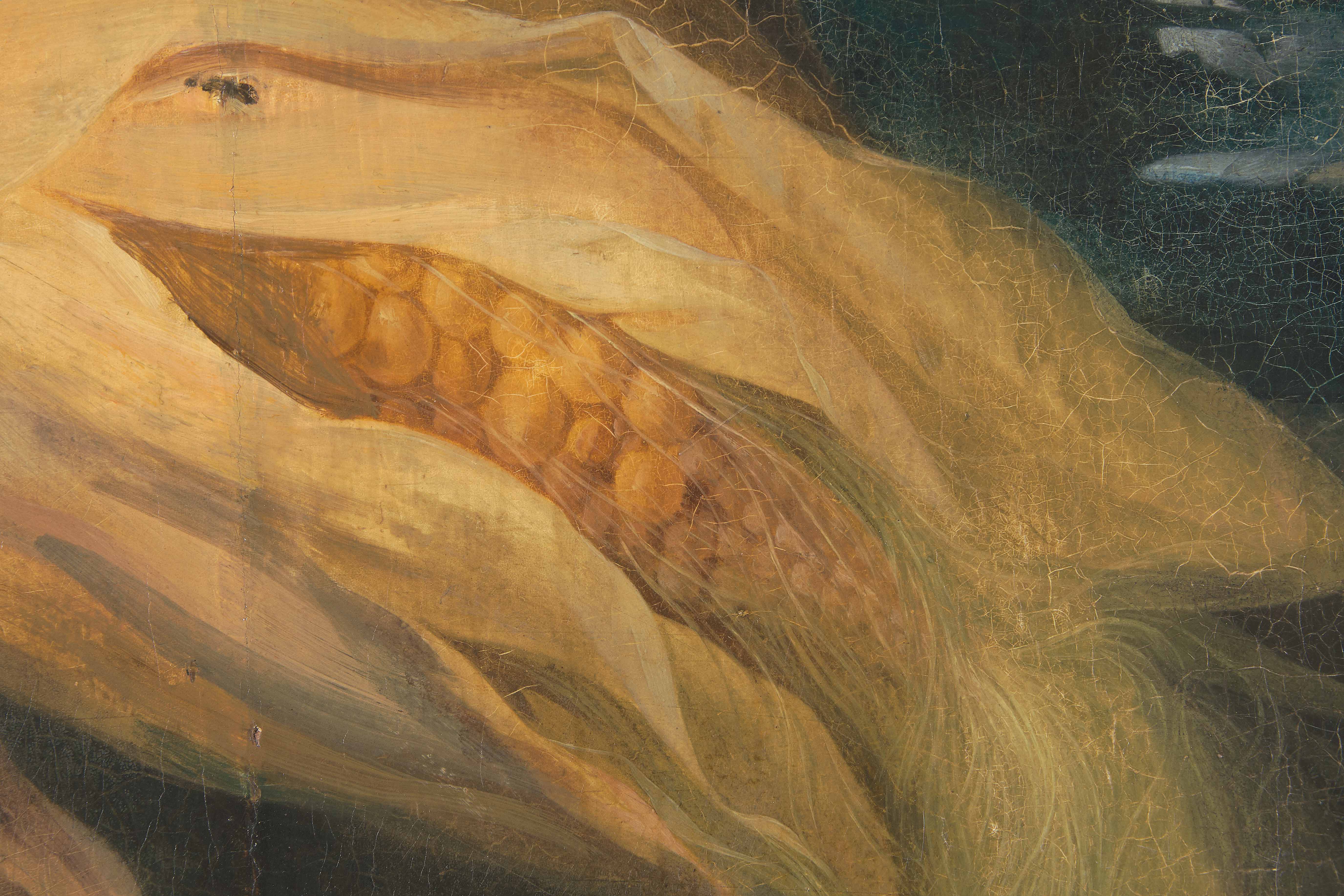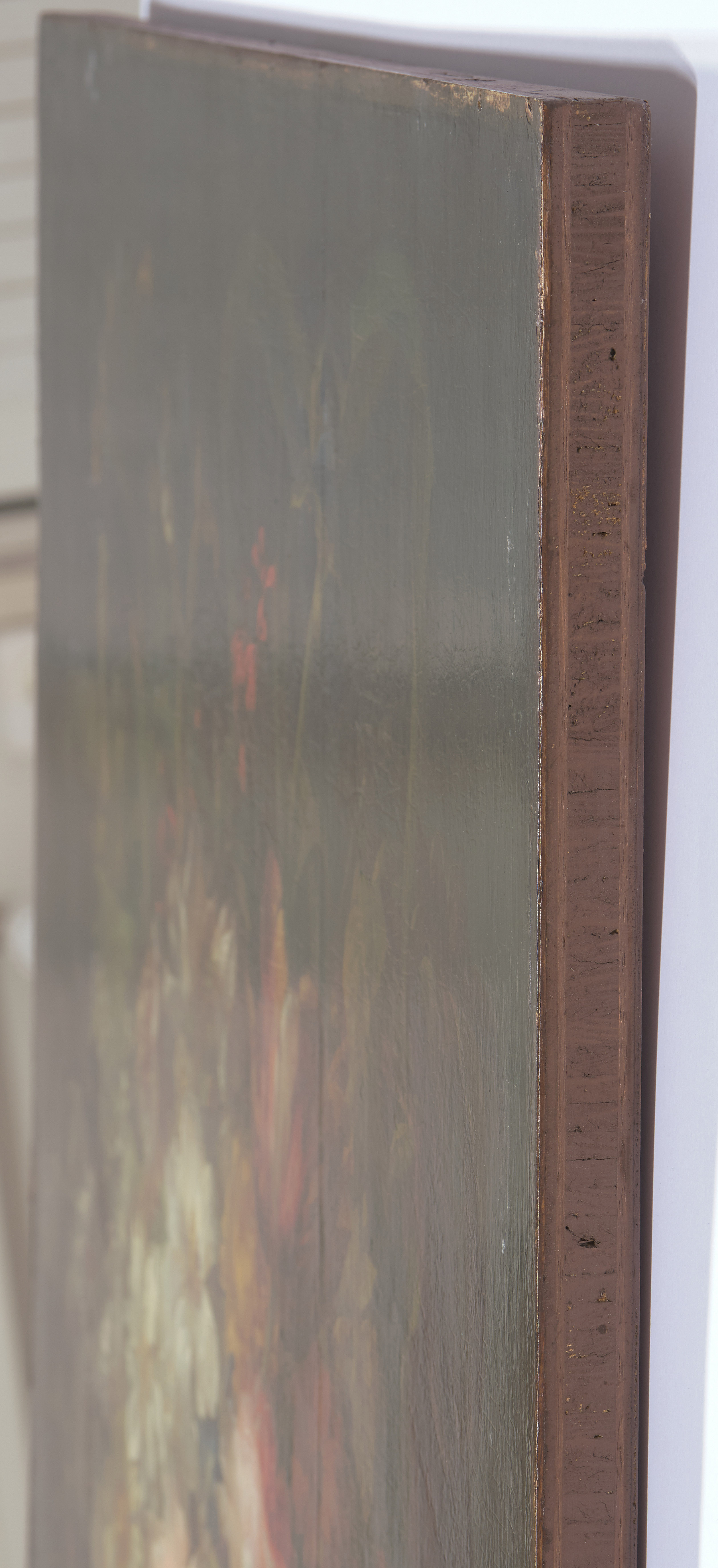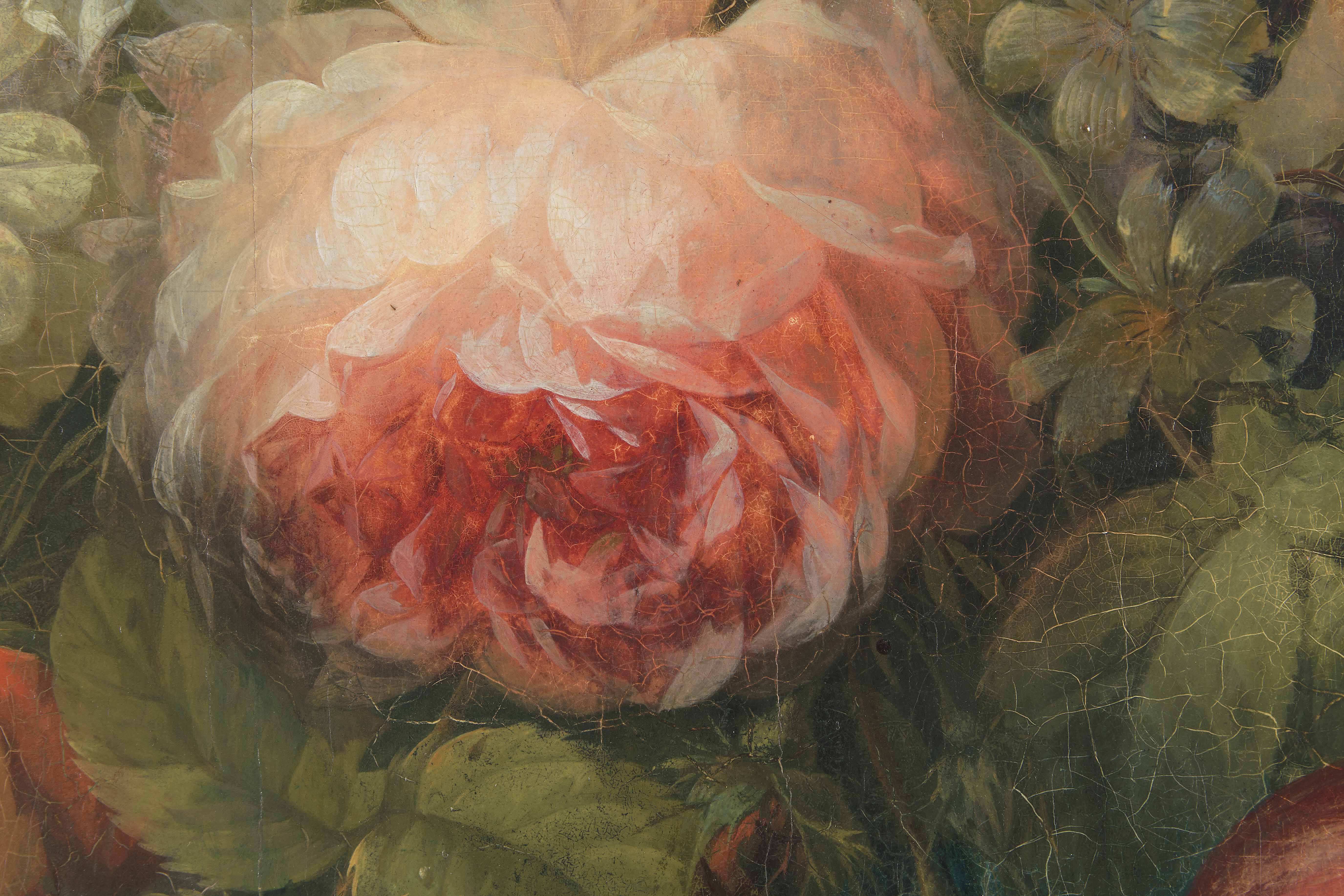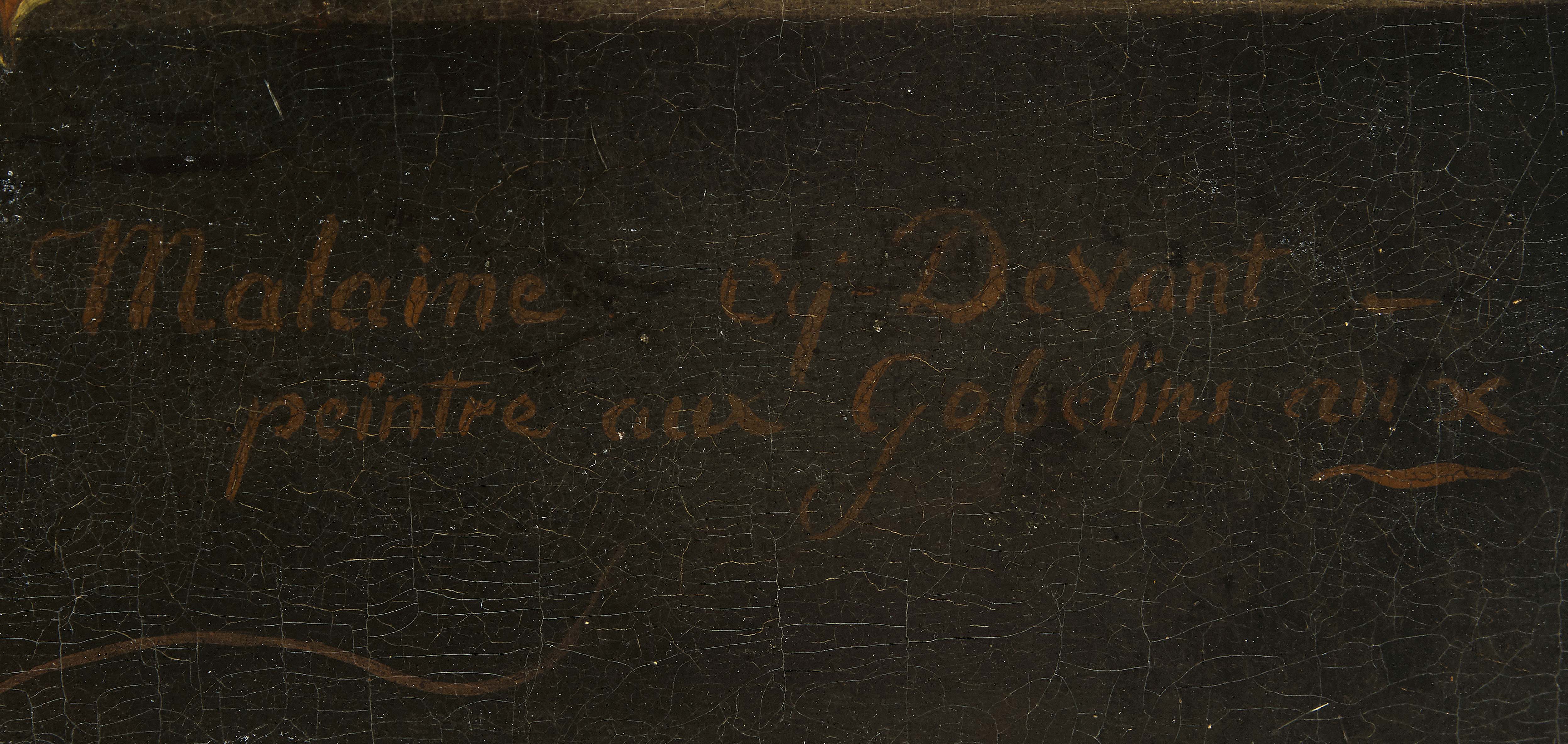 Blumenstillleben, auf der Marmorplatte ein Maiskolben. Öl auf Holz. Unten rechts bezeichnet "L. Malaine ci Devant peintre aux Gobelins (roy)aux". 73,5x59,2 cm.