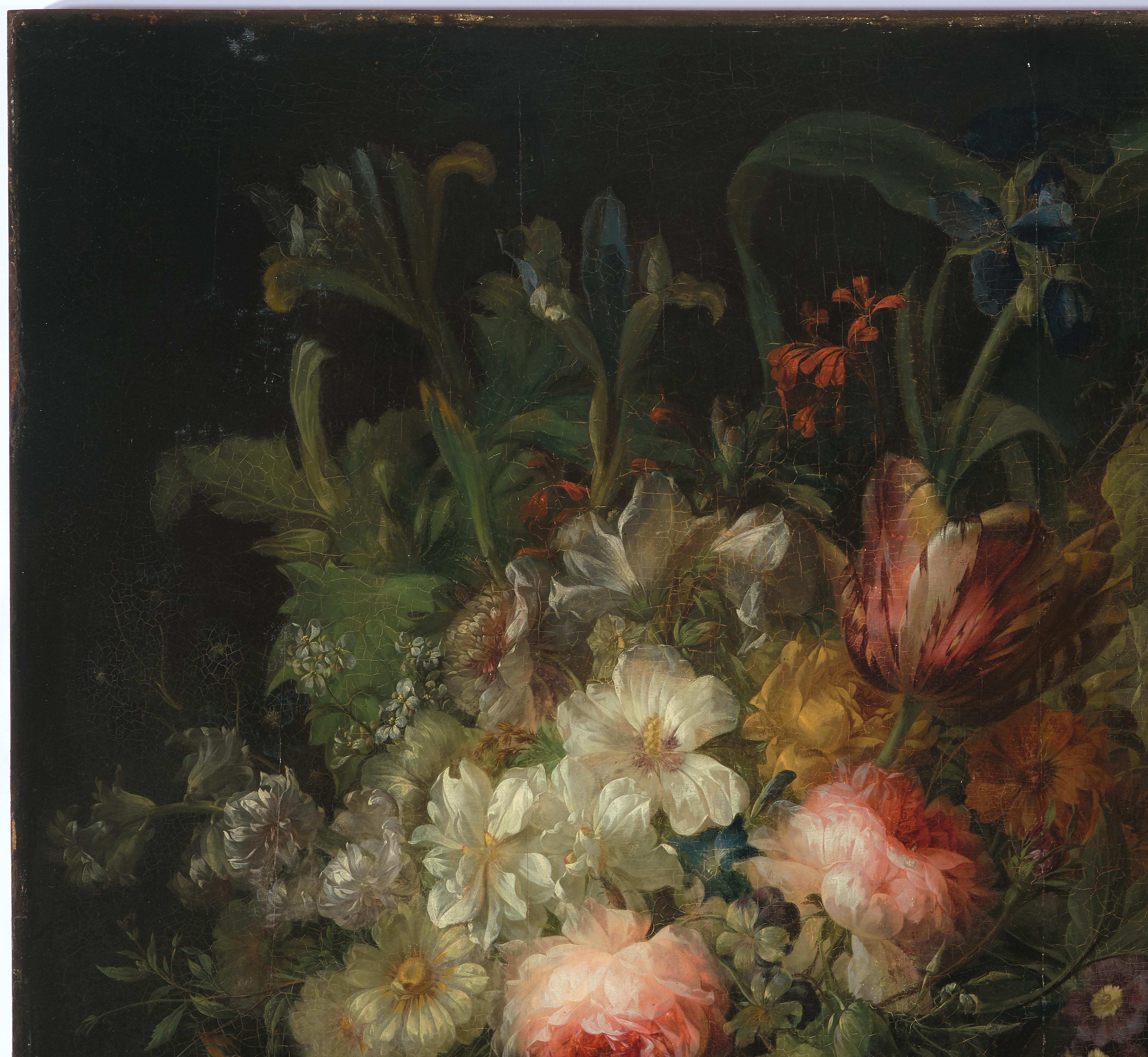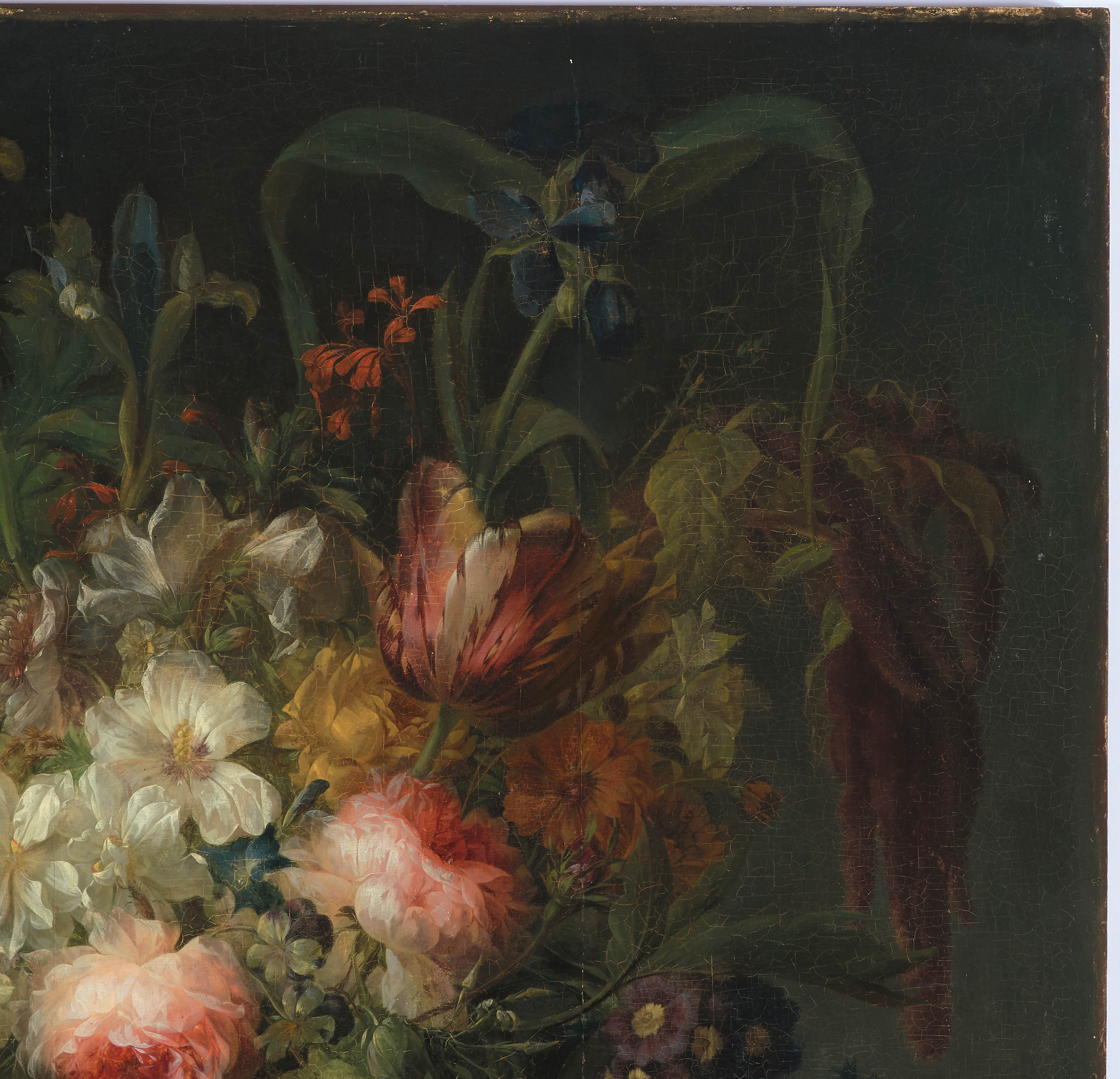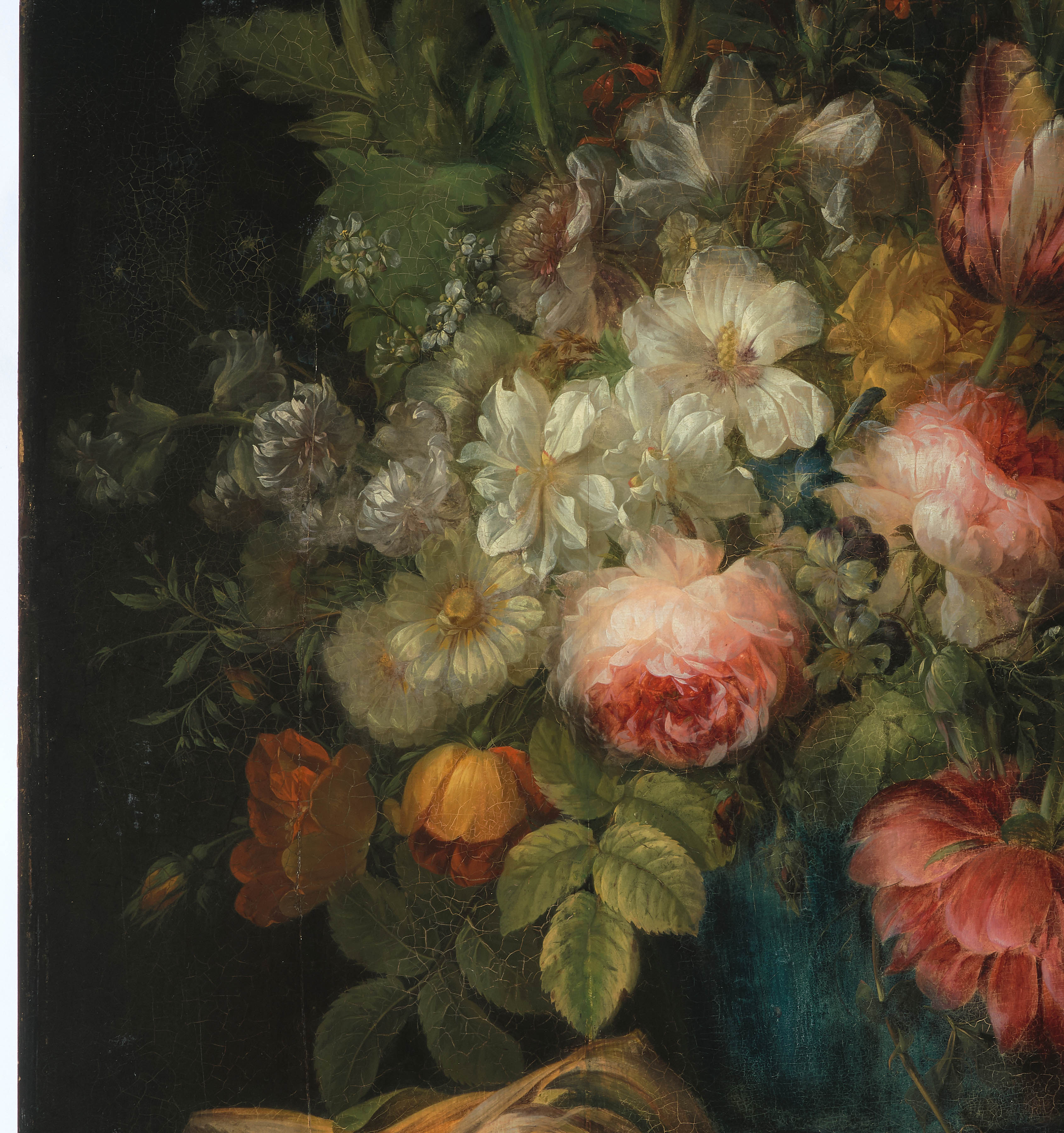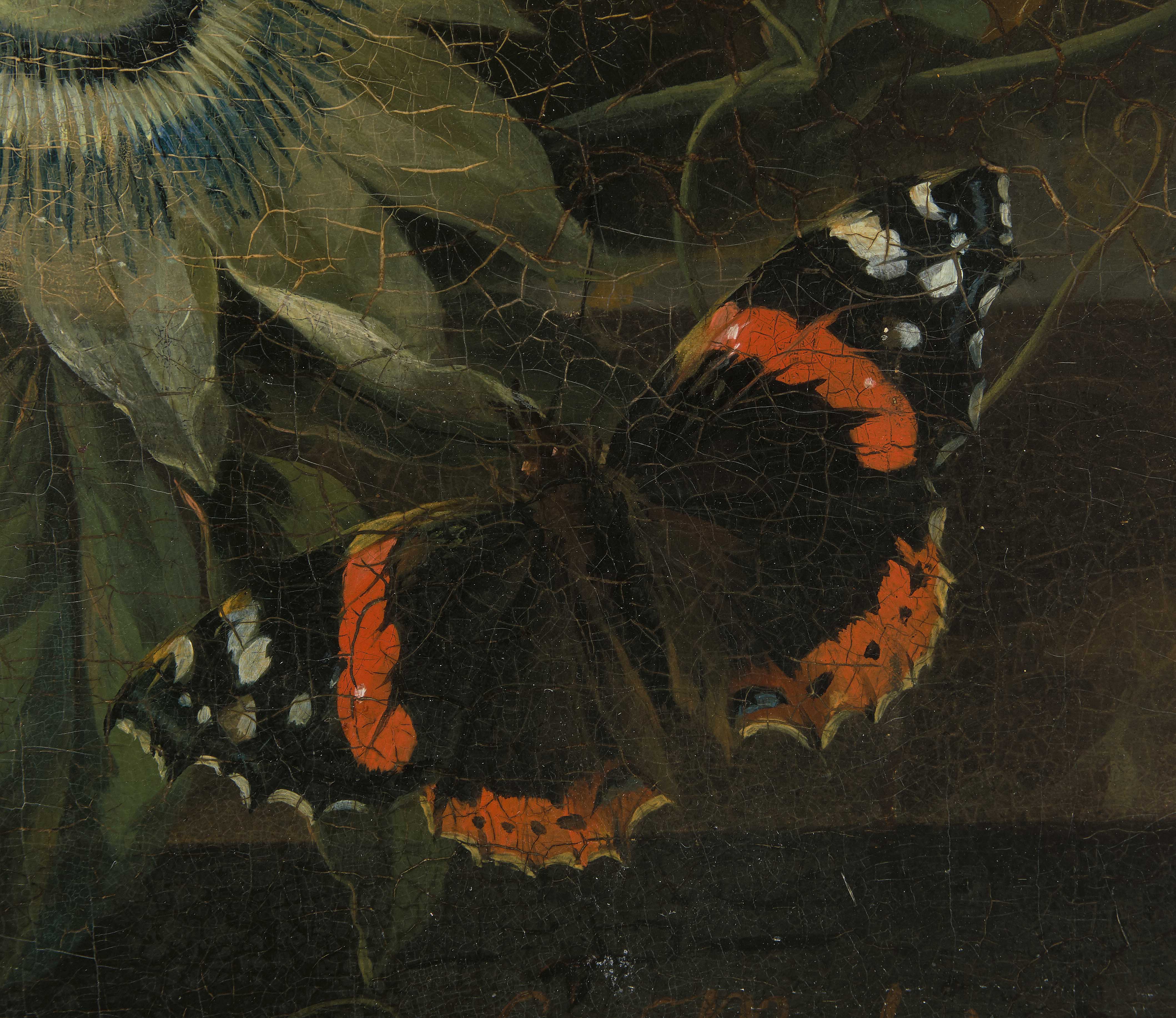 Blumenstillleben, auf der Marmorplatte ein Maiskolben. Öl auf Holz. Unten rechts bezeichnet "L. Malaine ci Devant peintre aux Gobelins (roy)aux". 73,5x59,2 cm.