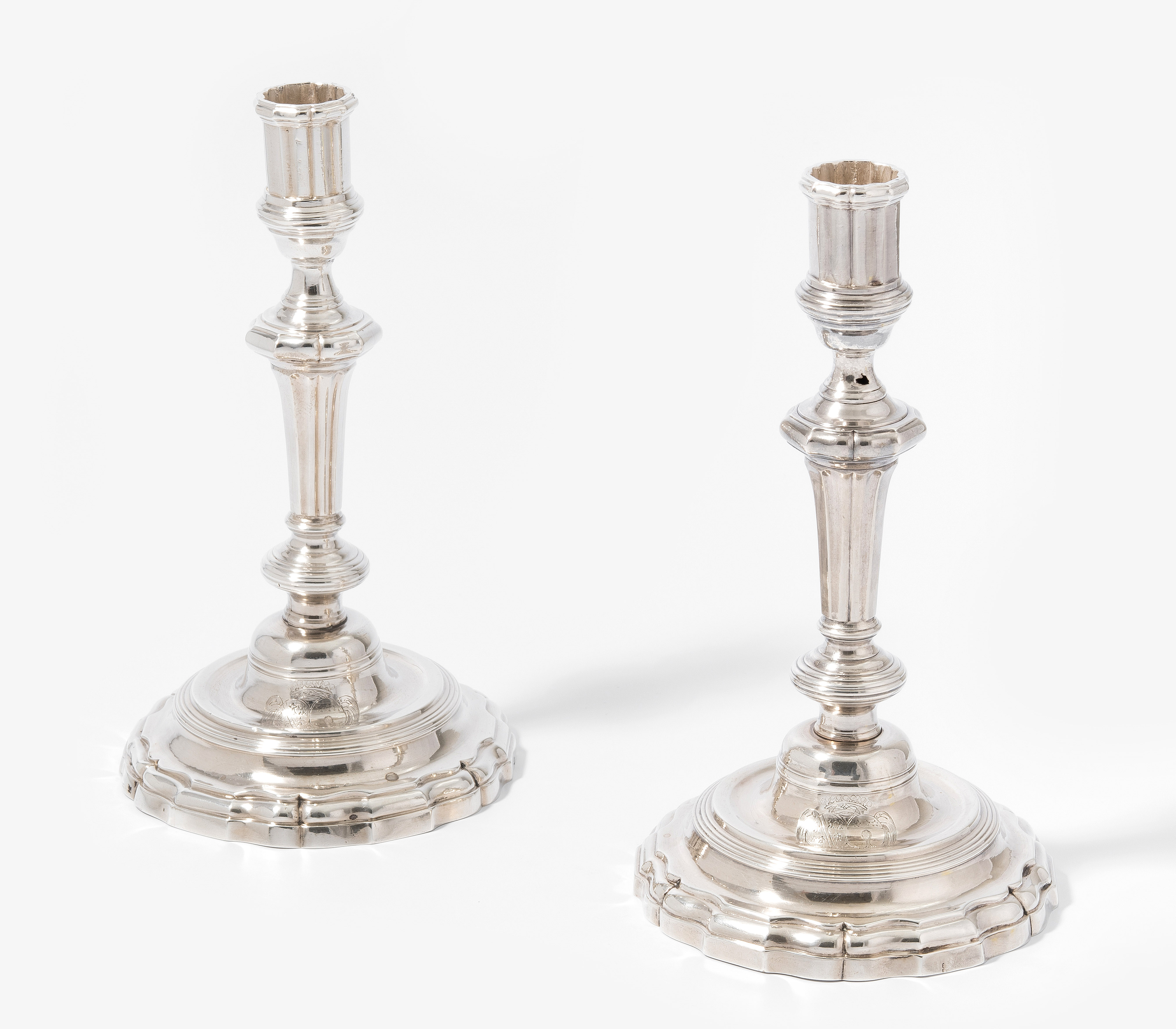 1750–56. Silber. Meistermarke Antoine Bailly. Gewölbter Rundfuss mit fassoniertem Rand, darüber Balusterschaft mit Kanneluren und Tülle. Am Fuss graviertes Doppelwappen. Garantie-, Meistermarke. H 25 cm, ca. 1020 g.