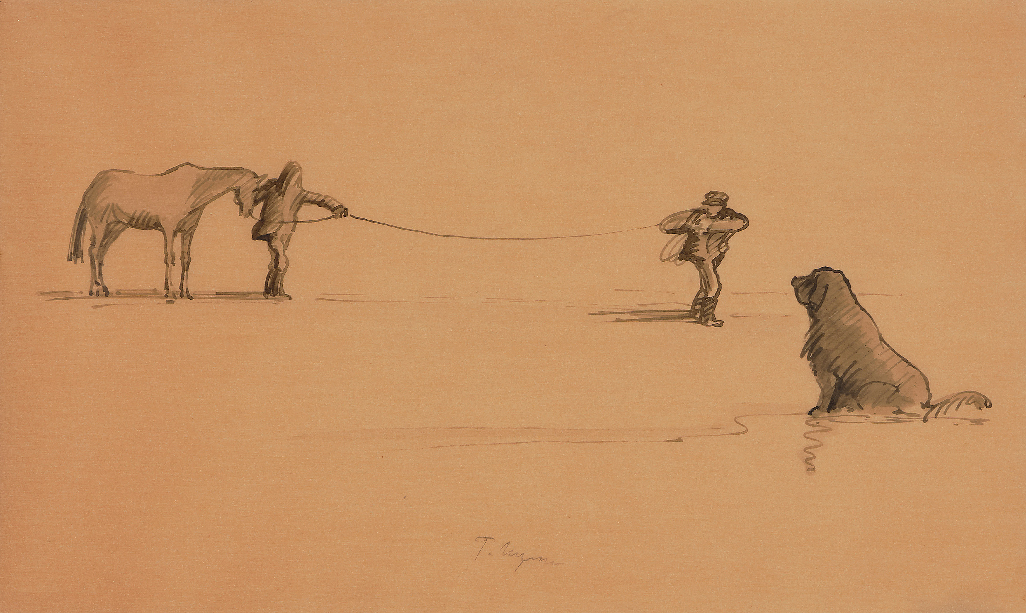 Horse and dog. Tusche auf Pergaminpapier. Unten mittig in Bleistift signiert. Lichtmass 19x31,5 cm. Gerahmt. -Blatt gebräunt. Blatt wurde zwischen Passepartout und Rückkarton montiert.