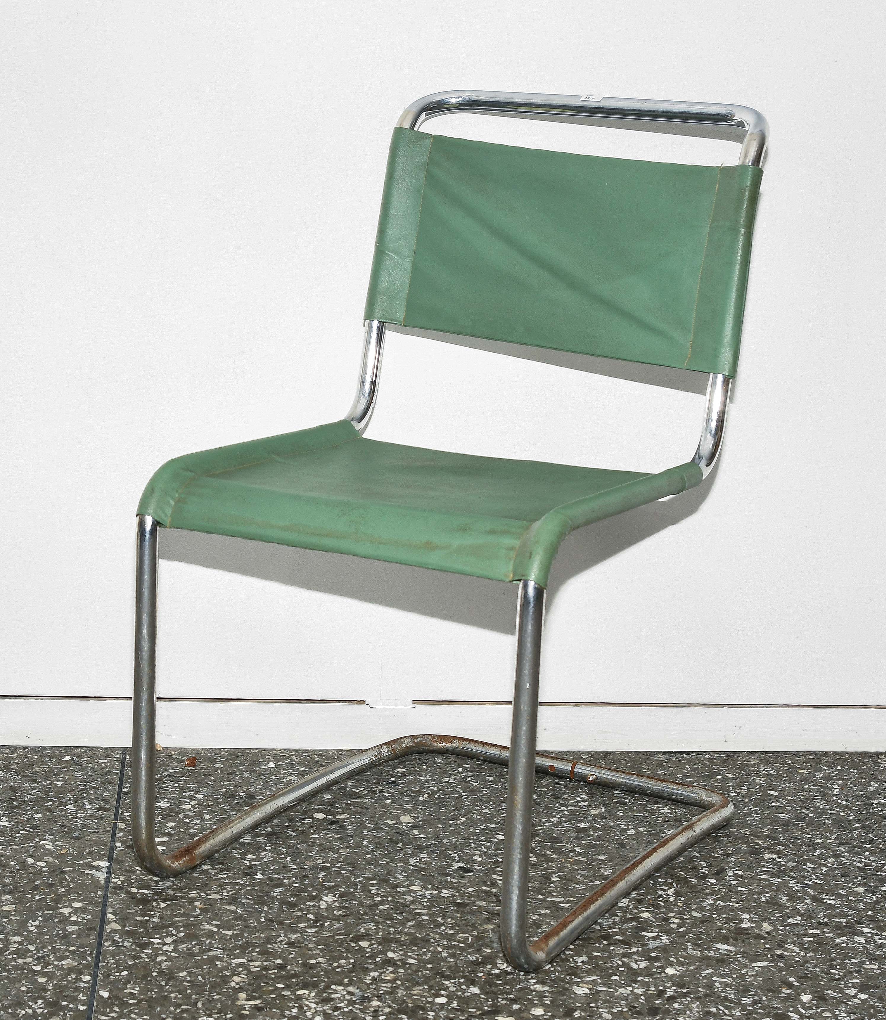 1930er Jahre. Verchromtes Stahlrohrgestell. Bespannung von Sitz und Rückenlehne aus grünem Kunstleder. 45x61,5x83 cm. Sitzhöhe 43 cm.