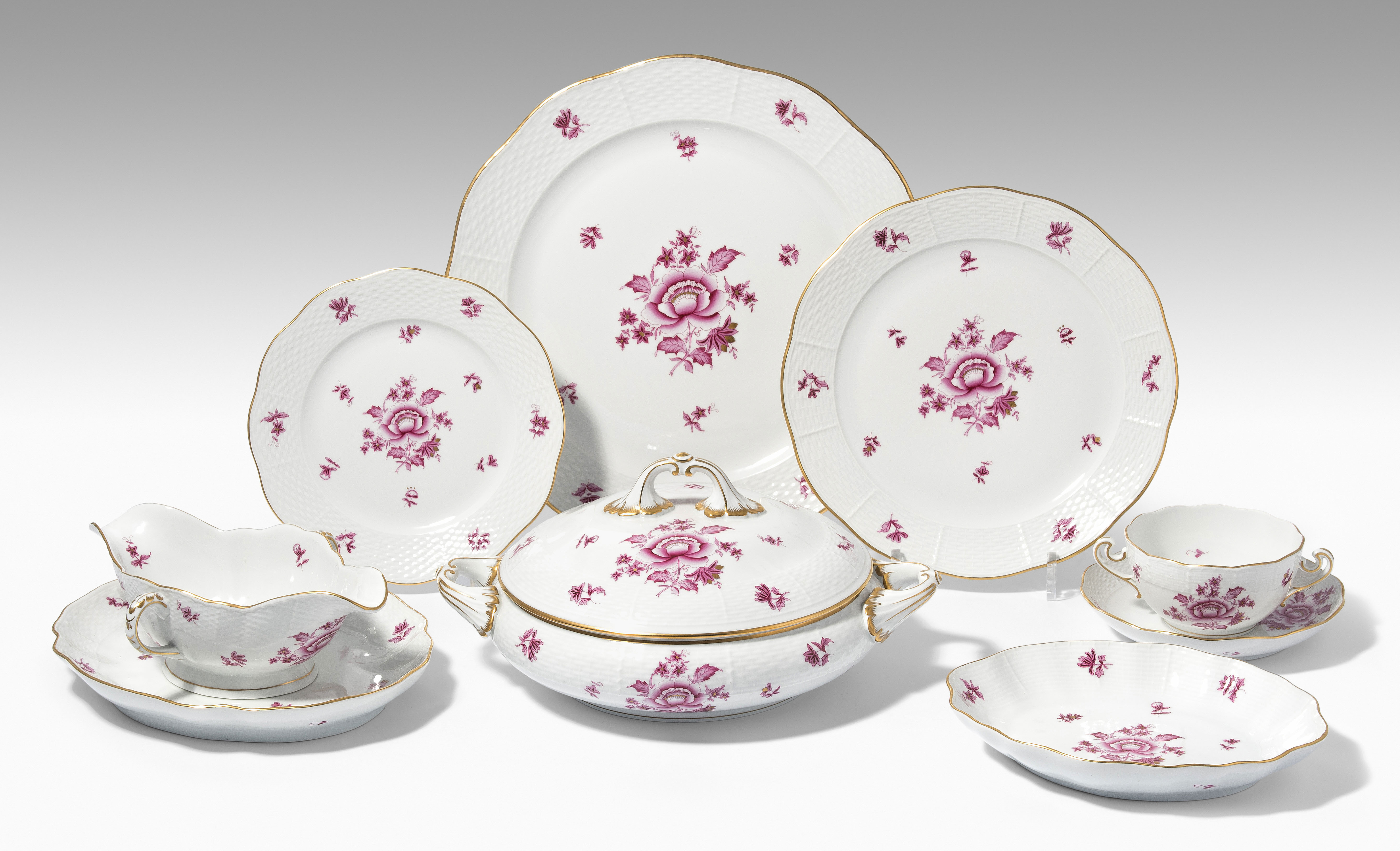 Nach 1945. Porzellan, Osier. Dekor "Nanking bouquet" in Purpur. Bestand: 8 Fleischteller (D 25 cm), 8 Suppentassen mit Untertassen, 8 Brotteller (D 20 cm), 1 Terrine auf Présentoir, 1 Saucière auf Présentoir, 2 ovale Platten (L 36 u. 40 cm), 1 ovale Schale, 1 viereckige Schale. Total 32 Teile.