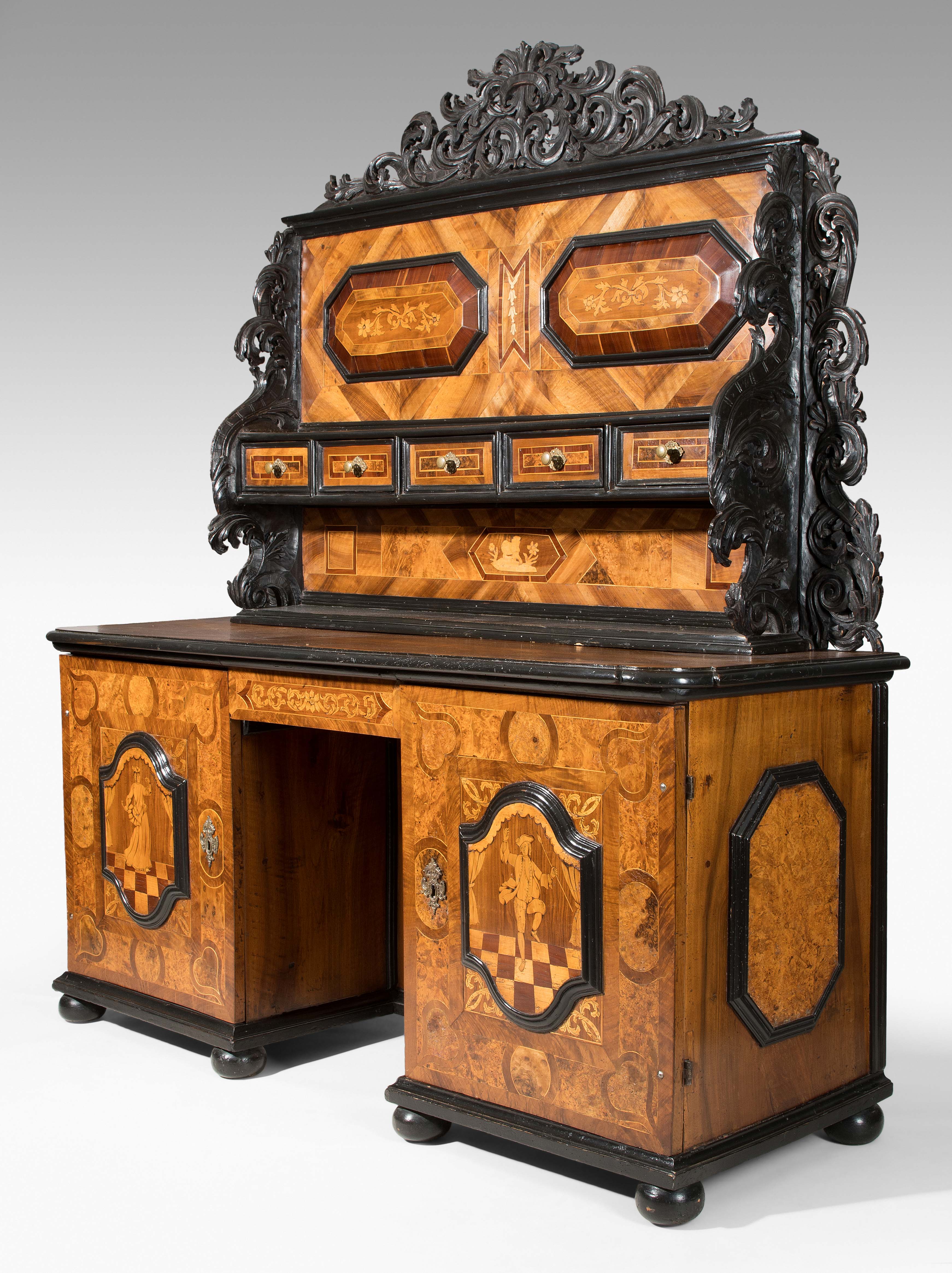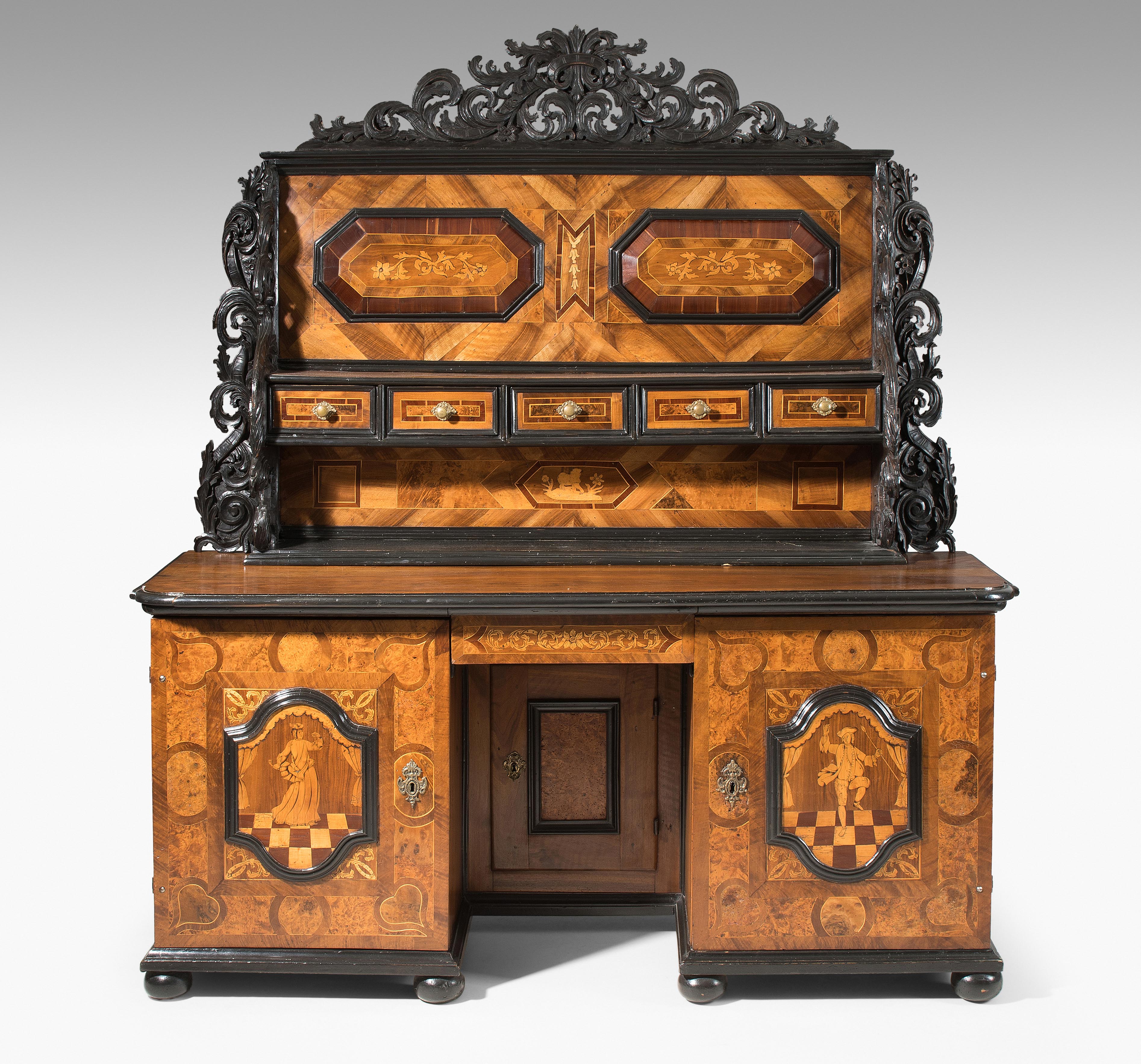 Barock ca. 1750. Beromünster, Luzern. Nussbaum, Ahorn, Wurzelholz. Zweitüriger Unterteil mit Kniefach und Türe. Aufsatz mit fünf kleinen Schubladen und floral beschnitzten Wangen. Front gefeldert furniert und mit figürlichen Darstellungen intarsiert. Guter Zustand. 172x58x190 cm.