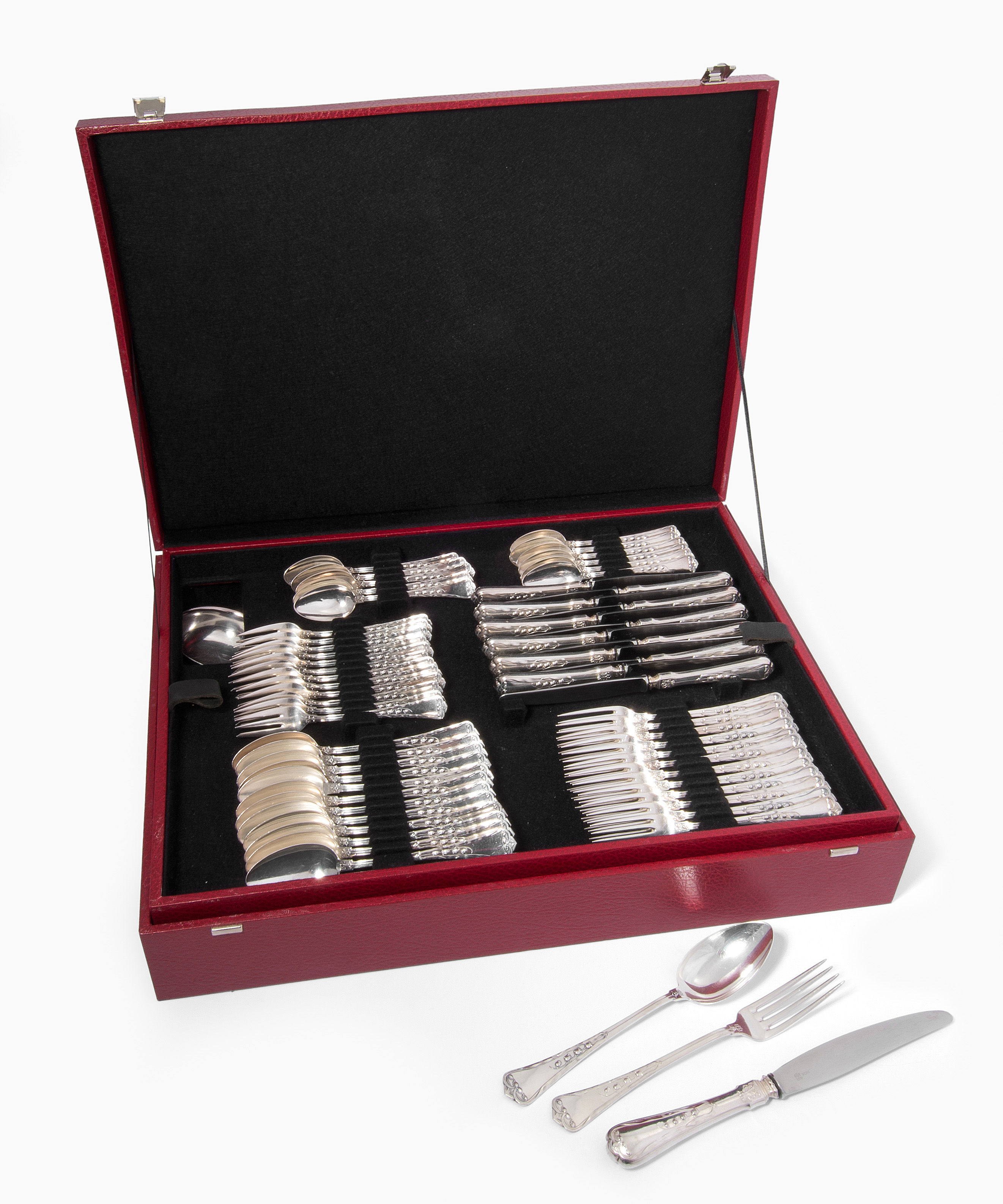 Schaffhausen, 20.Jh. Silber, 114 teilig. Herstellermarke Jezler, Modell Maieriesli. Bestand: 12 Suppenlöffel, 12 Fleischmesser, 12 -gabeln, 12 Dessertlöffel, 12 -messer u. 12 -gabeln, 12 Kuchengabeln, 11 Kaffeelöffel, 12 Mokkalöffel, 7 Servierbestecke. In originalem Kasten. Herstellermarke, Feingehalt 800. Ca. 3520 (ohne Messer).