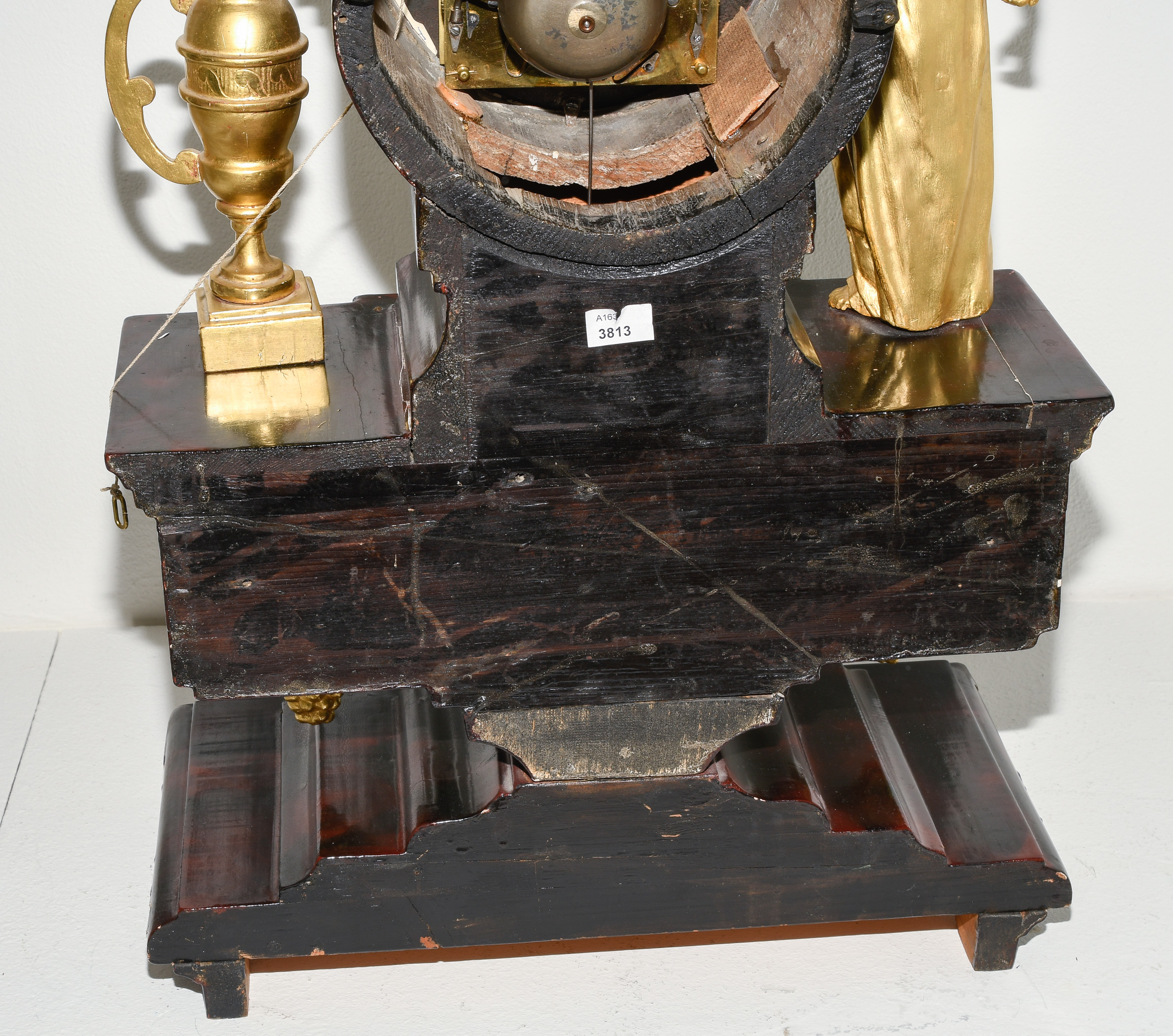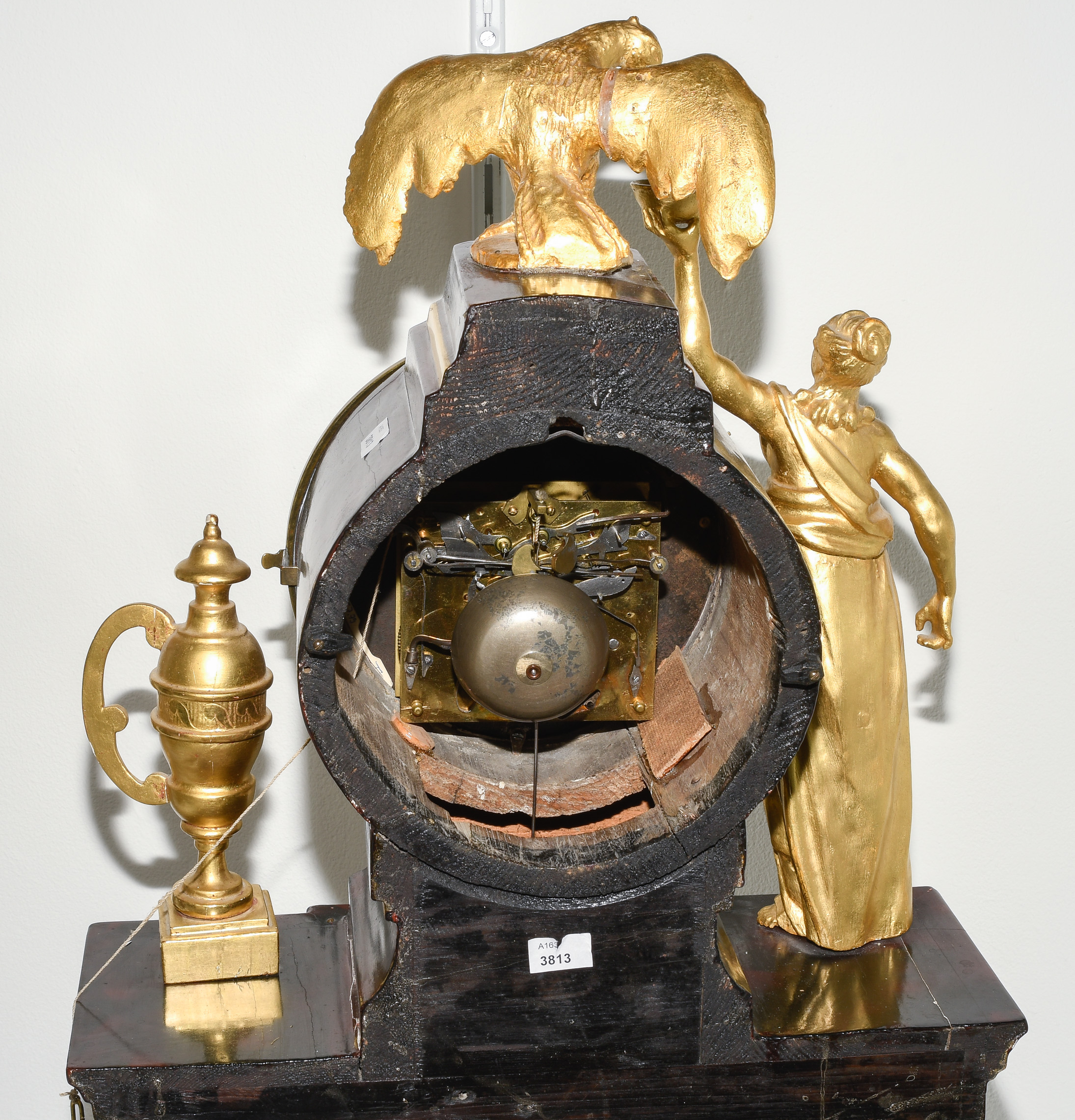 Süddeutschland, um 1800. Empire. Schildpattfarben gefasstes Holzgehäuse. Aus Holz geschnitzter, vergoldeter Figurenschmuck "Hebe als Mundschenkin des Zeus in Adlergestalt". Emailzifferblatt. Ornamental ausgesägte Messingzeiger. Messingwerk mit Ankerhemmung. Rechenschlagwerk mit Viertelstundenschlag auf zwei Glocken. Zugrepetition. Pendel mit Fadenaufhängung. Gangfähig. Schlüssel vorhanden. H 68 cm.