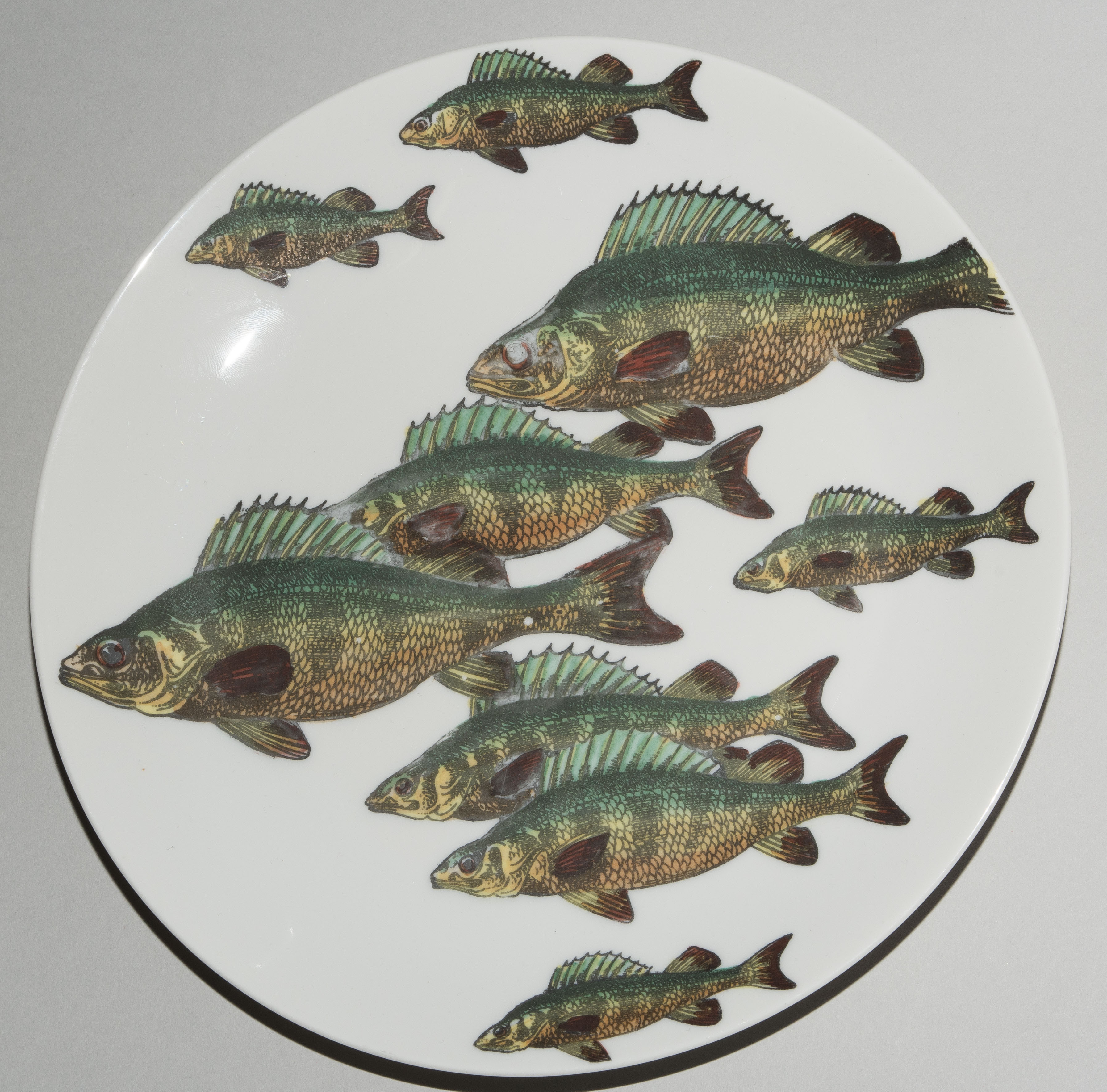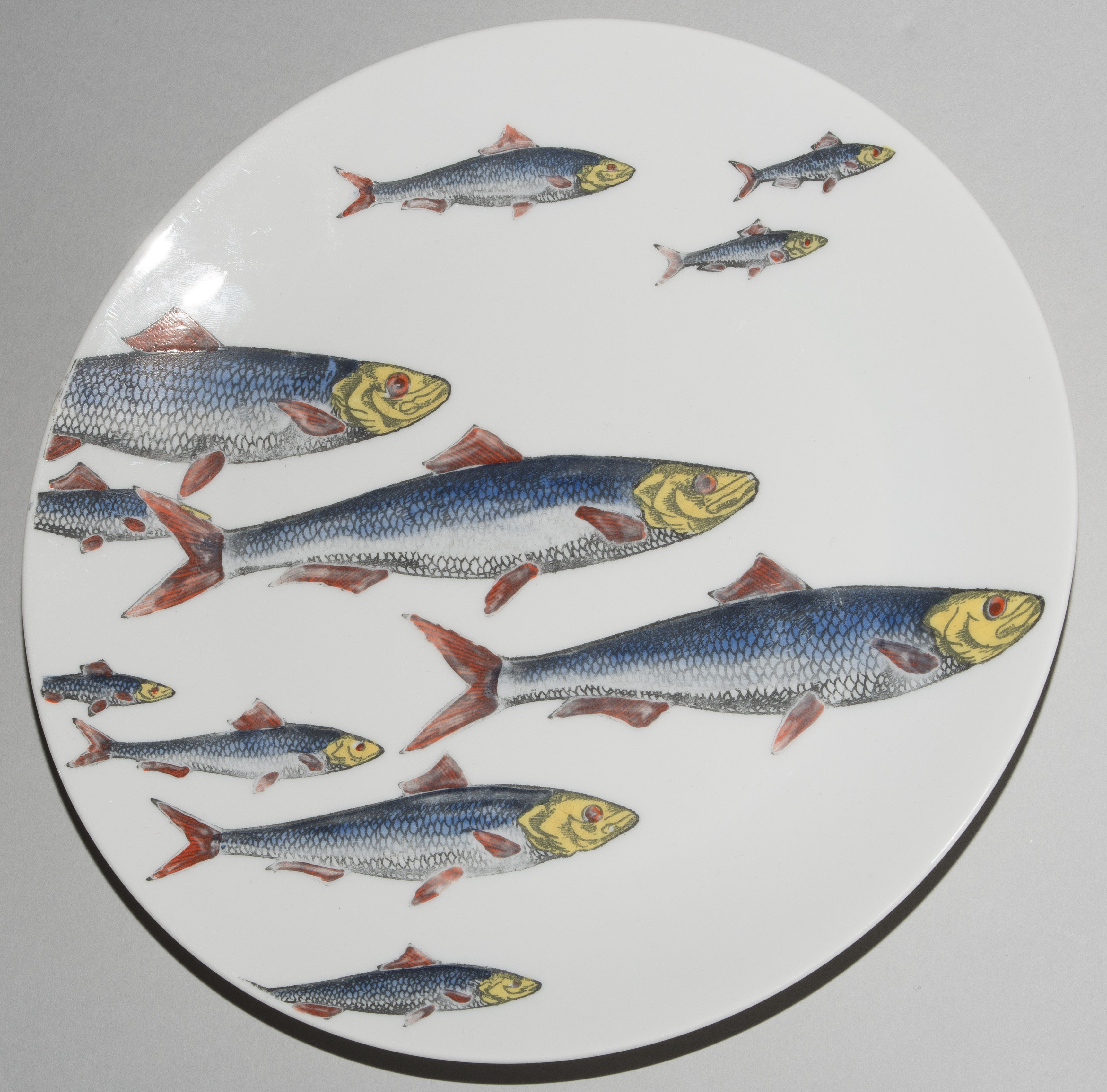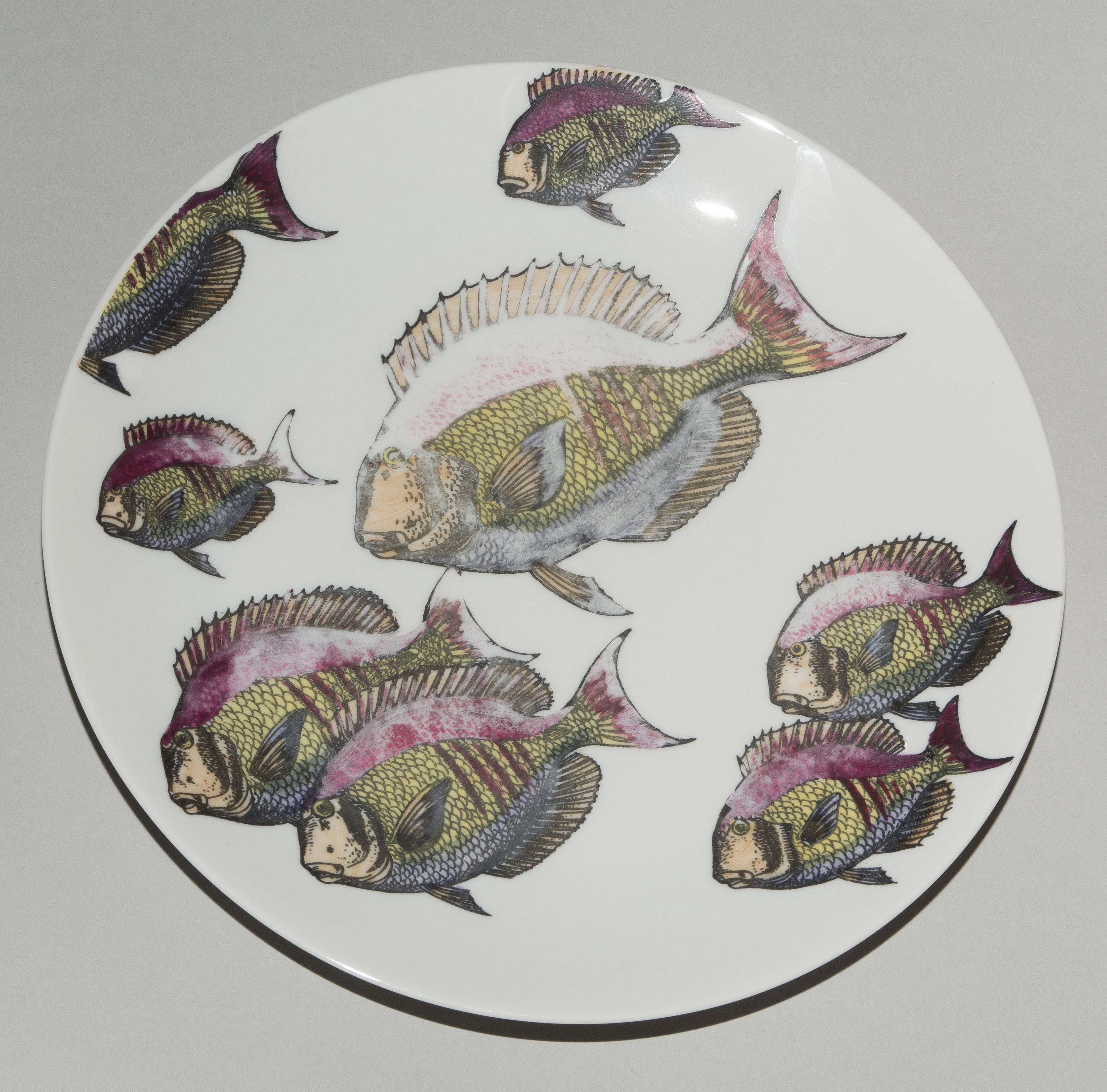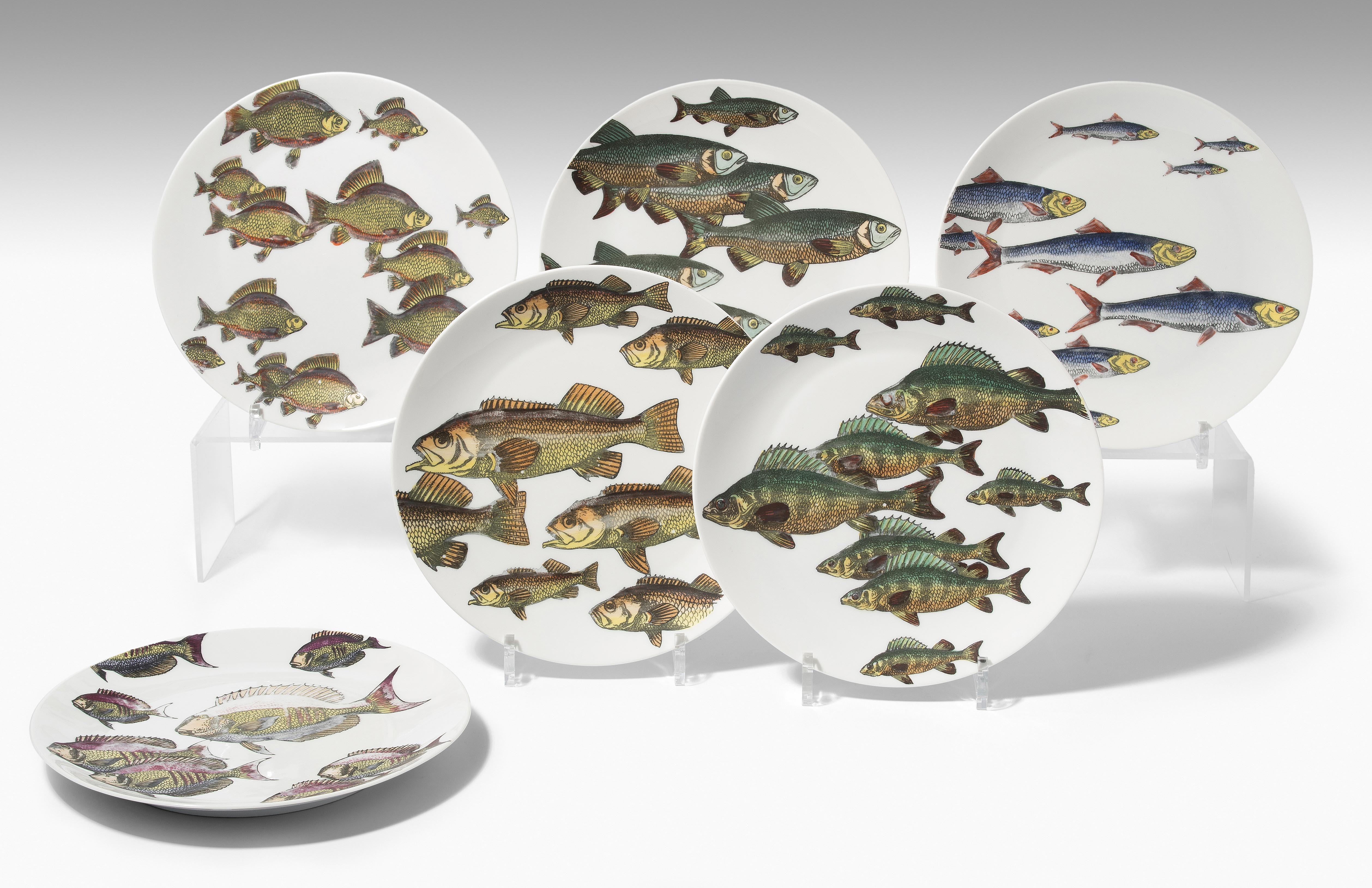 1955, Porzellan "Arzberg, Germany". Druckdekor, polychrom übermalt. Aus der Serie "Pesci". Diverse Fischdarstellungen. Rückseitig nummeriert und datiert "Pesci Fornasetti Milano Made in Italy 1955". D 24 cm.