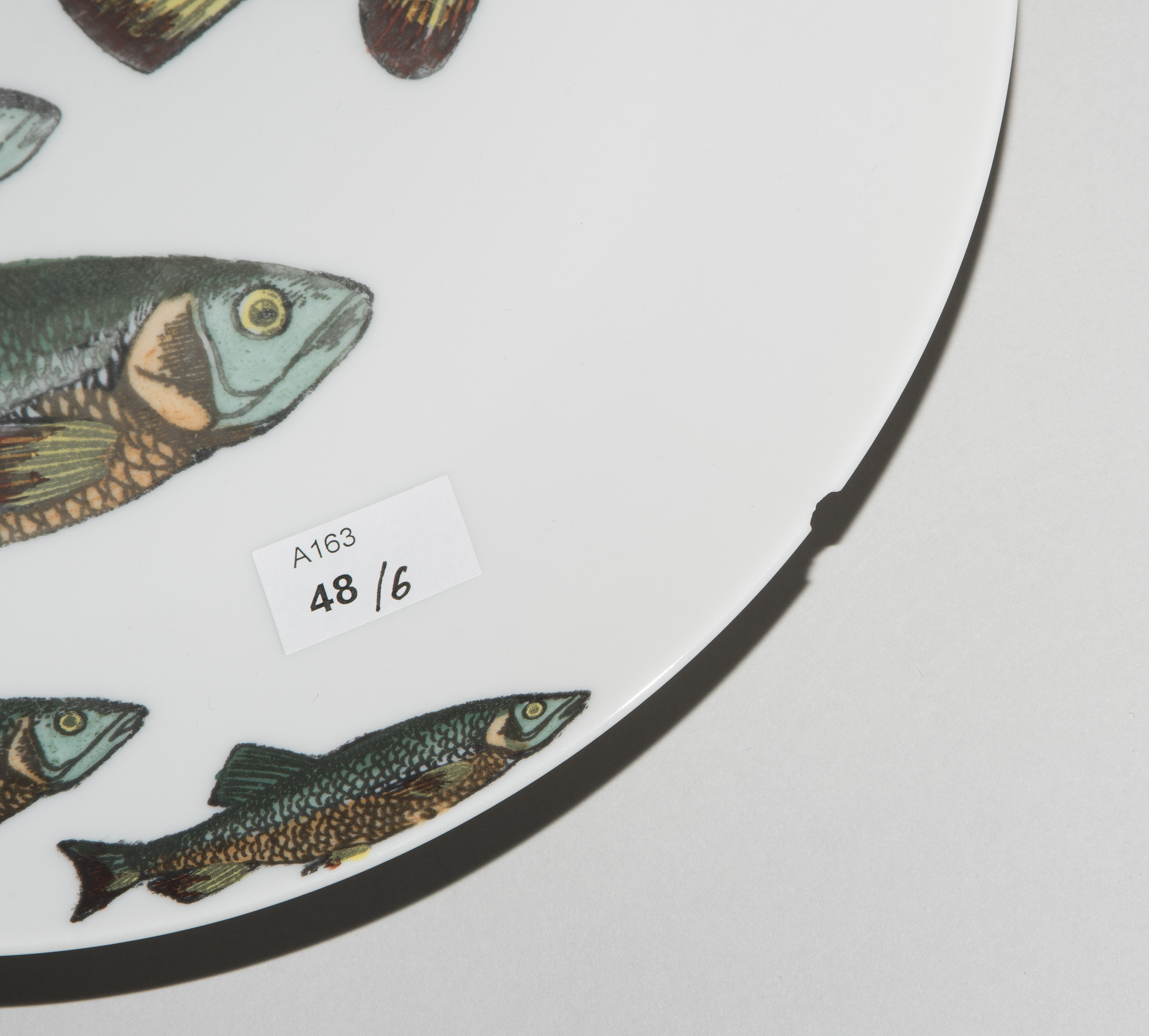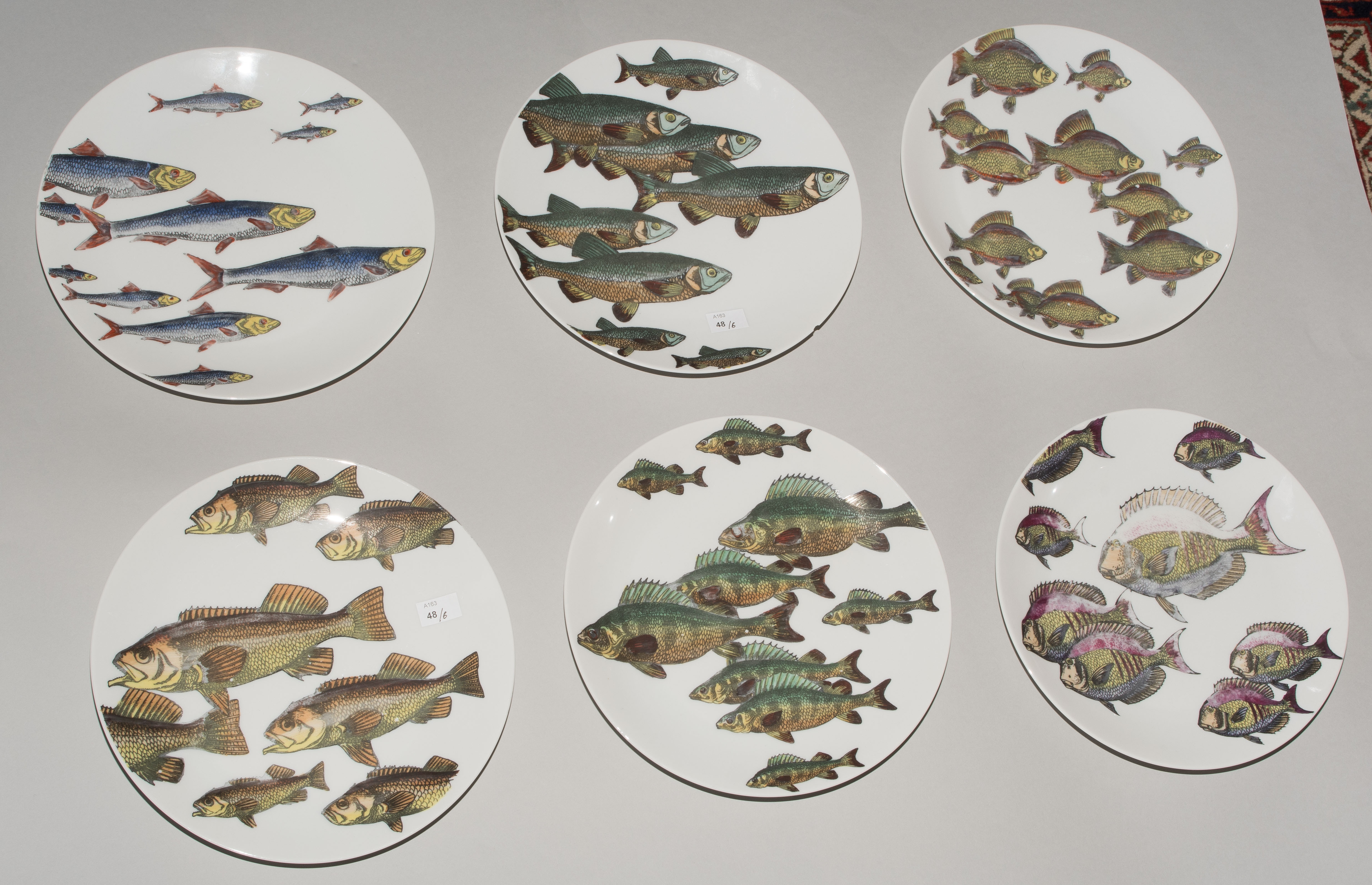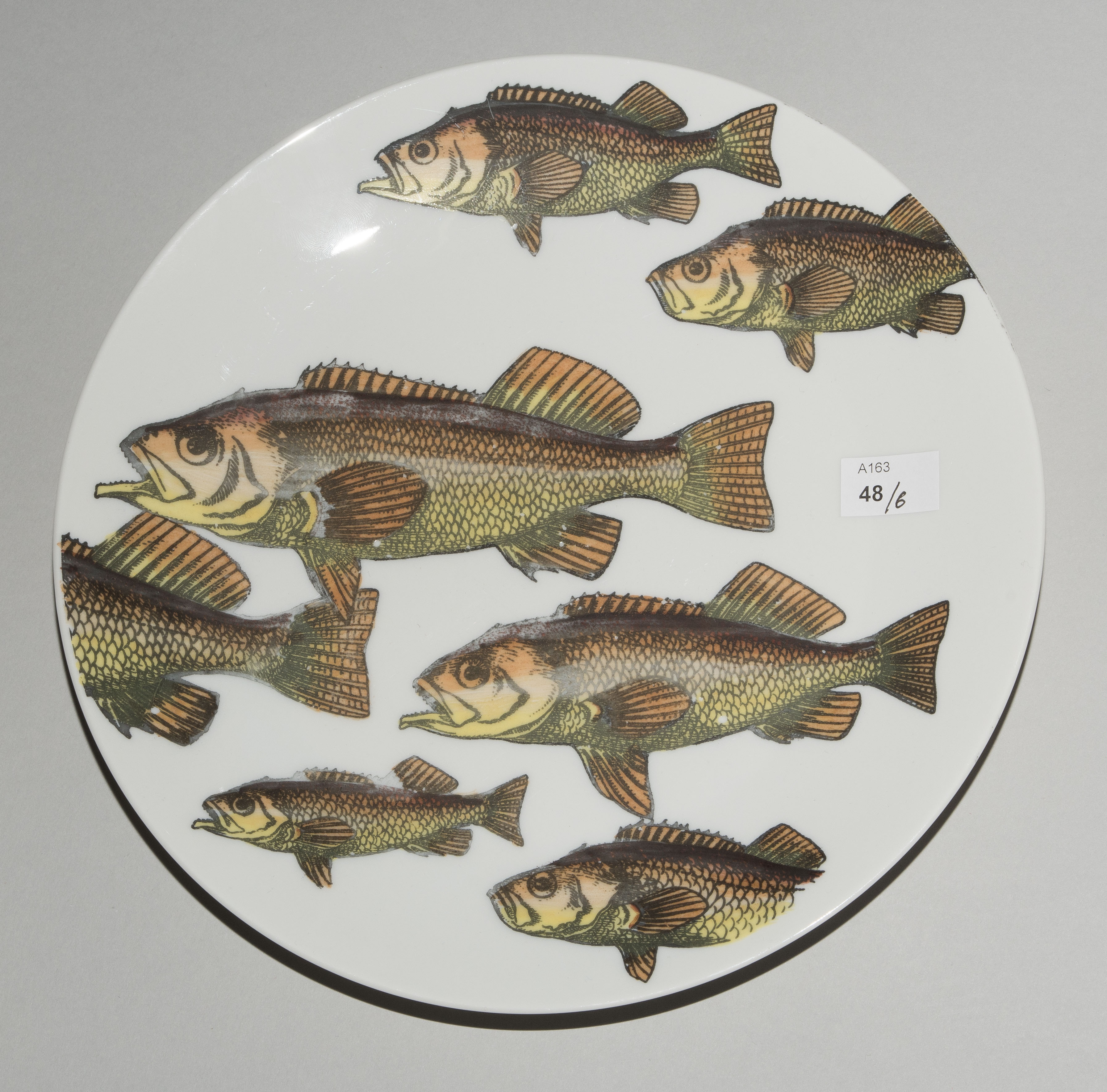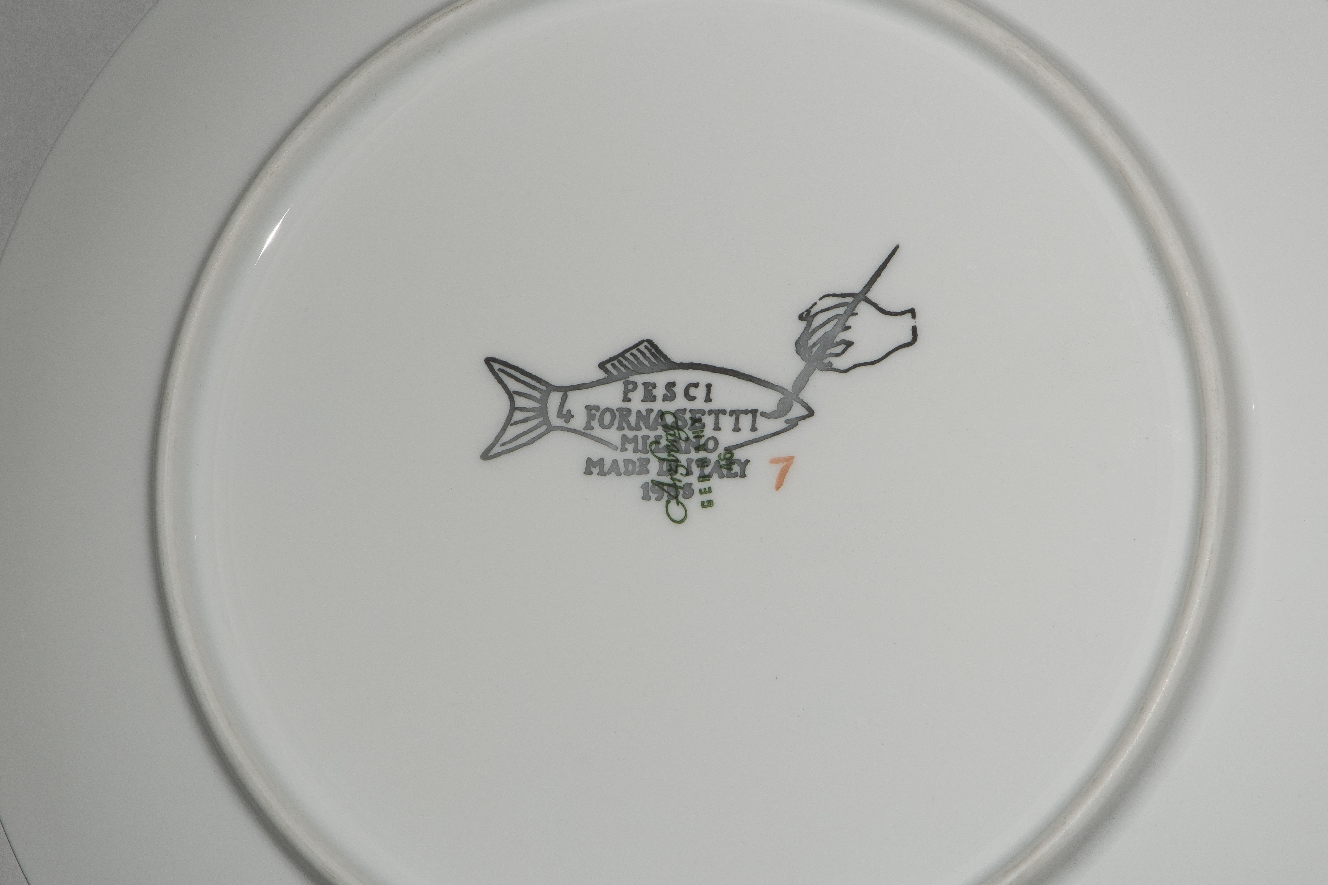 1955, Porzellan "Arzberg, Germany". Druckdekor, polychrom übermalt. Aus der Serie "Pesci". Diverse Fischdarstellungen. Rückseitig nummeriert und datiert "Pesci Fornasetti Milano Made in Italy 1955". D 24 cm.