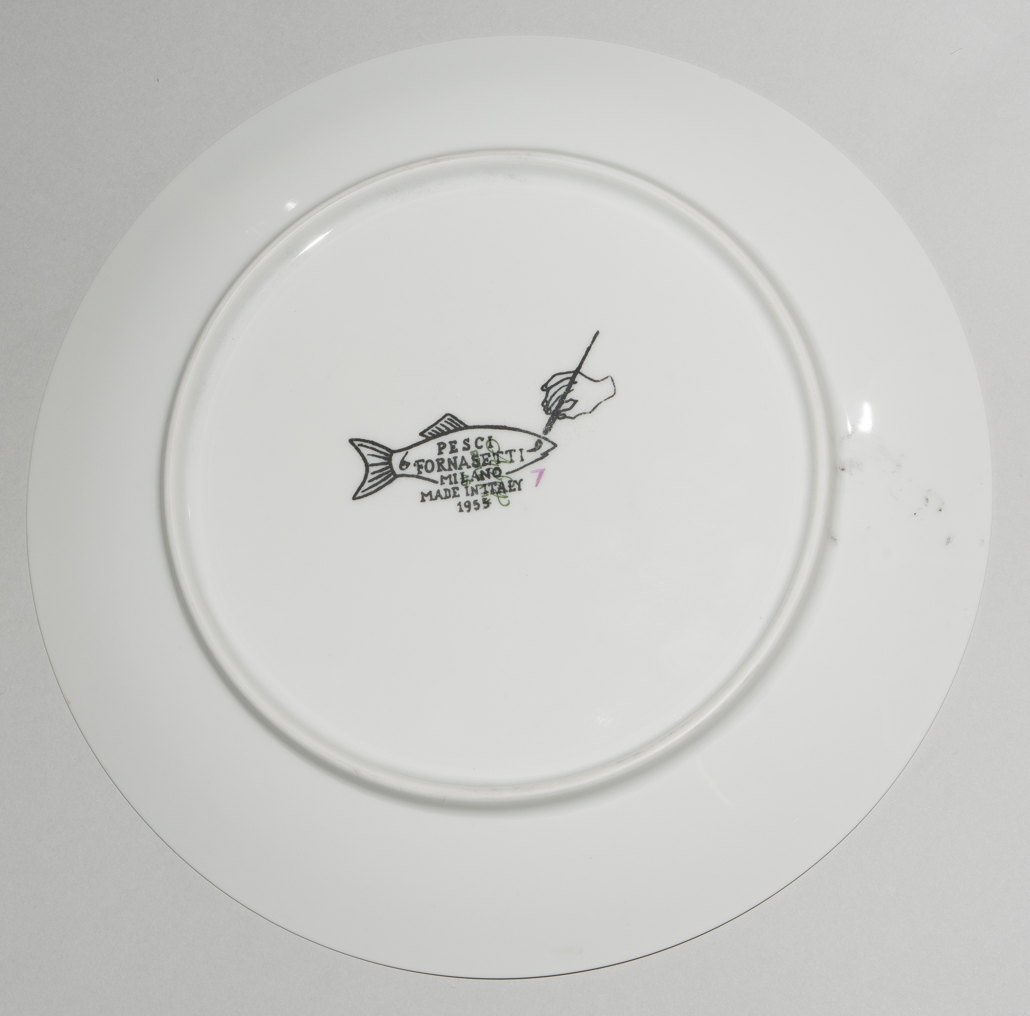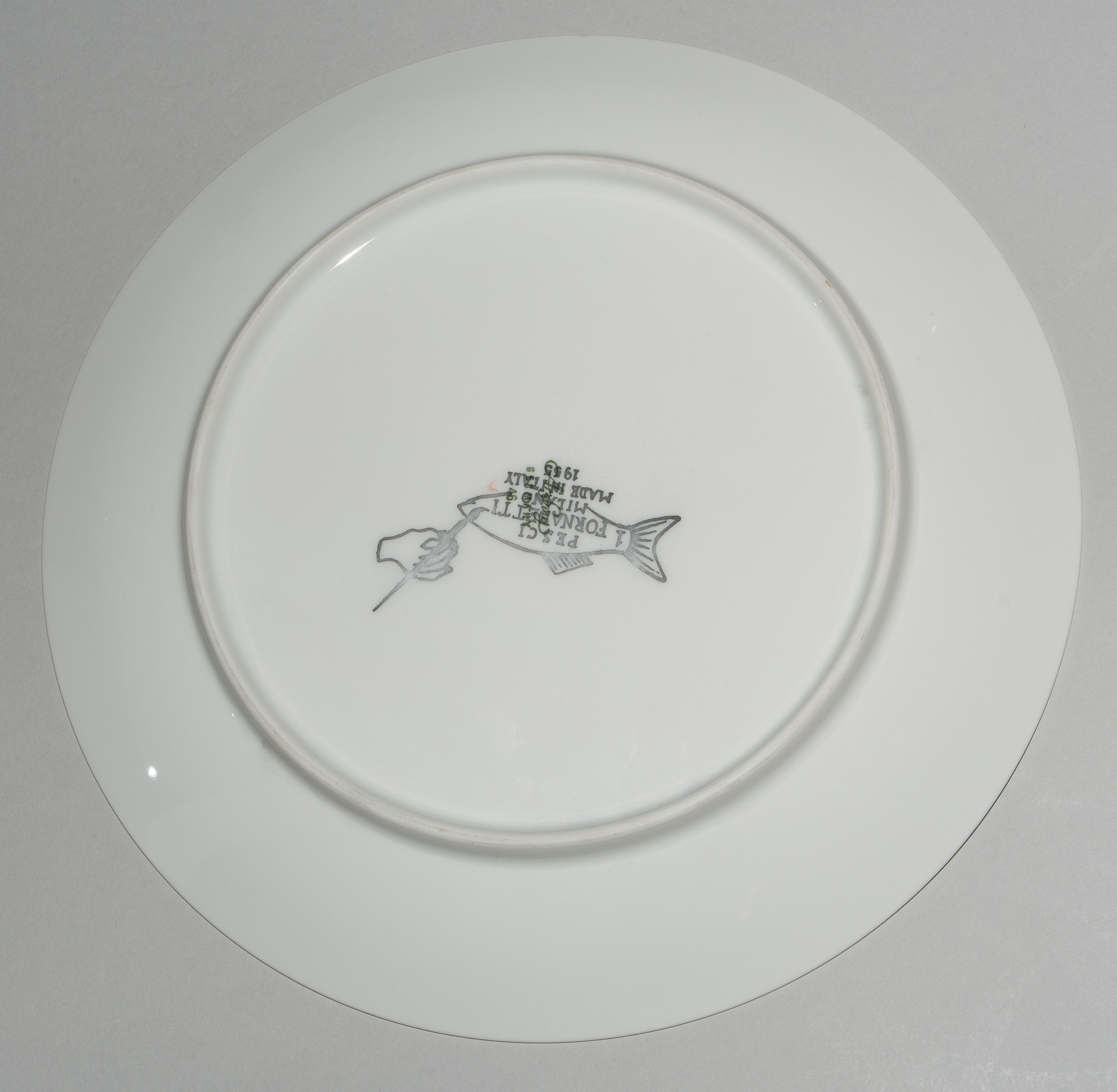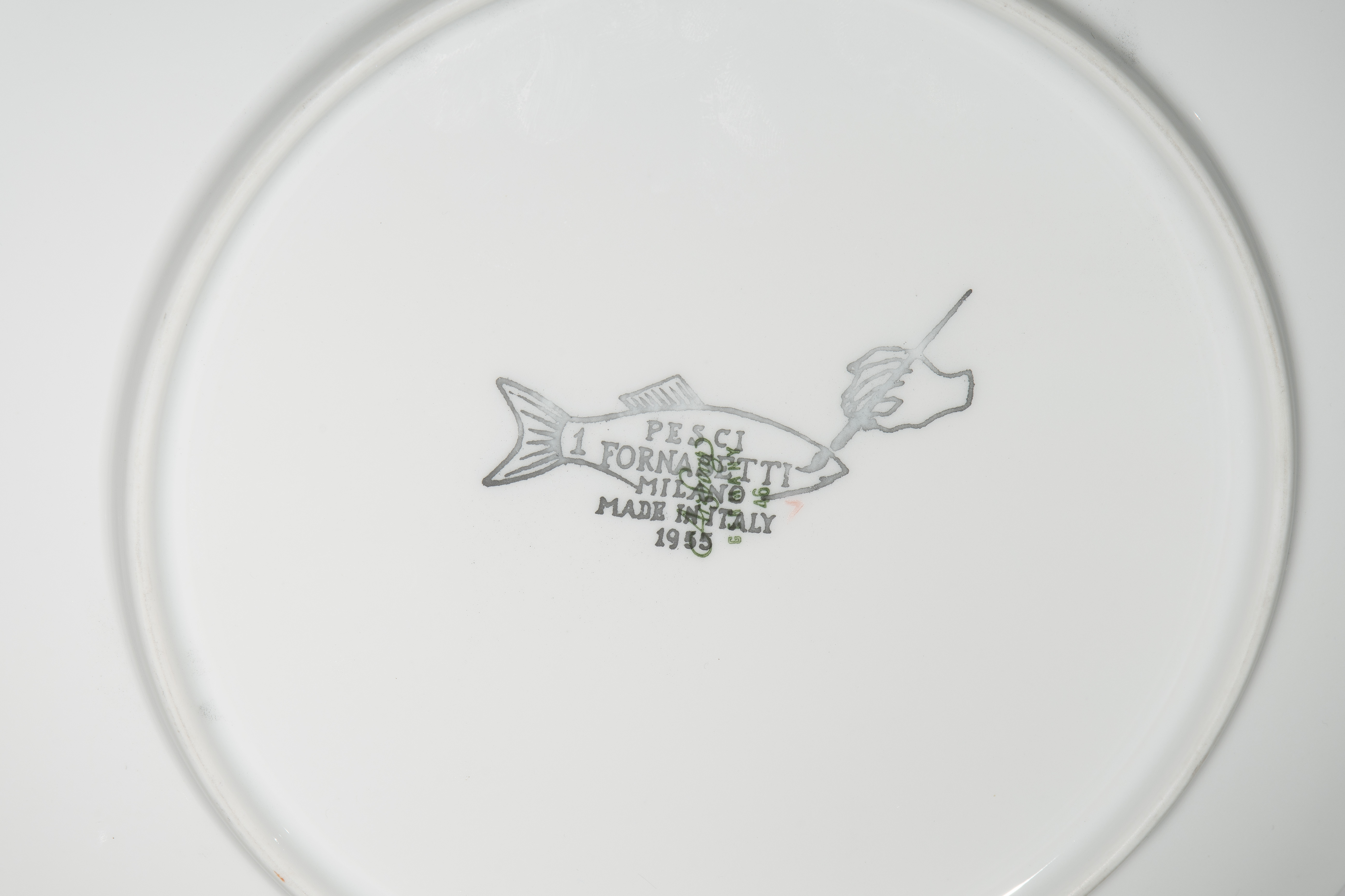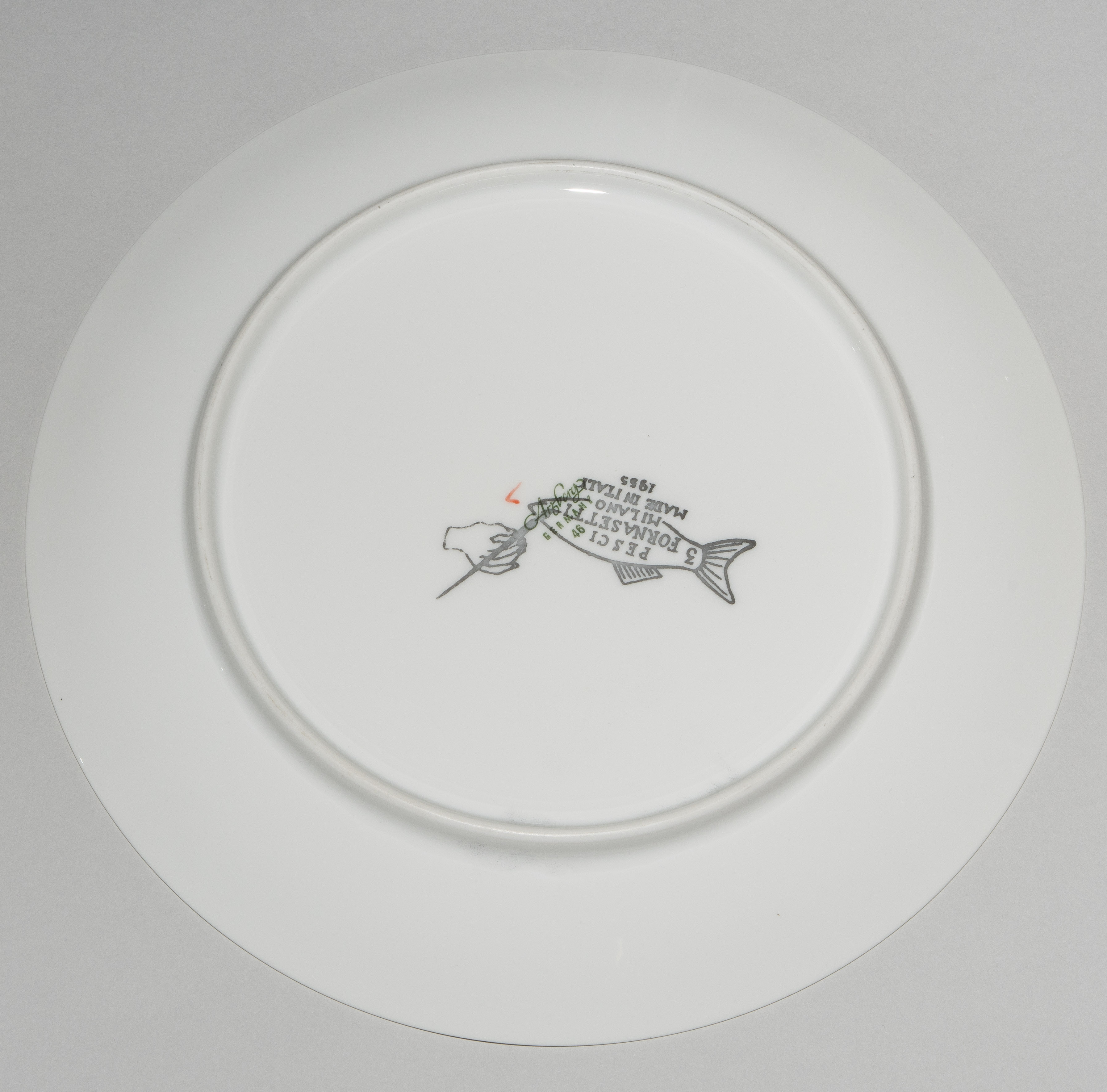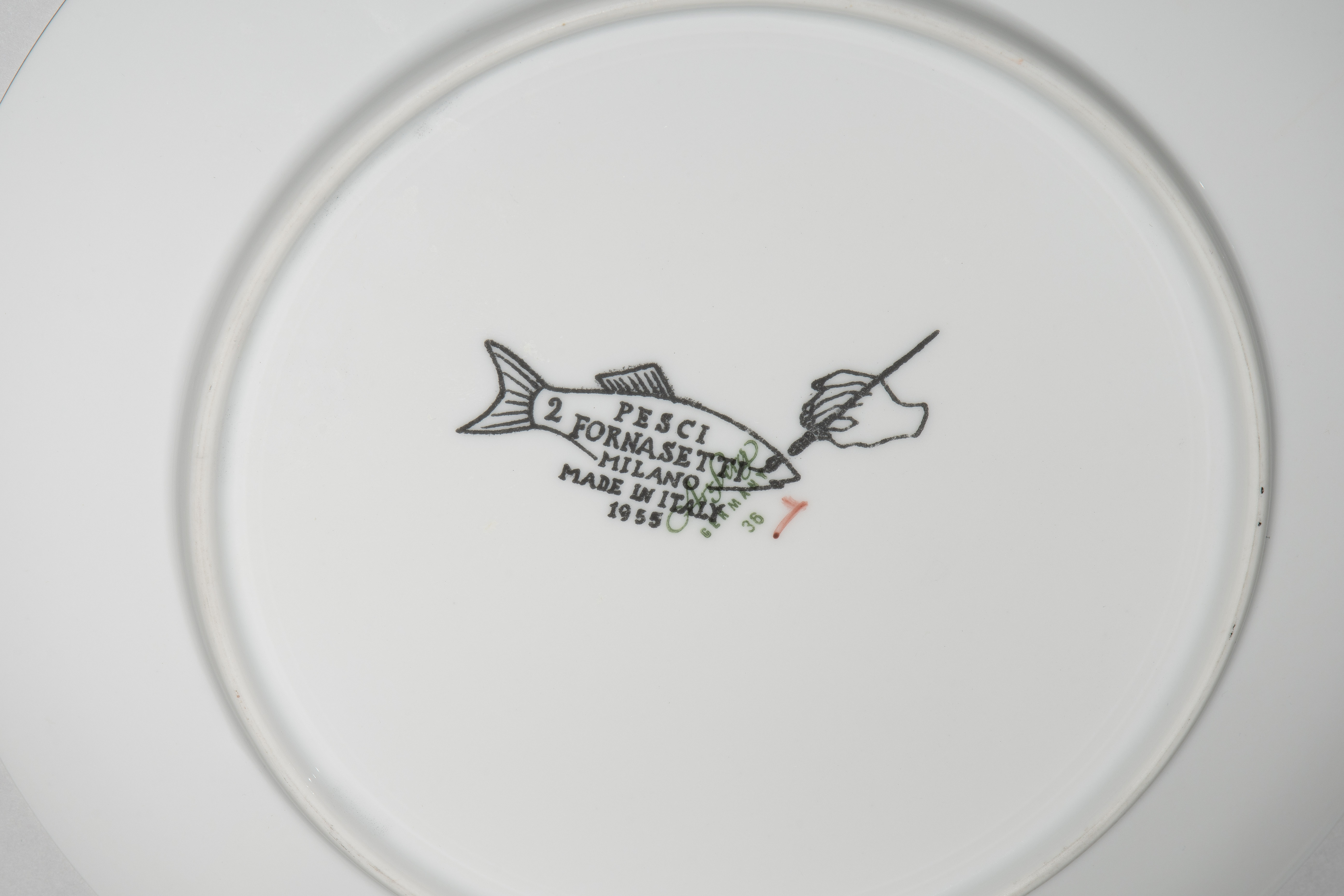 1955, Porzellan "Arzberg, Germany". Druckdekor, polychrom übermalt. Aus der Serie "Pesci". Diverse Fischdarstellungen. Rückseitig nummeriert und datiert "Pesci Fornasetti Milano Made in Italy 1955". D 24 cm.