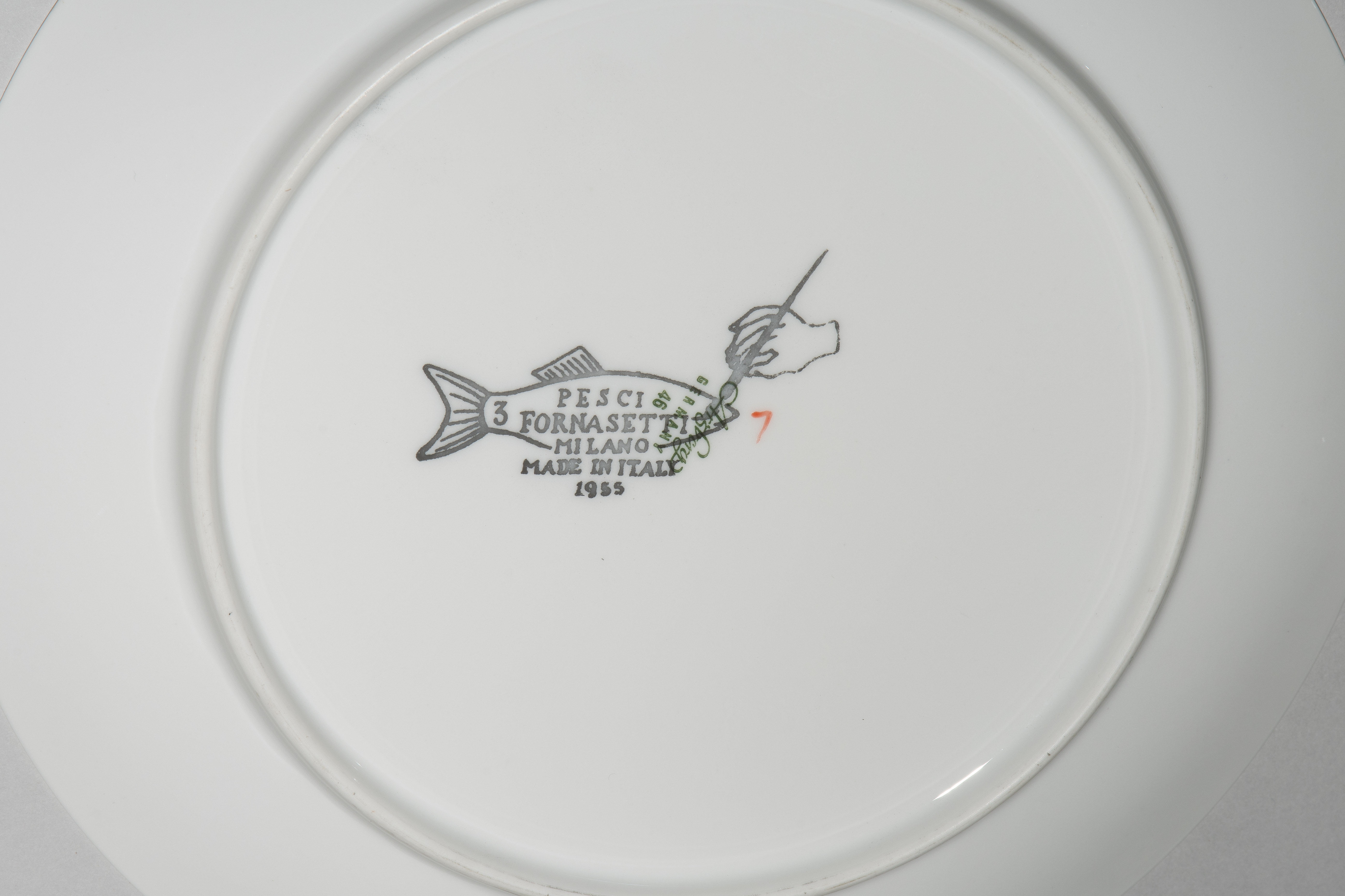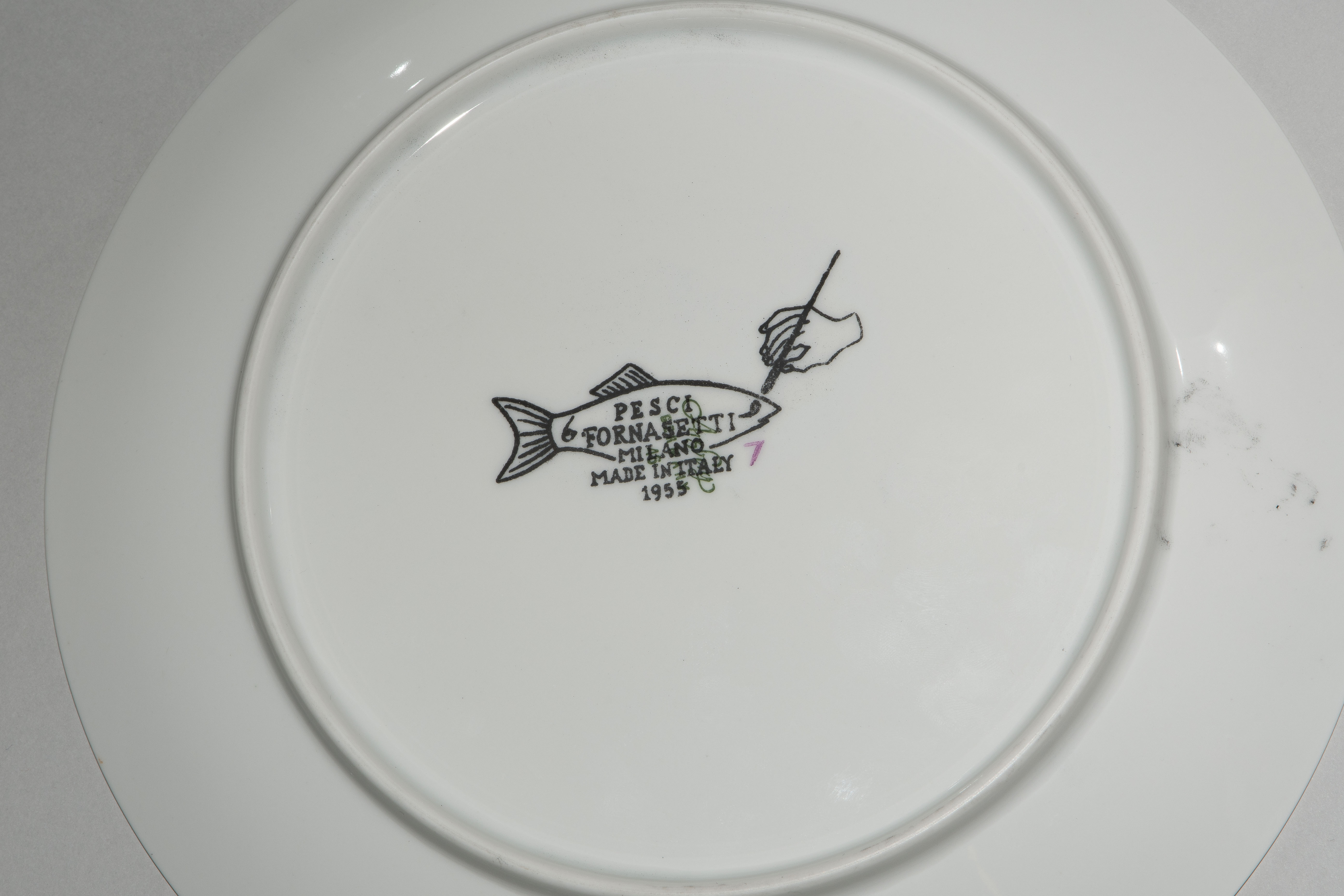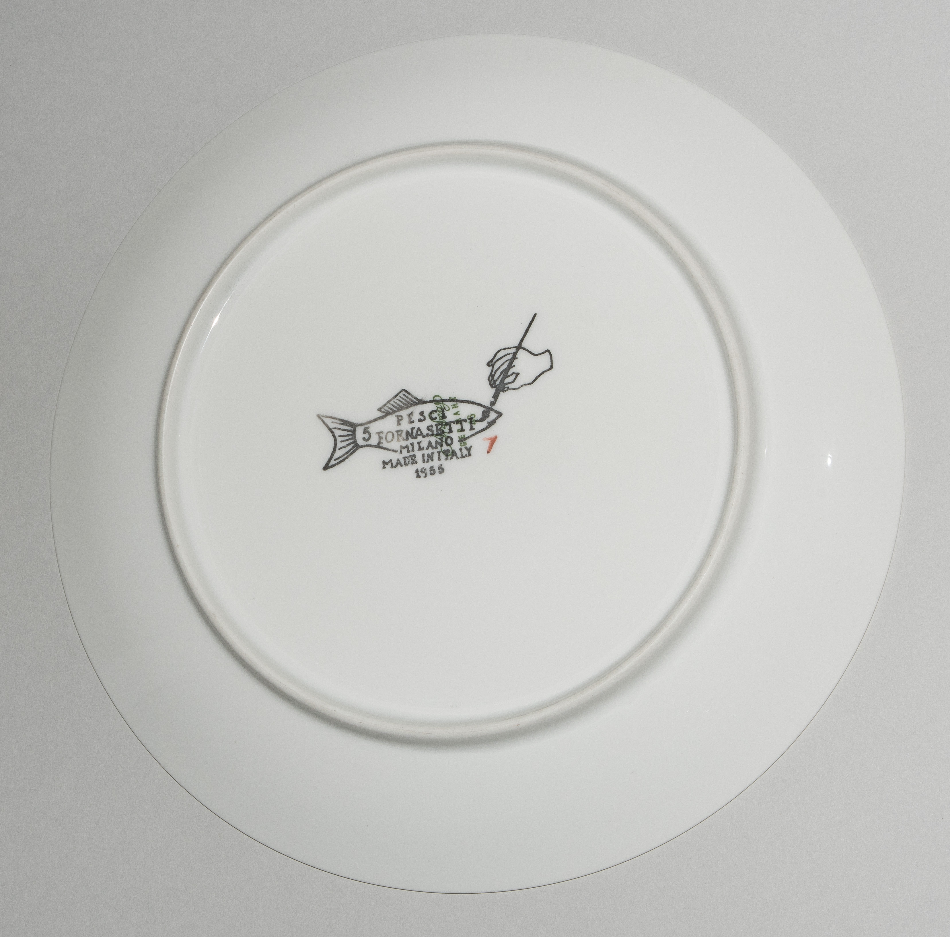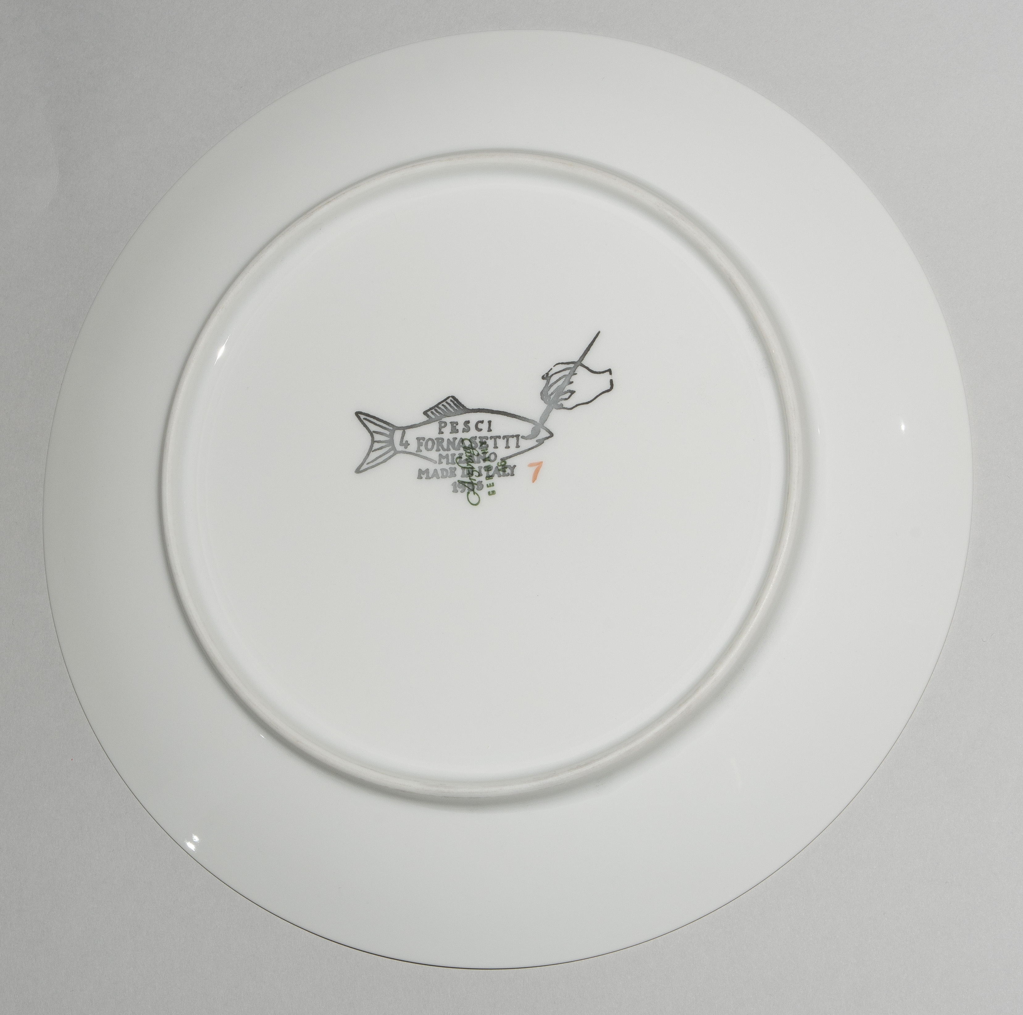 1955, Porzellan "Arzberg, Germany". Druckdekor, polychrom übermalt. Aus der Serie "Pesci". Diverse Fischdarstellungen. Rückseitig nummeriert und datiert "Pesci Fornasetti Milano Made in Italy 1955". D 24 cm.