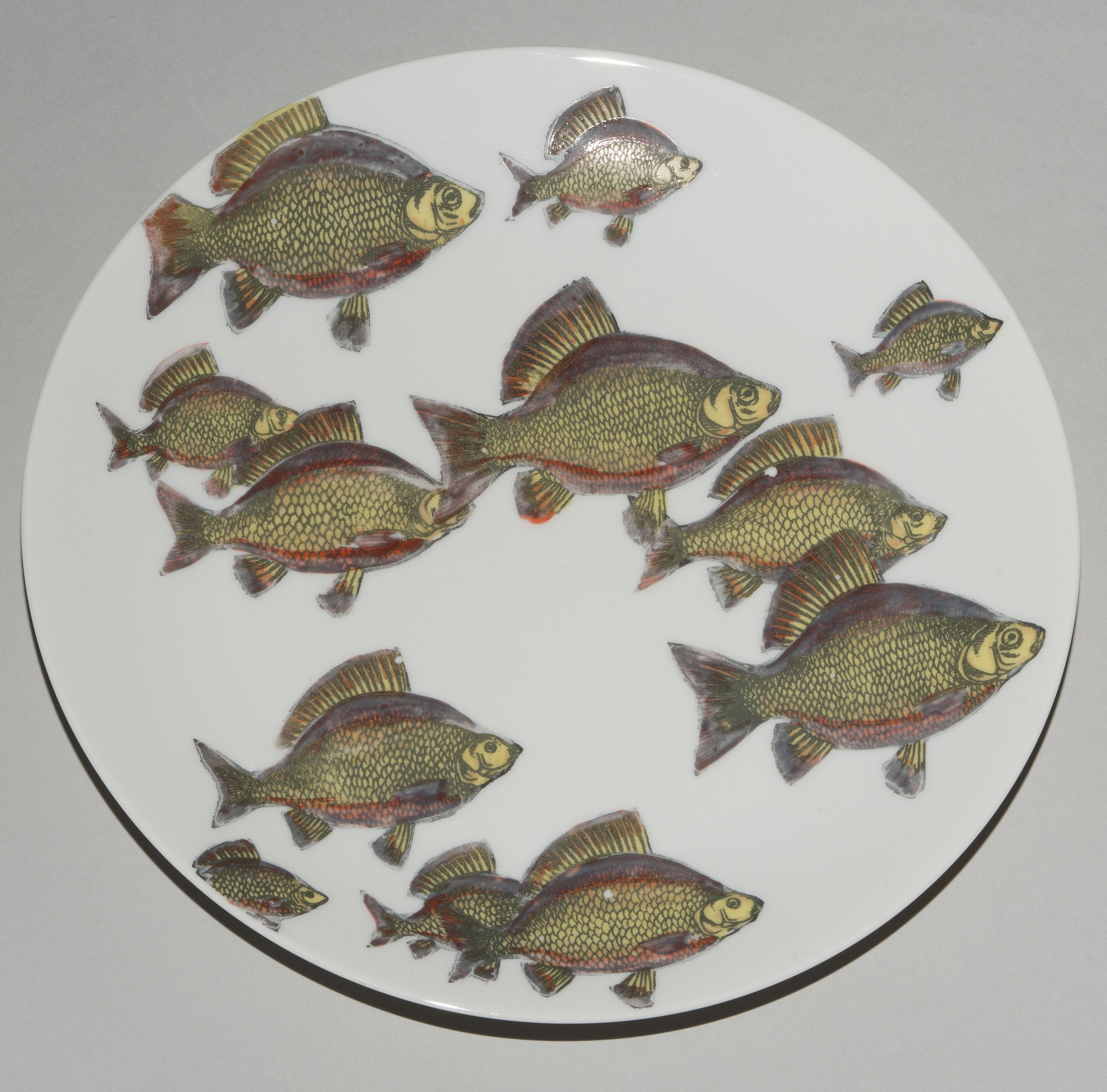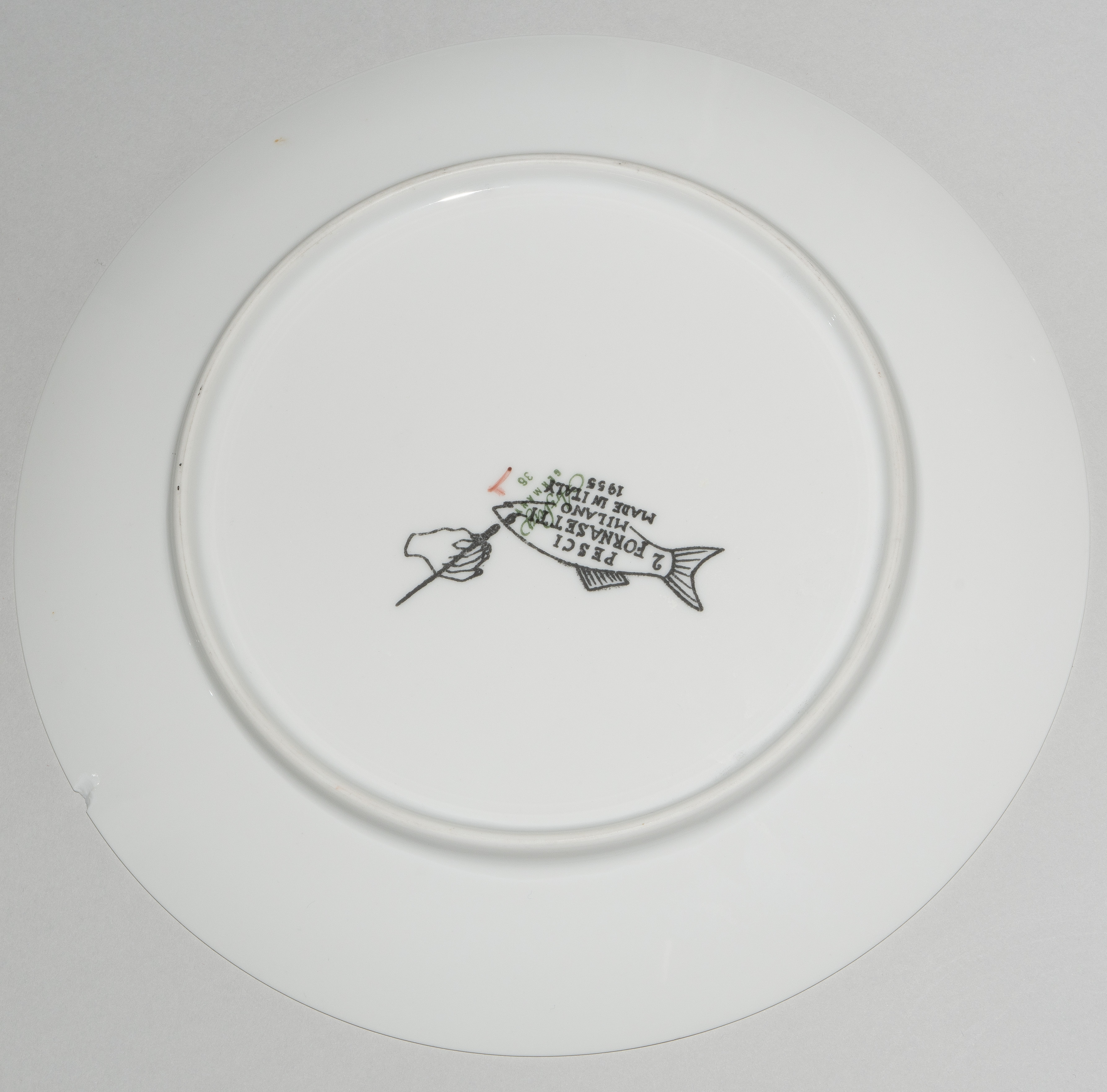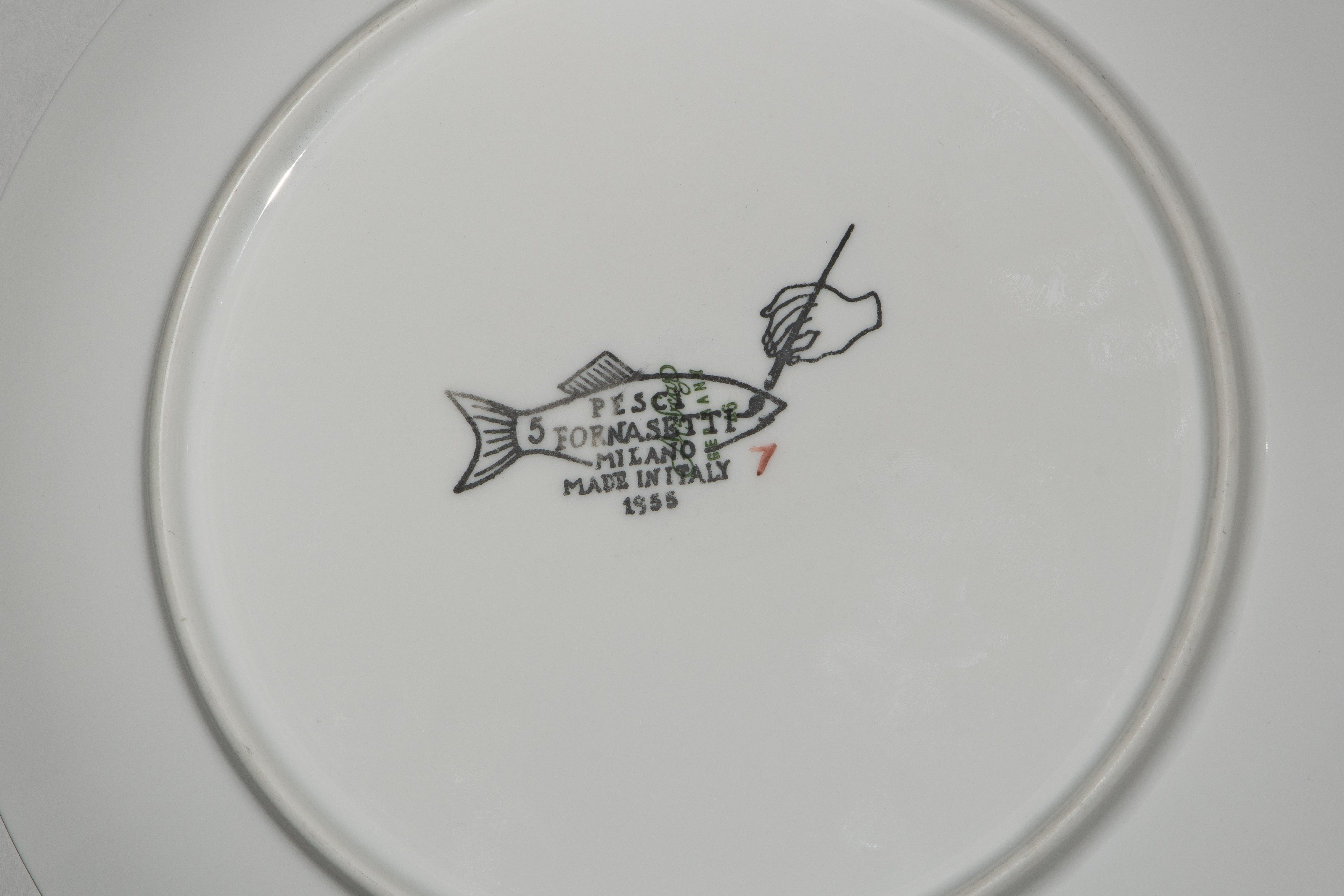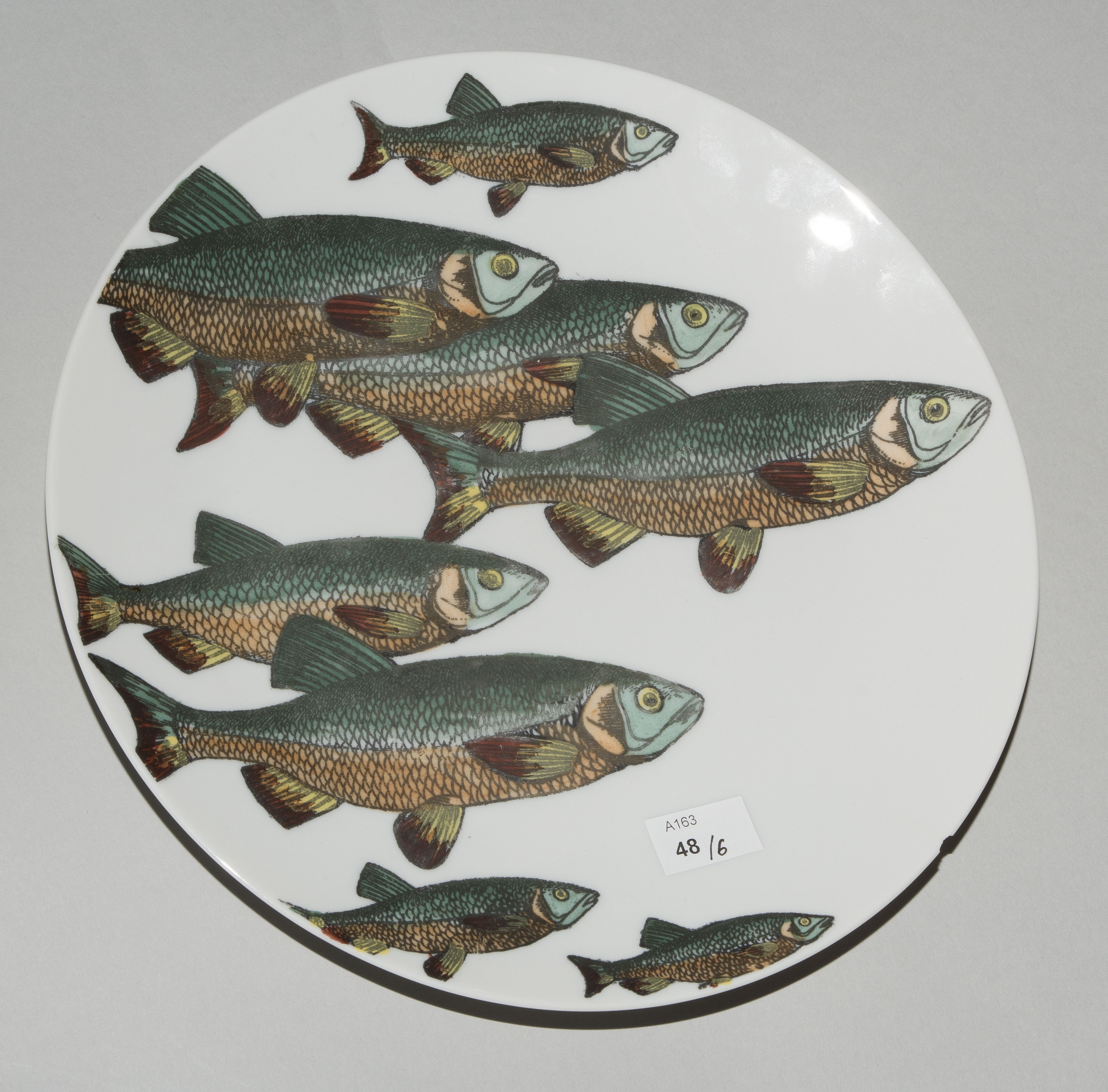 1955, Porzellan "Arzberg, Germany". Druckdekor, polychrom übermalt. Aus der Serie "Pesci". Diverse Fischdarstellungen. Rückseitig nummeriert und datiert "Pesci Fornasetti Milano Made in Italy 1955". D 24 cm.