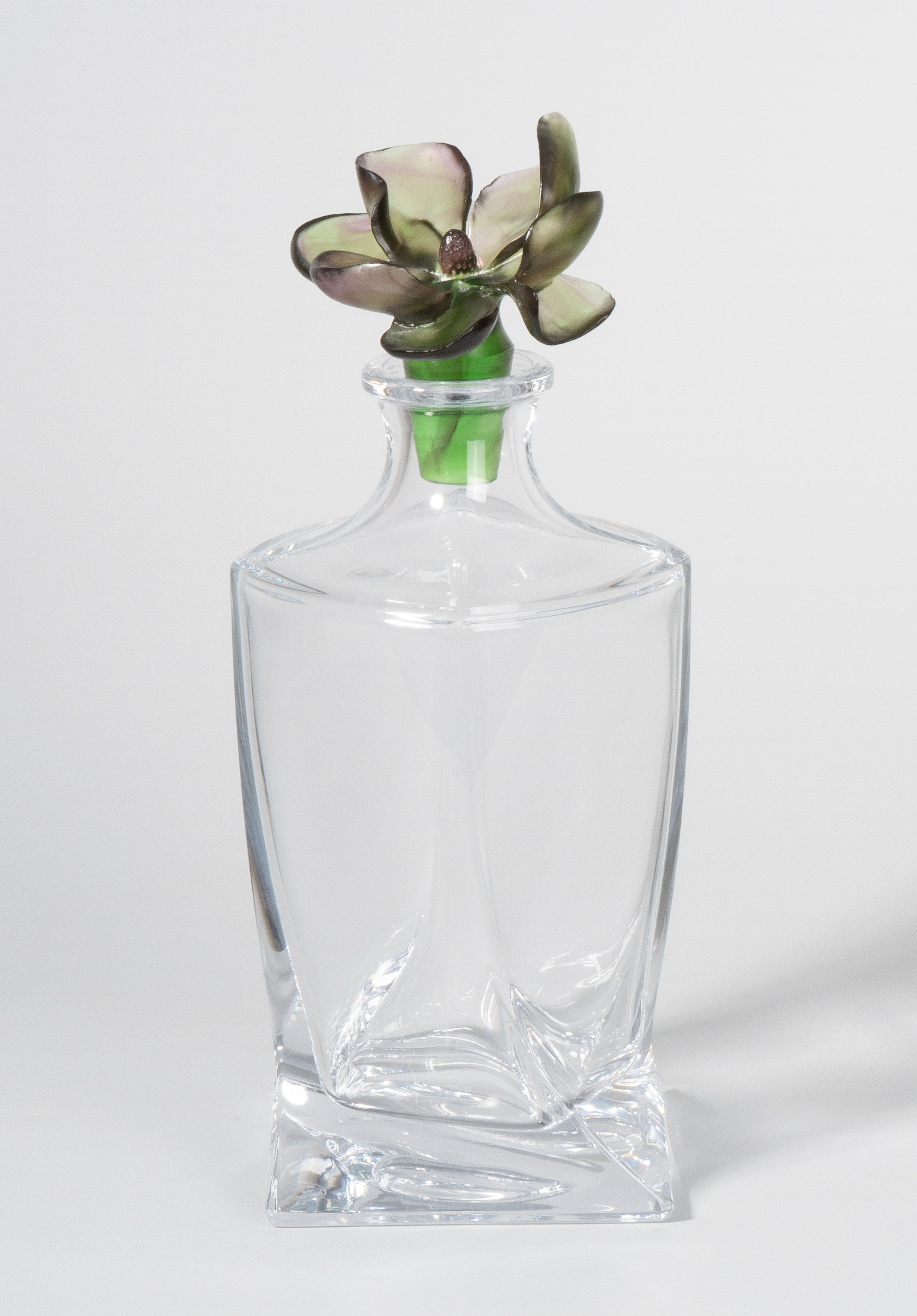20.Jh. Farbloses, dickwandiges Kristallglas. Stöpsel in Form einer Blüte aus grün-violettem Pâte-de-verre. H 27 cm.