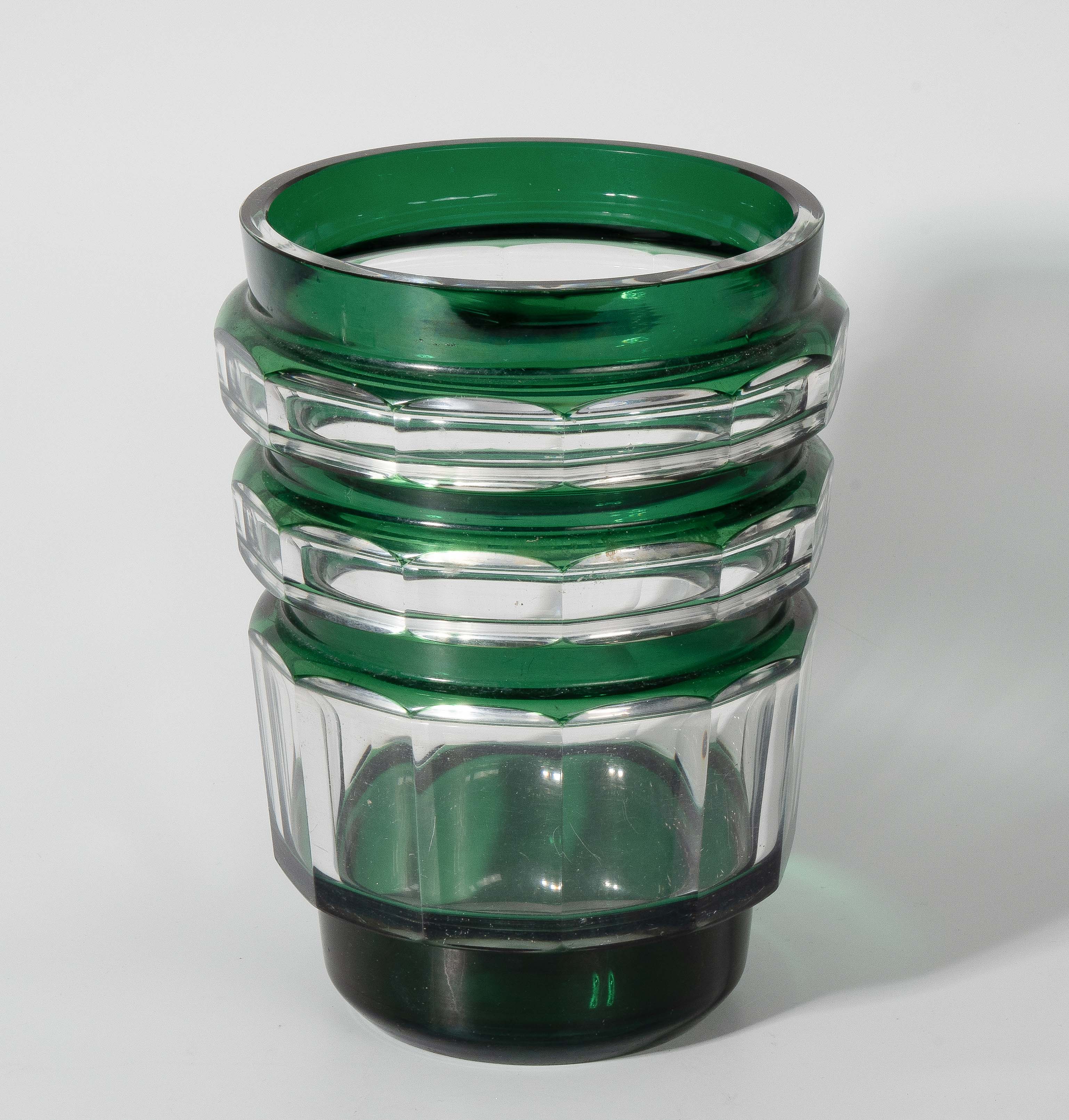 20. Jh. Farbloses, dickwandiges Kristallglas, grün überfangen. Schälschliffdekor. H 22 cm.