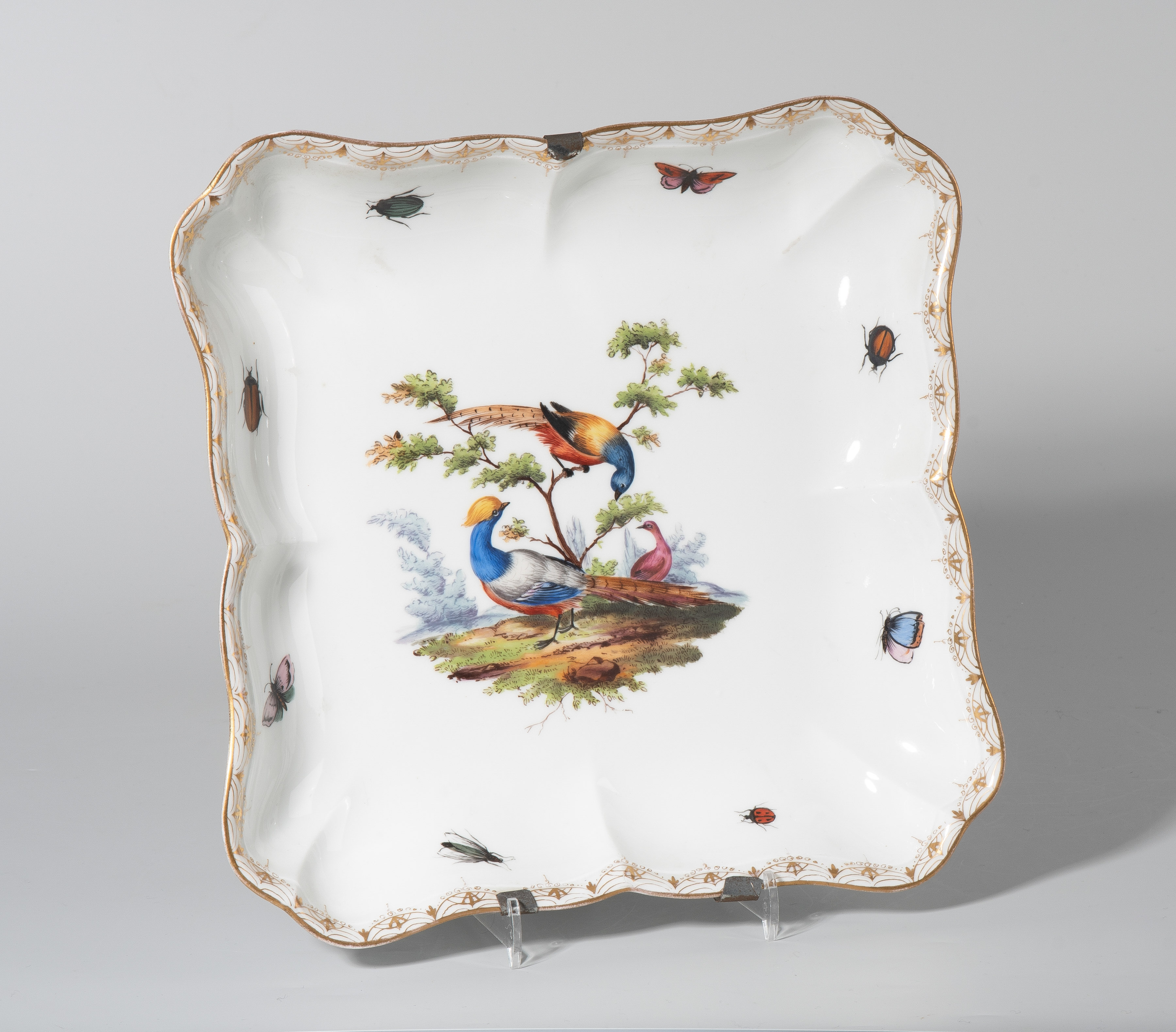 Meissen (Porzellan), Malerei (wohl nicht in der Manufaktur) 19.Jh. Porzellan. Unterglasurblaue Schwertermarke mit Knäufen. Polychrome Vögel- und Insektenmalerei. Rand mit ornamentaler Goldstaffierung. 22x22 cm.