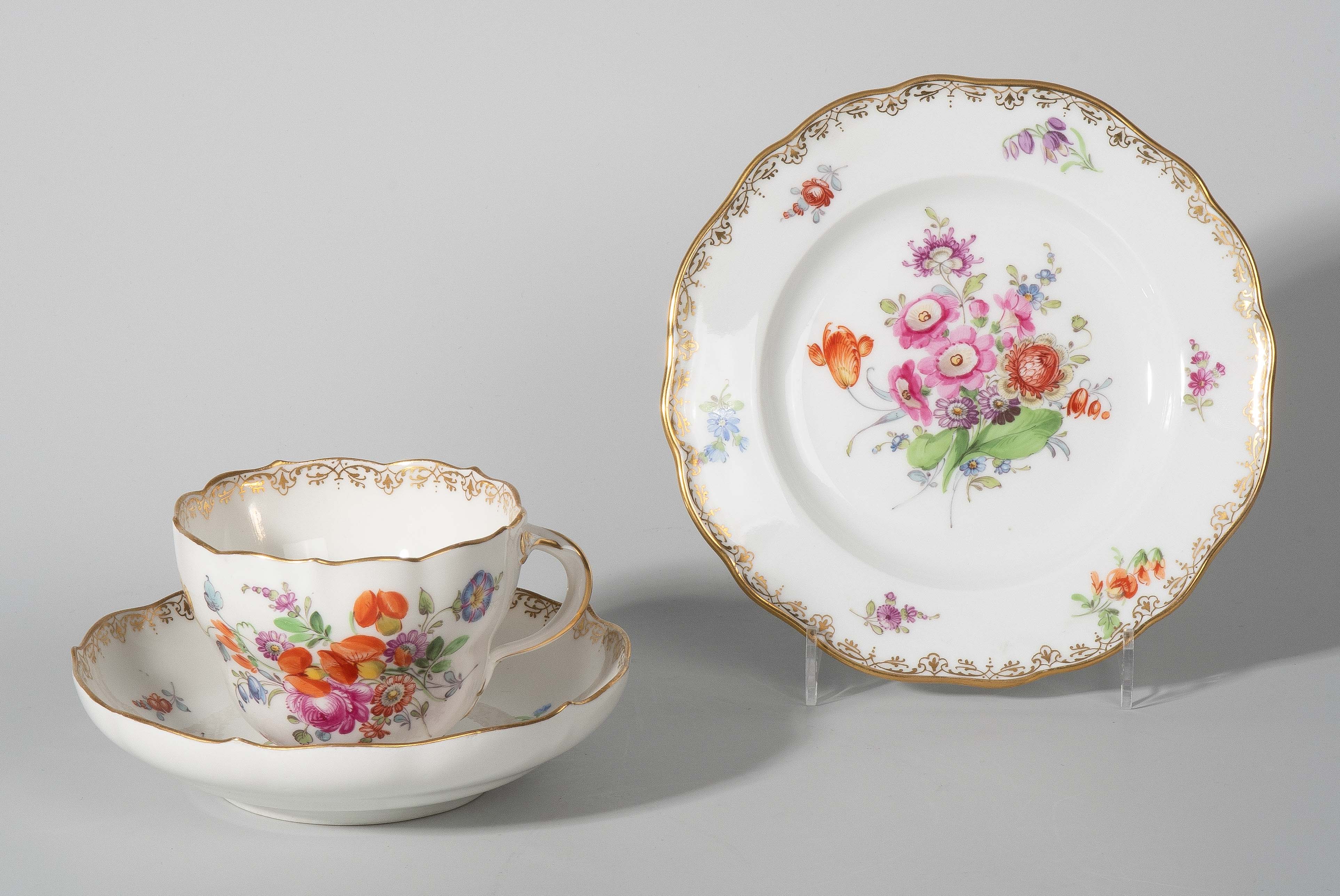 Um 1900. Porzellan. Unterglasurblaue Schwertermarke mit Knäufen. Polychrome Blumenmalerei. Ornamentaler Goldrand. Bestand: Tasse mit Untertasse, Dessertteller. H (Tasse) 6,5 cm.